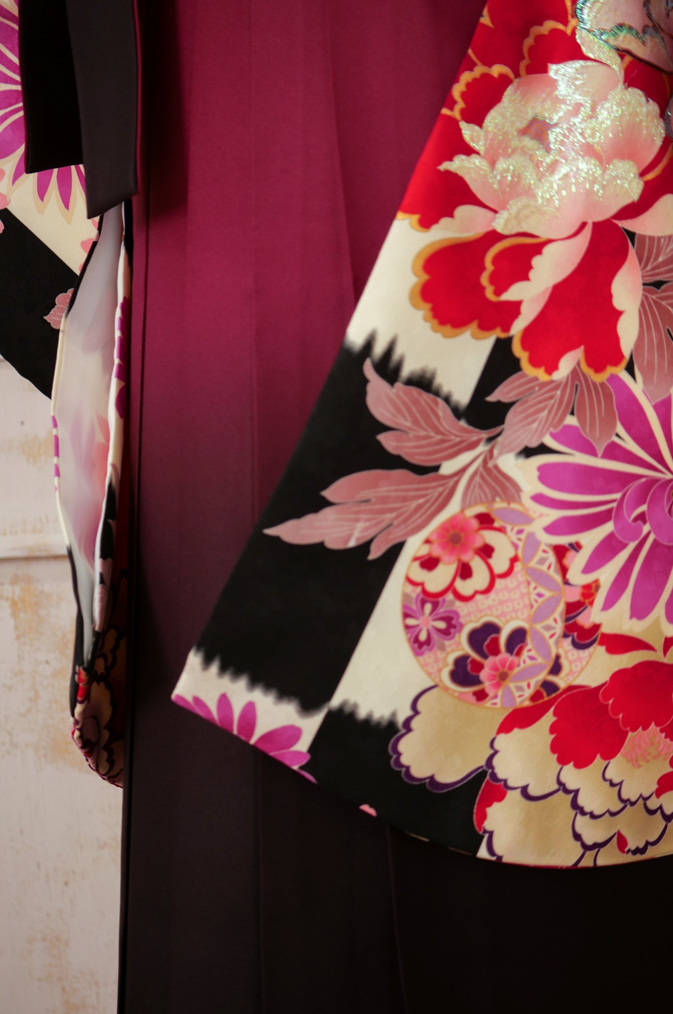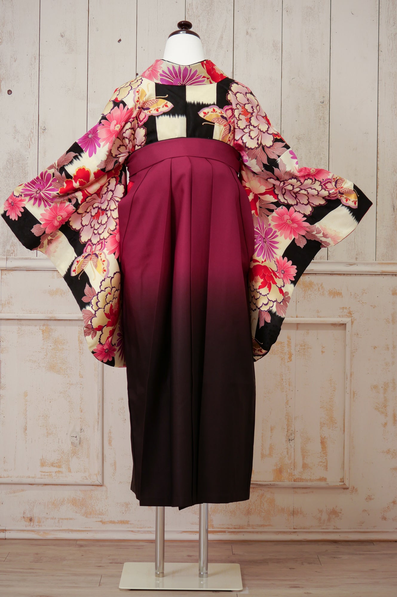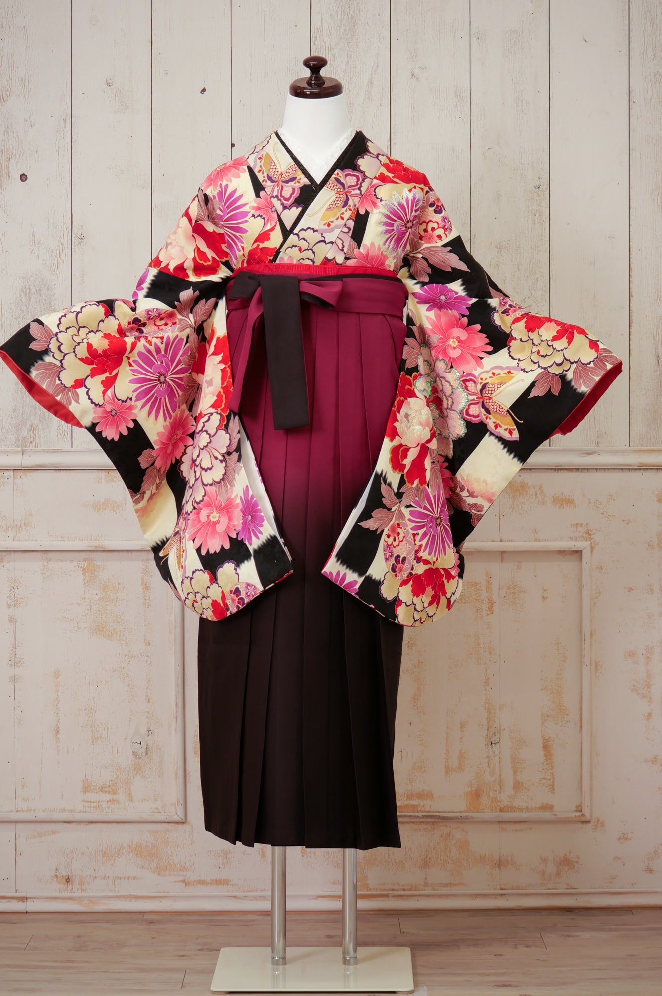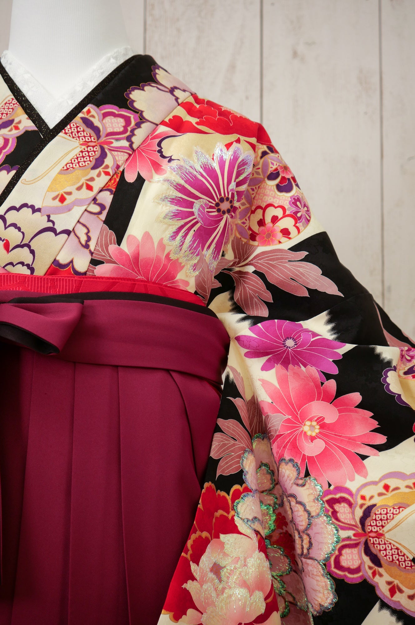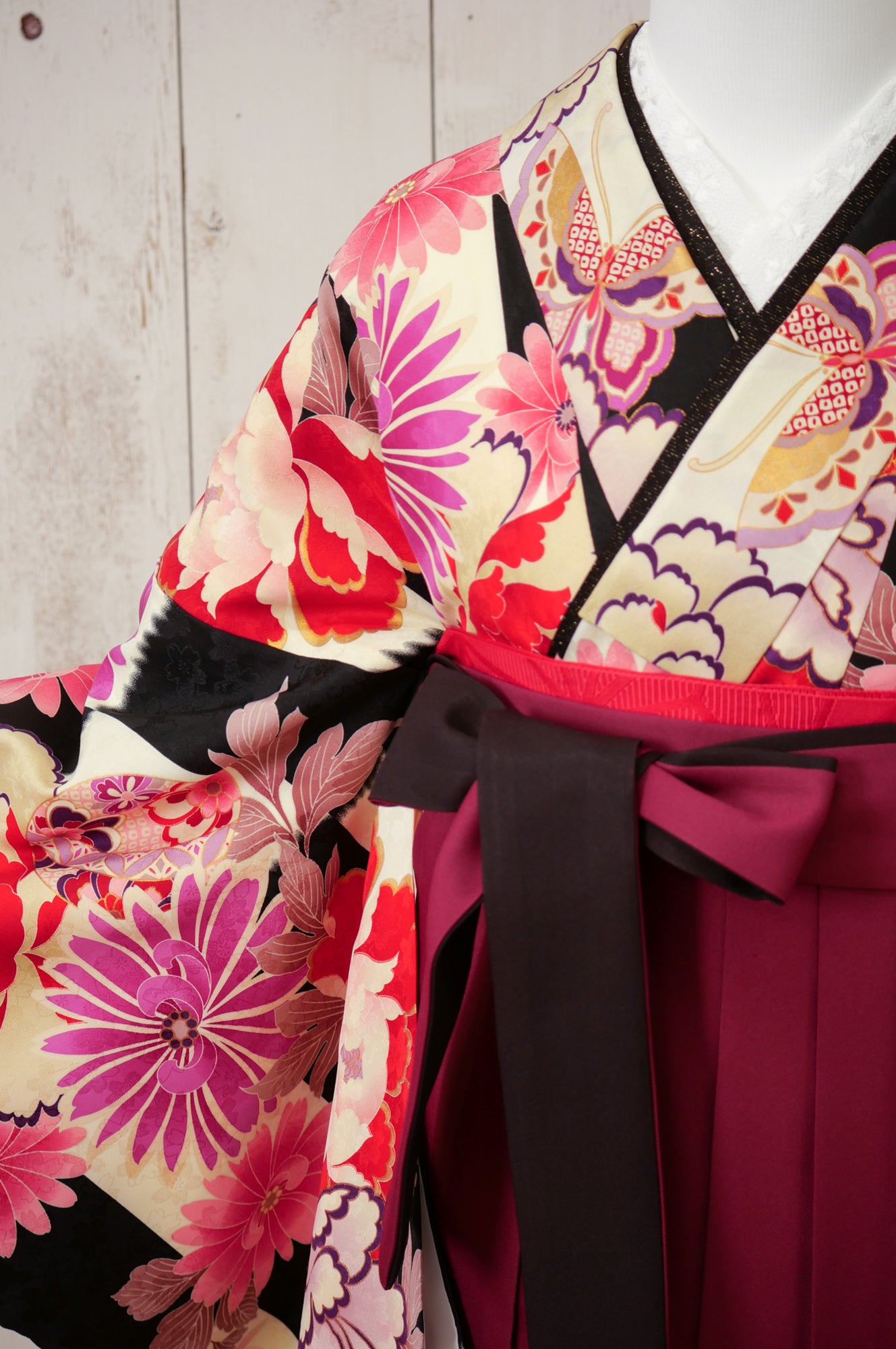 黒地に華やかな花柄が映えるデザイン。深紅の袴で気品と存在感を演出。成人式にも最適な華やぎ。