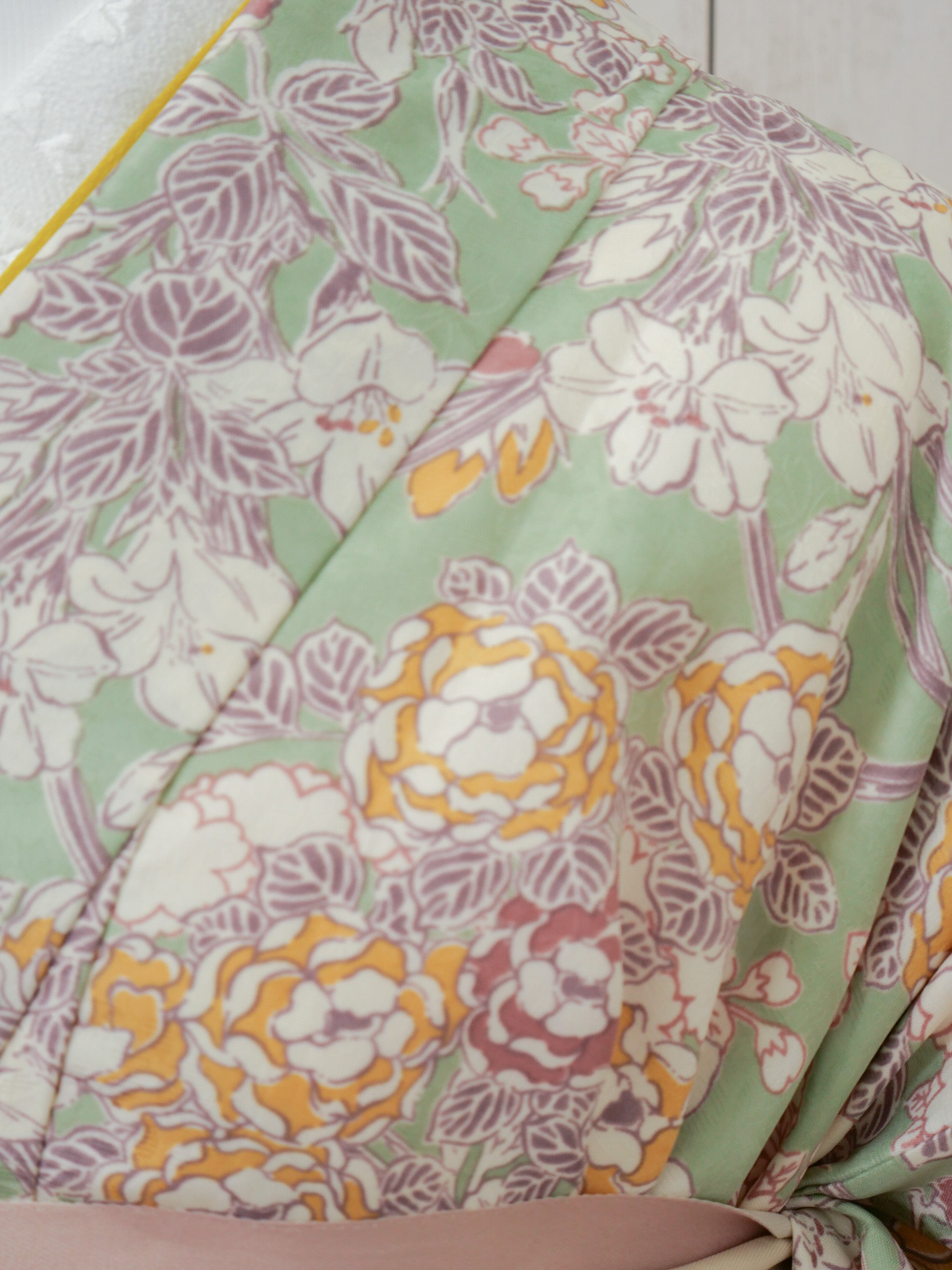 淡いミントグリーンに咲く牡丹が美しい、やわらかくフェミニンなデザイン。上品な印象。