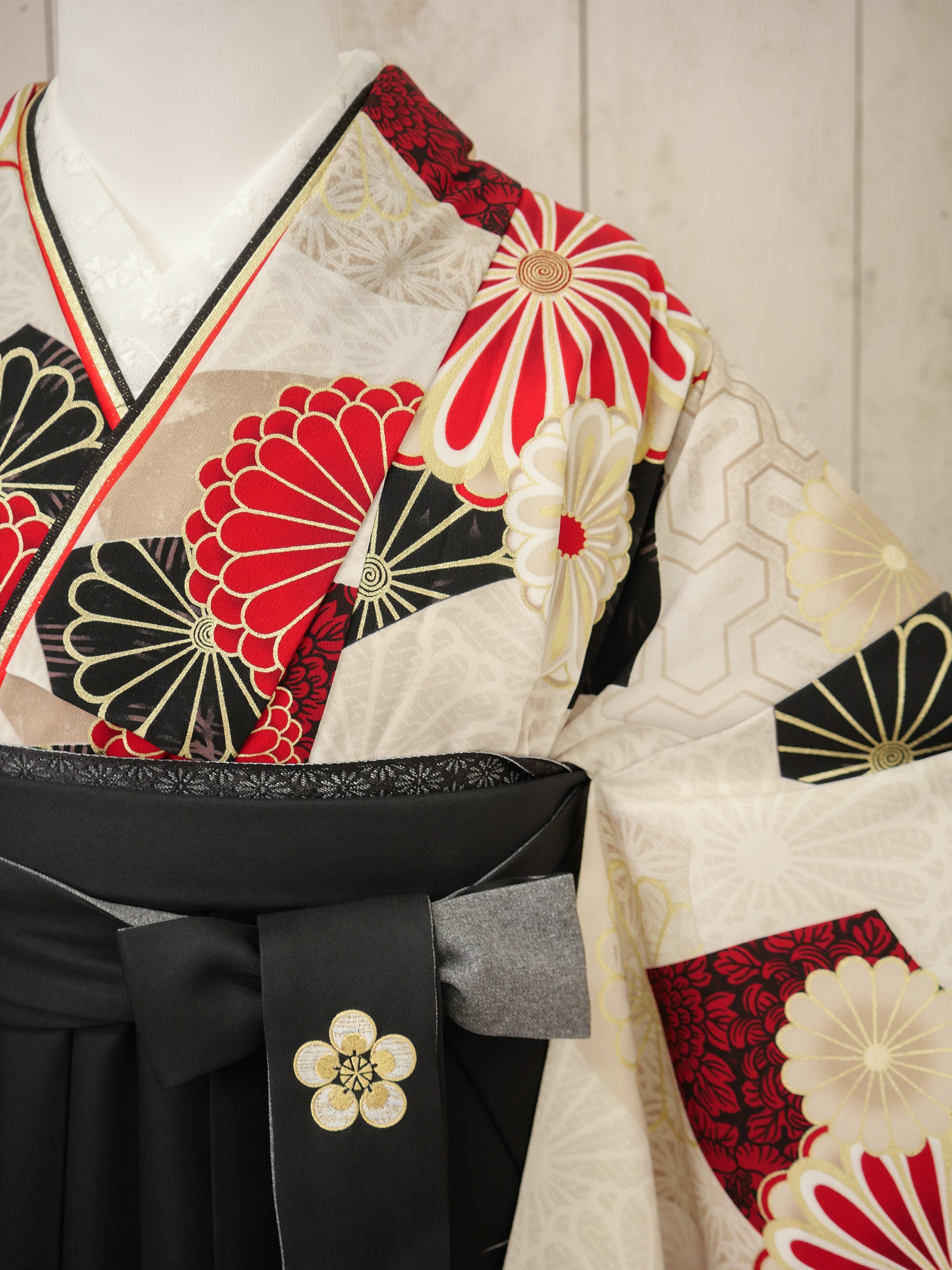 ベージュ地に赤と黒の菊模様が映える、レトロモダンな袴スタイル。力強く咲く大輪の花が存在感を放ち、シックな黒袴とのコントラストで大人の魅力を演出します。印象に残る卒業式に。