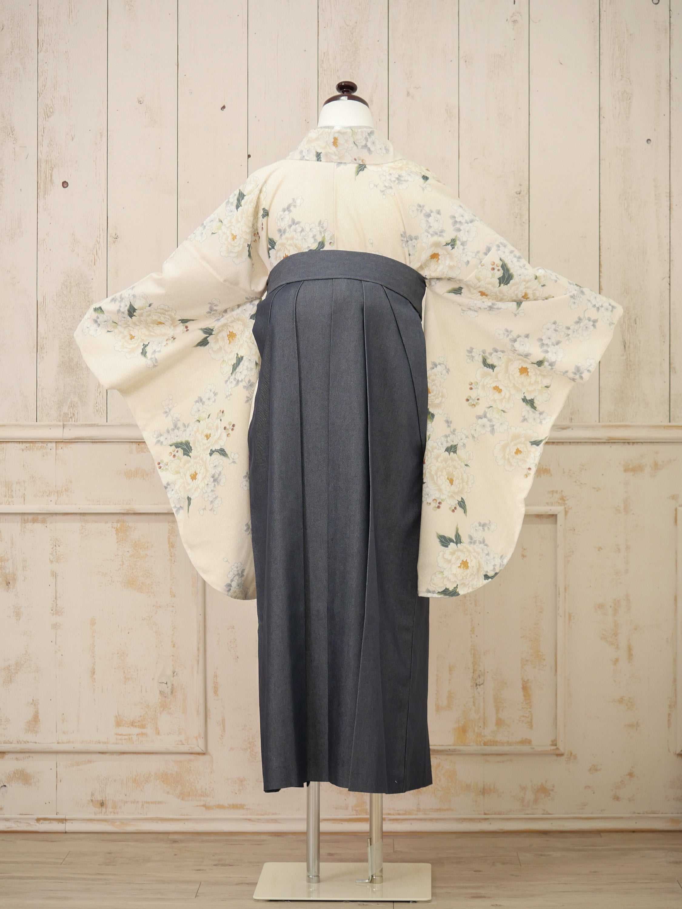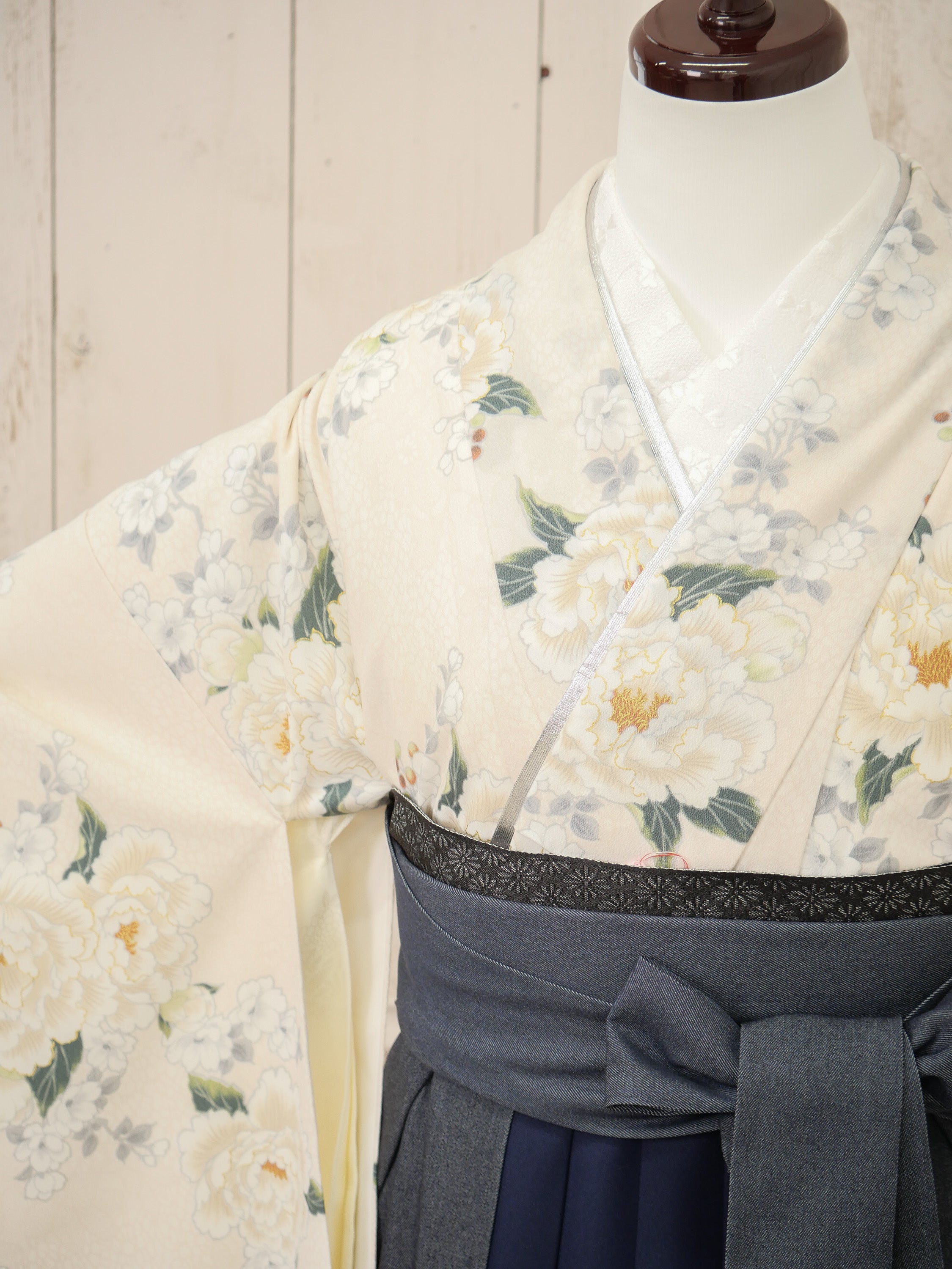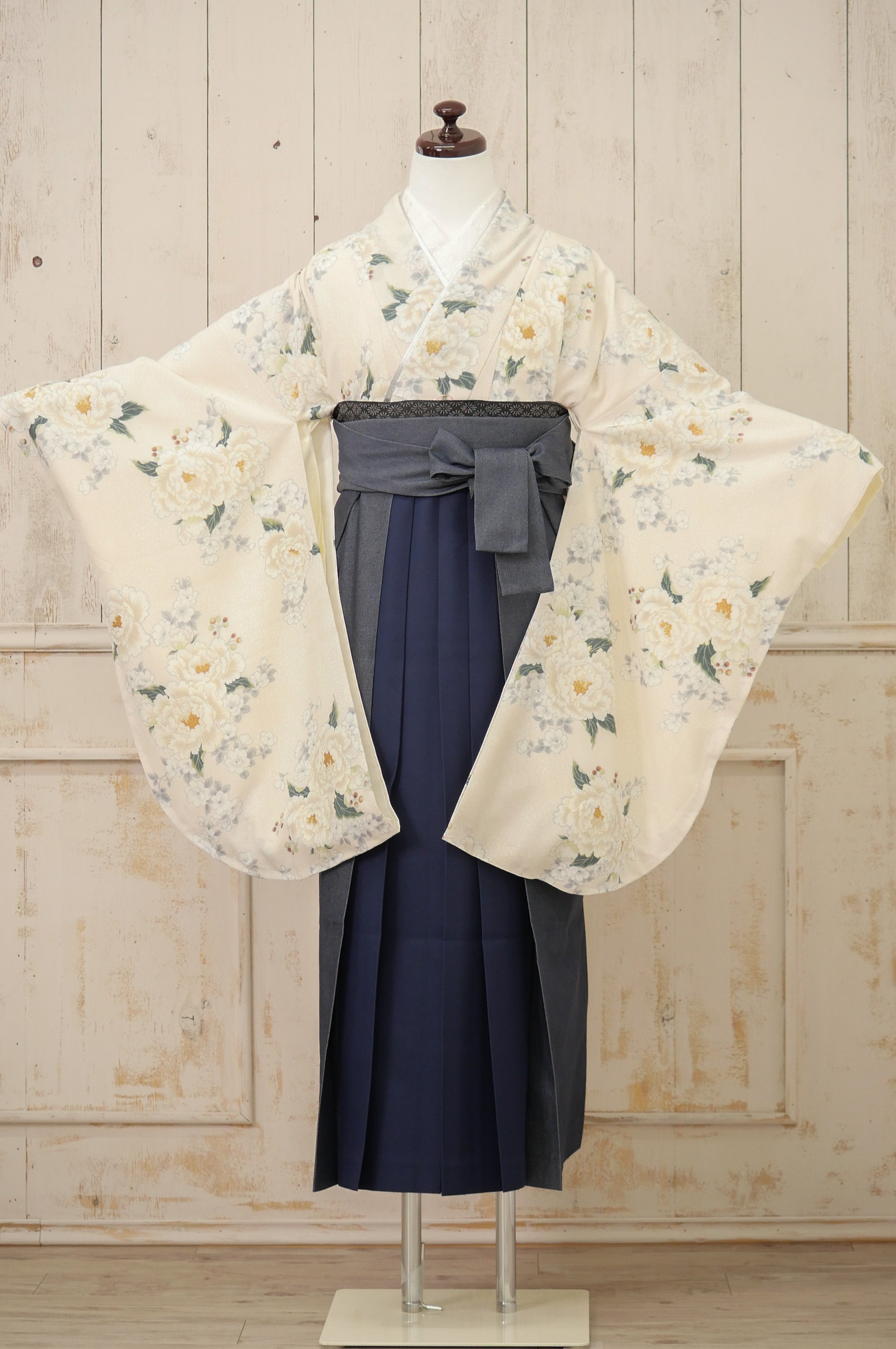 クリームベージュに白い牡丹が咲き誇る、大人っぽく上品な一着。落ち着きのあるネイビーの袴が花柄の美しさを引き立て、洗練された雰囲気に。写真映えする上品スタイルです。