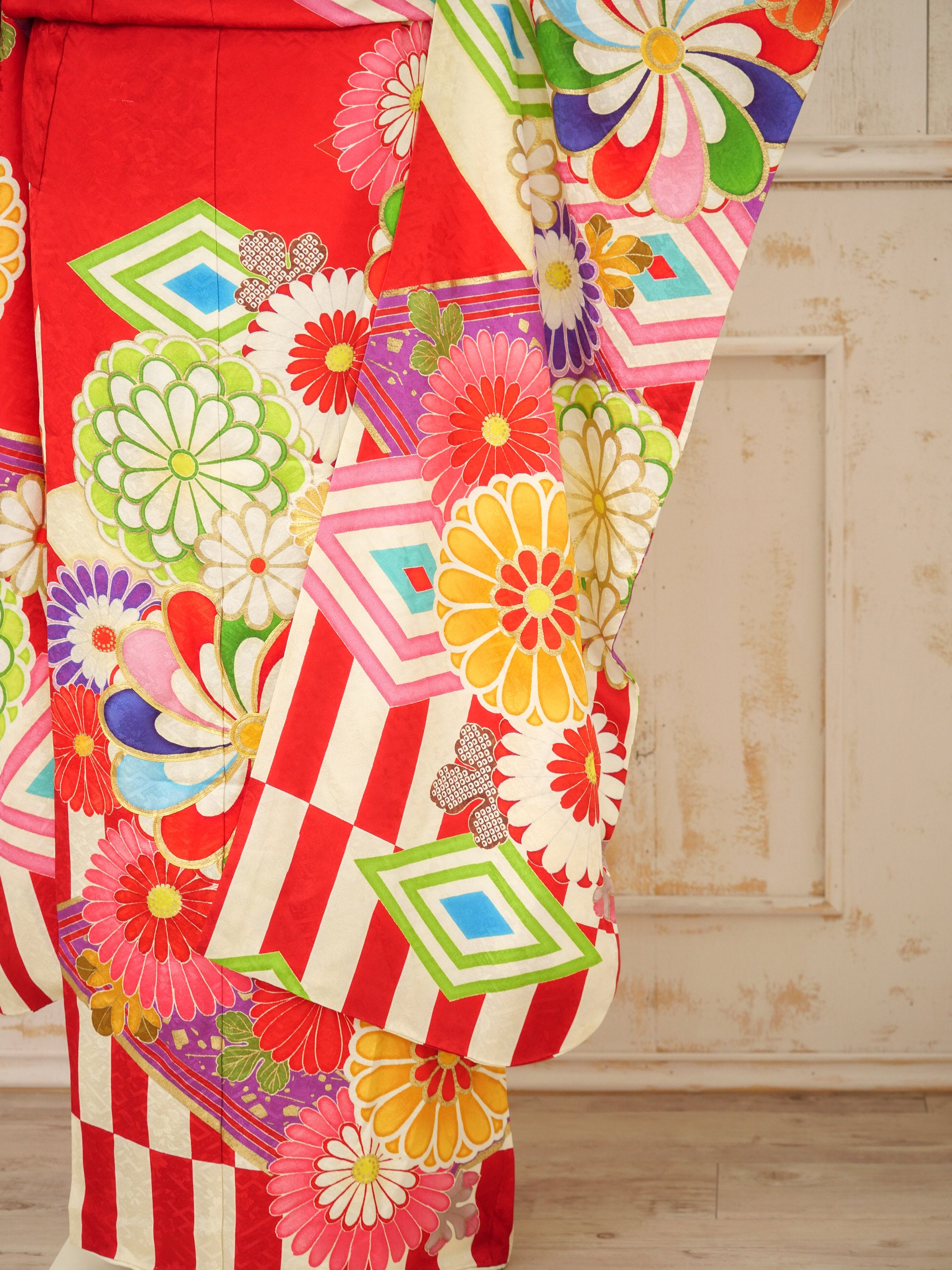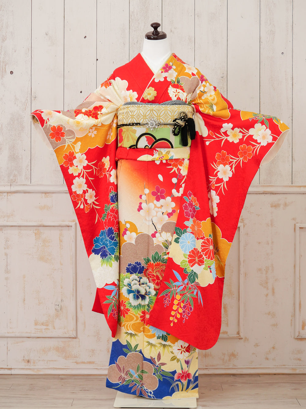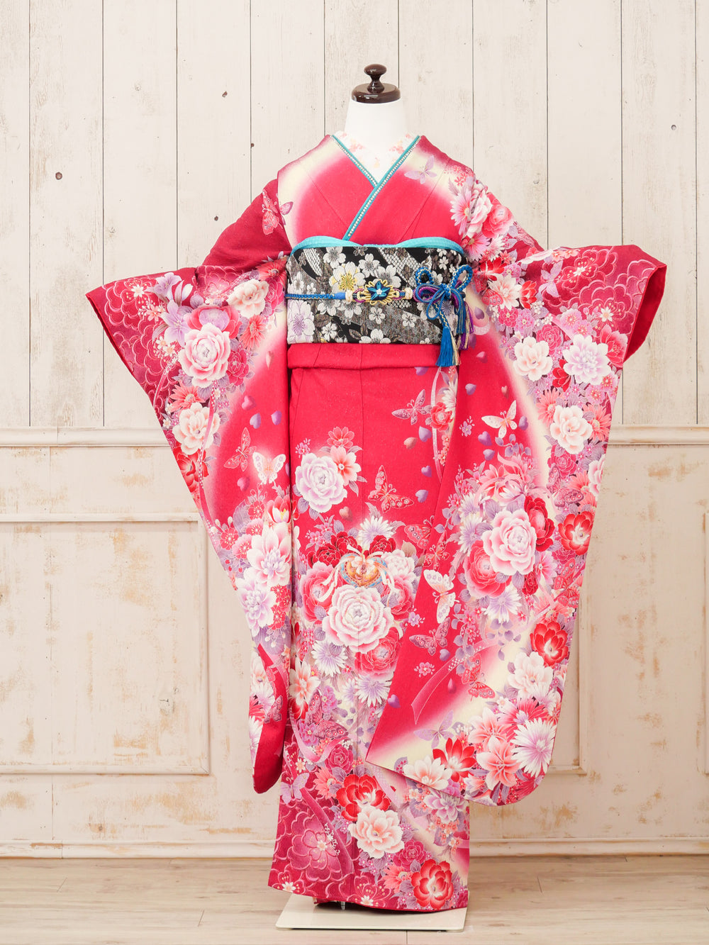情熱的な赤地に咲き誇る大輪の牡丹と金彩が華やかな一着。黒と金の配色がモダンなアクセントとなり、大人の色気を感じさせるドラマティックな印象です。