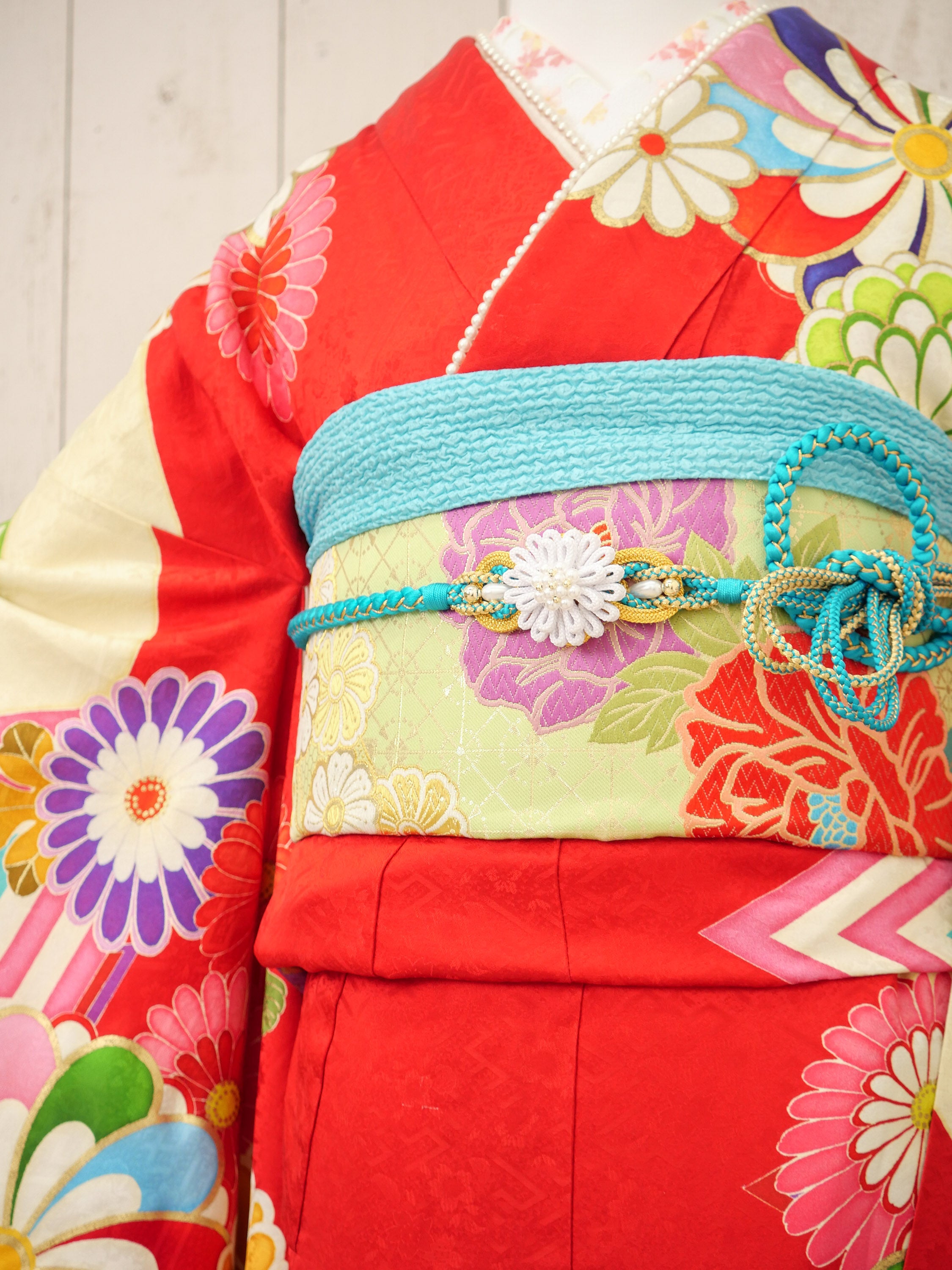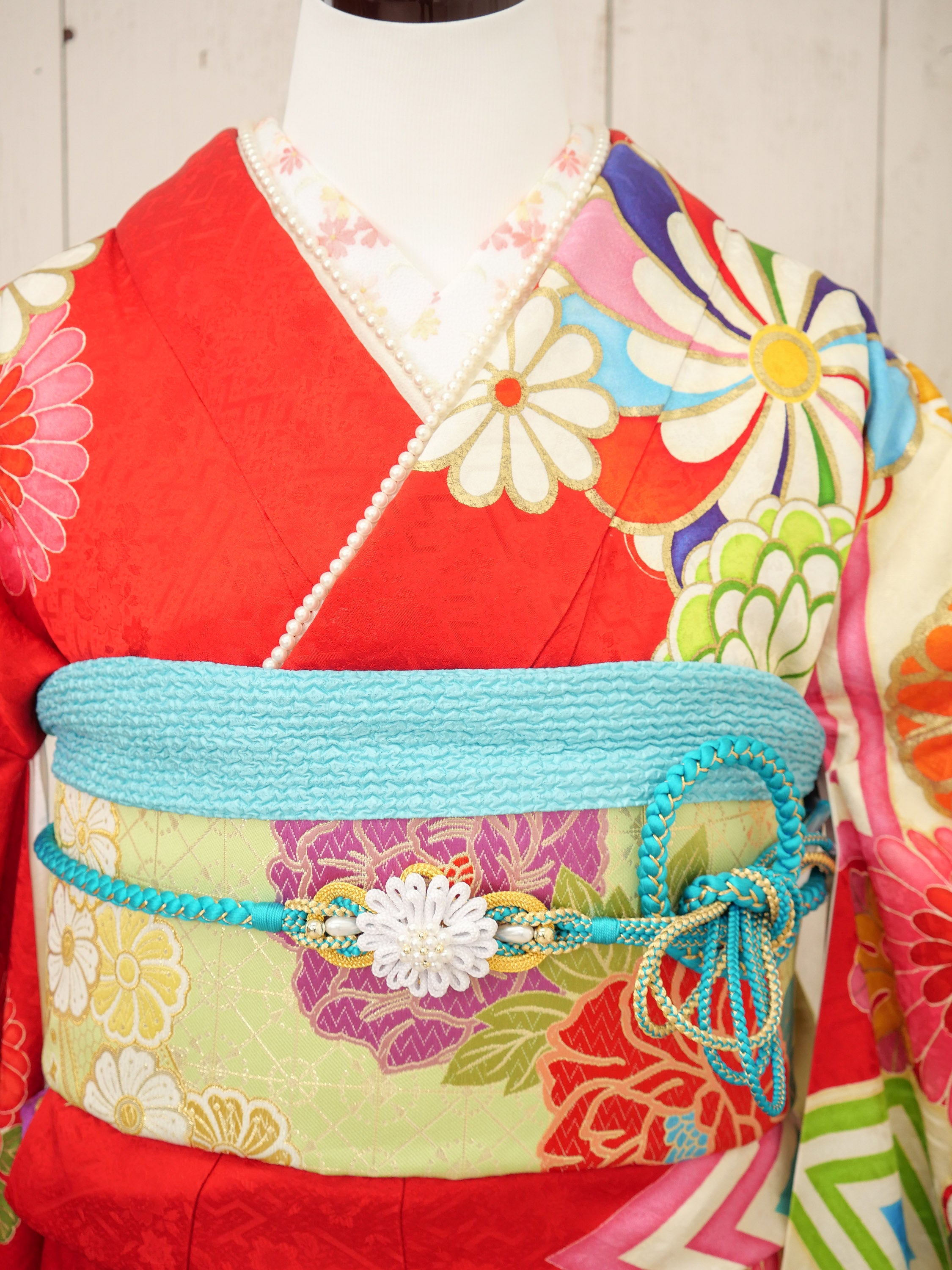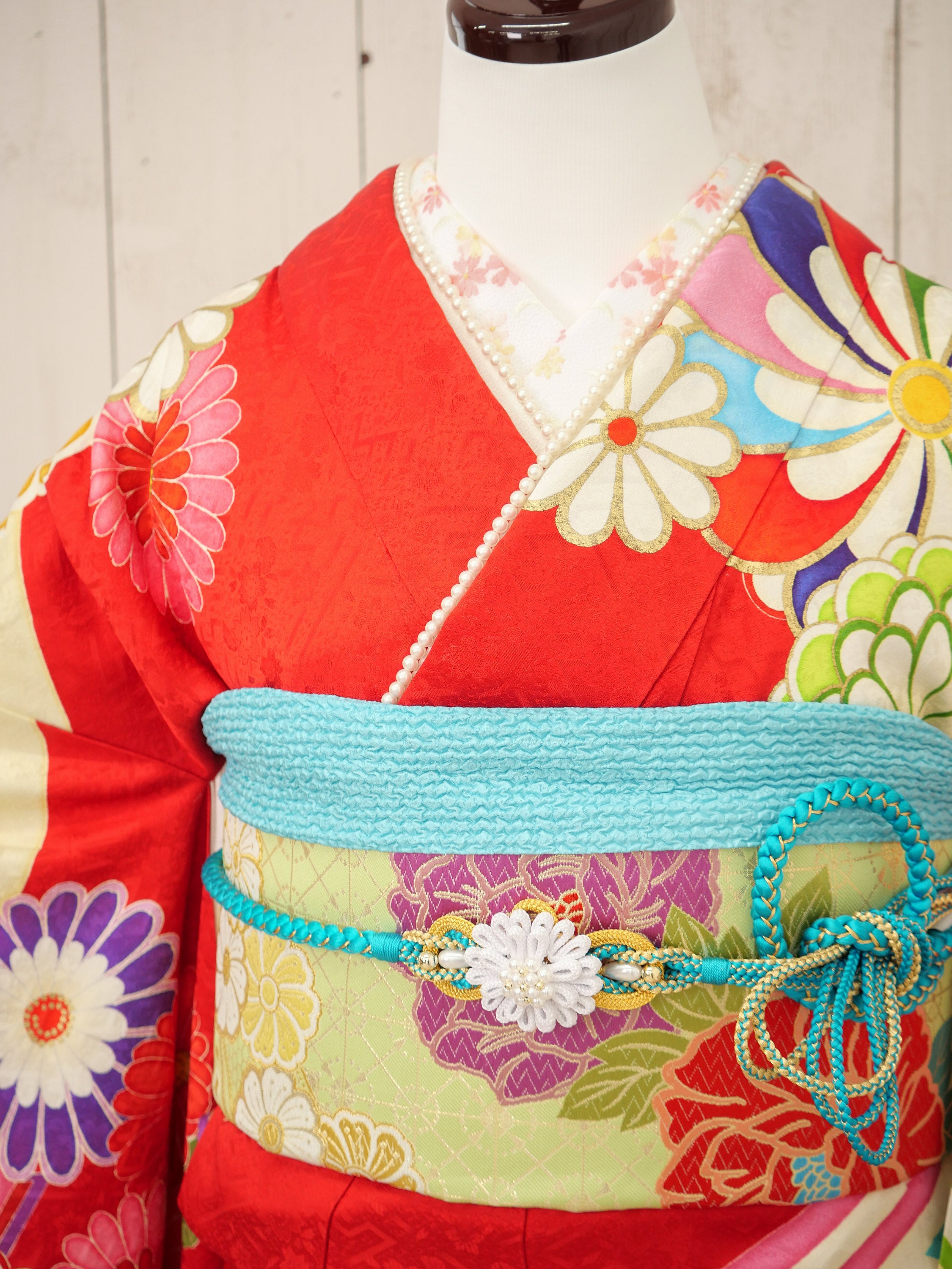 中振袖袋帯長襦袢(半襟付き、ポリエステル)重ね衿(着物に縫い付けの商品あり)帯揚げ帯締めショール腰紐5伊達締め2衿芯前板後板帯枕(ガーゼ付き)コーリンベルト1三重紐草履バッグ