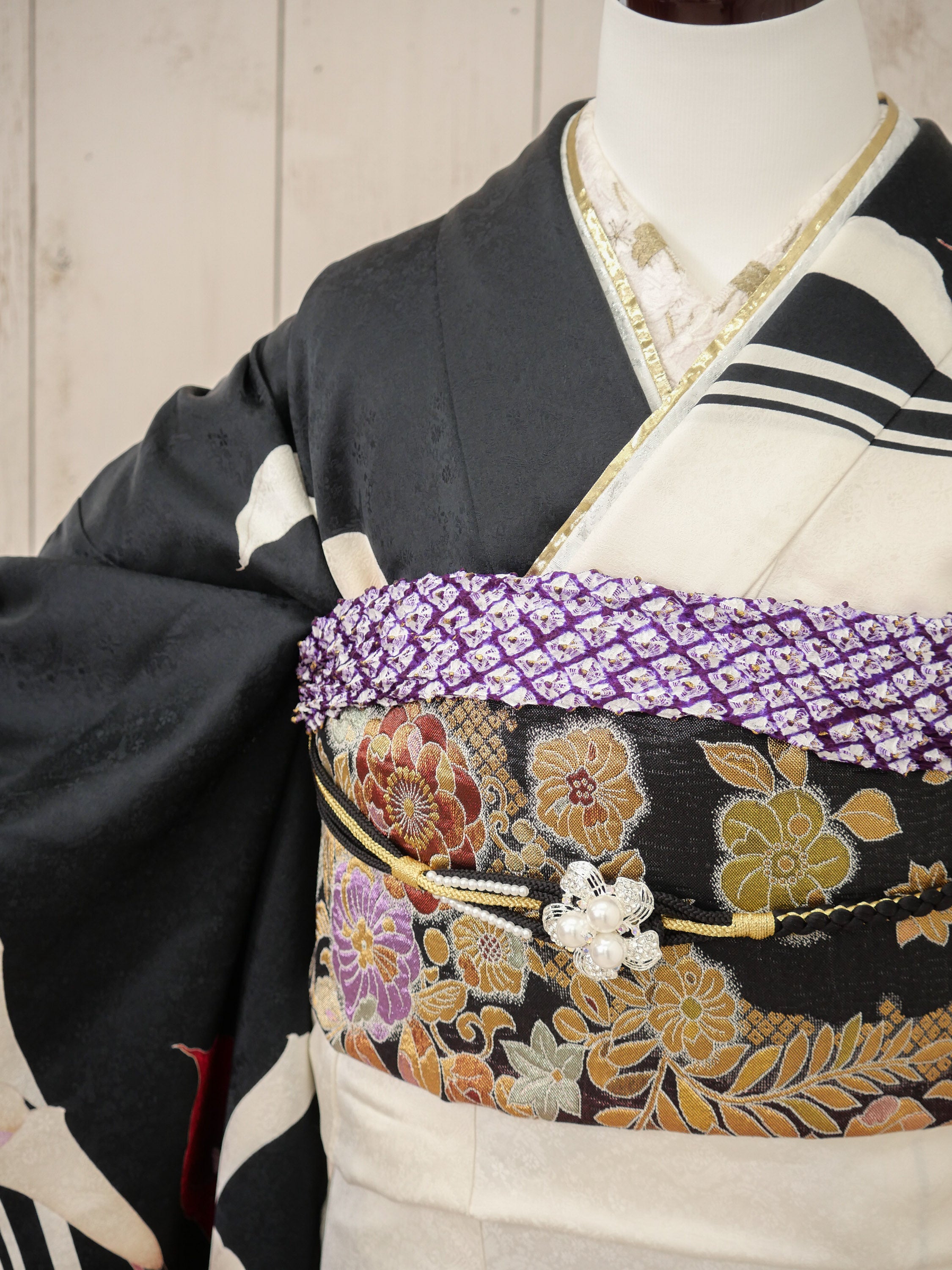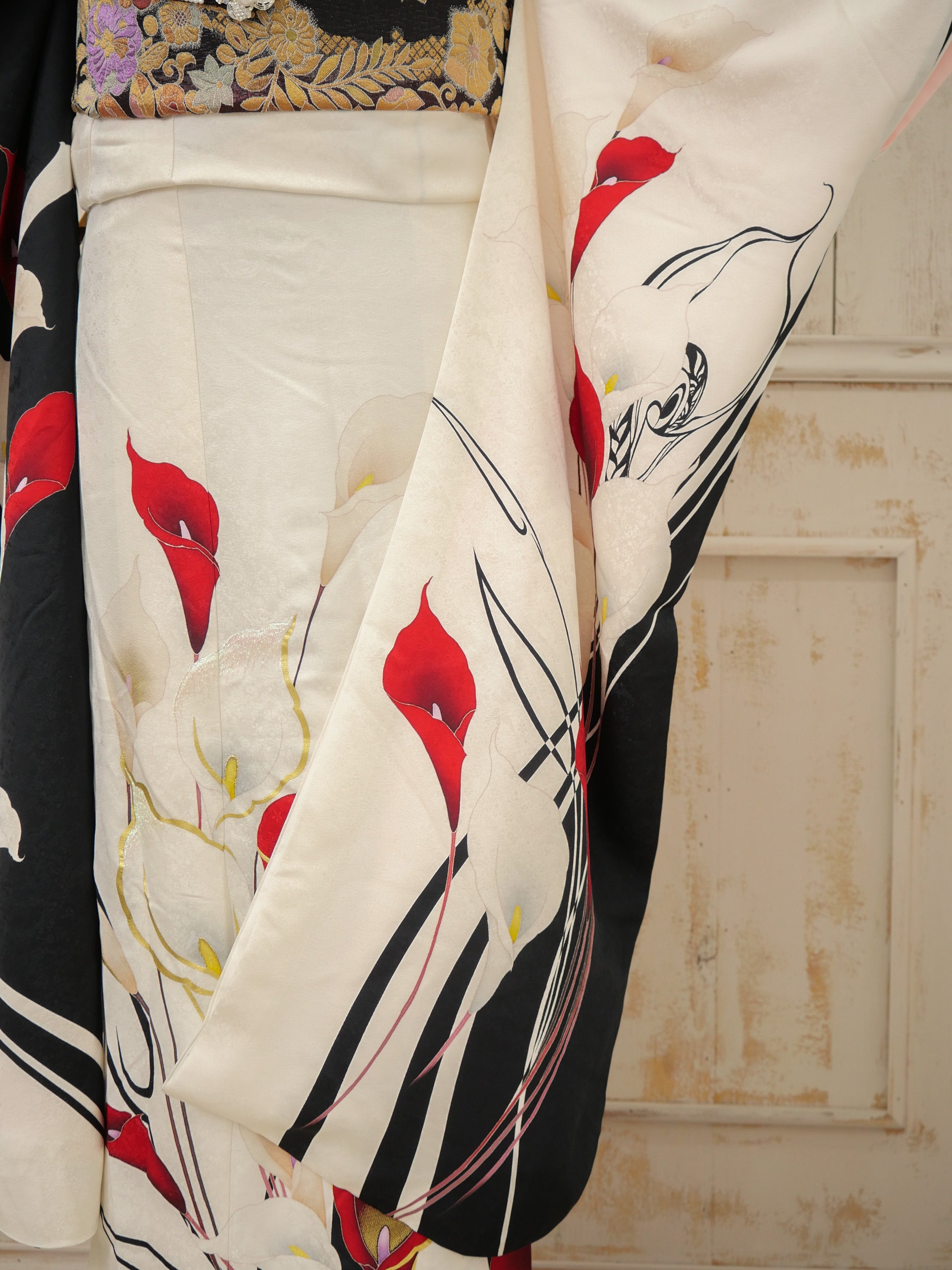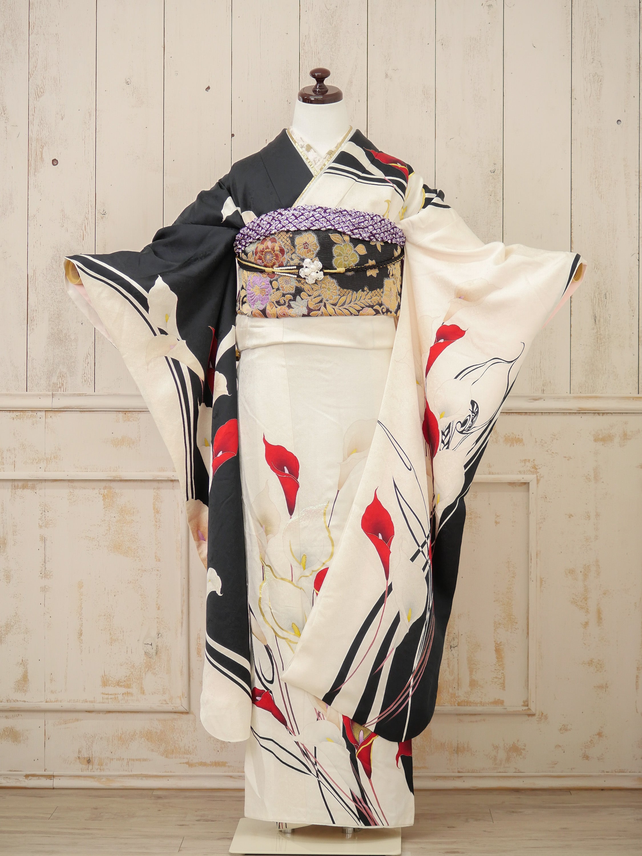 黒と白のコントラストに、真紅と白のカラーの花が印象的に描かれた大人の振袖。モード感あふれるシンプルな中に、芯のある美しさが際立ちます。
