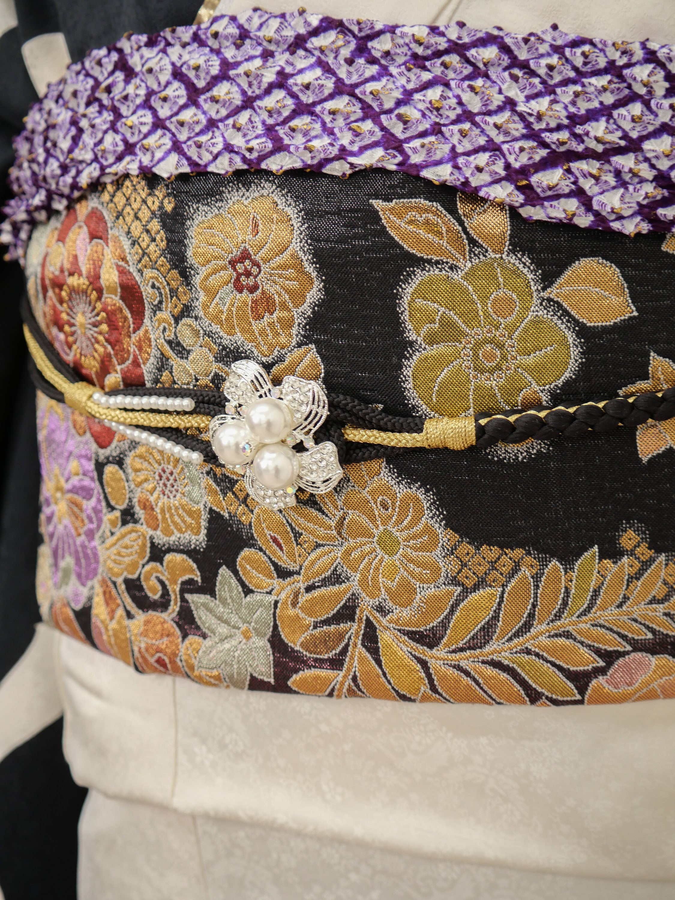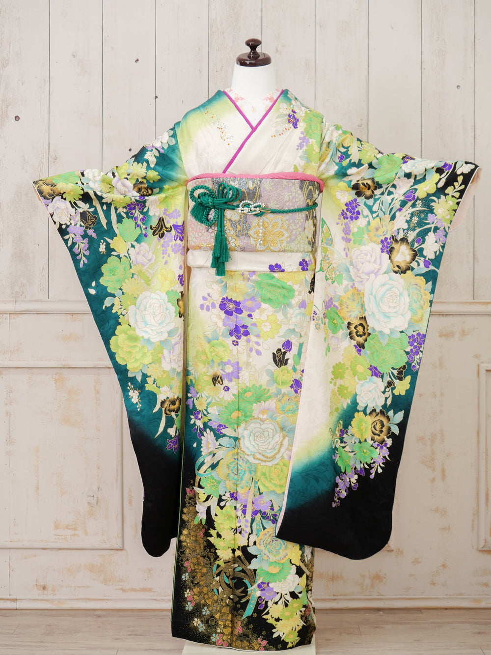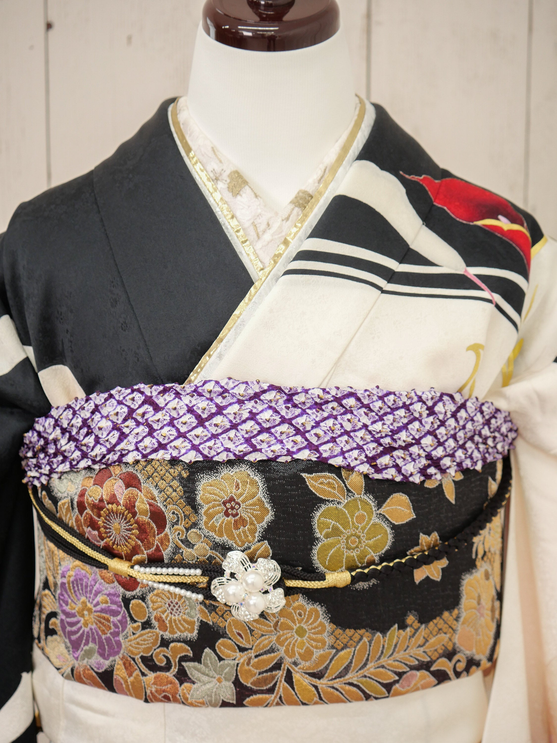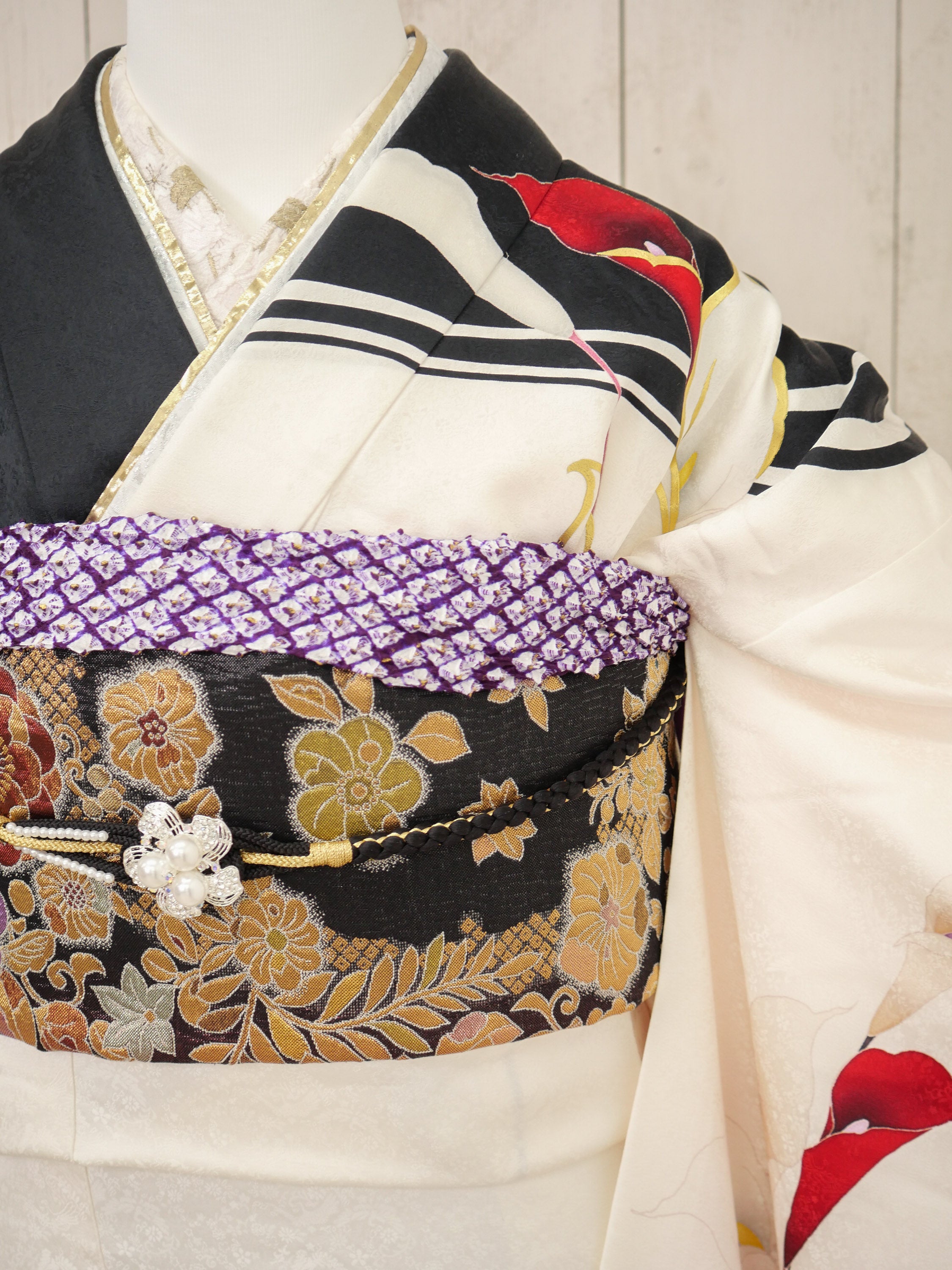 黒と白のコントラストに、真紅と白のカラーの花が印象的に描かれた大人の振袖。モード感あふれるシンプルな中に、芯のある美しさが際立ちます。