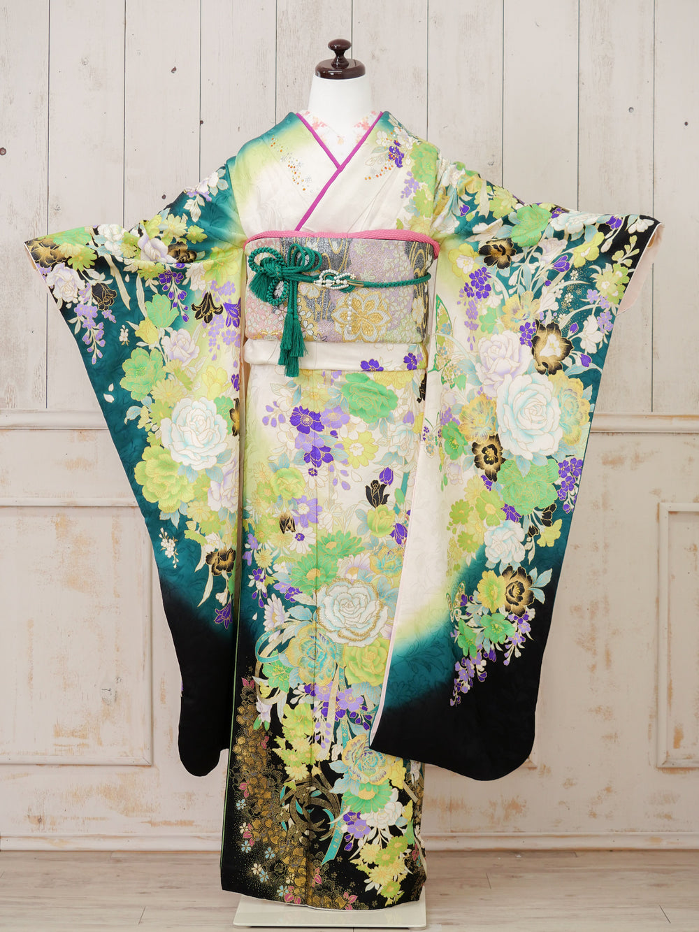 中振袖、袋帯、長襦袢(半襟付き、ポリエステル)、重ね衿(着物に縫い付けの商品あり)、帯揚げ、帯締め、ショール、腰紐5本、伊達締め2本、衿芯、前板、後板、帯枕(ガーゼ付き)、コーリンベルト1本、三重紐、草履、バッグ