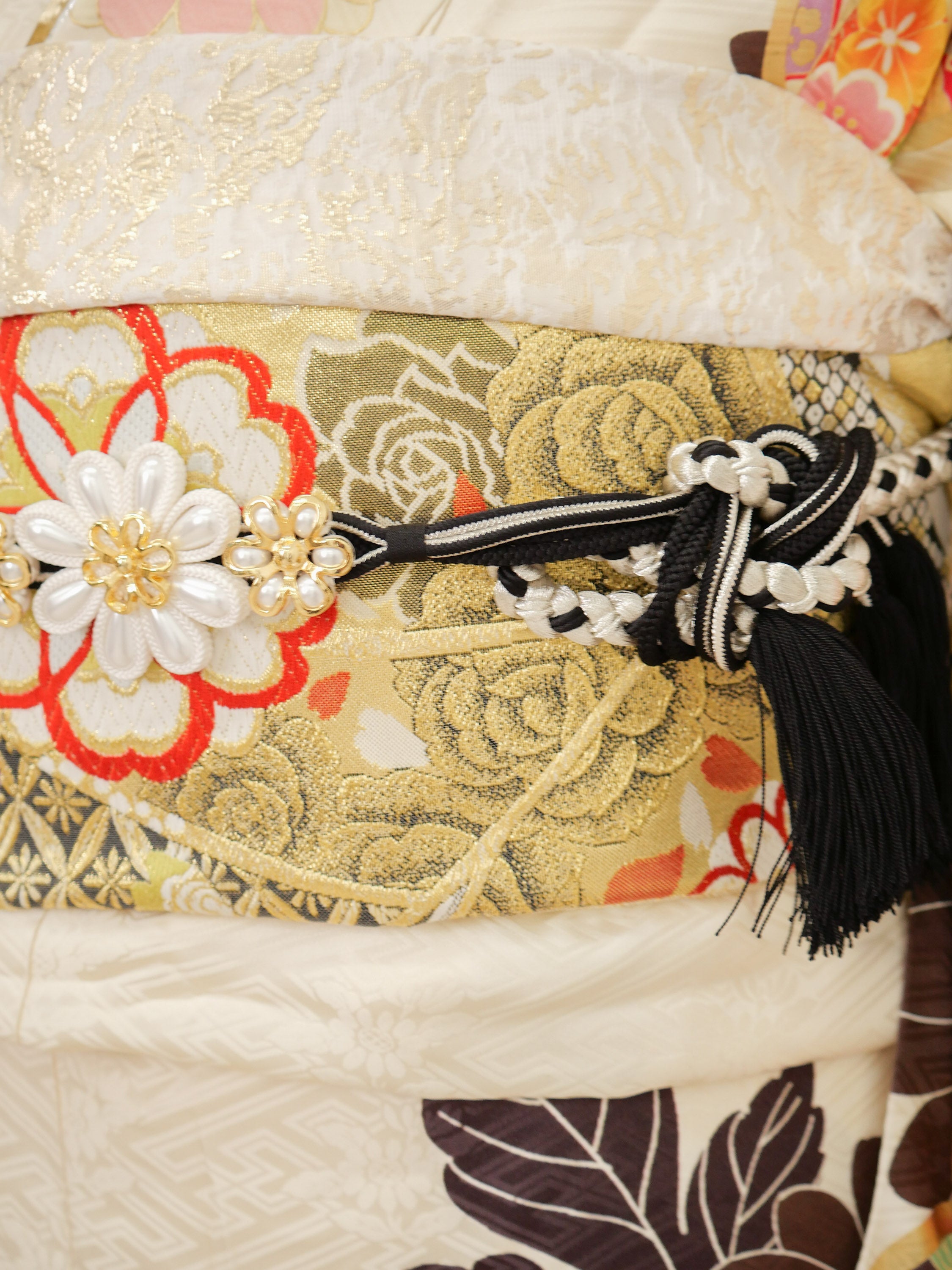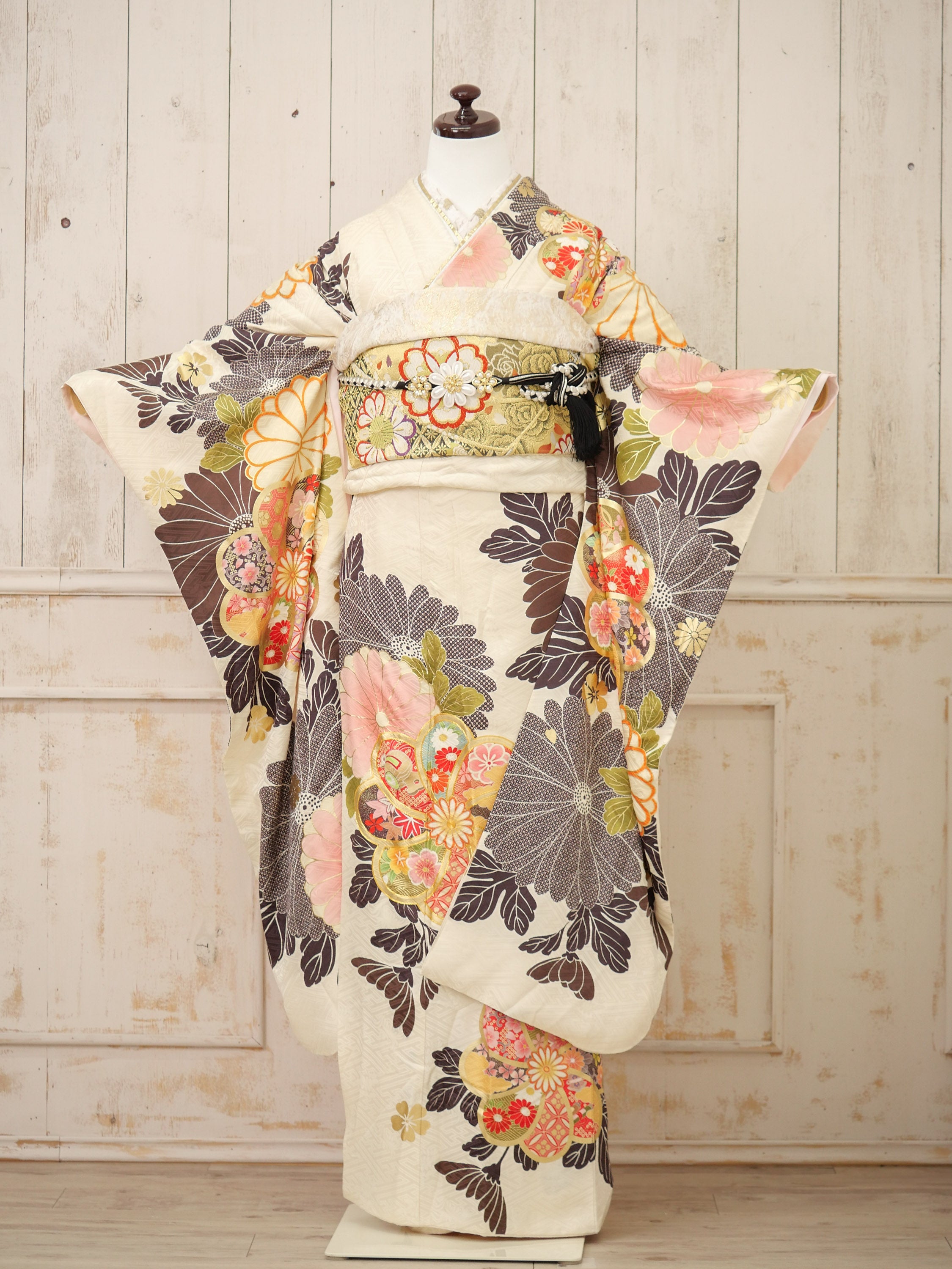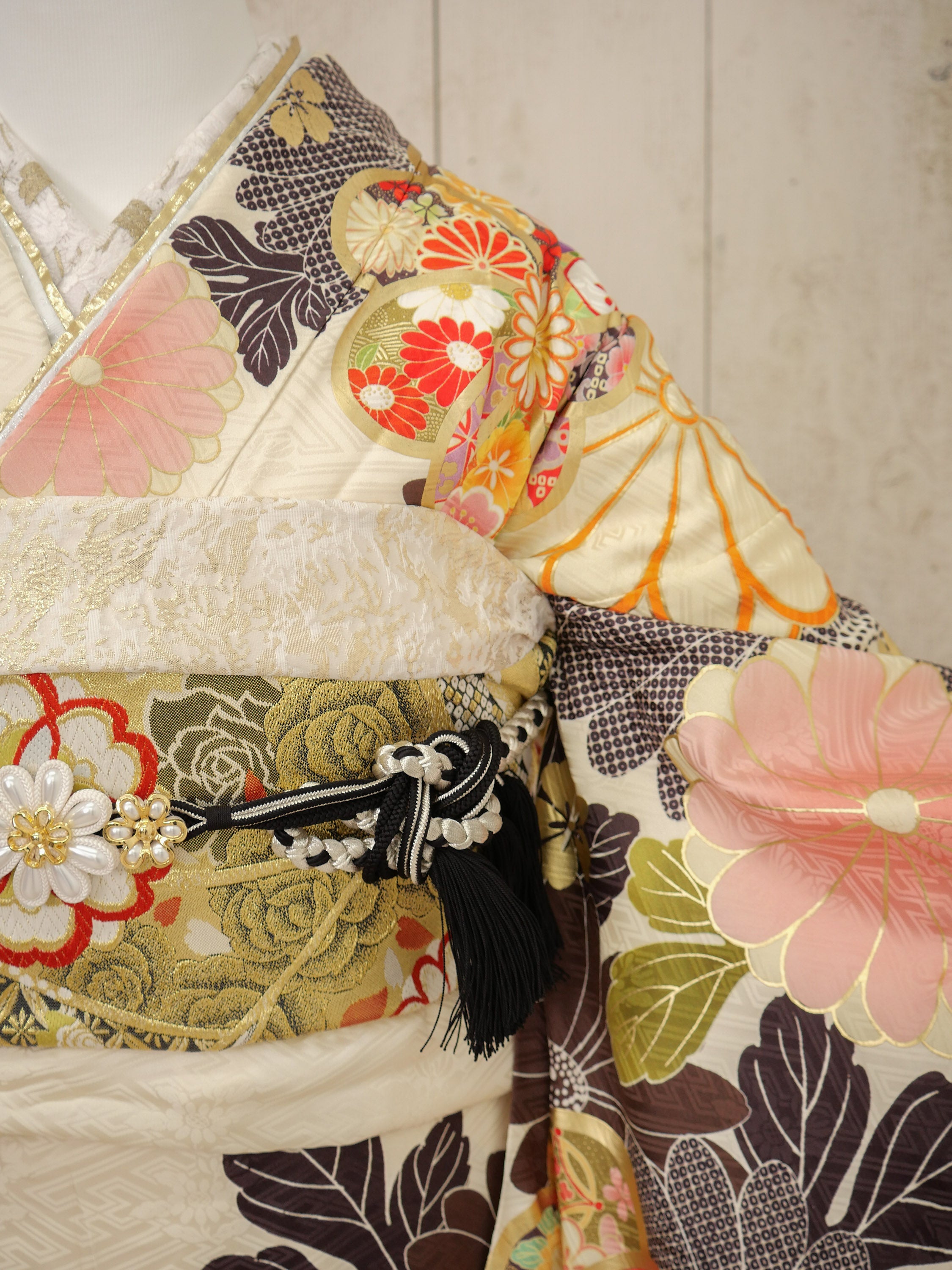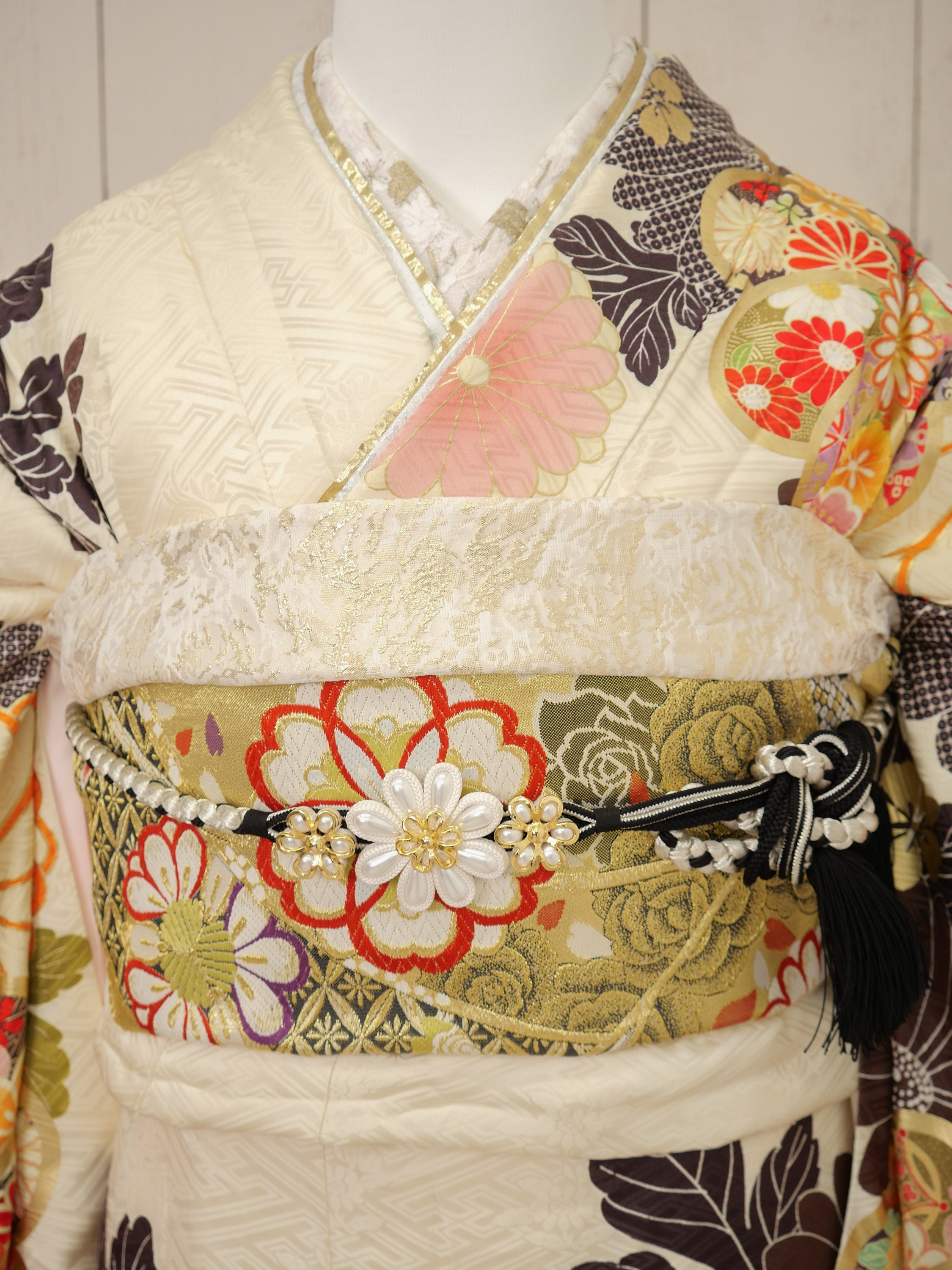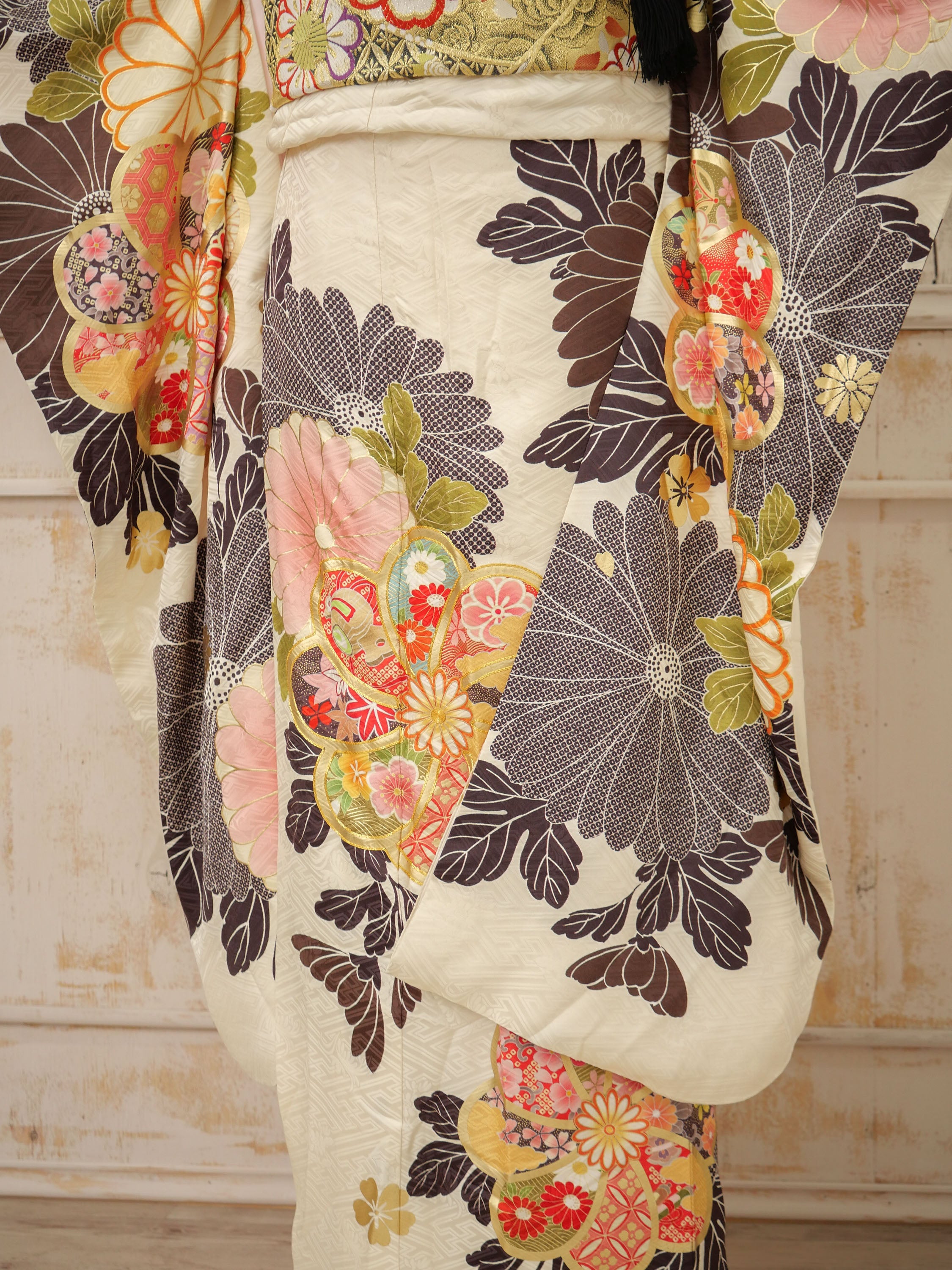生成り地に大輪の菊と梅が咲き誇るクラシカルなデザイン。落ち着きある配色に、赤と黄の差し色が上品なアクセントに。レトロモダンな装いで、気品と可憐さを演出します。