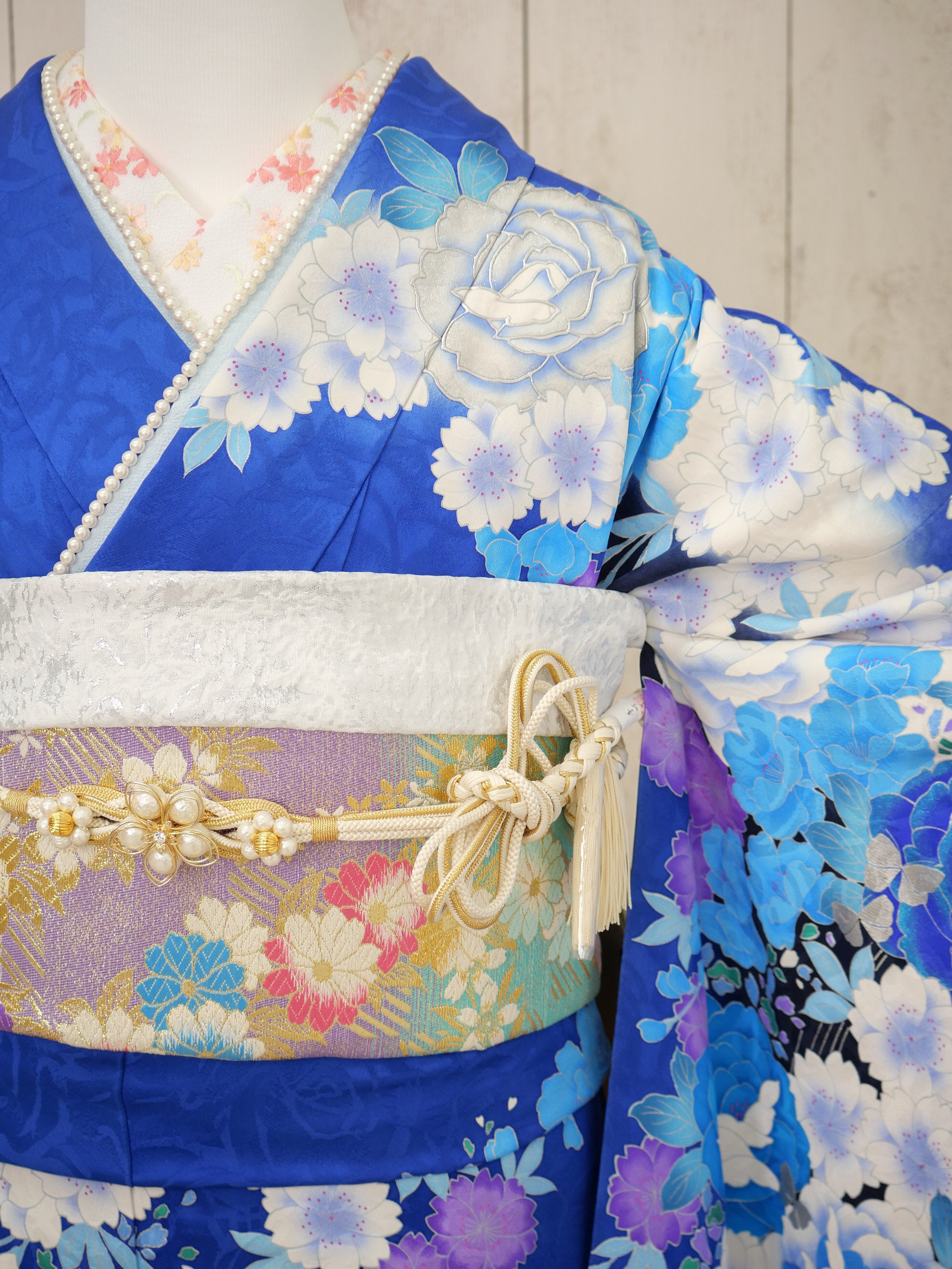 中振袖、袋帯、長襦袢(半襟付き、ポリエステル)、重ね衿(着物に縫い付けの商品あり)、帯揚げ、帯締め、ショール、腰紐5本、伊達締め2本、衿芯、前板、後板、帯枕(ガーゼ付き)、コーリンベルト1本、三重紐、草履、バッグ