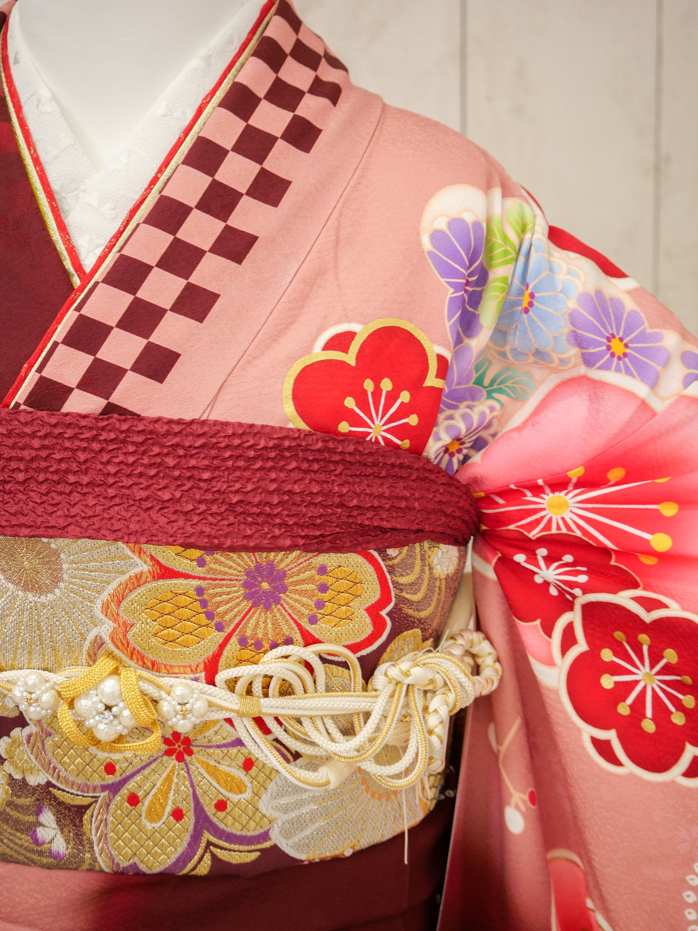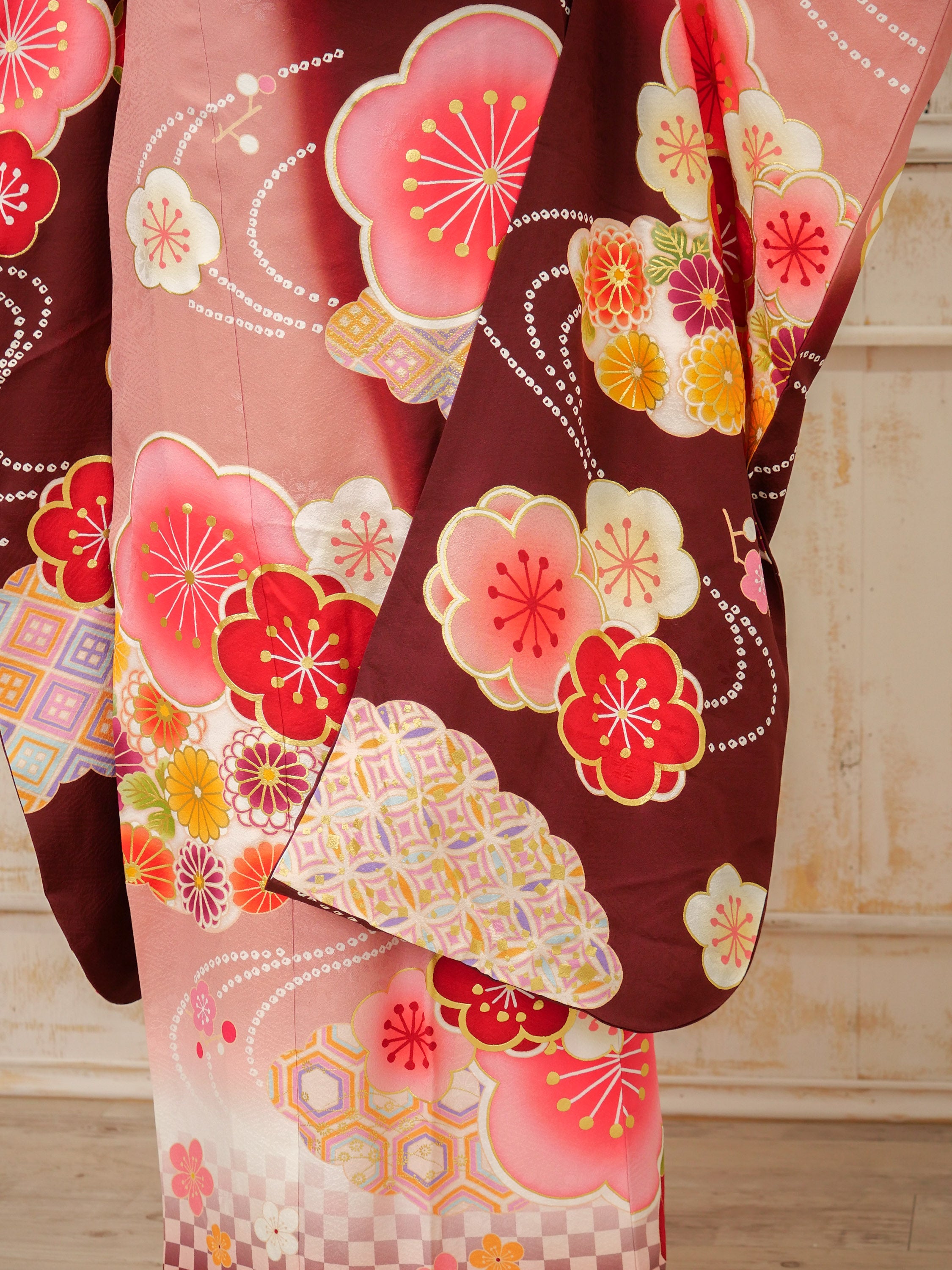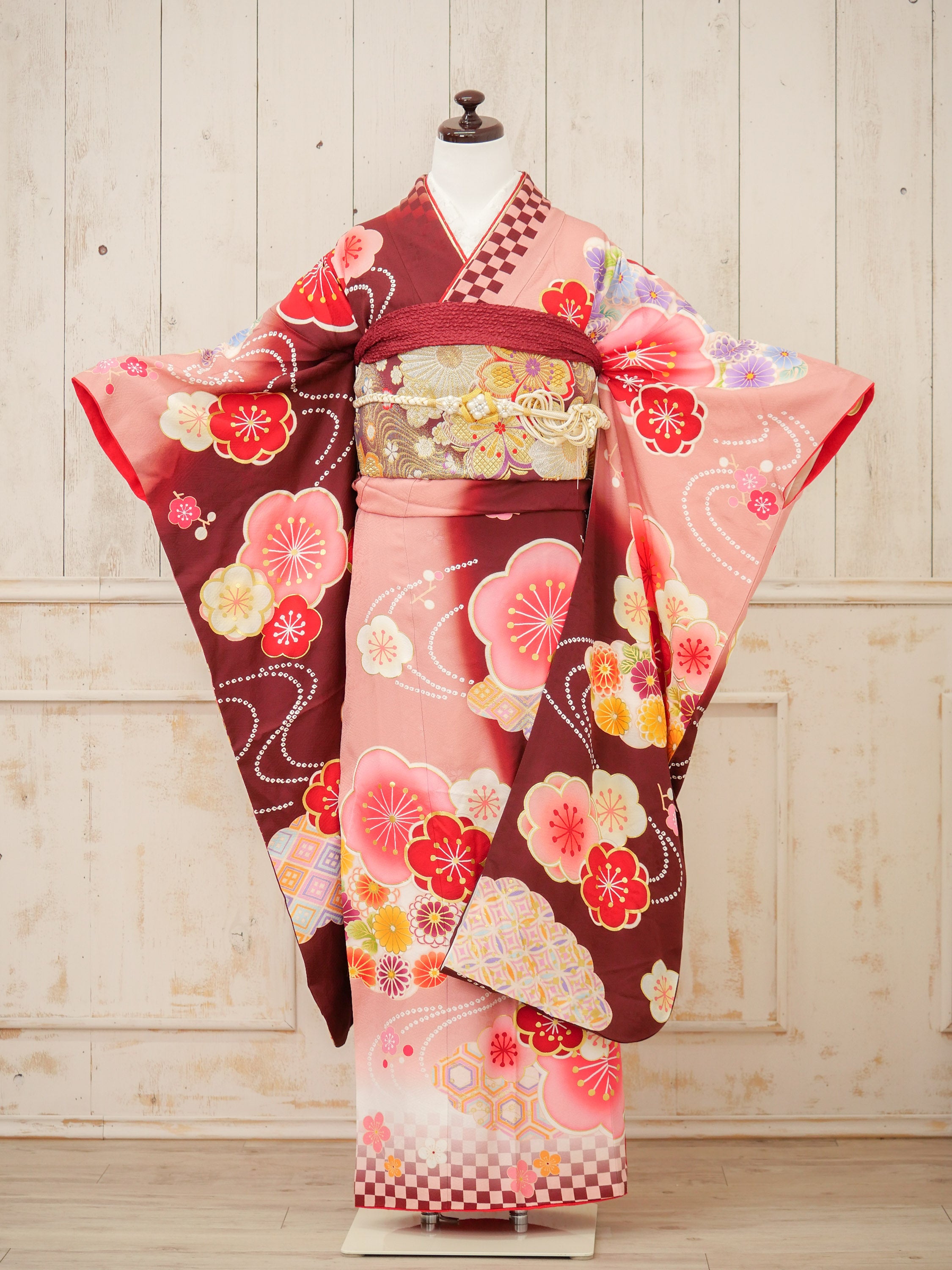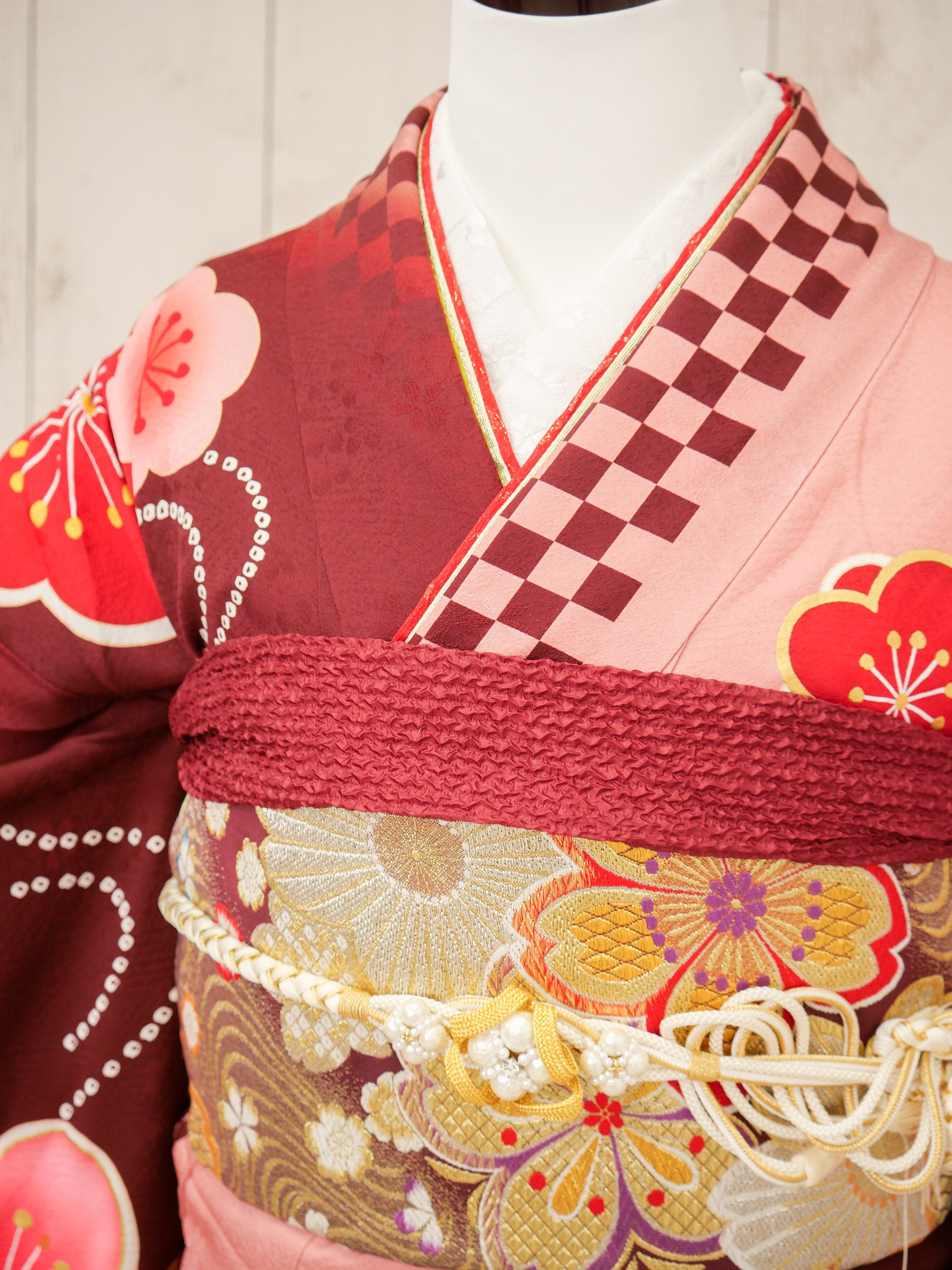 深みのあるえんじ色に金・白の菊が浮かぶ、大人の魅力が光る一着。グラデーションの染めと繊細な柄行きが幻想的で美しく、格式と品格を備えた存在感のある振袖です。