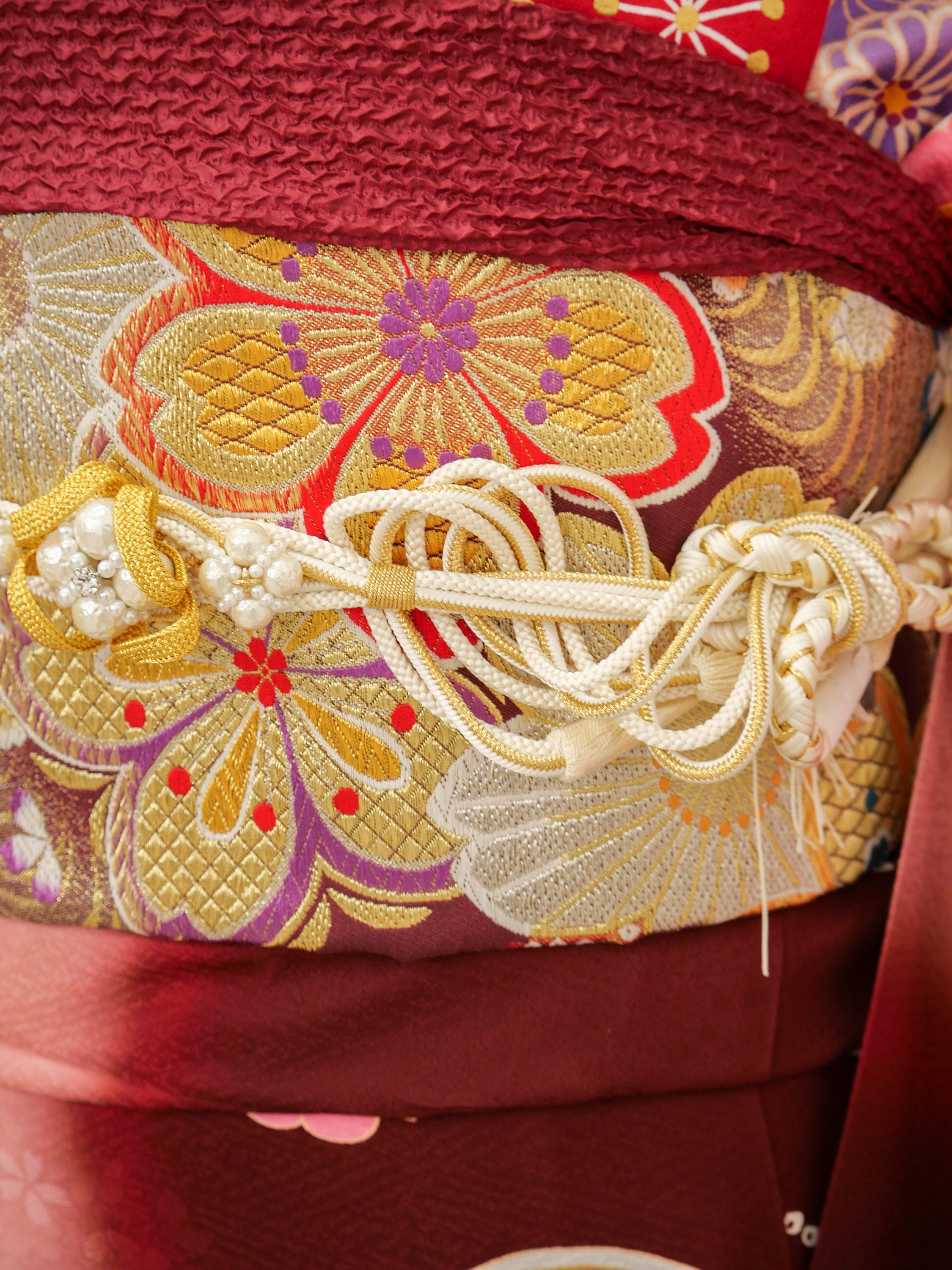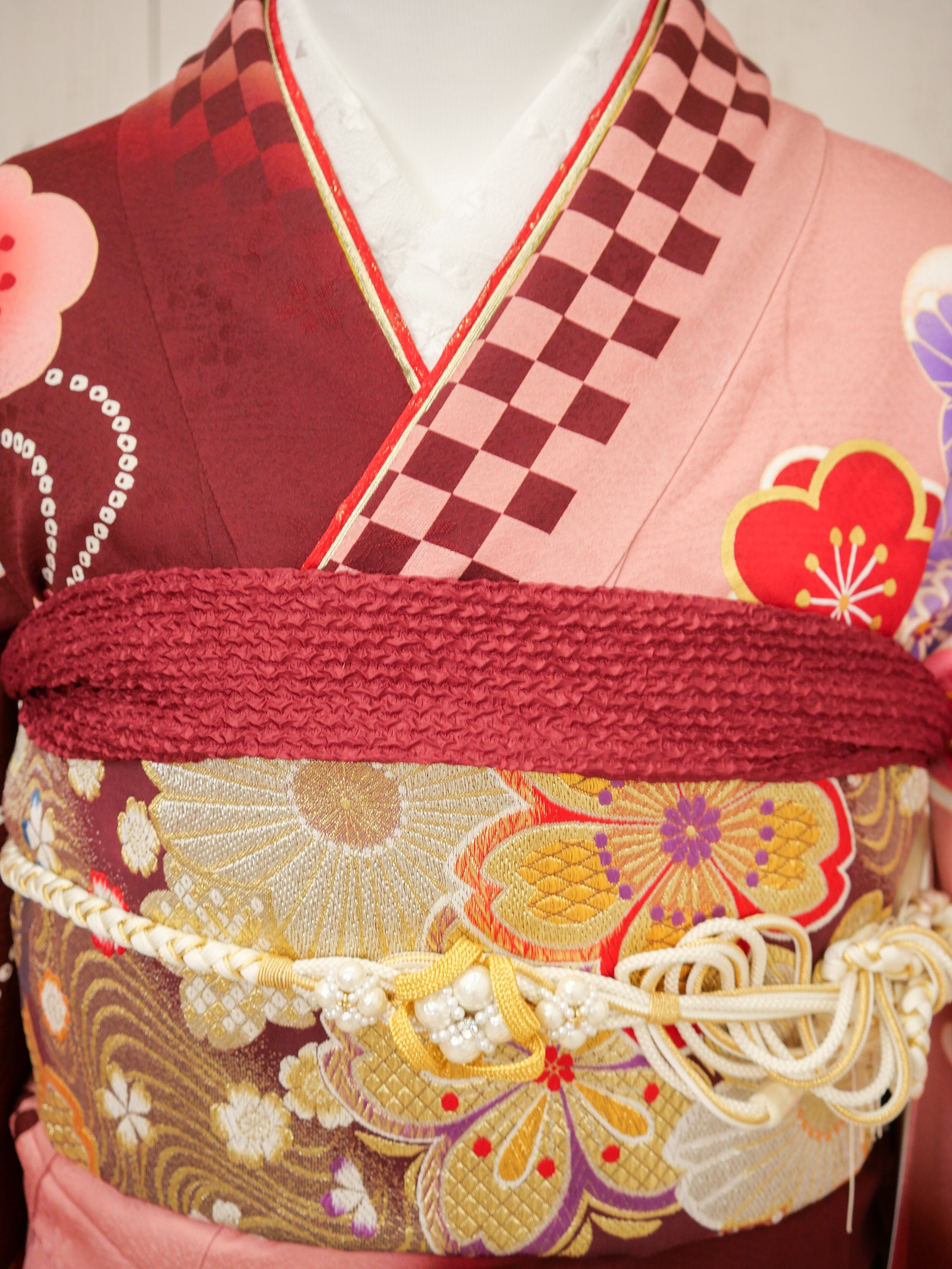 中振袖袋帯長襦袢(半襟付き、ポリエステル)重ね衿(着物に縫い付けの商品あり)帯揚げ帯締めショール腰紐5伊達締め2衿芯前板後板帯枕(ガーゼ付き)コーリンベルト1三重紐草履バッグ