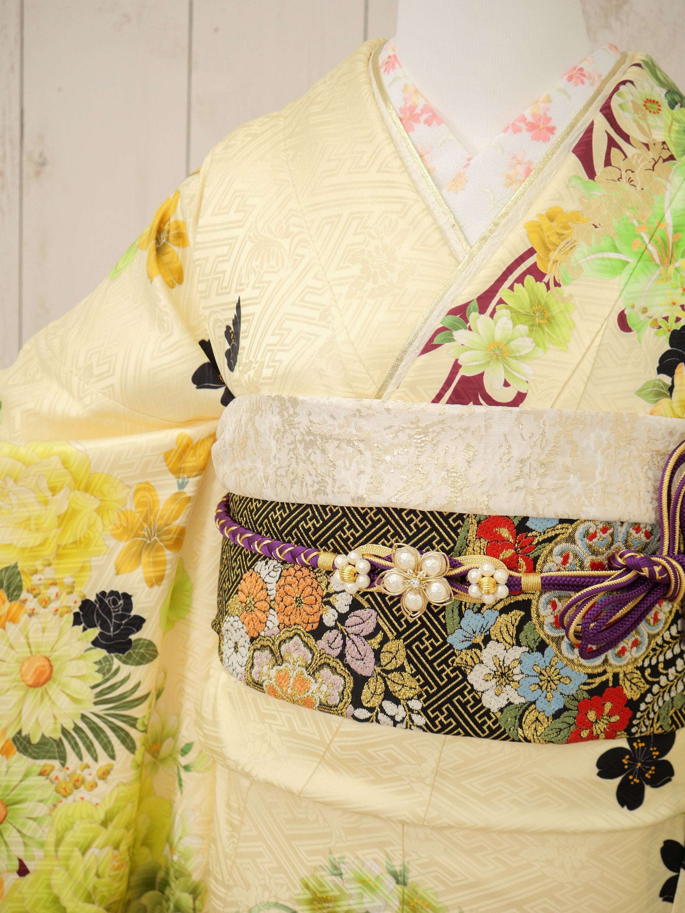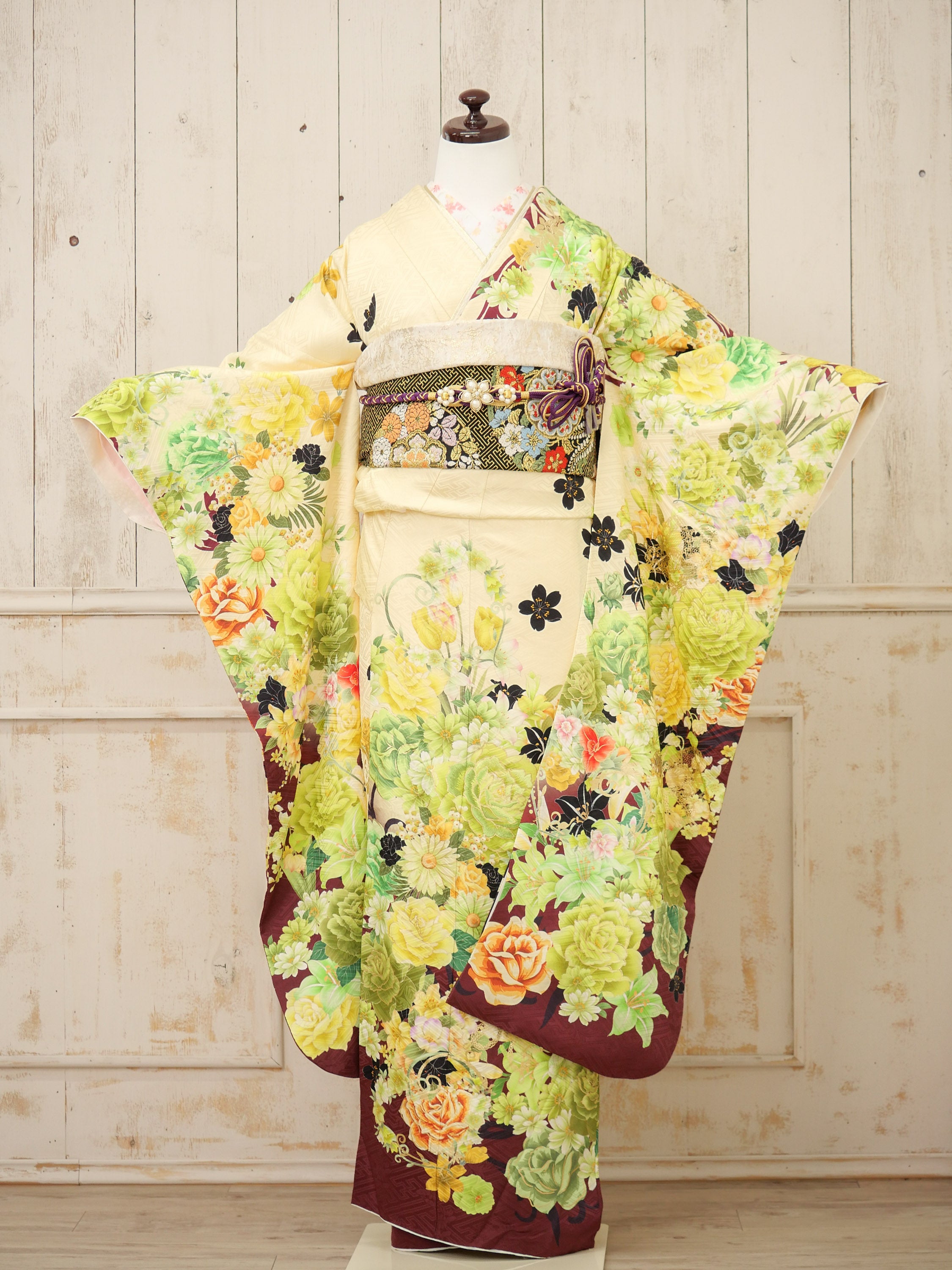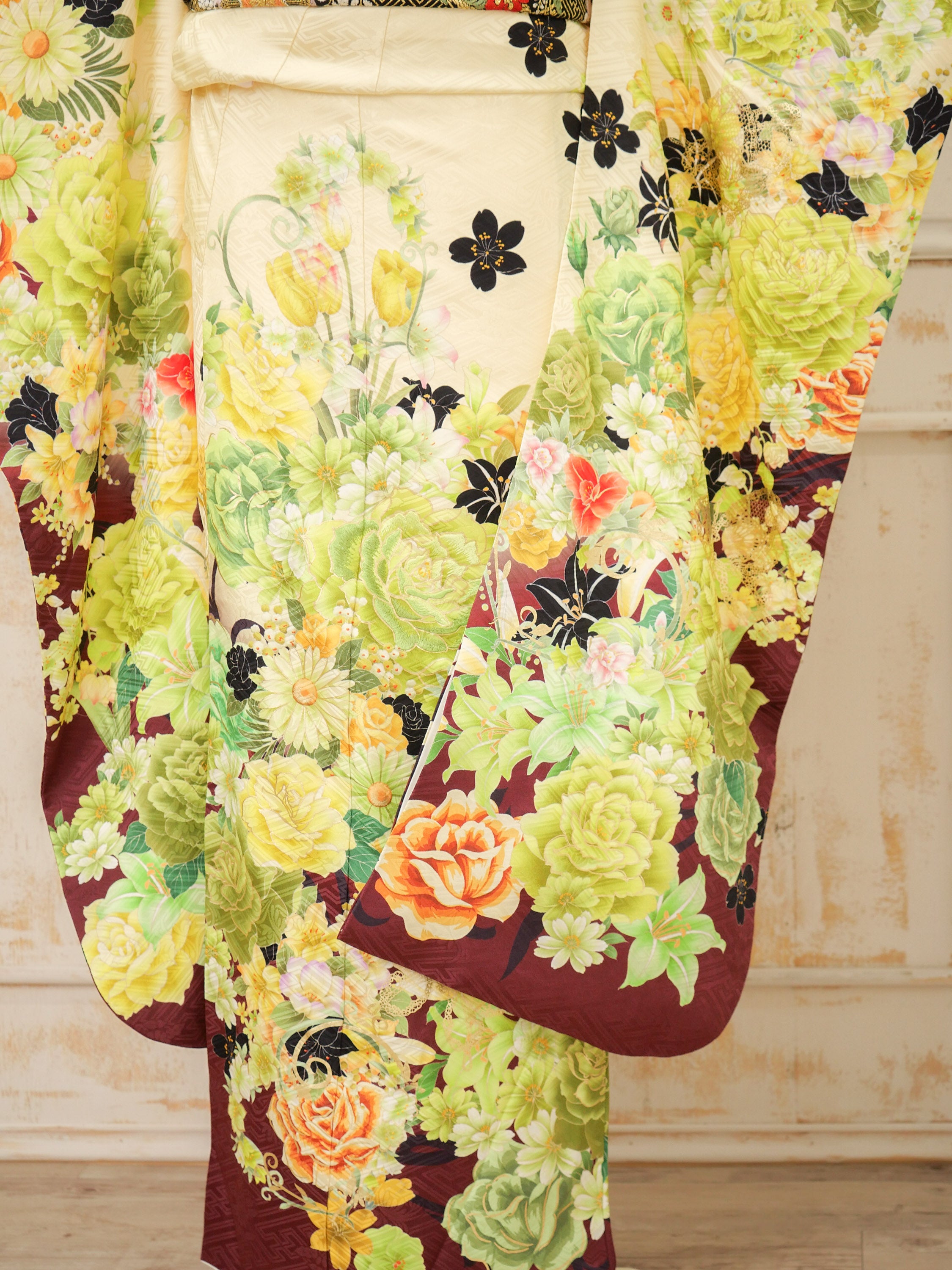 クリーム地にイエローからライムグリーンまでのフラワーグラデーションが印象的な振袖。淡く柔らかな雰囲気ながら、大柄のバラが華やかさを添える、品と個性を両立させた一着です。