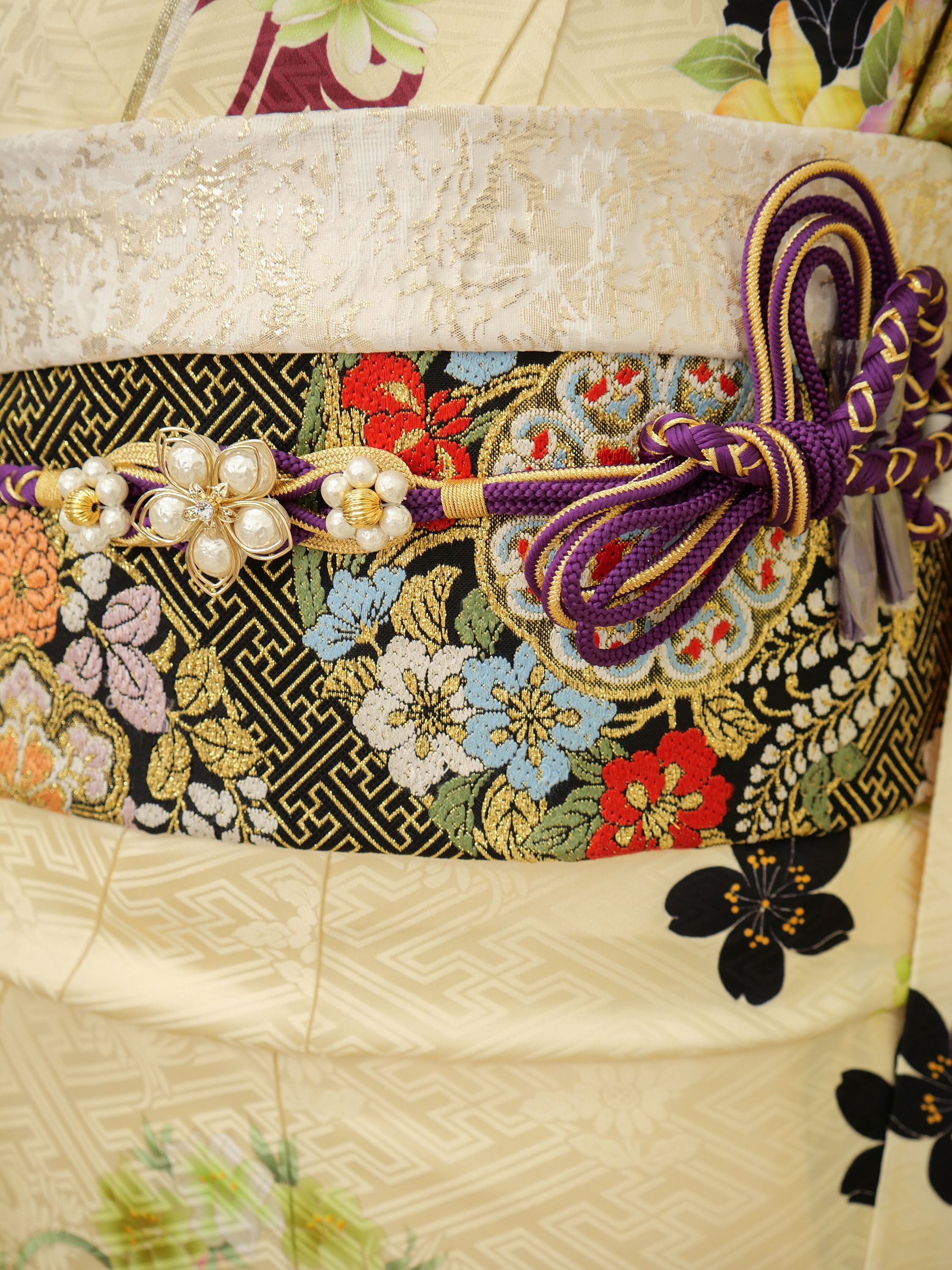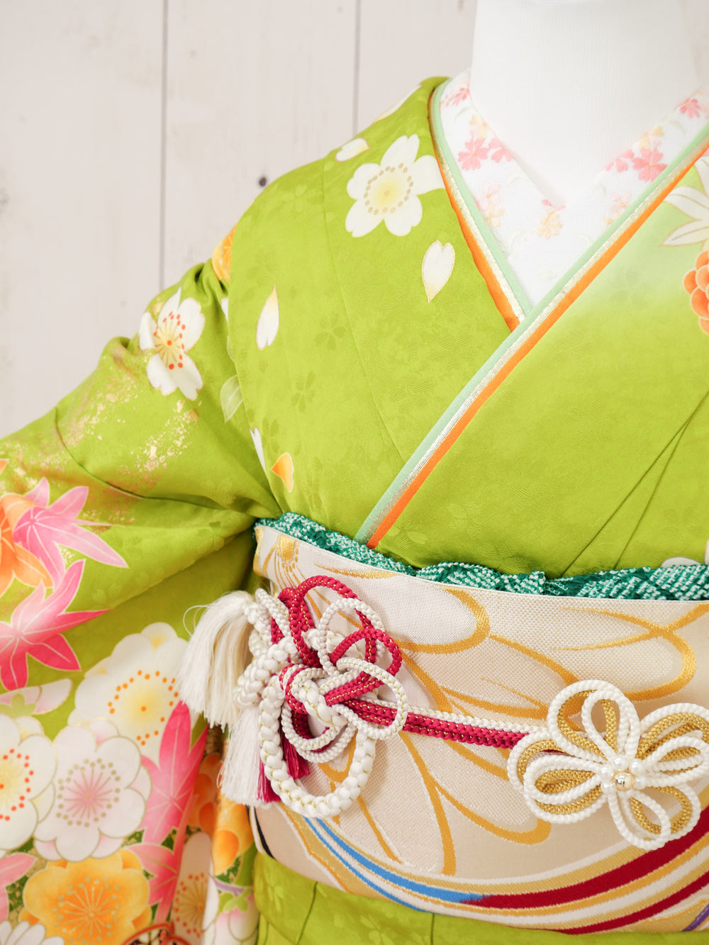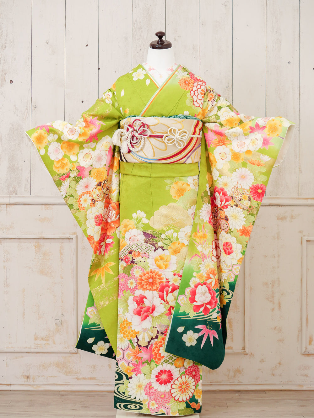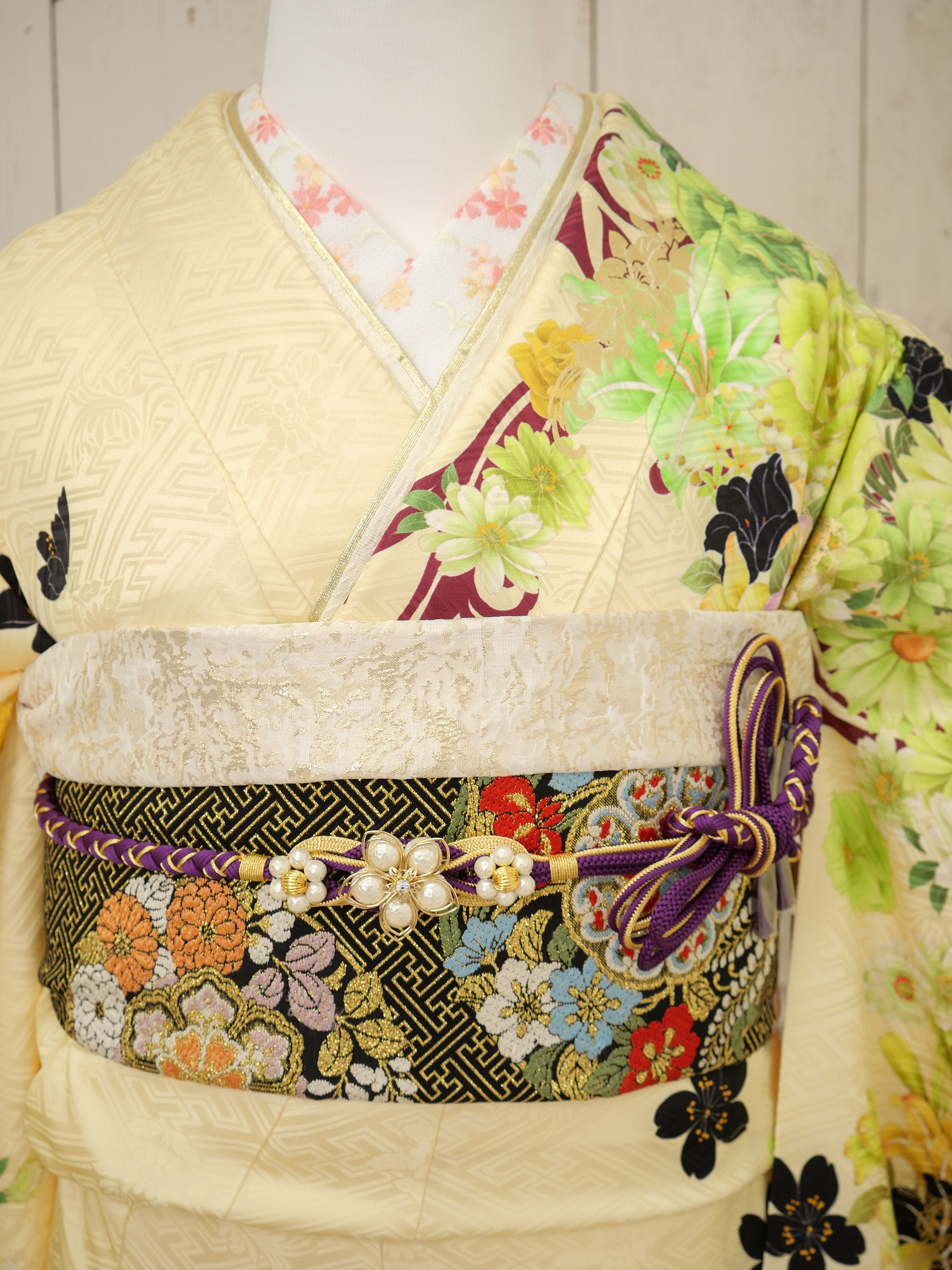 クリーム地にイエローからライムグリーンまでのフラワーグラデーションが印象的な振袖。淡く柔らかな雰囲気ながら、大柄のバラが華やかさを添える、品と個性を両立させた一着です。