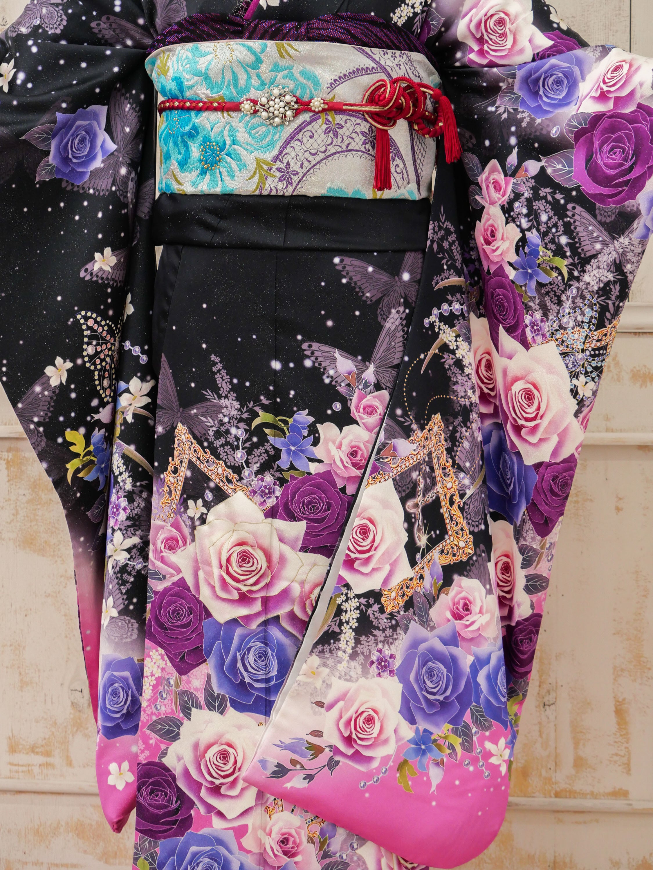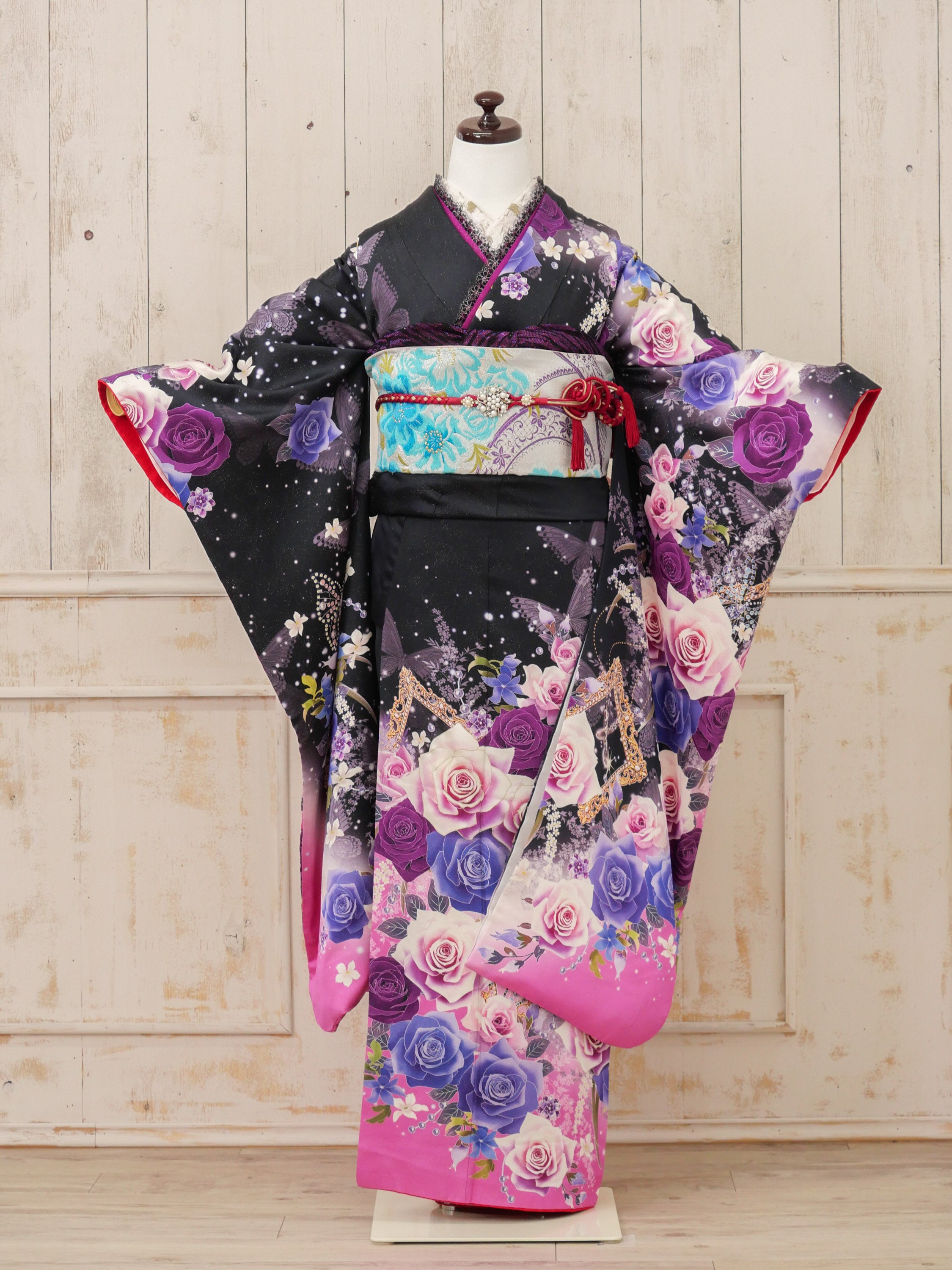 FR-059 黒地紫バラ蝶 振袖