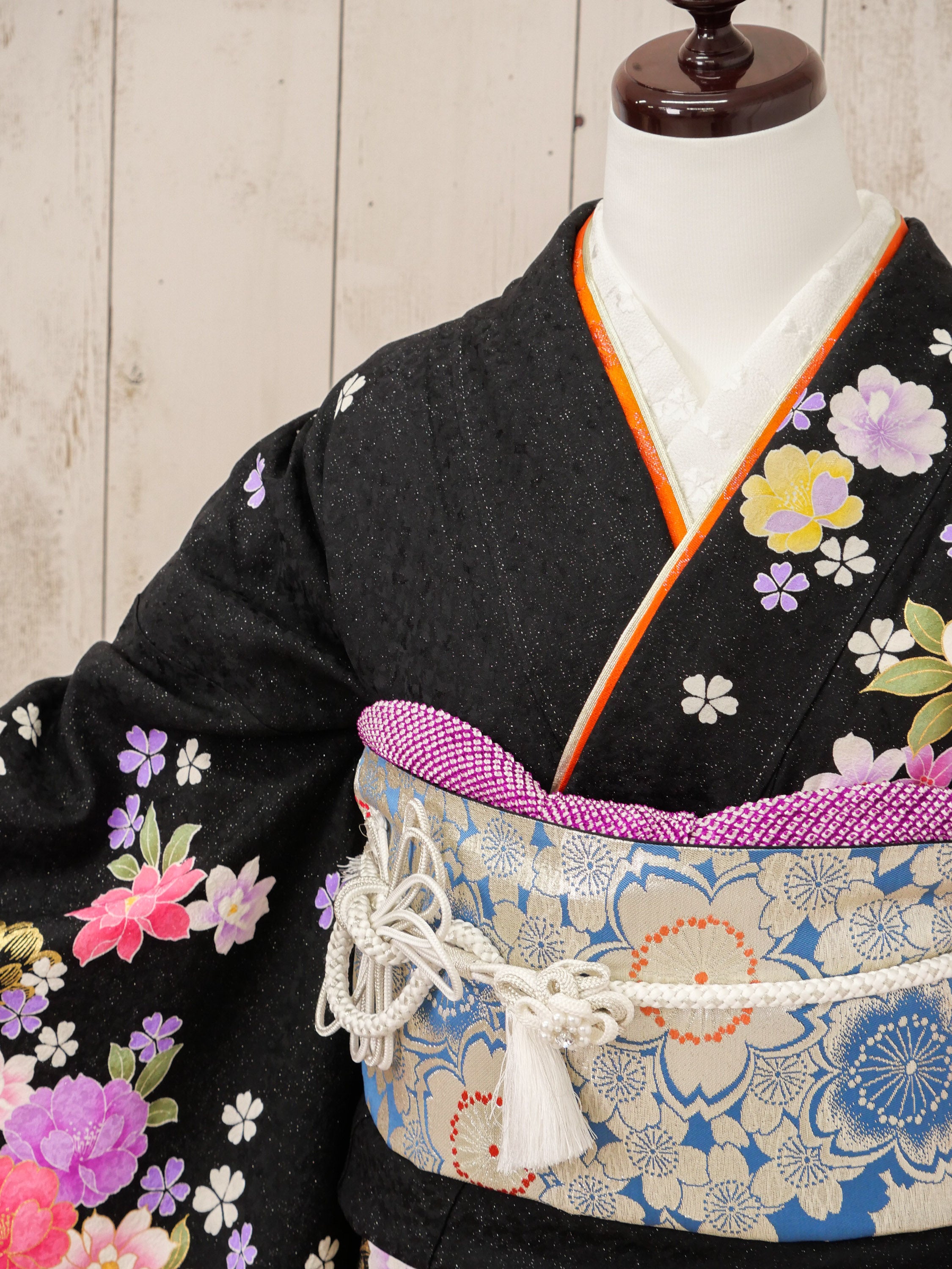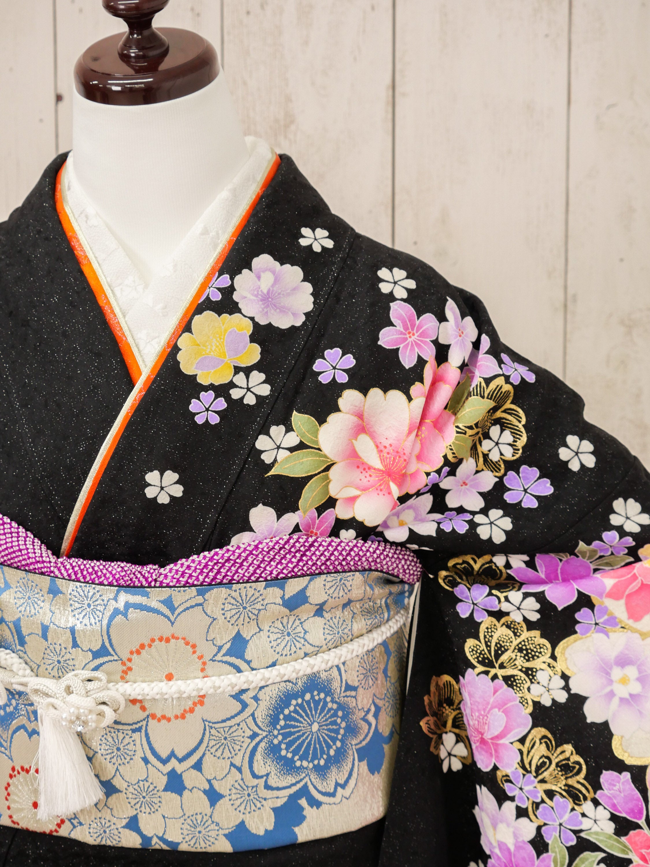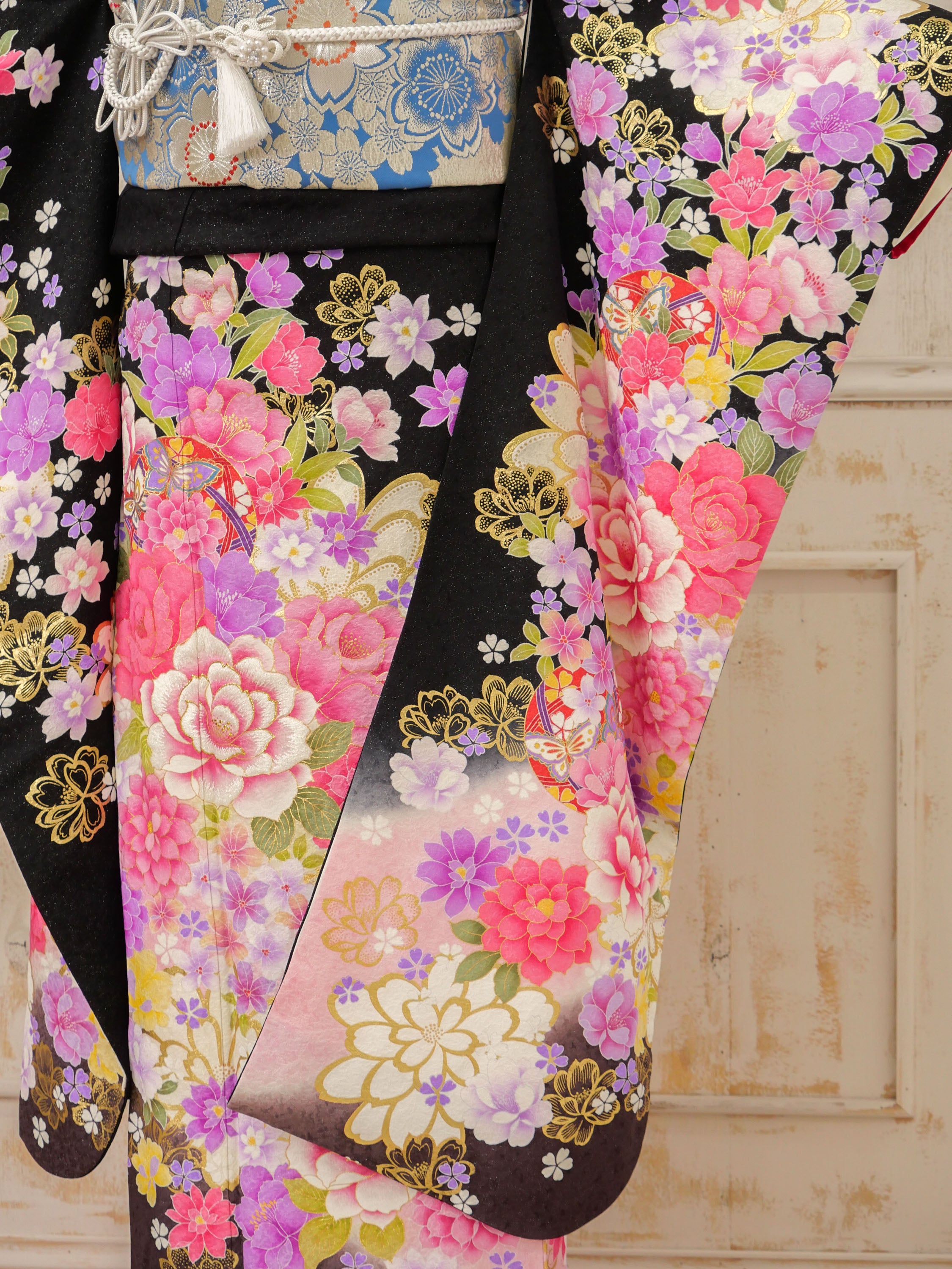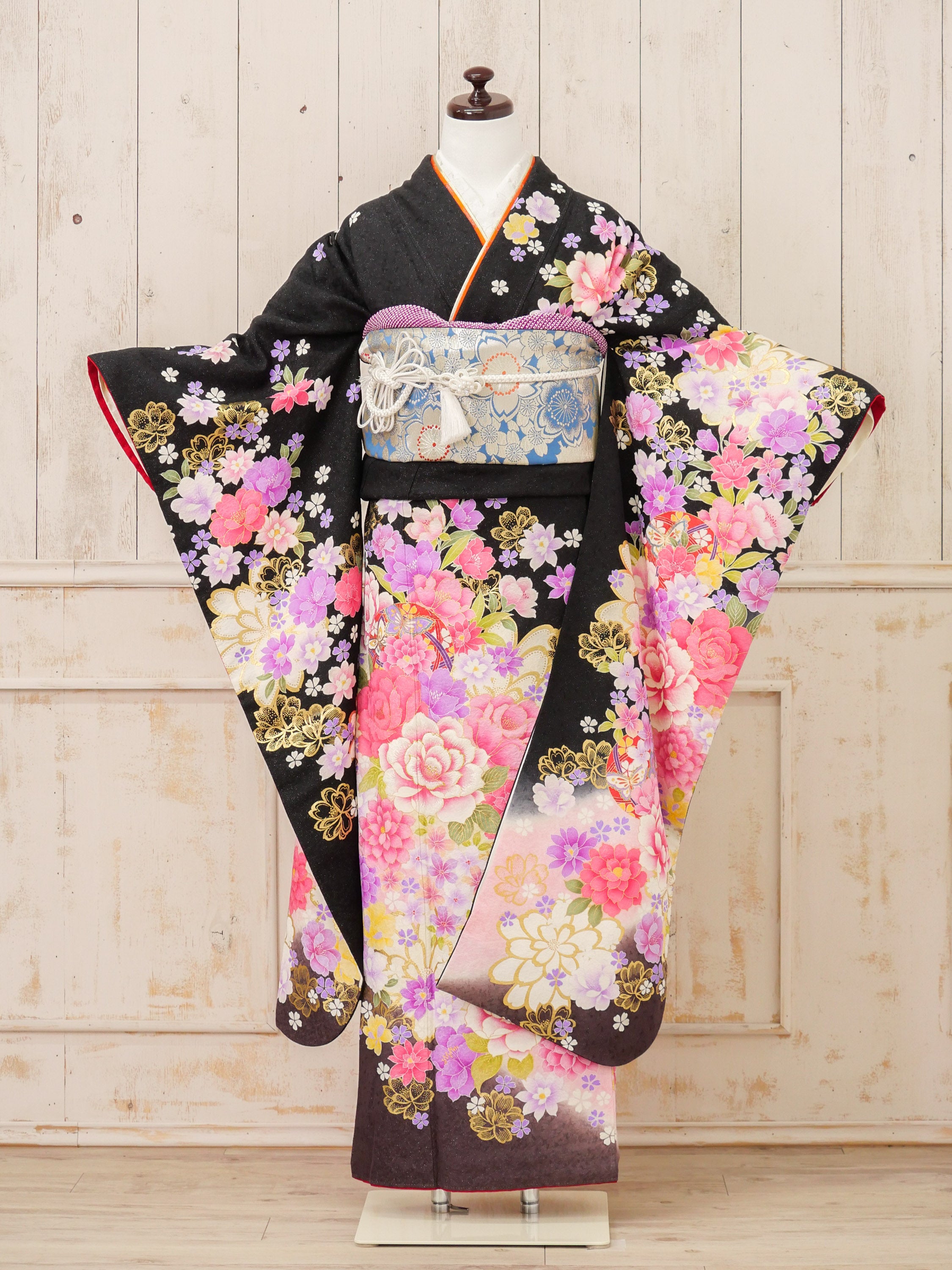 黒地に満開の牡丹や桜が金彩で煌めくゴージャス振袖。パステルカラーとメタリックの調和が上品かつ華やかで、写真映えも抜群の一着です。