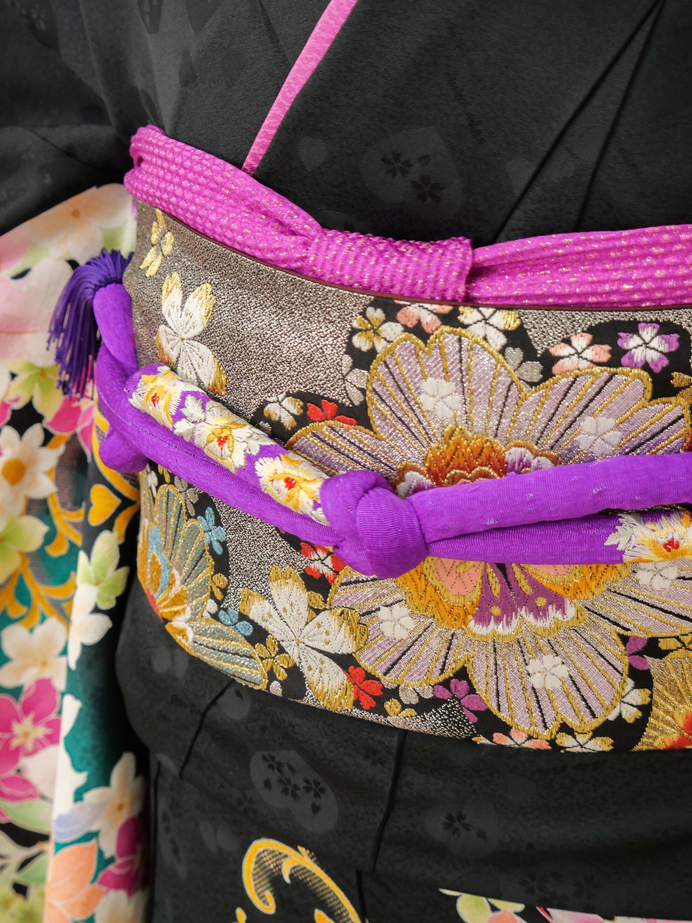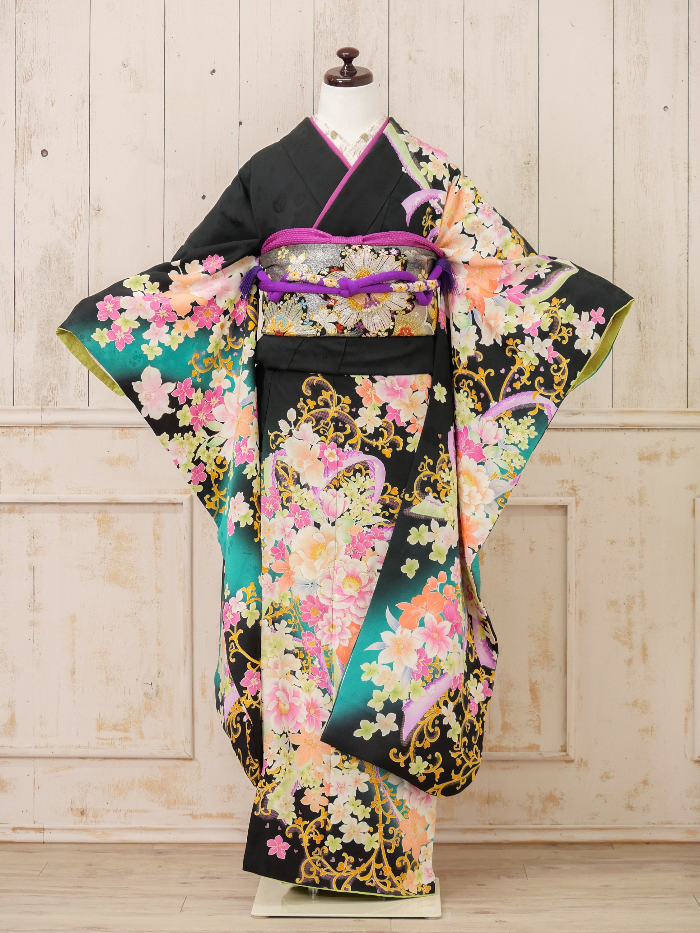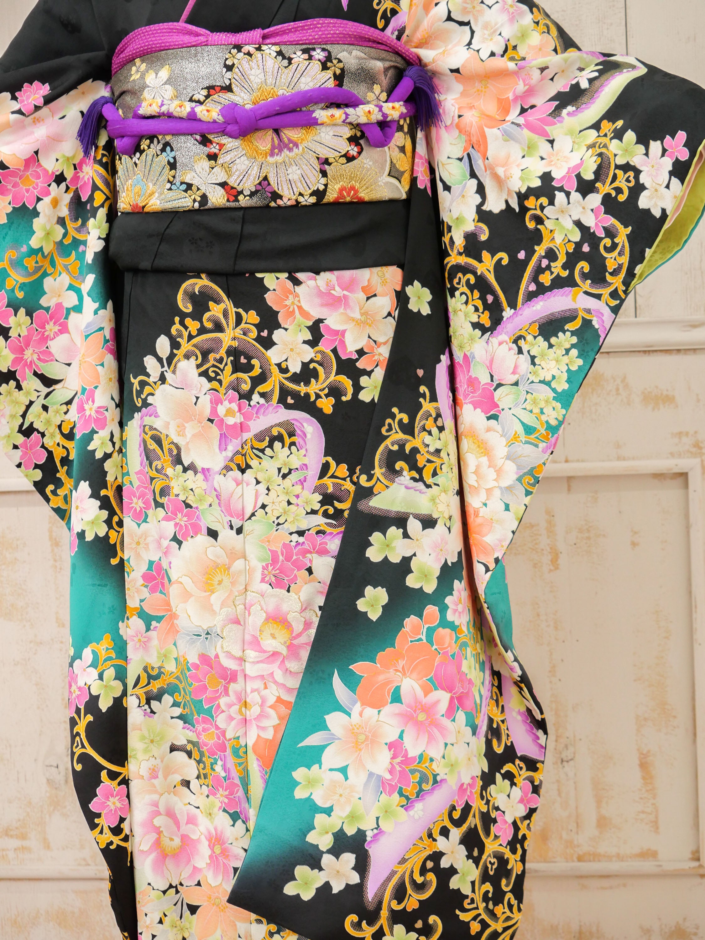 黒地に鮮やかな花々とゴールドの曲線模様が大胆に描かれた豪華な振袖。緑のアクセントが個性を引き立て、クールで華やかな存在感を放ちます。