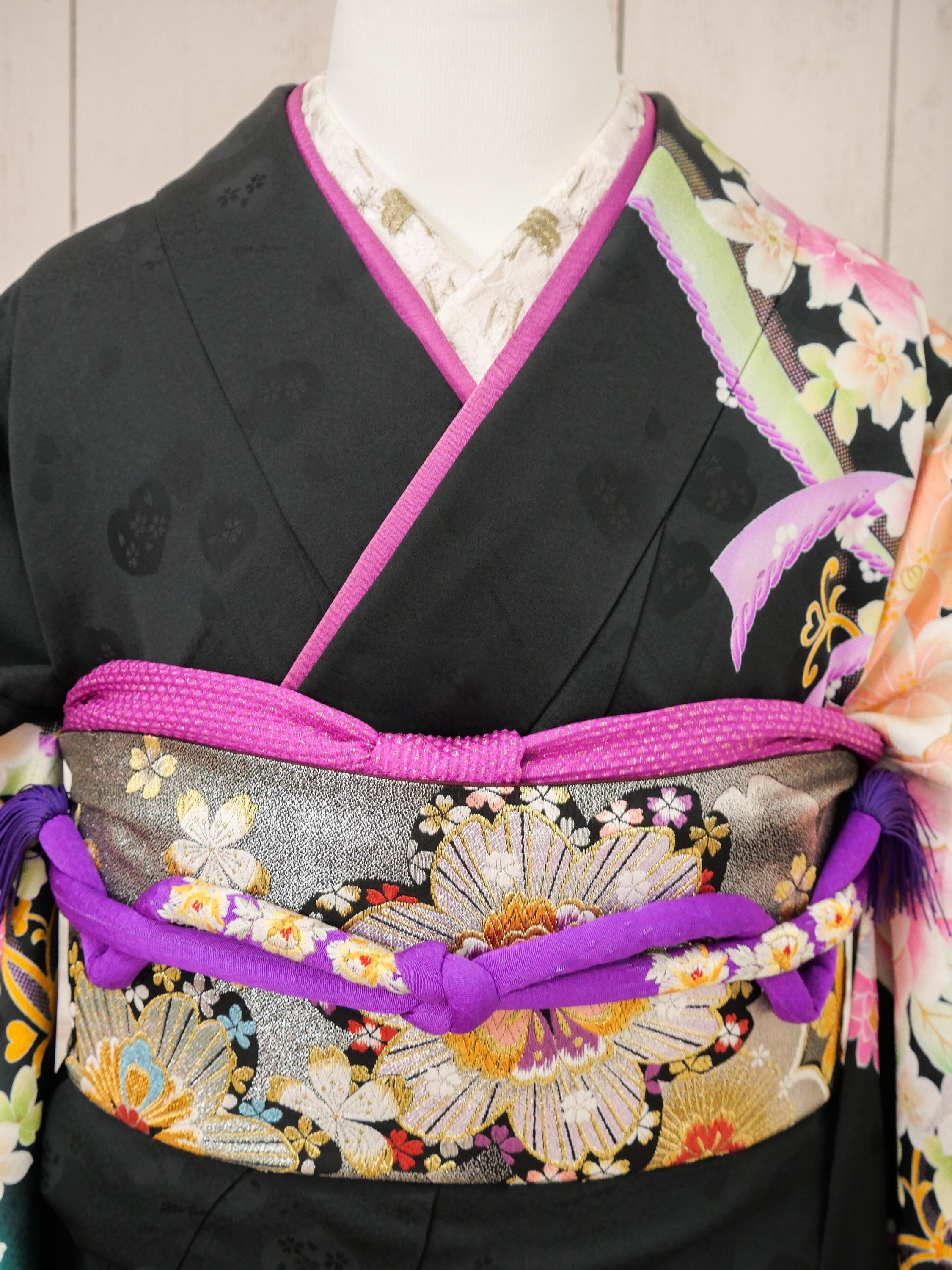 中振袖、袋帯、長襦袢(半襟付き、ポリエステル)、重ね衿(着物に縫い付けの商品あり)、帯揚げ、帯締め、ショール、腰紐5本、伊達締め2本、衿芯、前板、後板、帯枕(ガーゼ付き)、コーリンベルト1本、三重紐、草履、バッグ