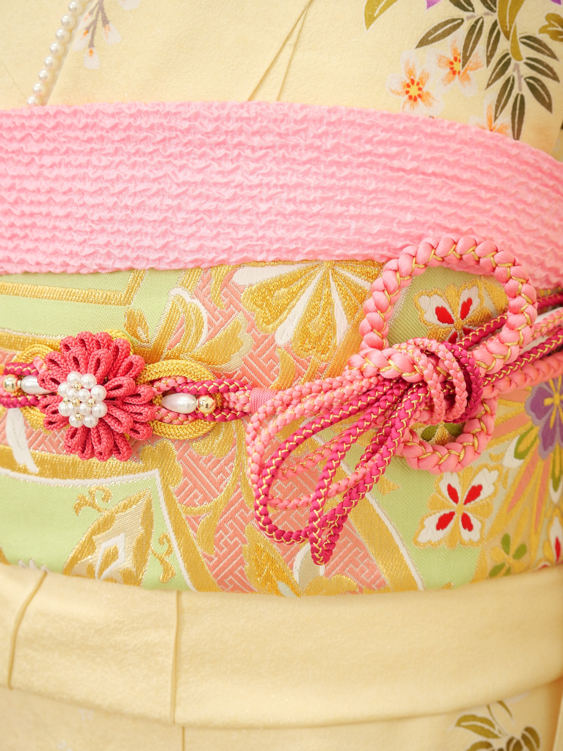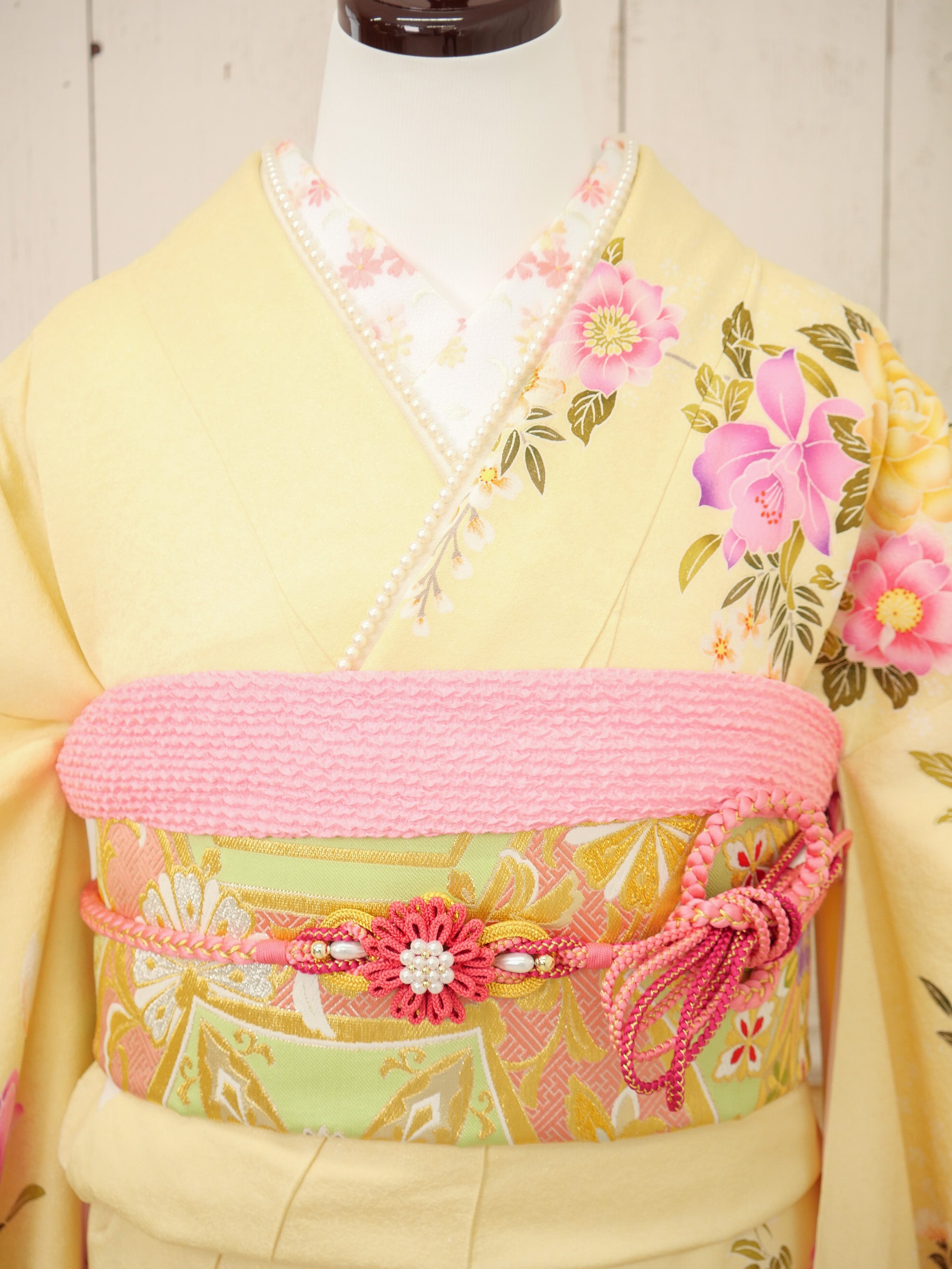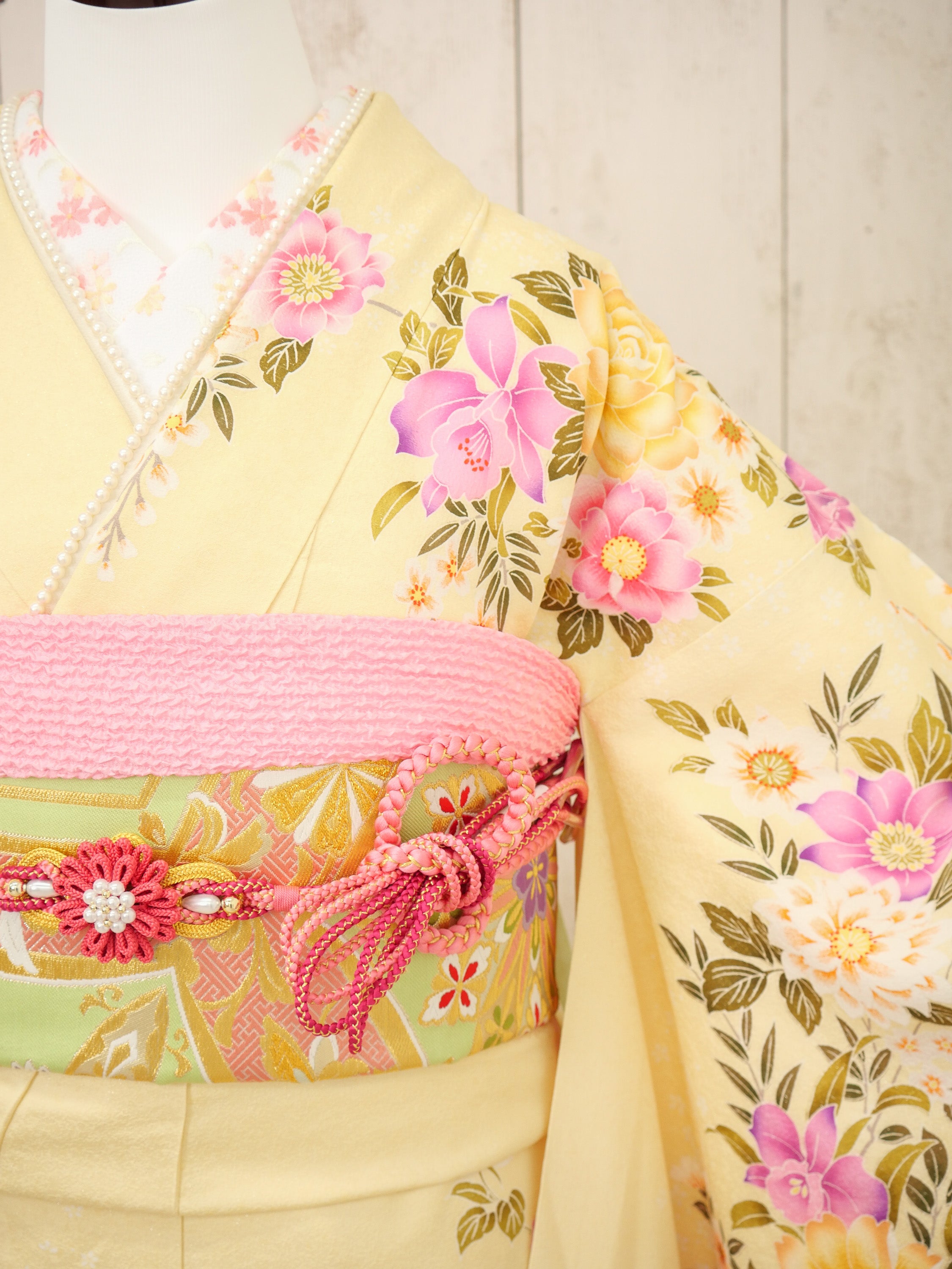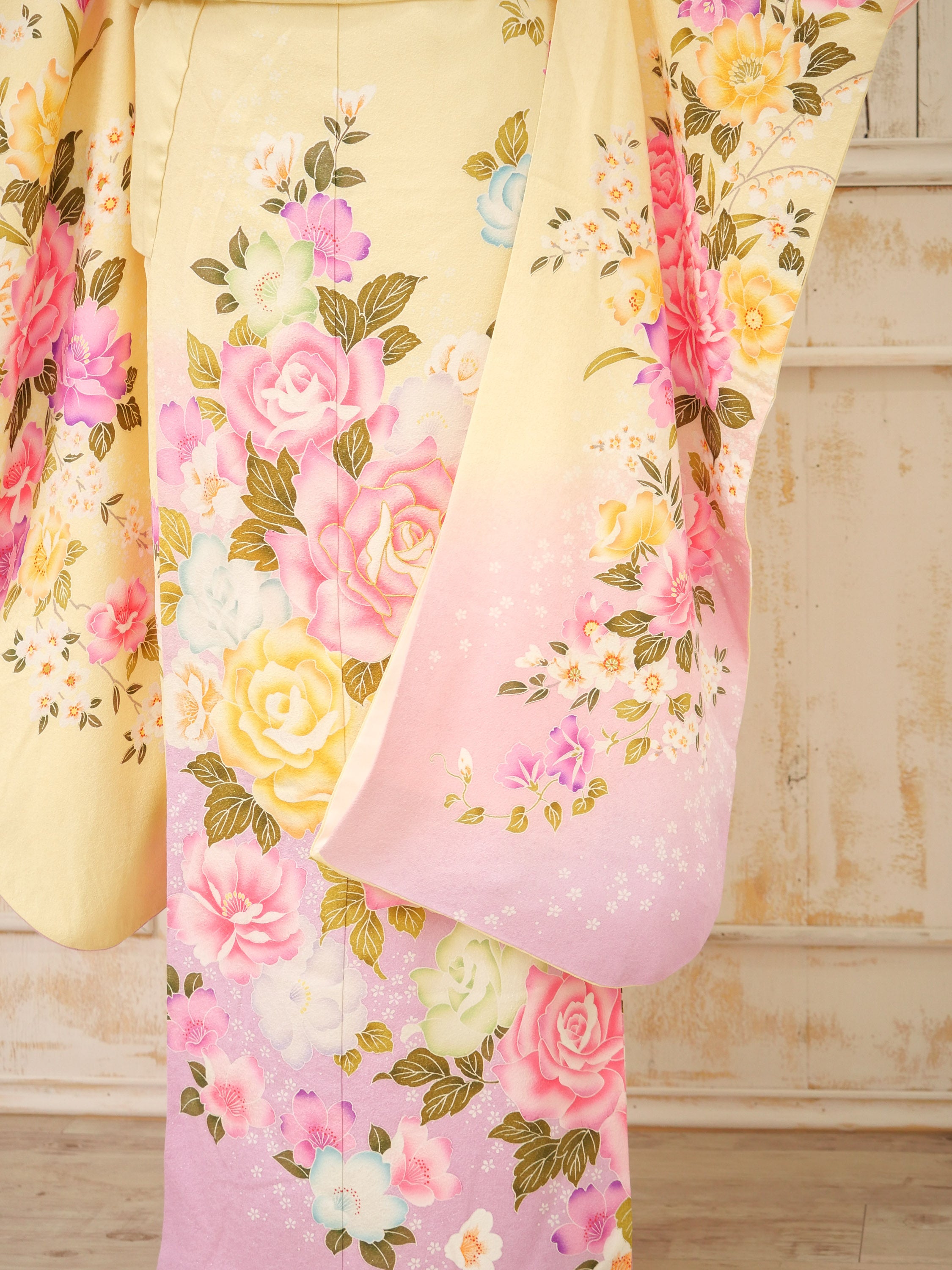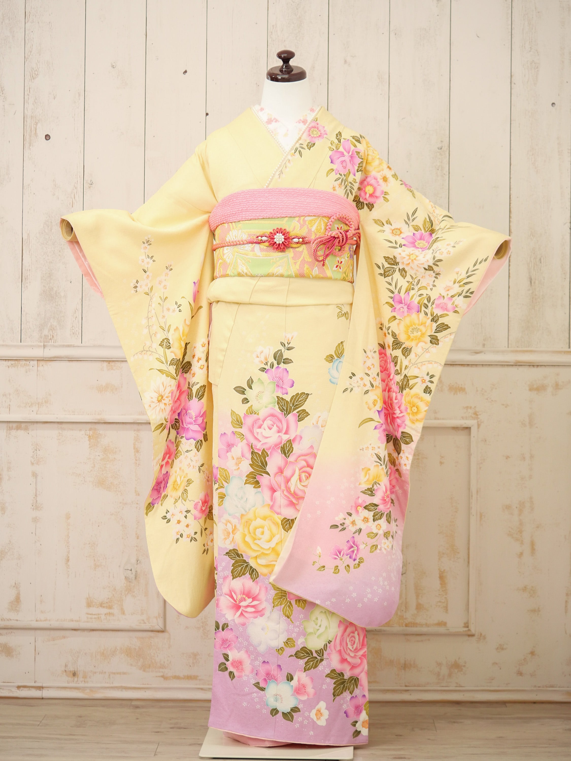 やわらかな黄色地に、パステル調のピンクや紫のバラが優雅に咲く、ロマンティックな振袖。可憐で上品な雰囲気は、フェミニンスタイルを好む方におすすめ。