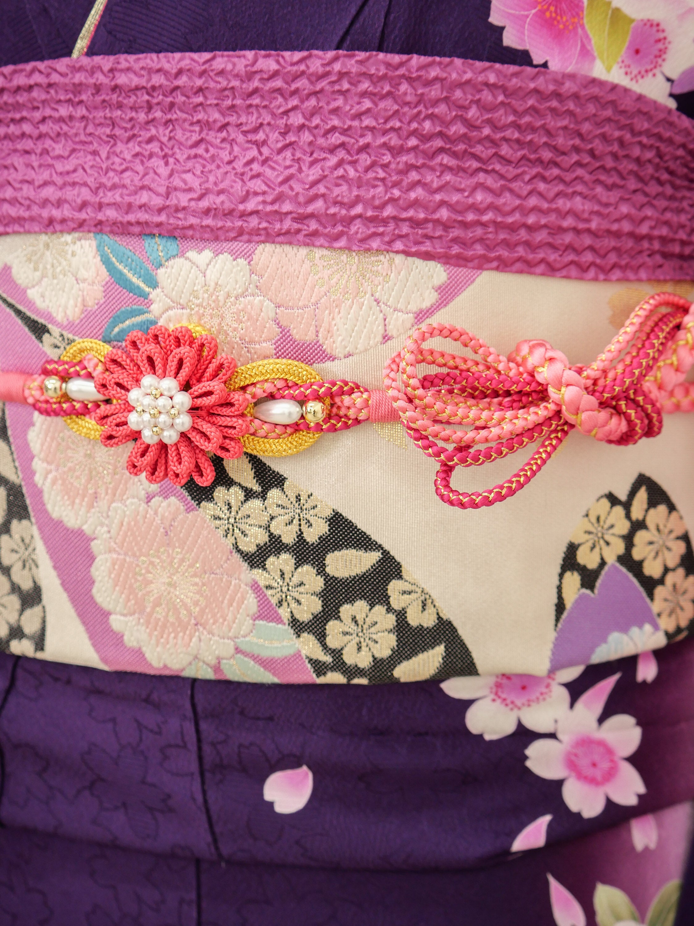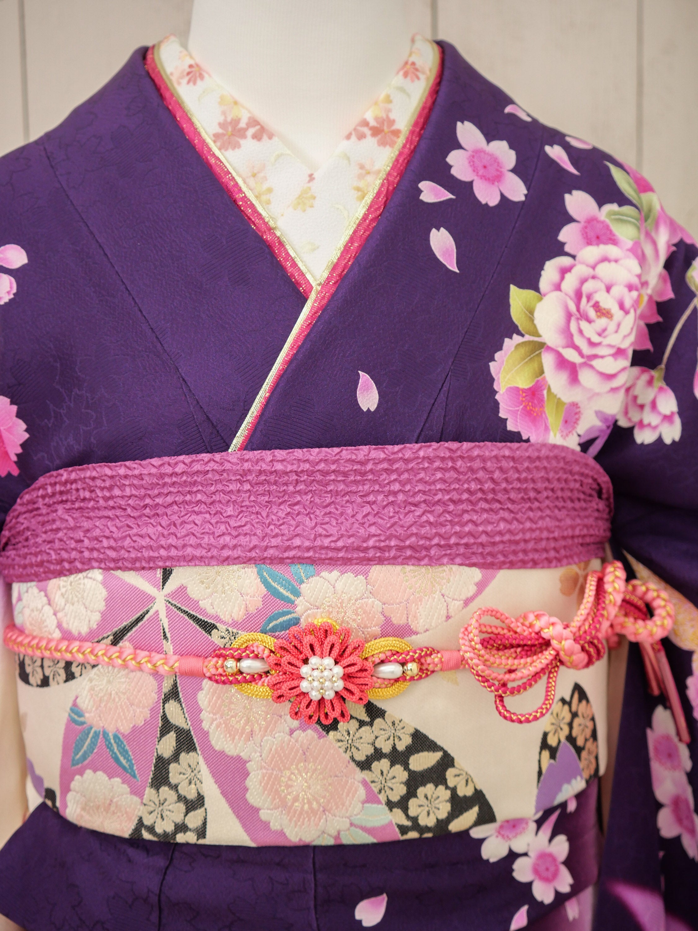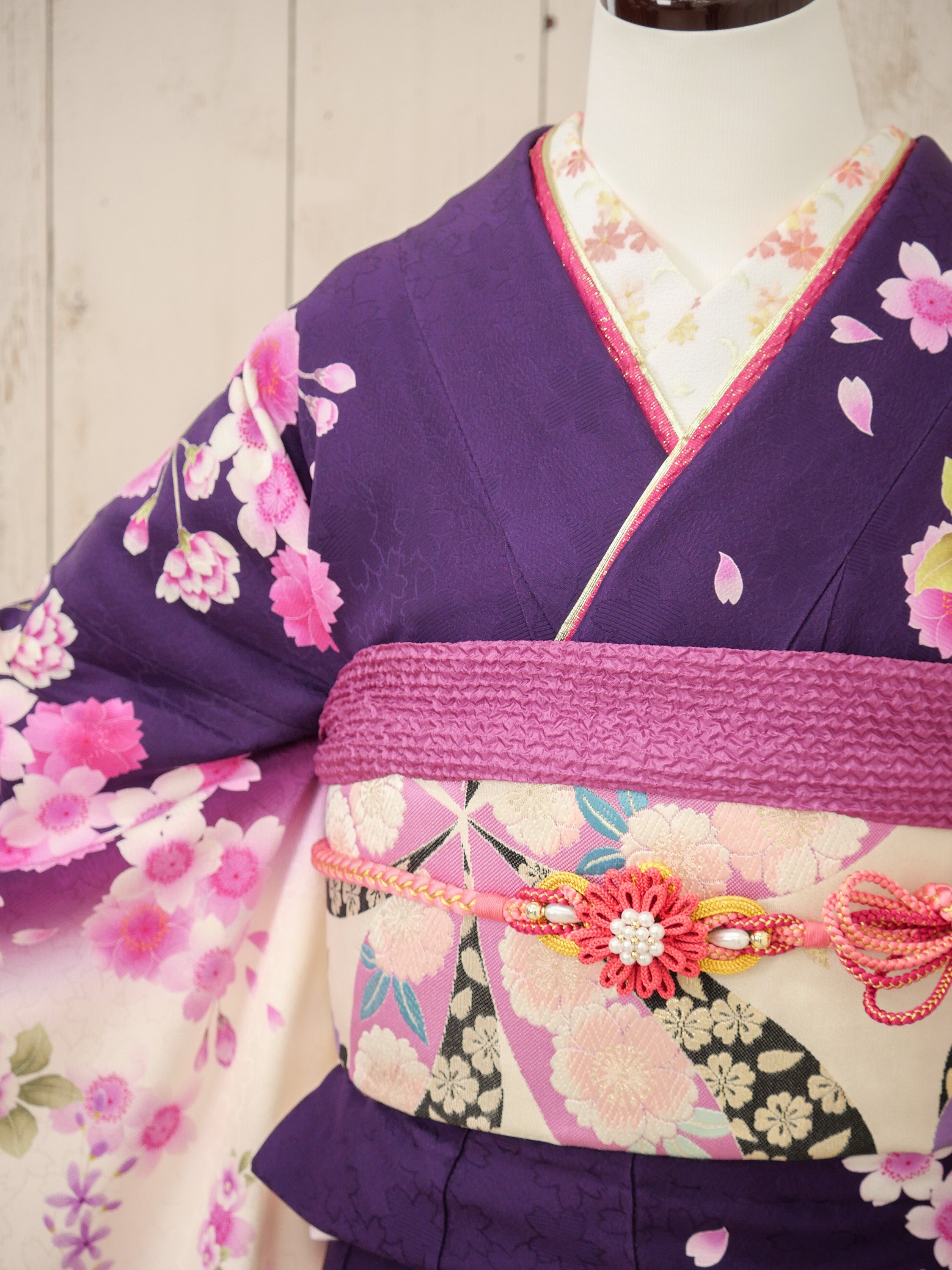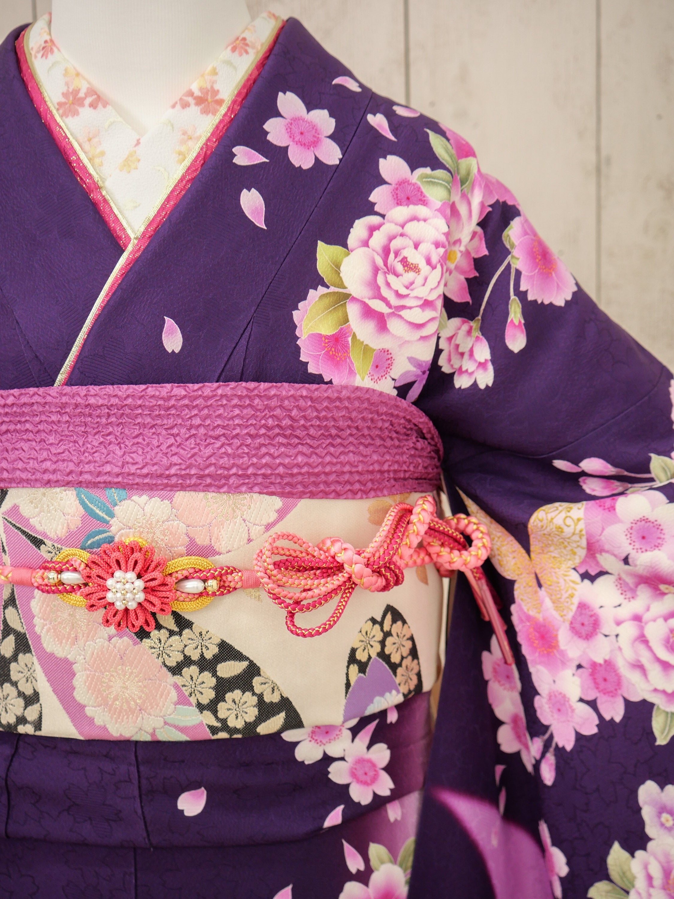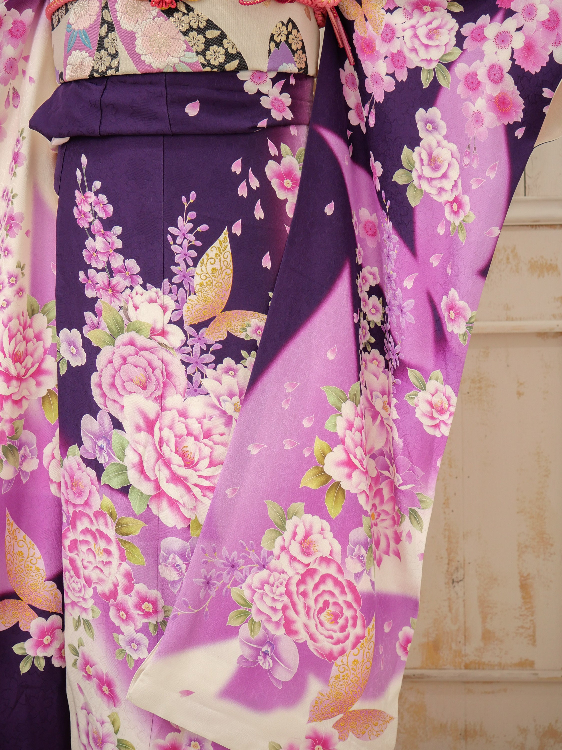華やかな紫地にピンクの牡丹や桜が咲き誇り、舞う蝶が優雅なアクセントを添える振袖。可憐さと上品さを兼ね備え、フェミニンな魅力を引き出します。