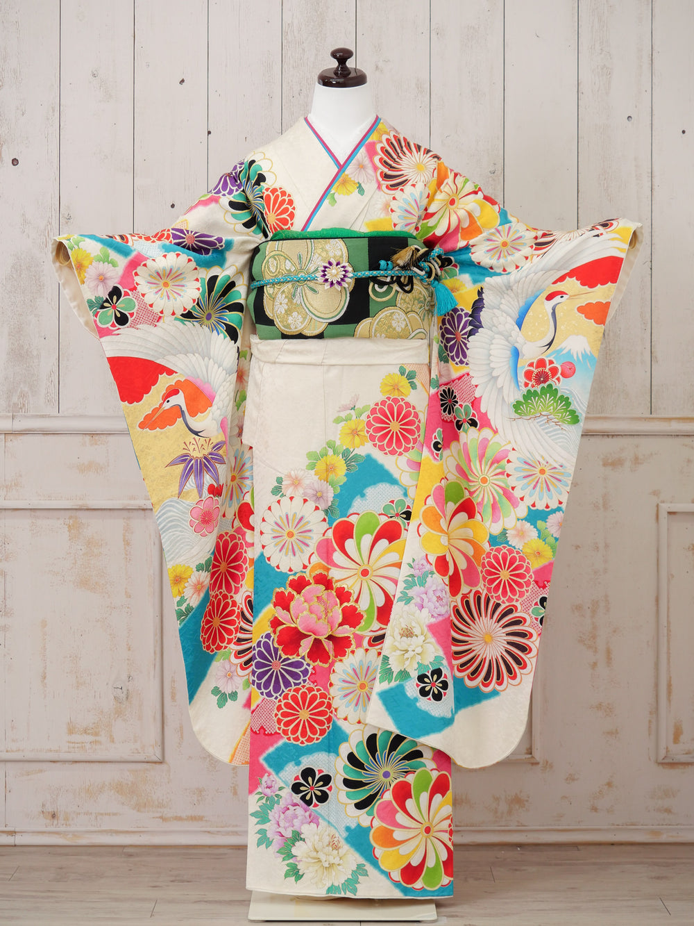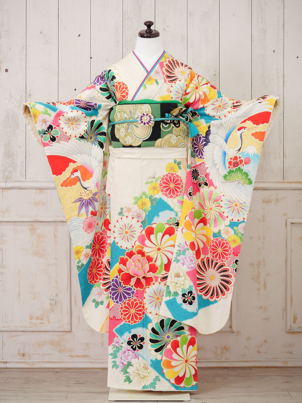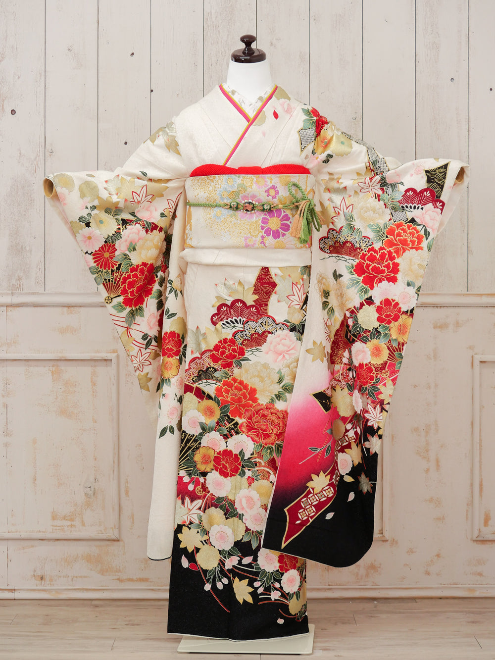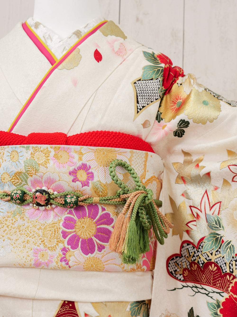 中振袖、袋帯、長襦袢(半襟付き、ポリエステル)、重ね衿(着物に縫い付けの商品あり)、帯揚げ、帯締め、ショール、腰紐5本、伊達締め2本、衿芯、前板、後板、帯枕(ガーゼ付き)、コーリンベルト1本、三重紐、草履、バッグ