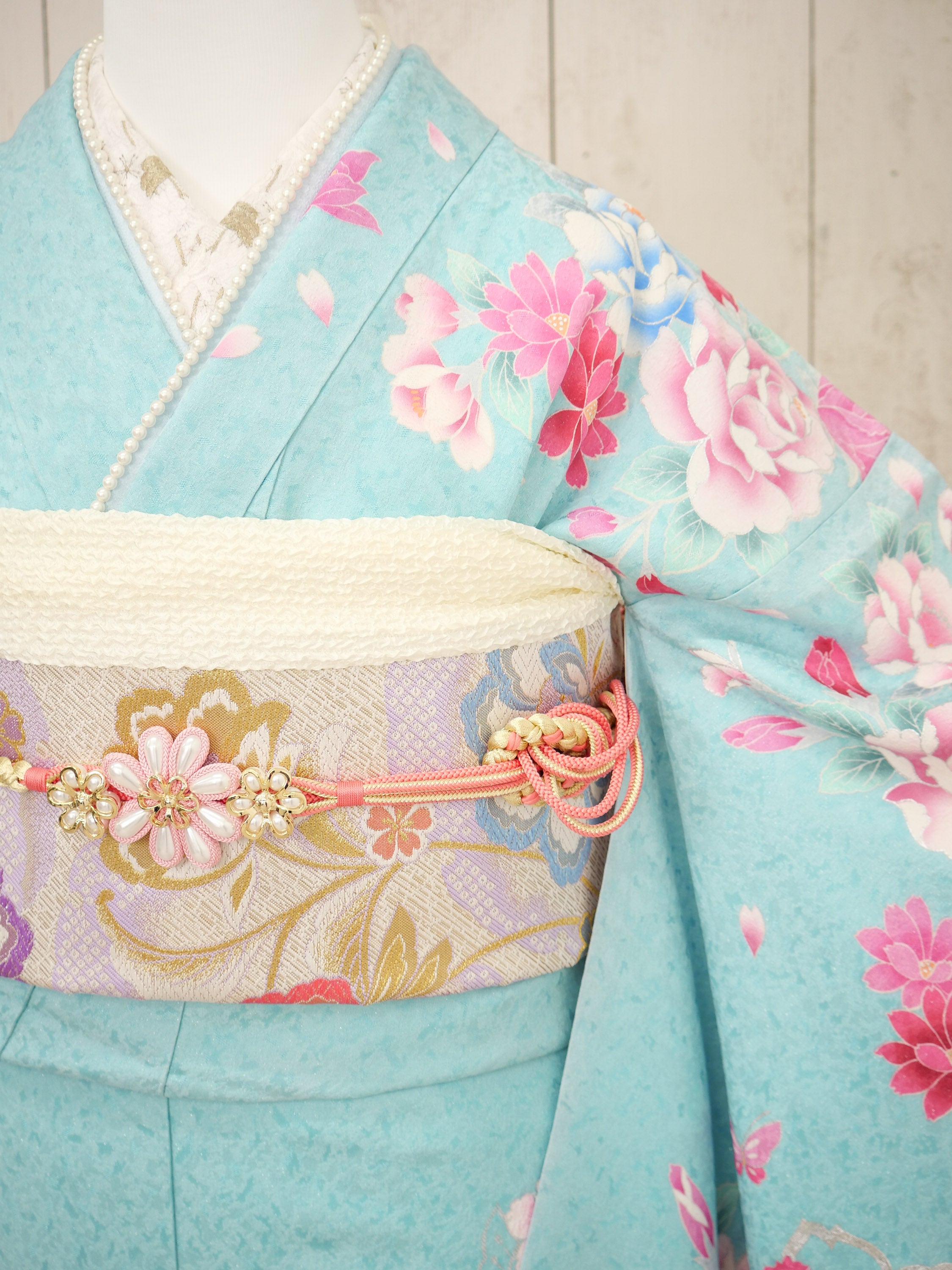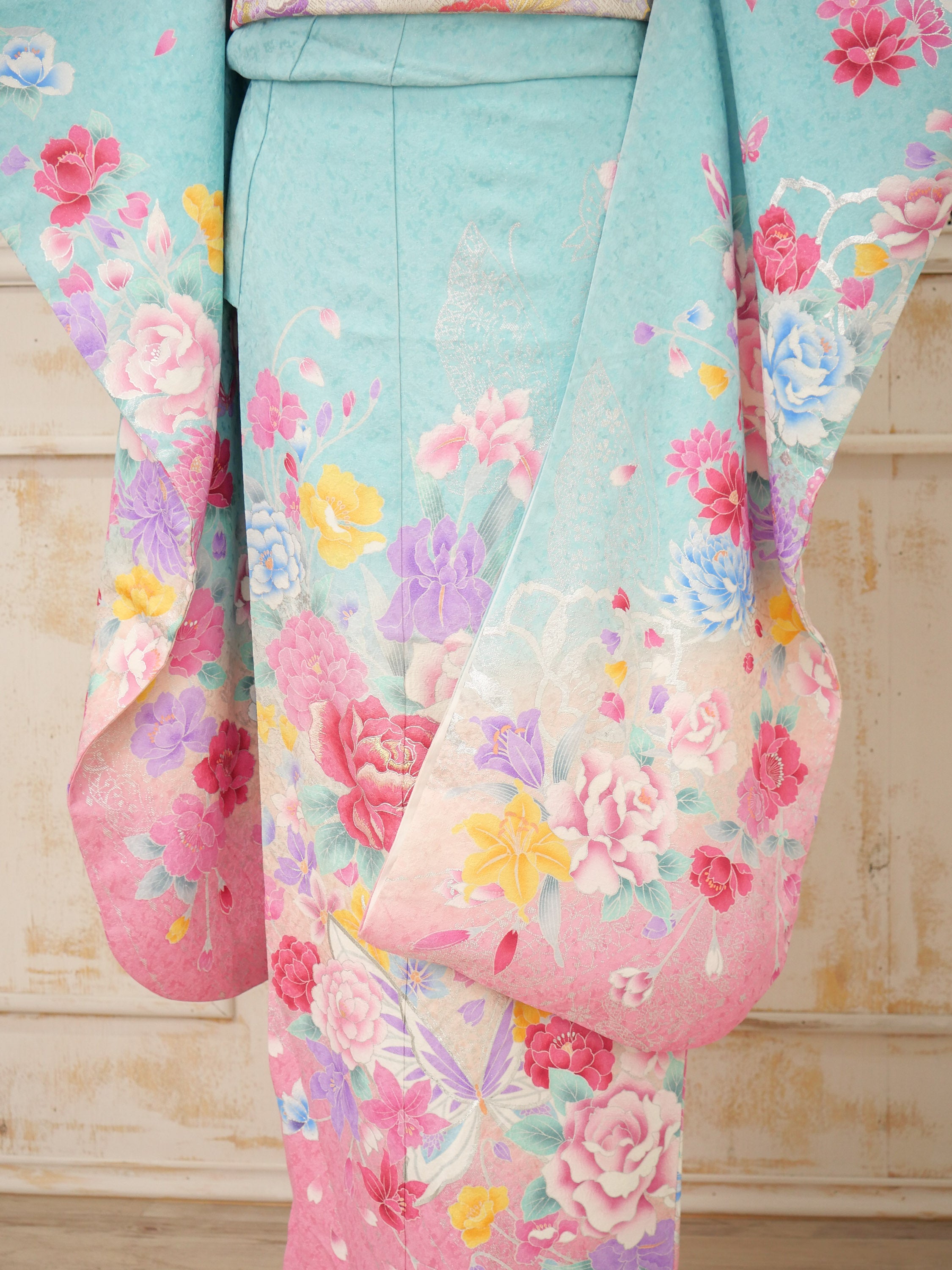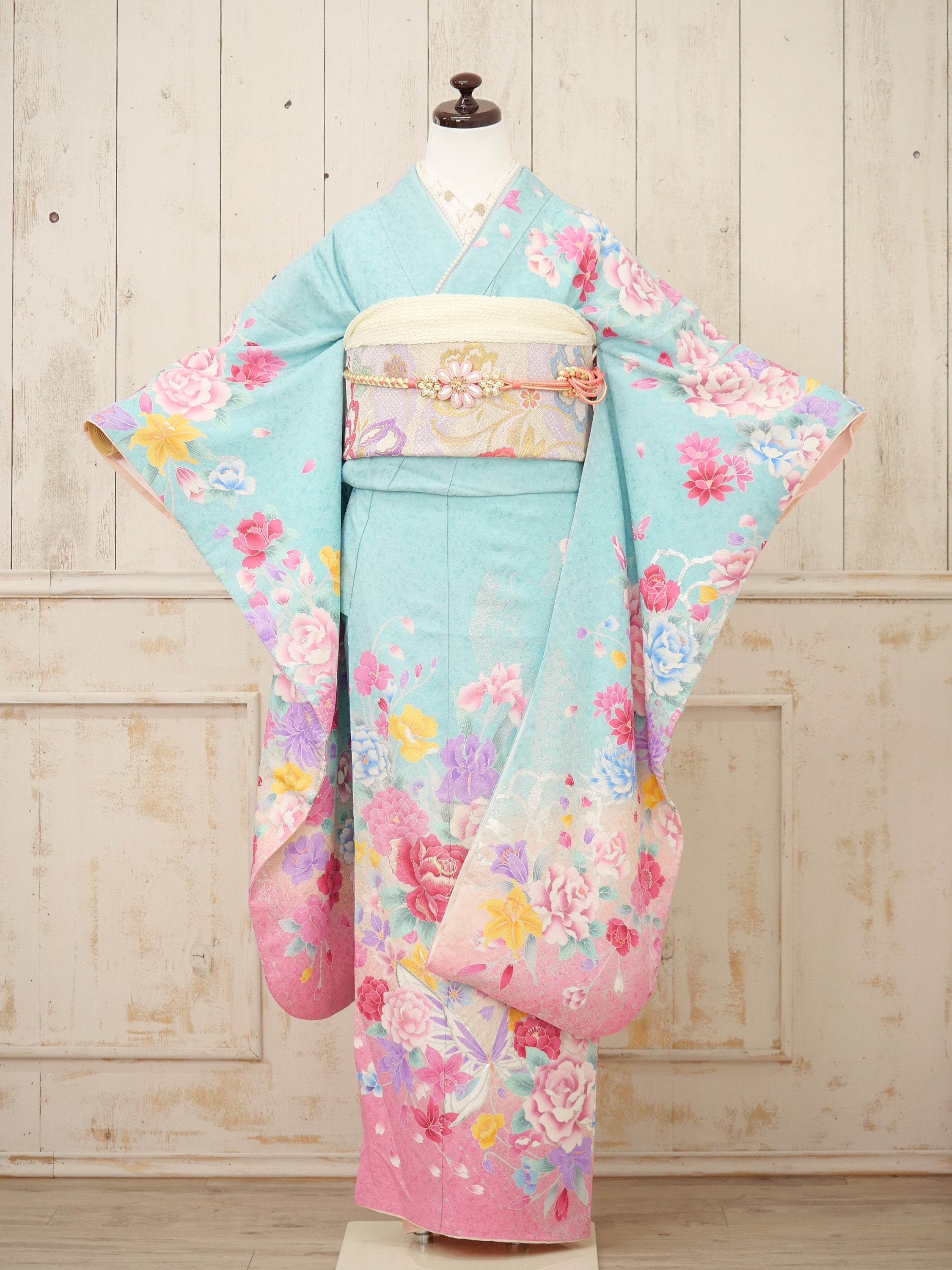 爽やかな水色とやわらかなピンクのグラデーションが美しい、水彩画のような優美な一着。咲き誇る花々がロマンティックな印象を与えます。