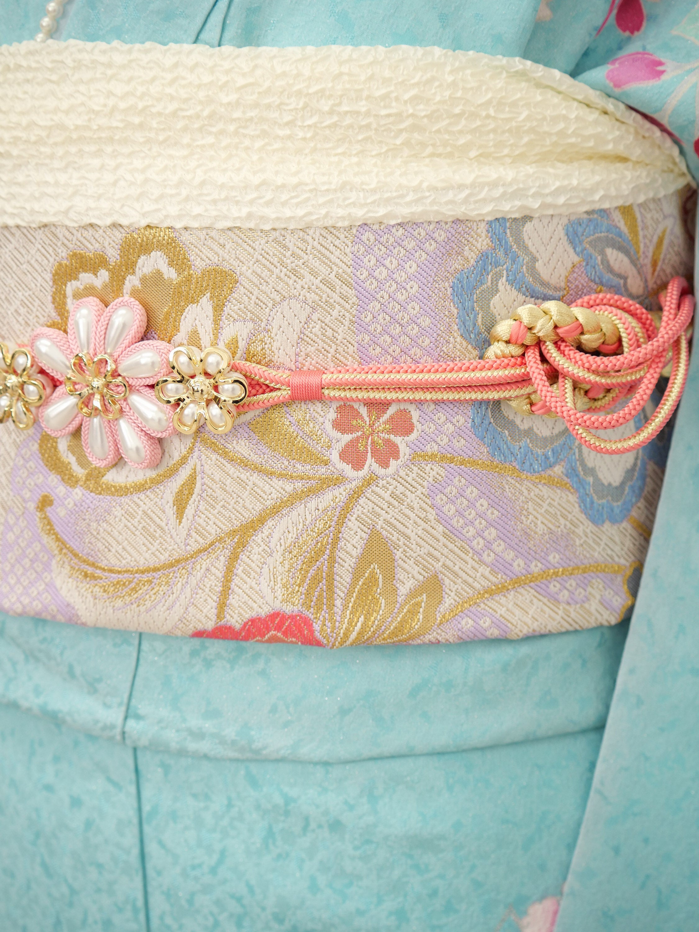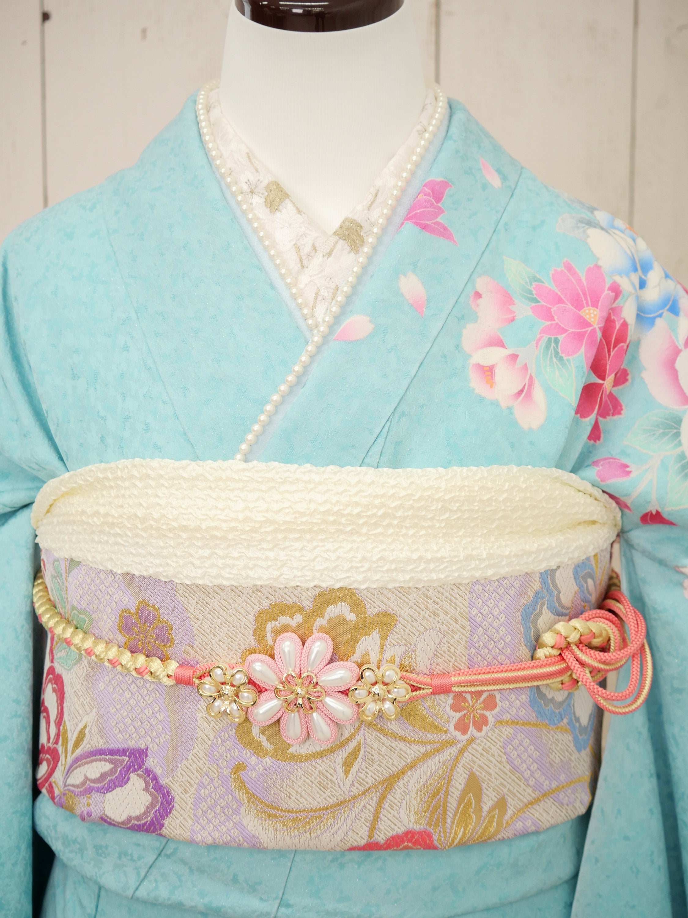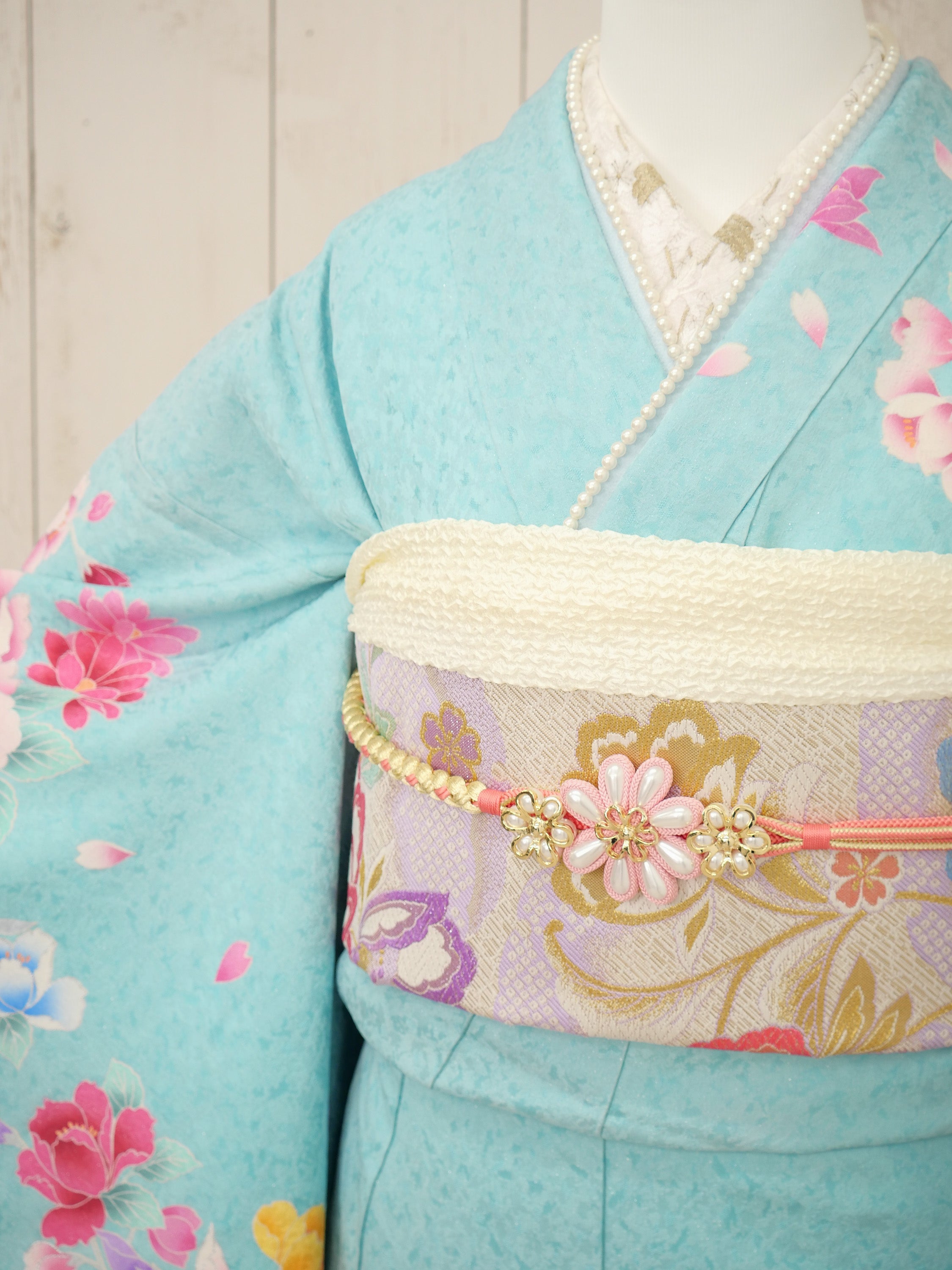 爽やかな水色とやわらかなピンクのグラデーションが美しい、水彩画のような優美な一着。咲き誇る花々がロマンティックな印象を与えます。