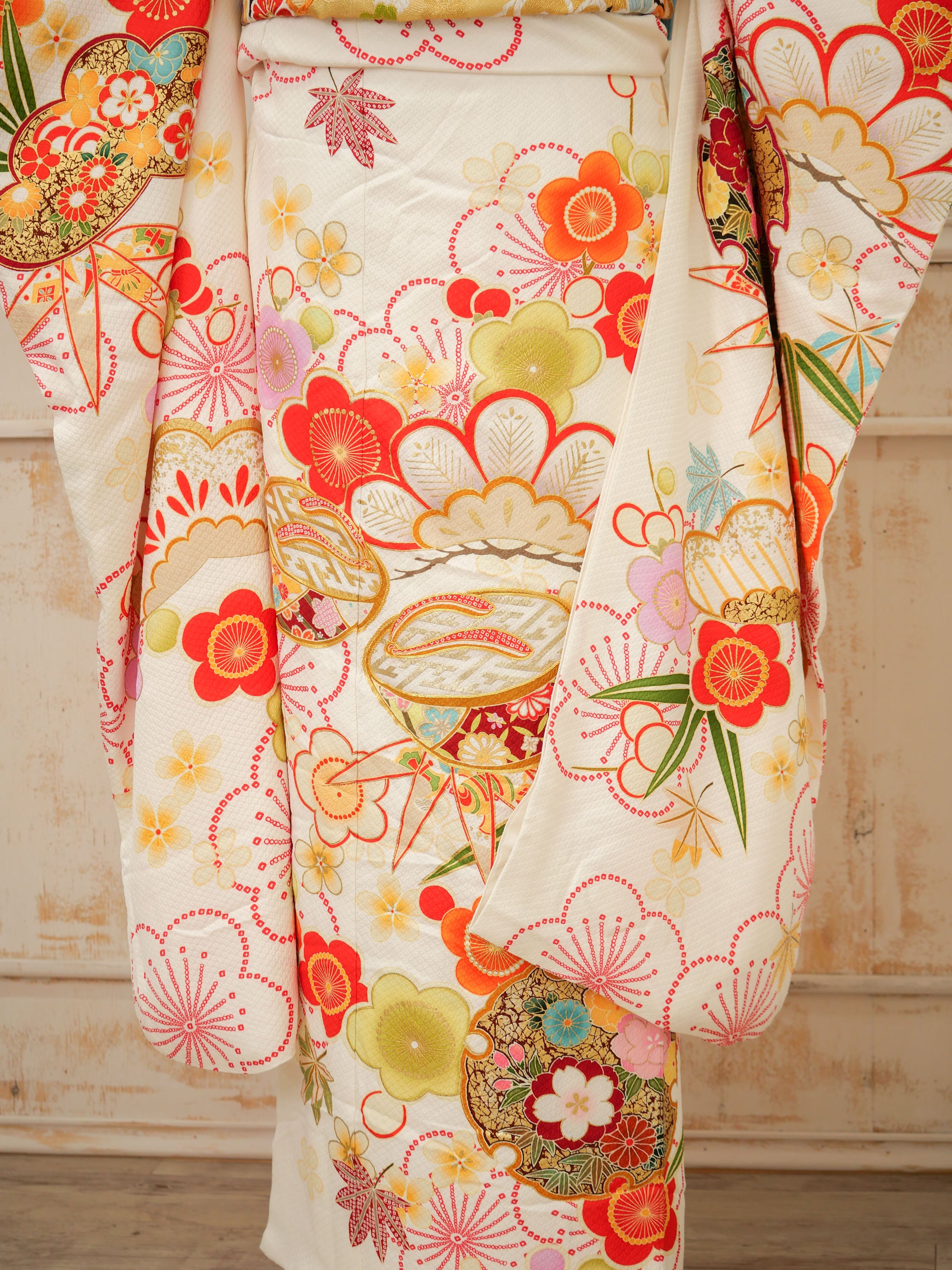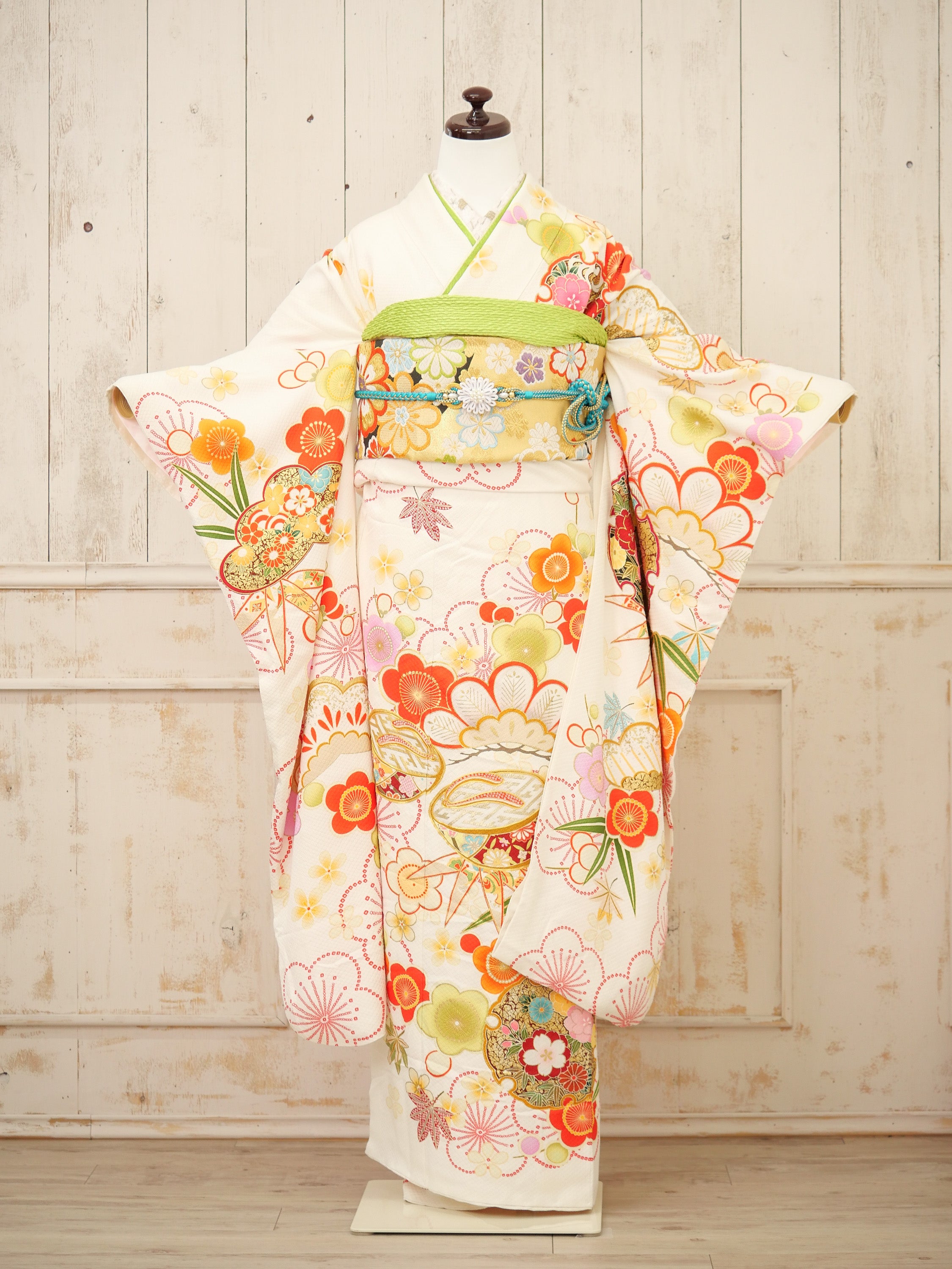 中振袖、袋帯、長襦袢(半襟付き、ポリエステル)、重ね衿(着物に縫い付けの商品あり)、帯揚げ、帯締め、ショール、腰紐5本、伊達締め2本、衿芯、前板、後板、帯枕(ガーゼ付き)、コーリンベルト1本、三重紐、草履、バッグ