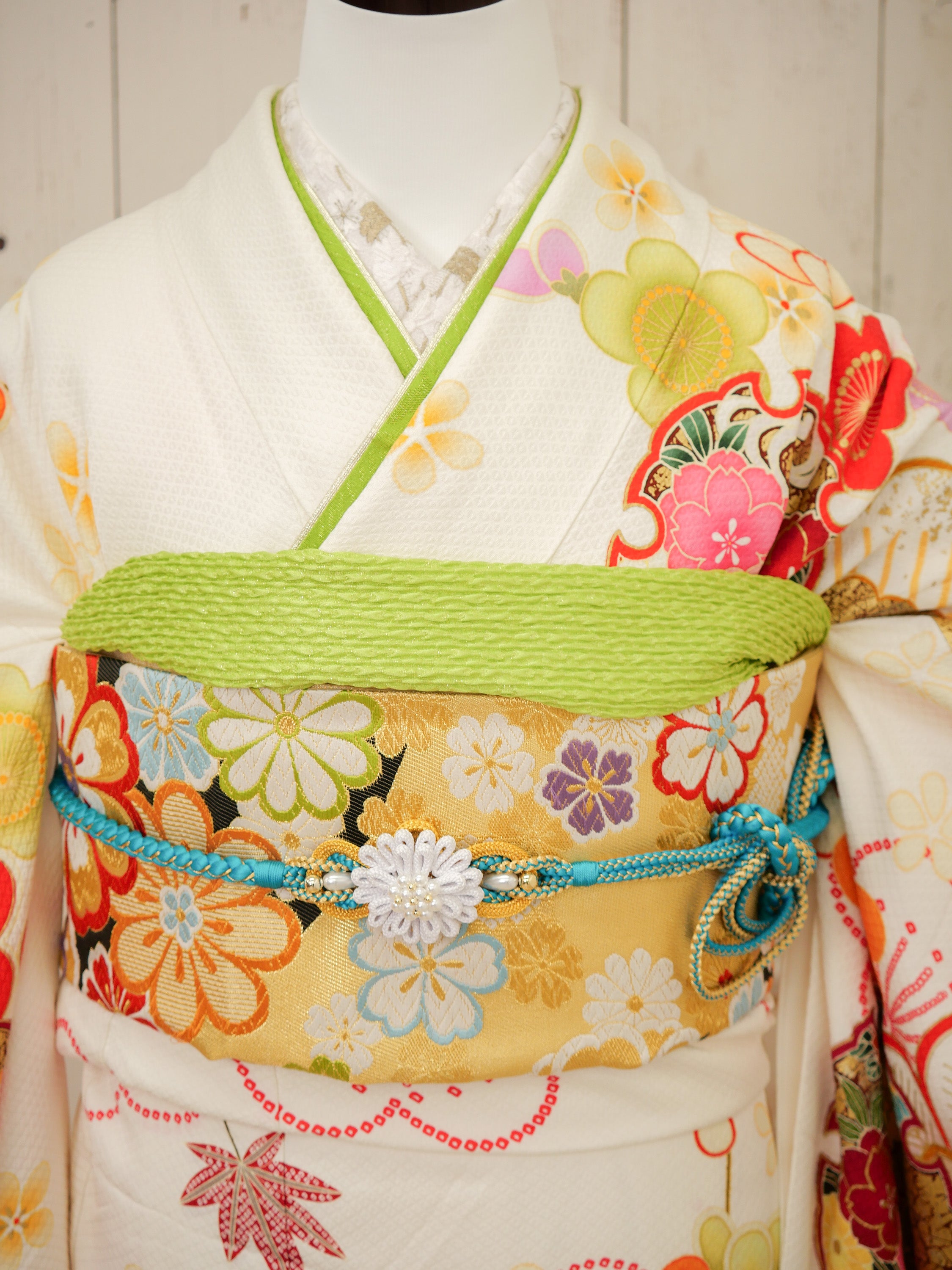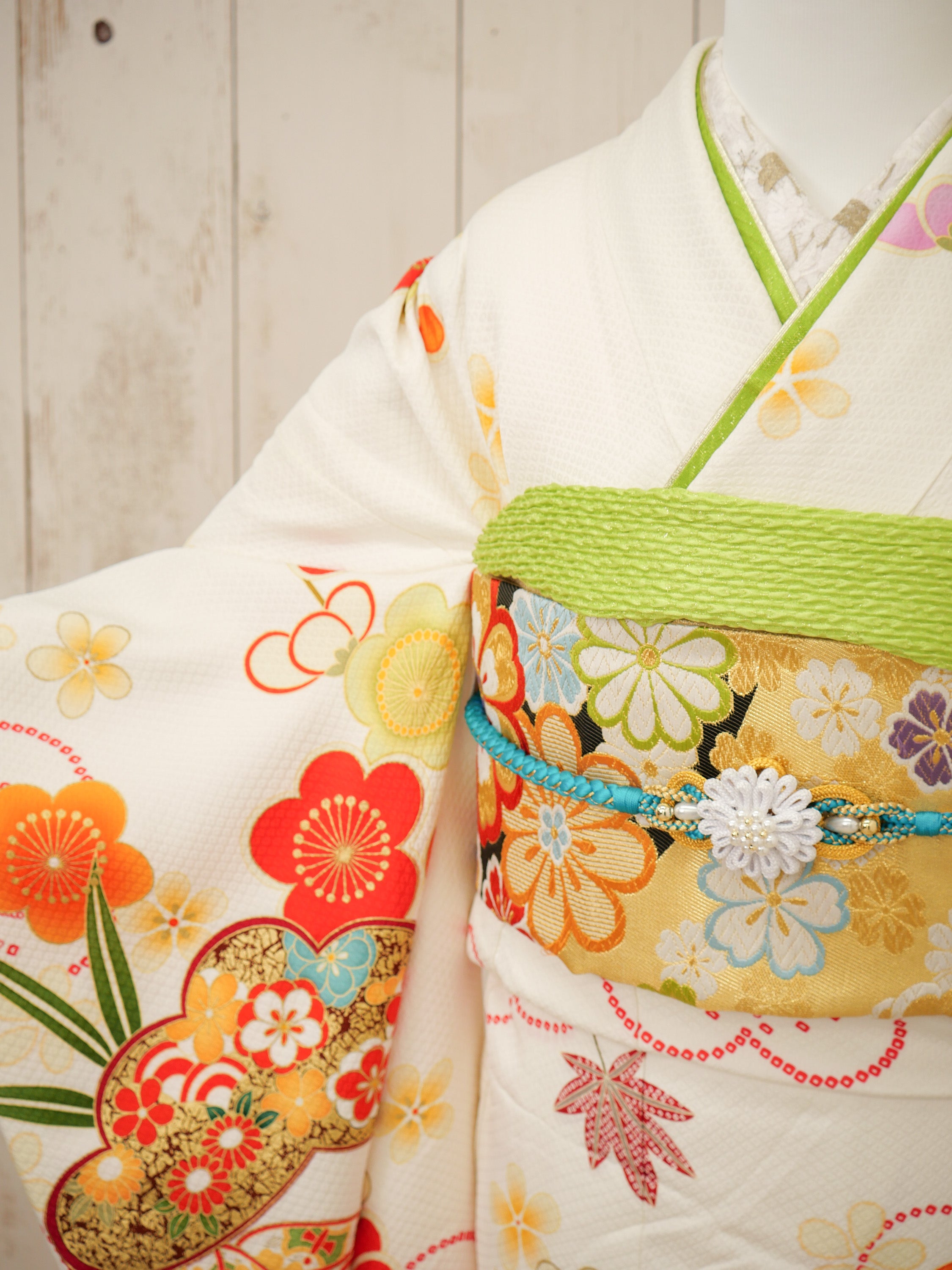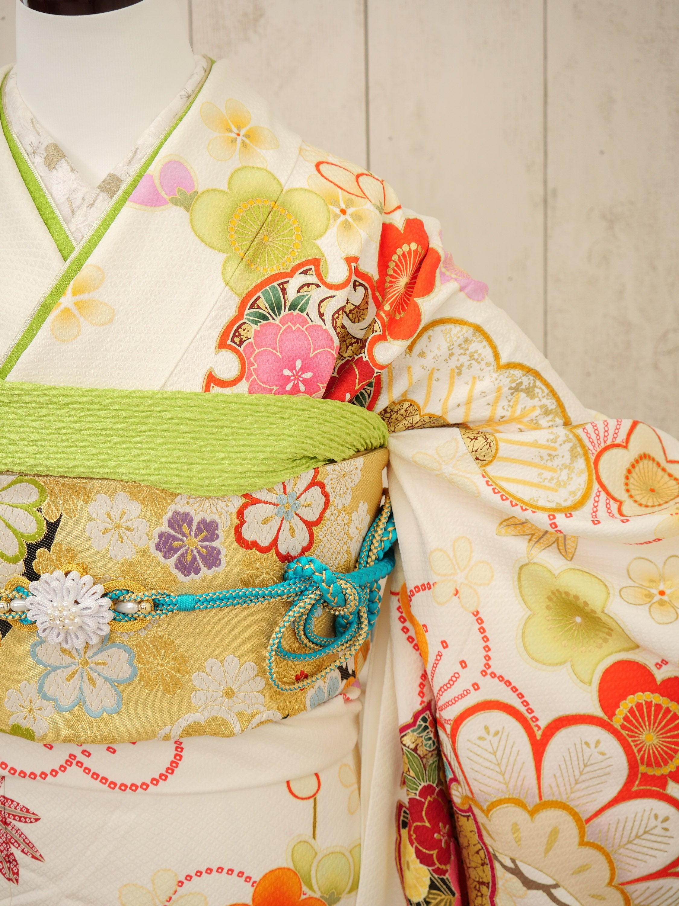 白地に伝統的な扇面と花々が上品に舞う、晴れやかな祝福を感じさせる振袖。淡いグリーンの帯がアクセントとなり、柔らかく優しい雰囲気に。古典好きにぴったり。