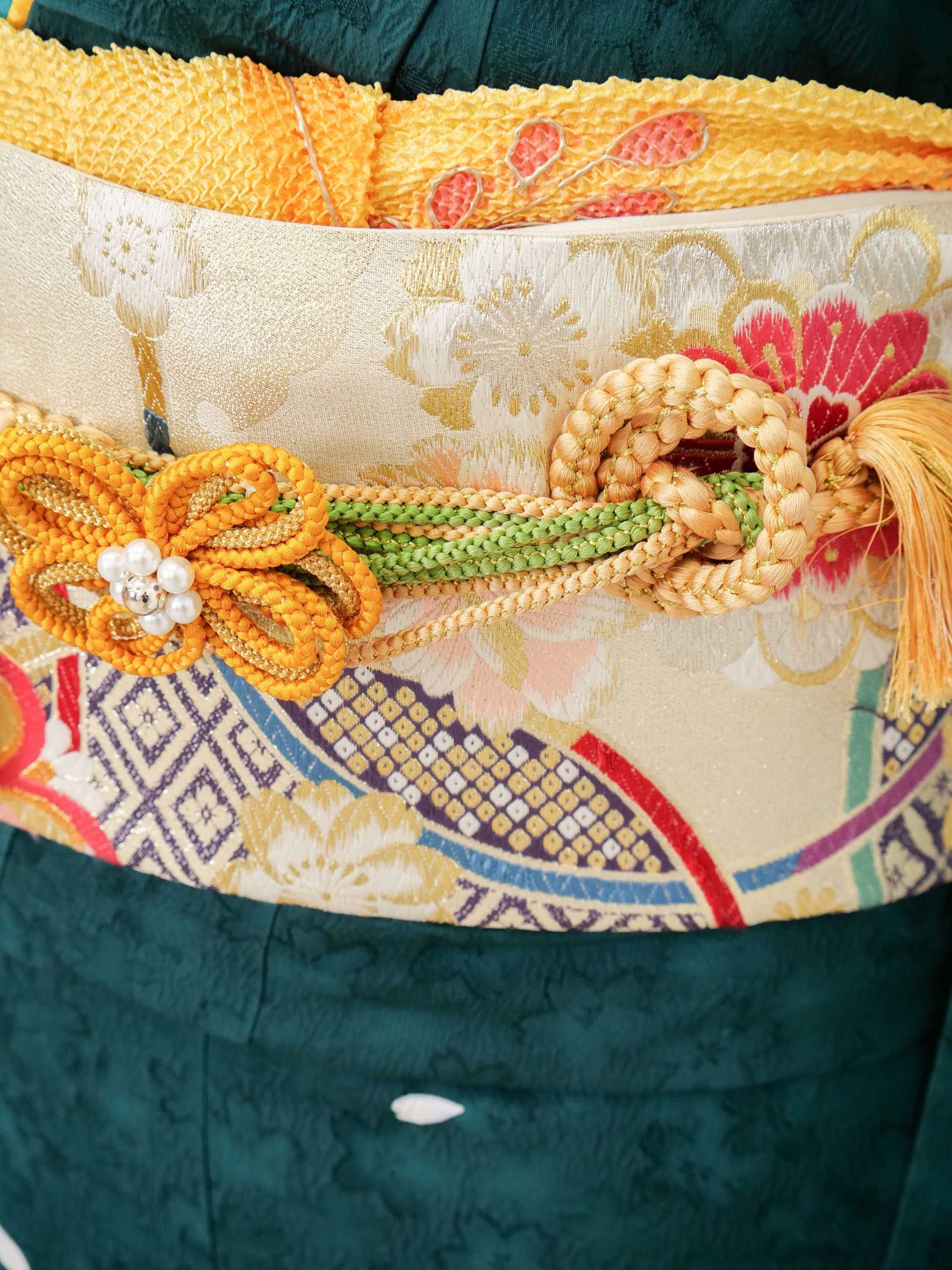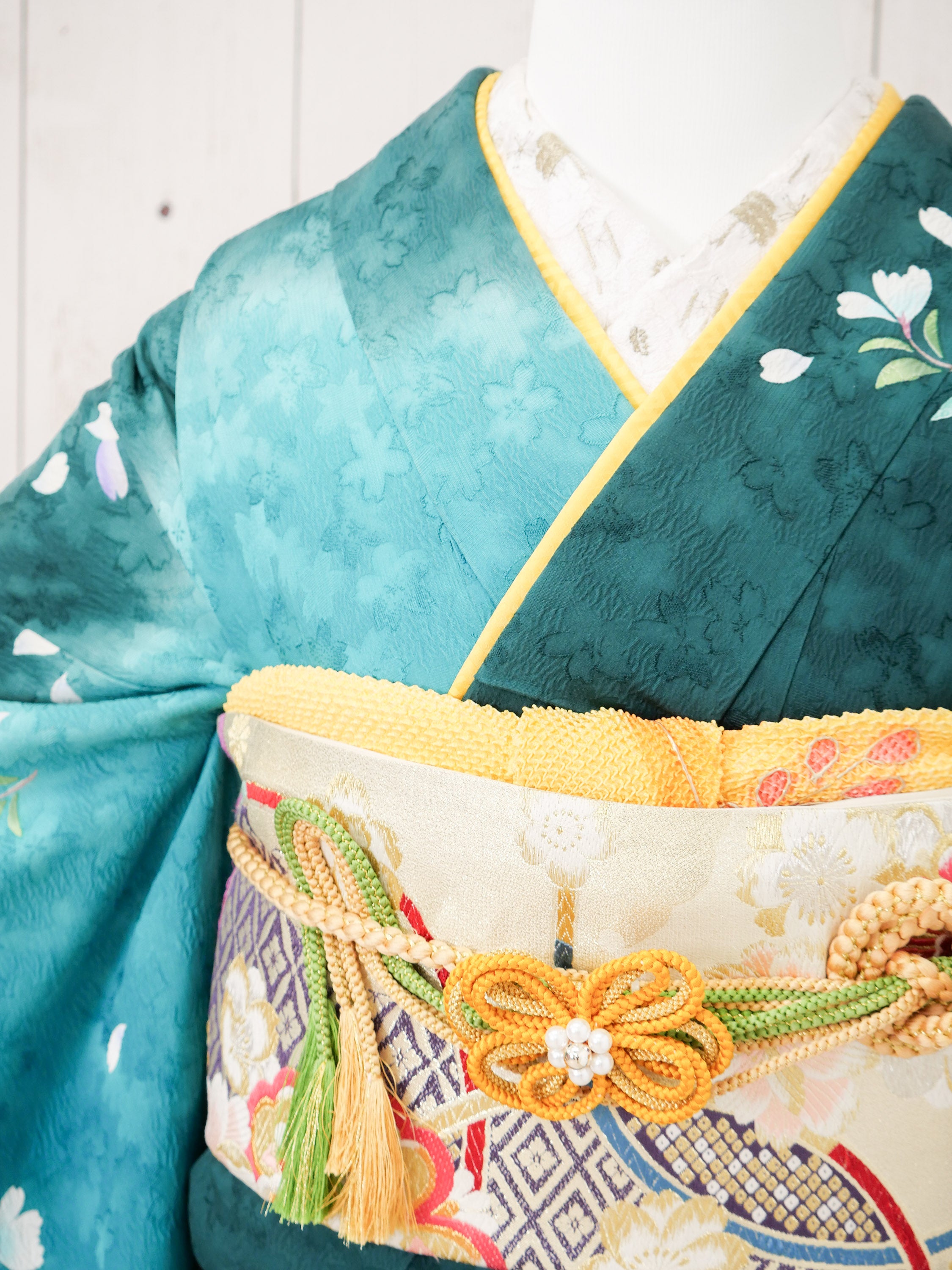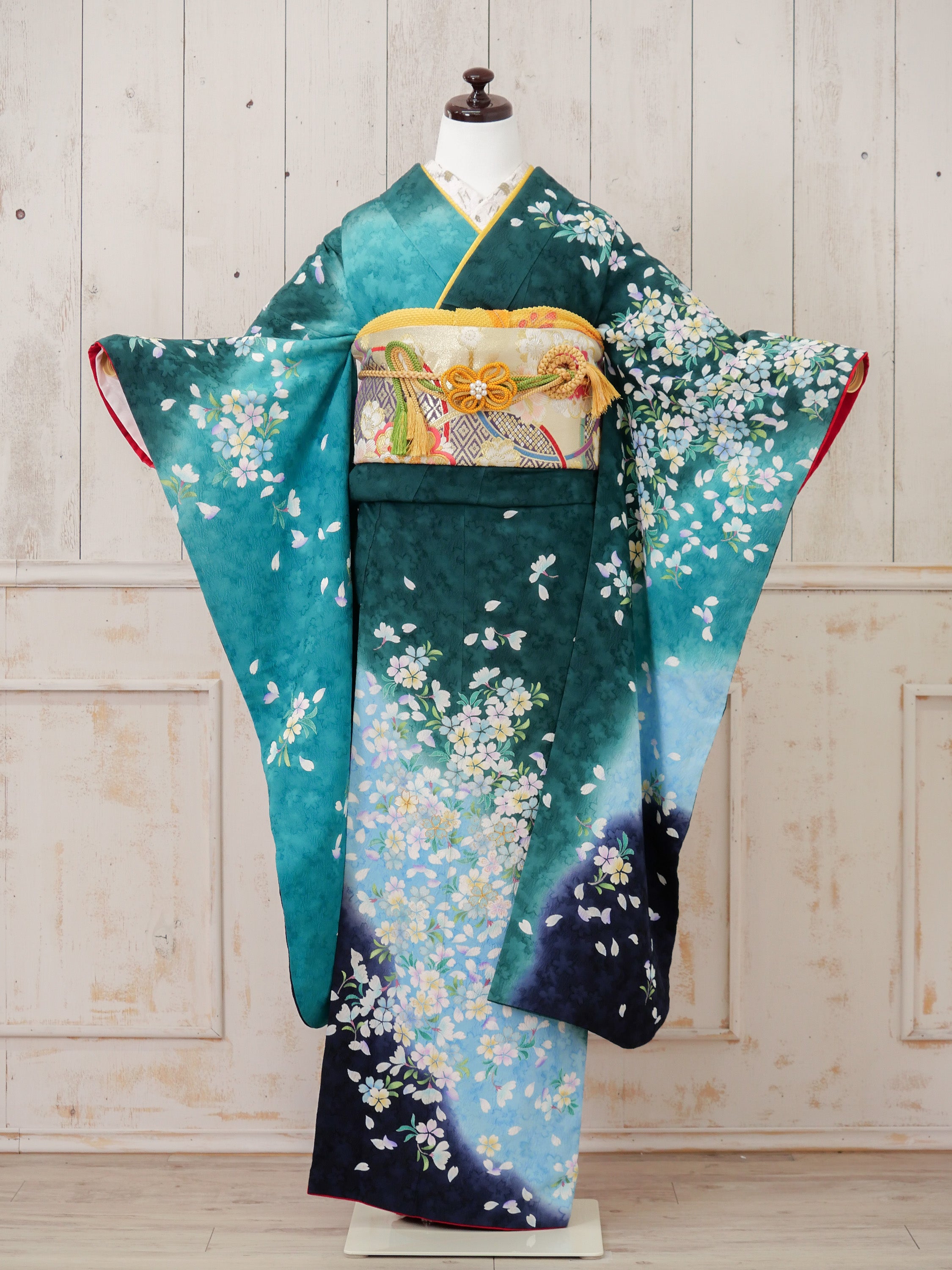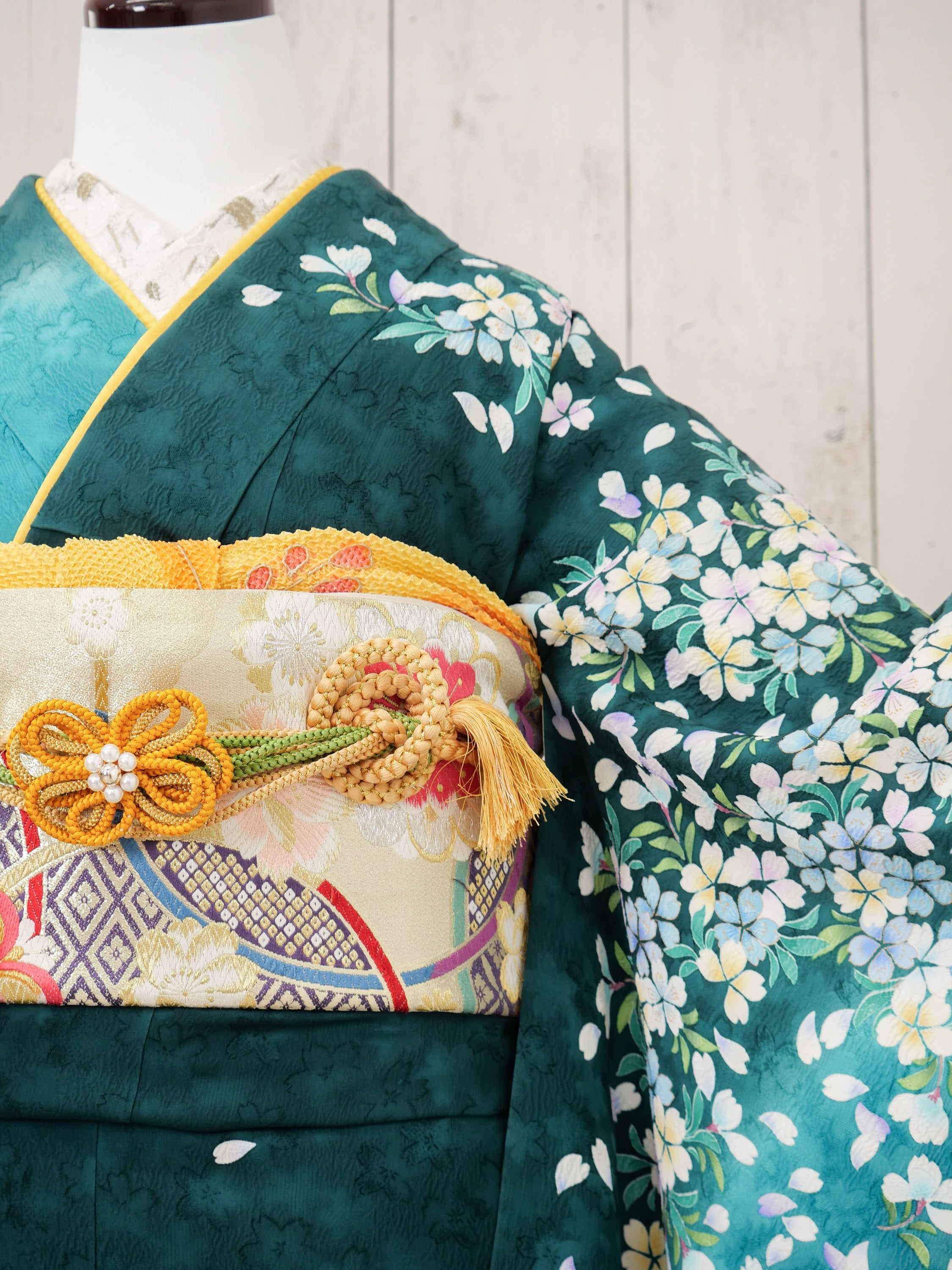 深みのあるグリーンに白と淡いピンクの花々が舞い散るように描かれた一枚。幻想的なグラデーションと品格ある金の帯が華やかさを演出し、成人式や晴れの日にぴったりの上品な振袖です。