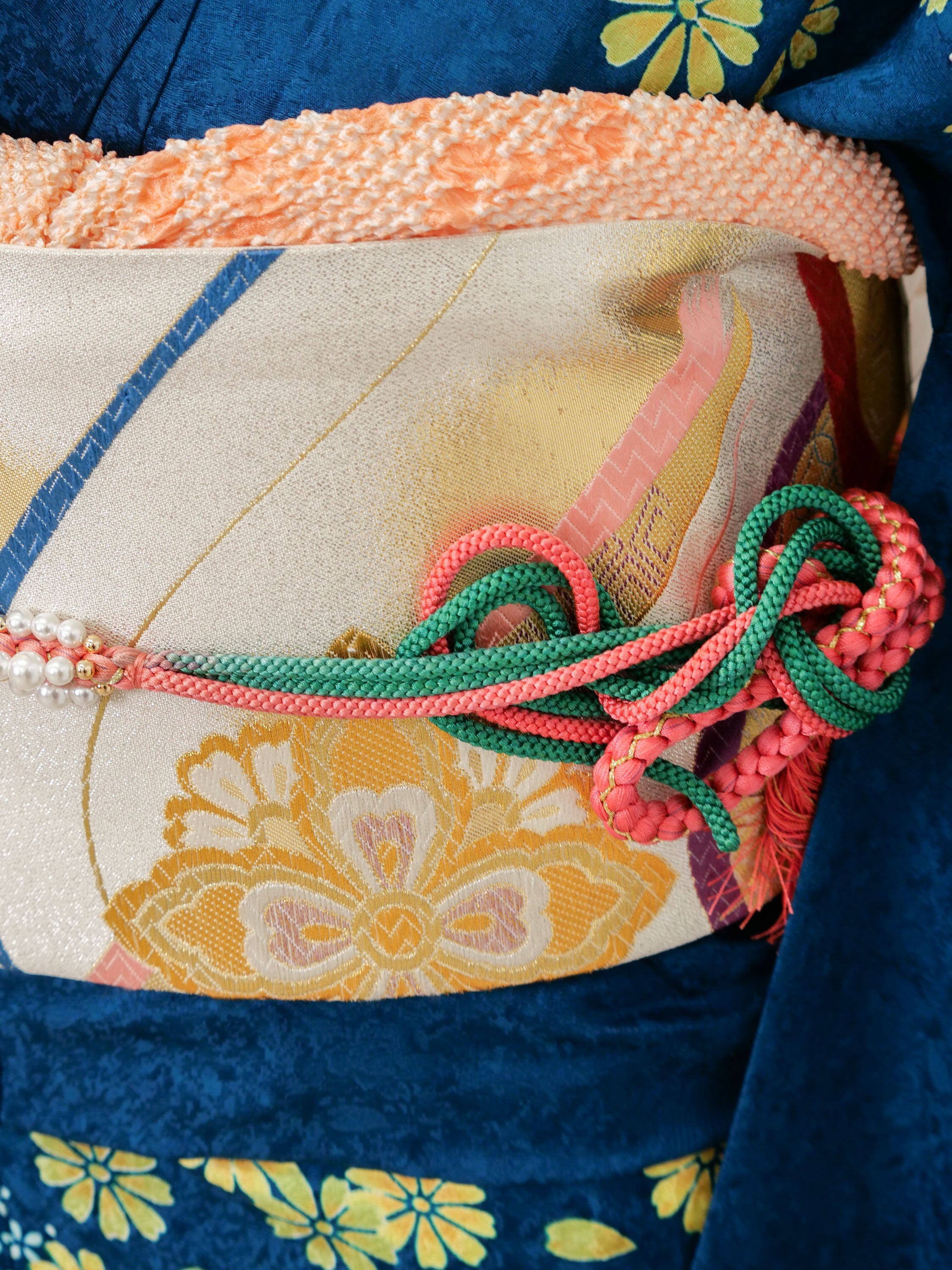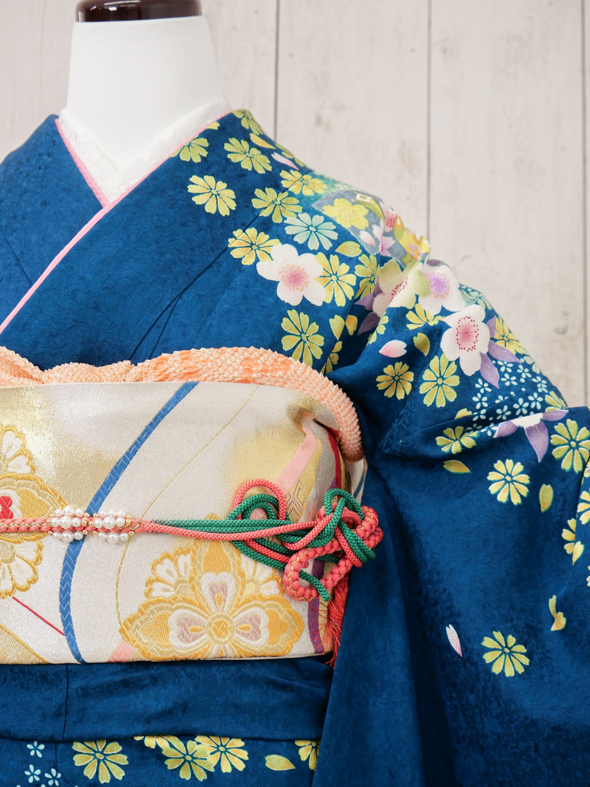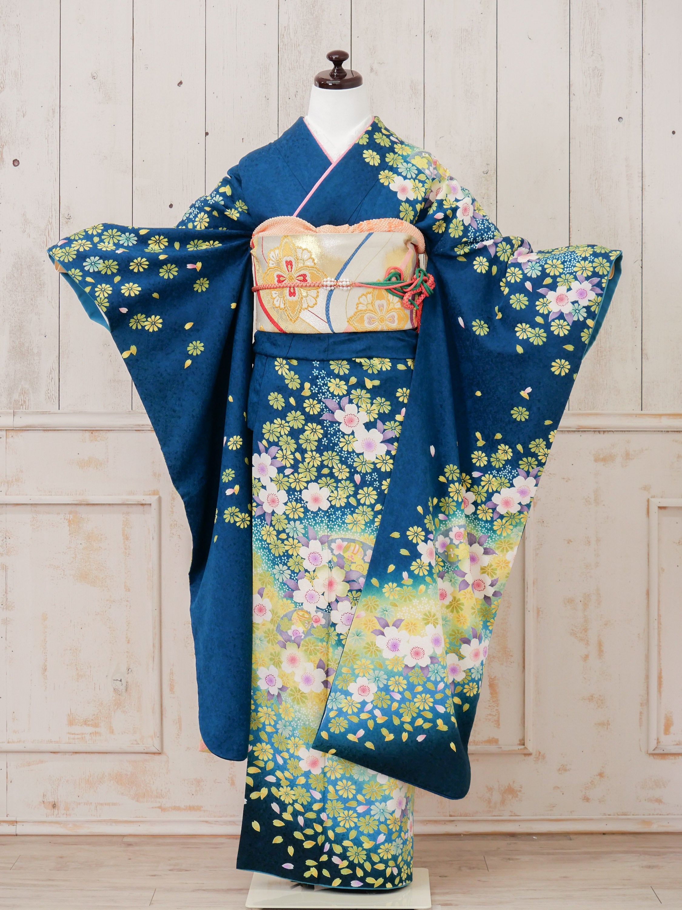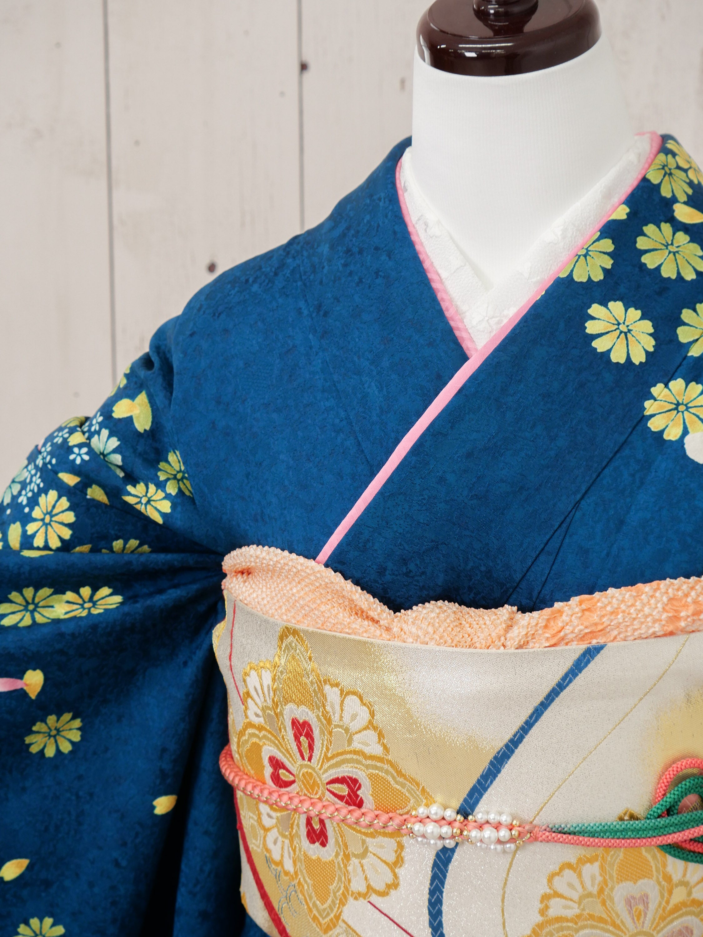 深みのある藍色に、黄色とピンクの小花が華やかに散りばめられた正統派スタイル。優しい雰囲気と落ち着きが感じられ、大人びた印象を演出します。