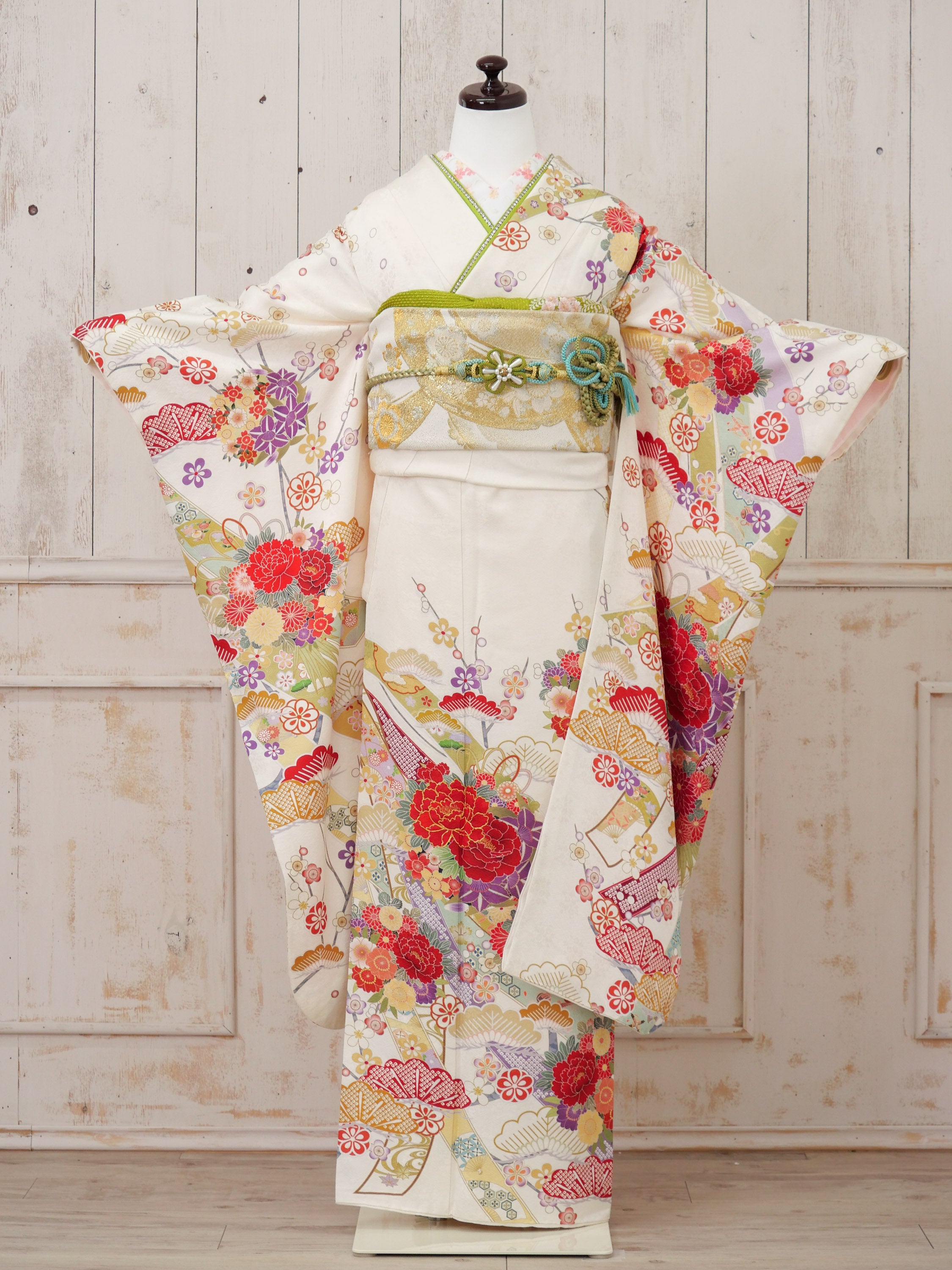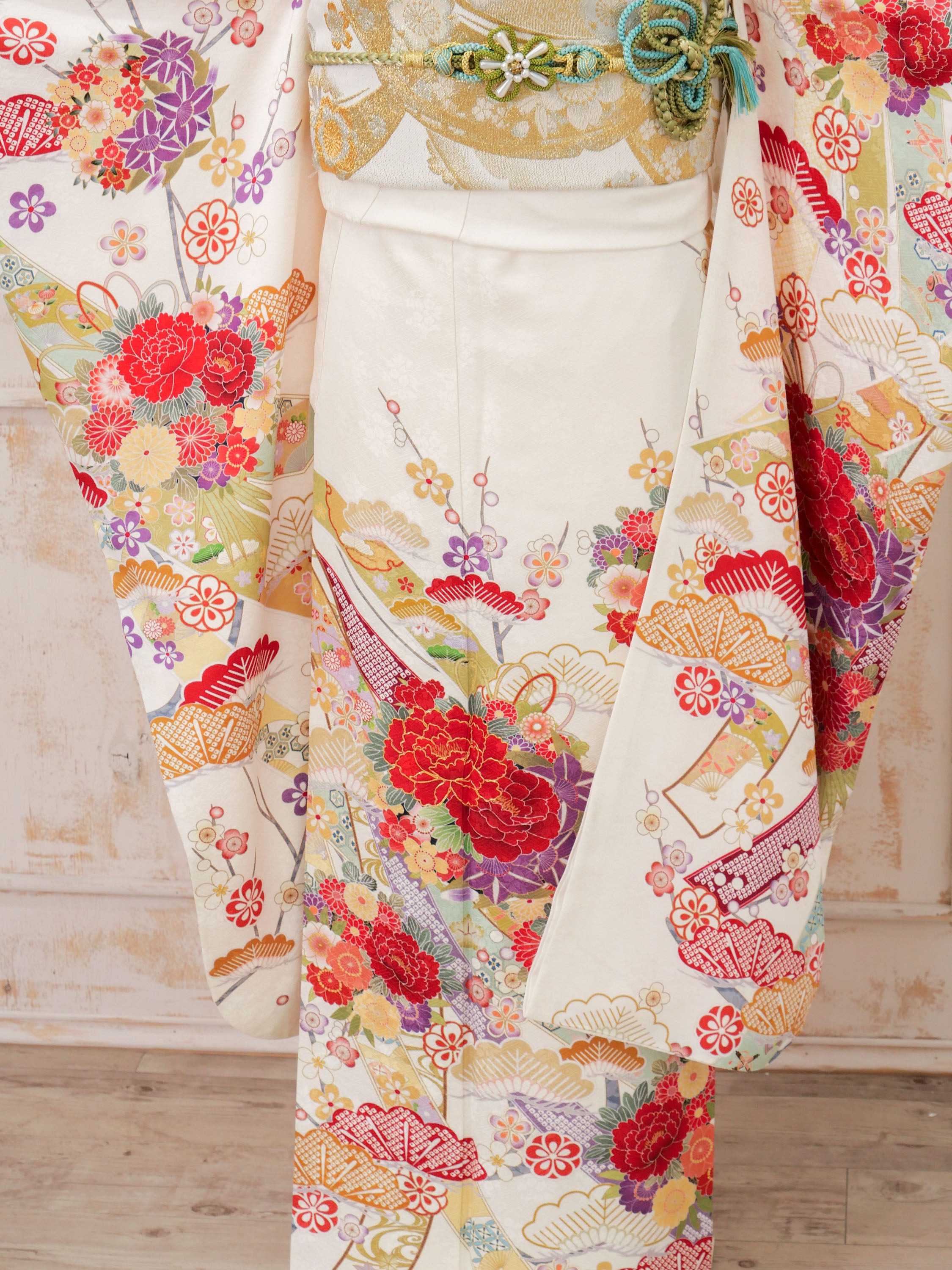 オフホワイトをベースに、華やかな赤や紫の花、扇、御所車などの伝統文様が彩る正統派の振袖。日本の美を詰め込んだ優雅で品格ある一枚です。