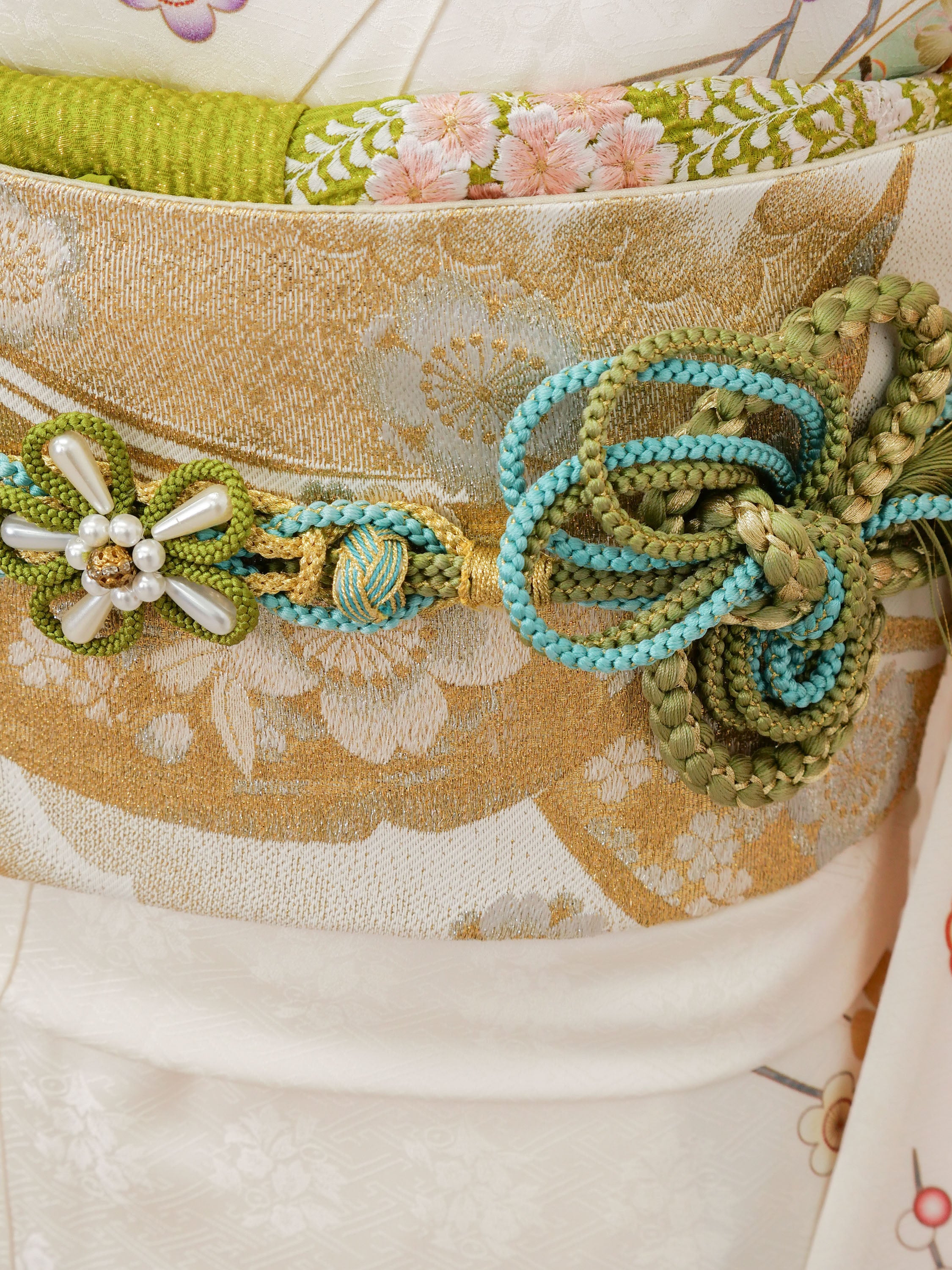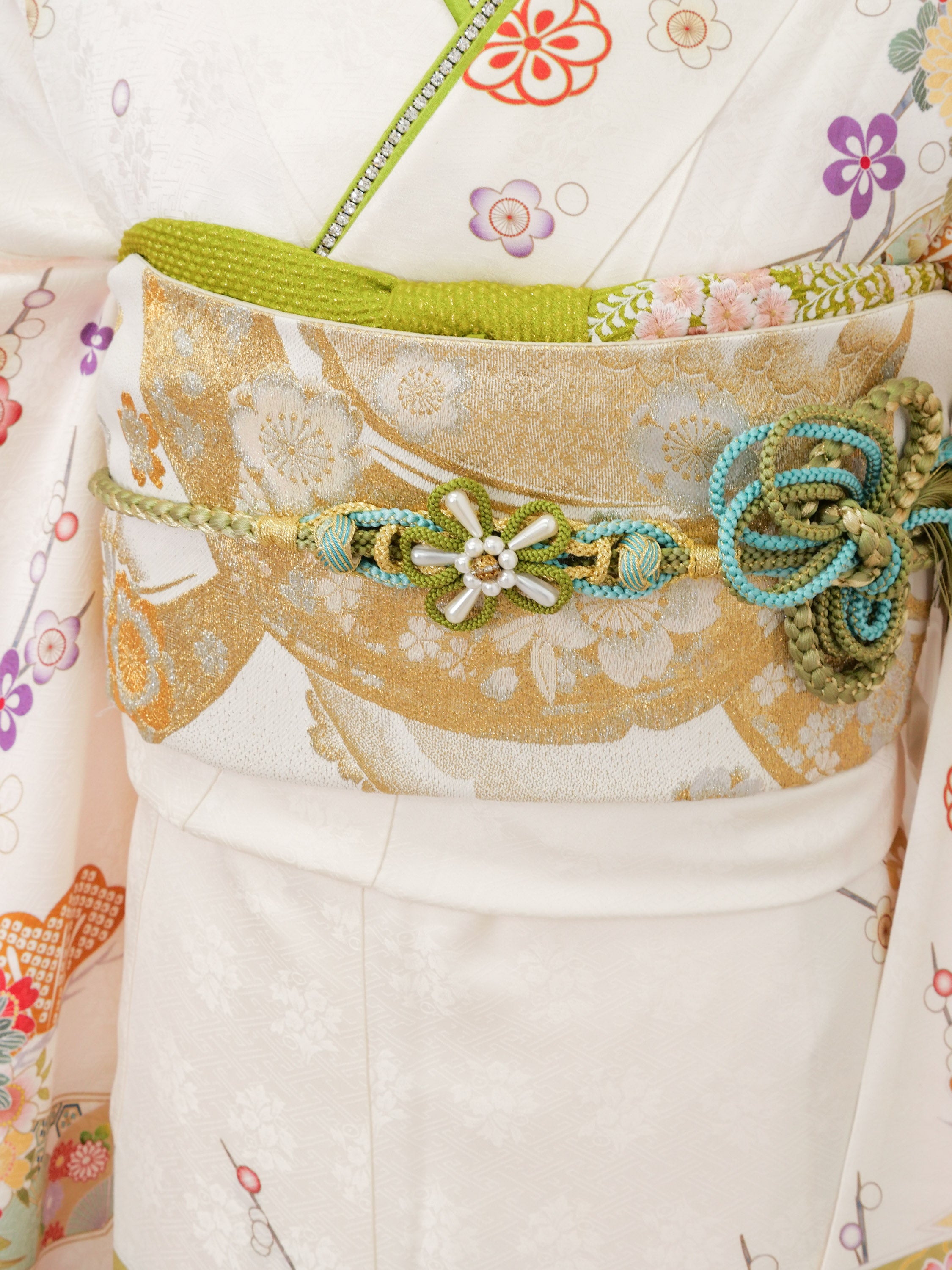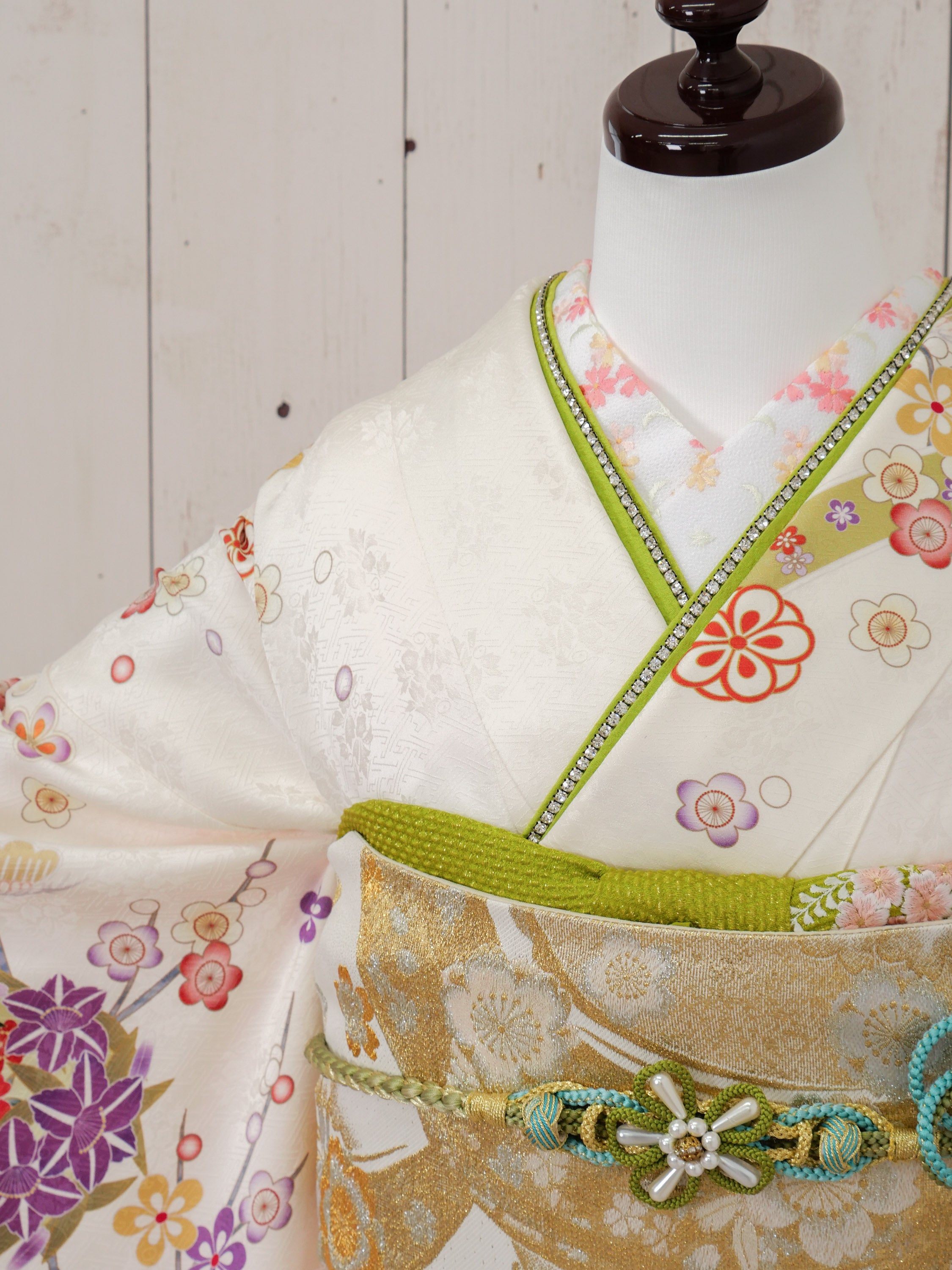 中振袖、袋帯、長襦袢(半襟付き、ポリエステル)、重ね衿(着物に縫い付けの商品あり)、帯揚げ、帯締め、ショール、腰紐5本、伊達締め2本、衿芯、前板、後板、帯枕(ガーゼ付き)、コーリンベルト1本、三重紐、草履、バッグ