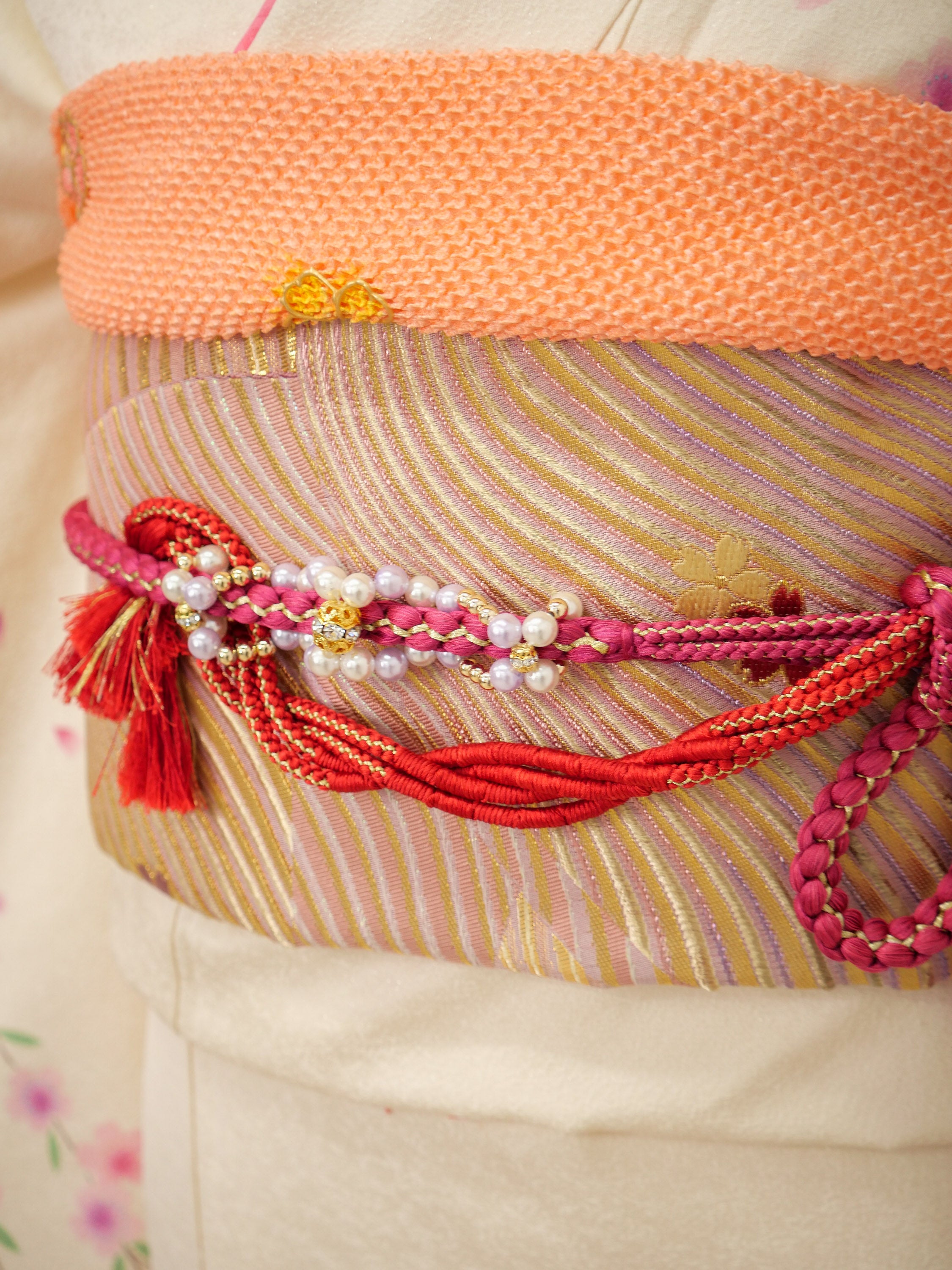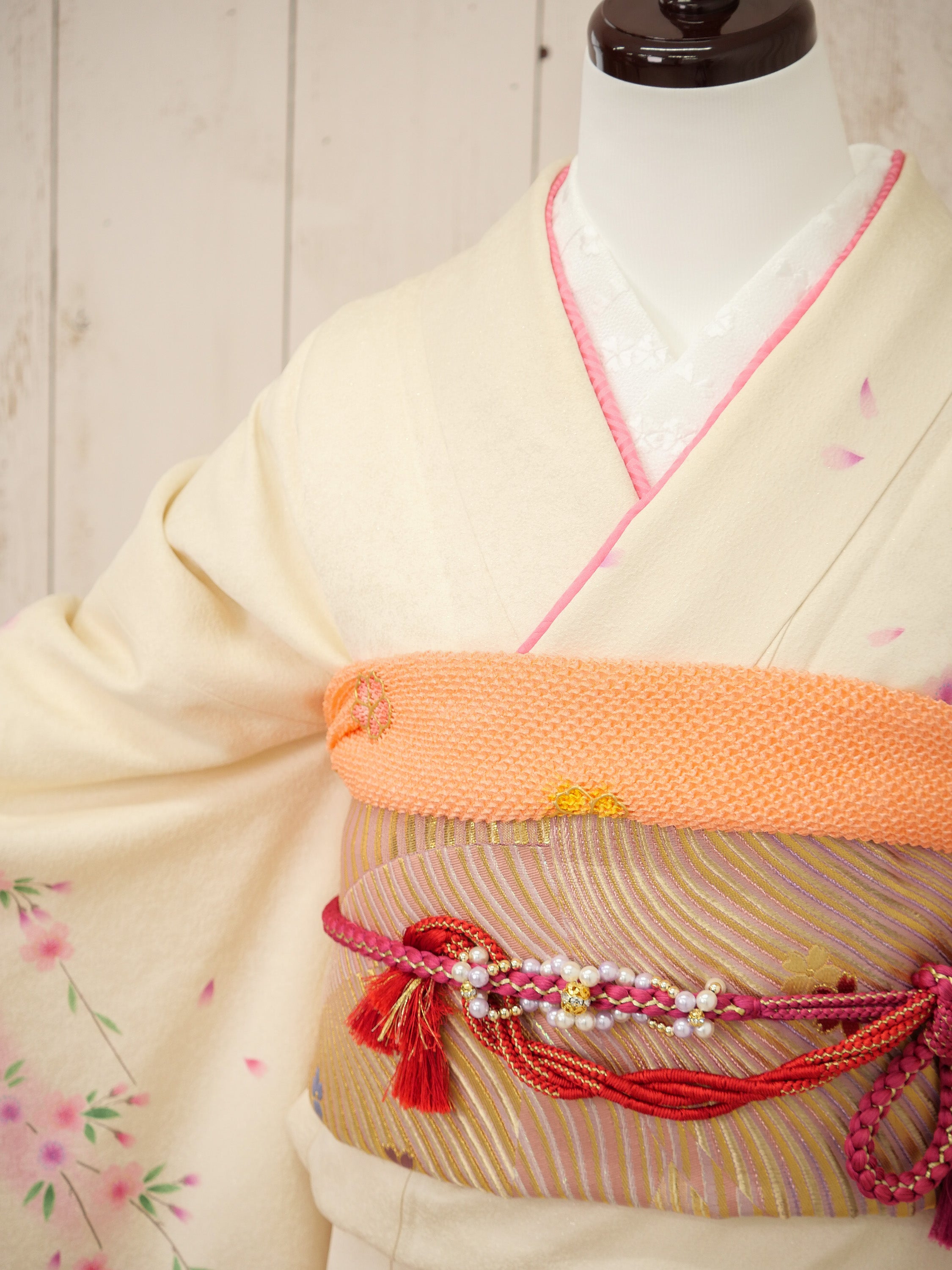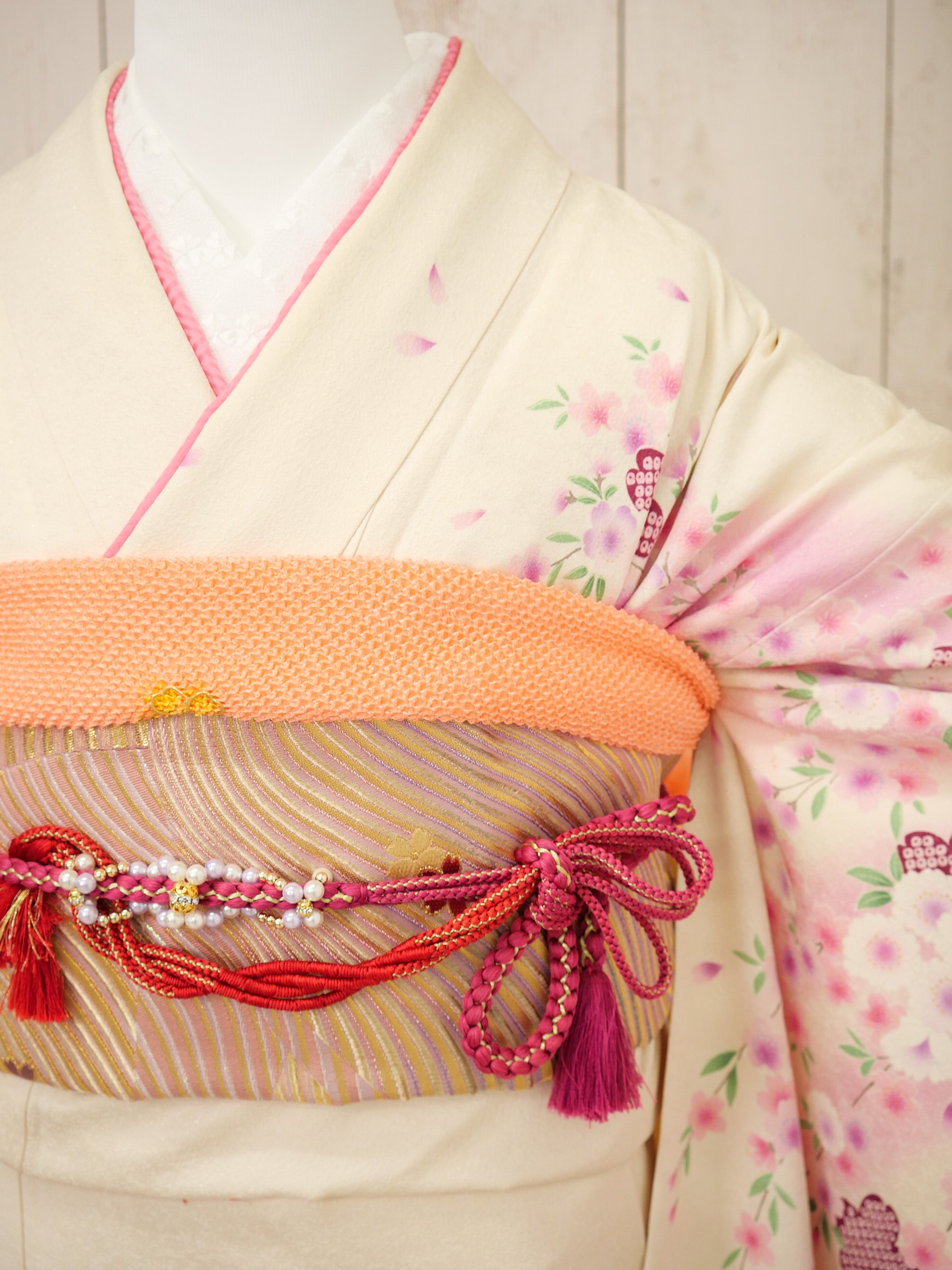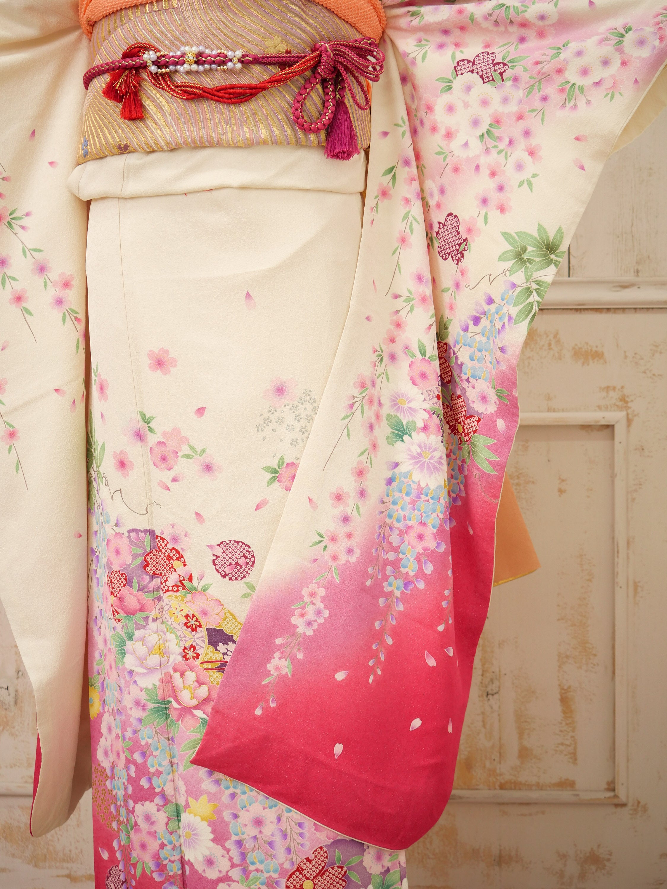 柔らかなクリーム地に桜や藤が舞い散る、春の息吹を感じる可憐な振袖。淡いピンクのグラデーションが優しく、ナチュラルで清楚な魅力を引き出してくれる一着です。