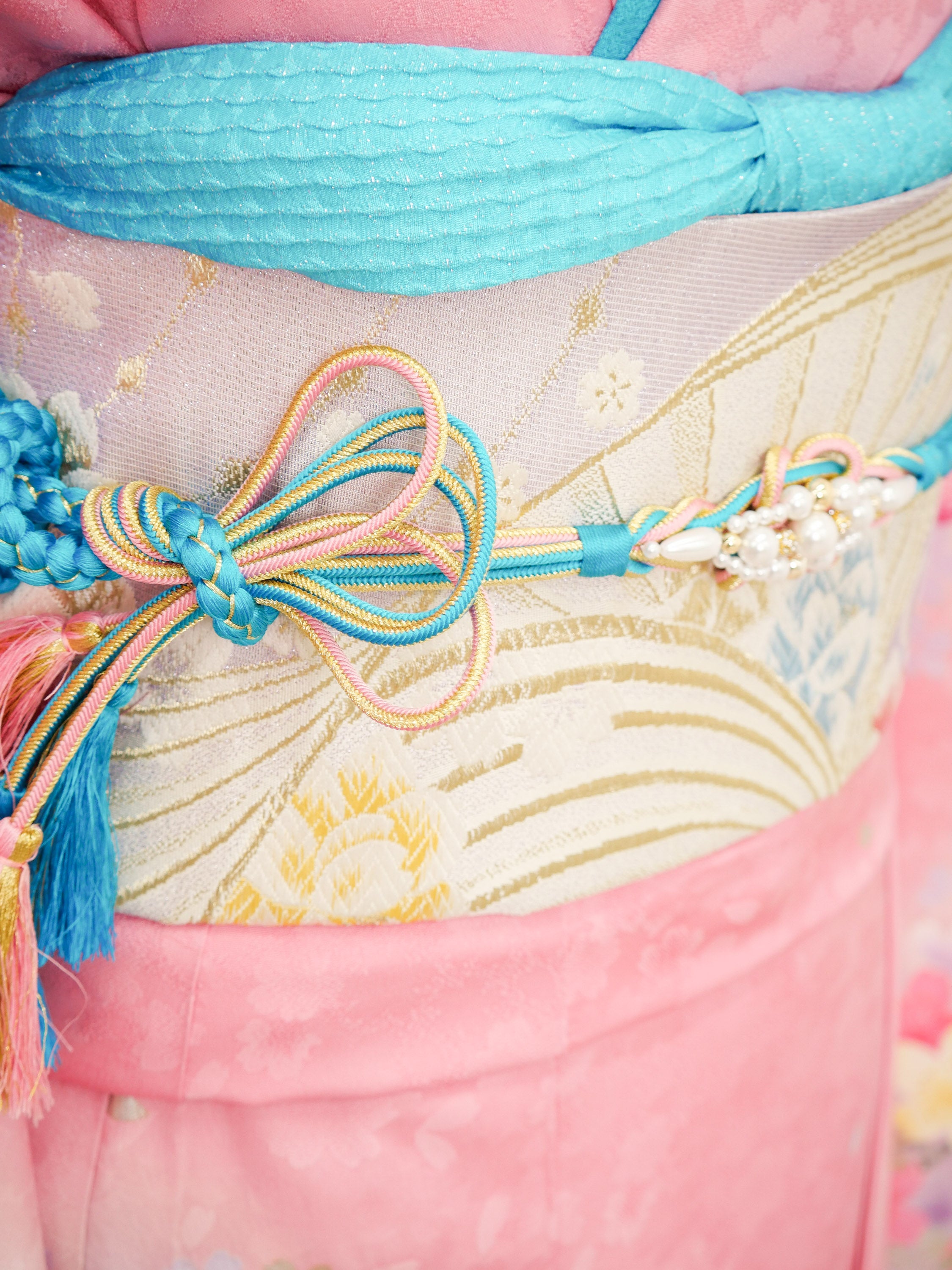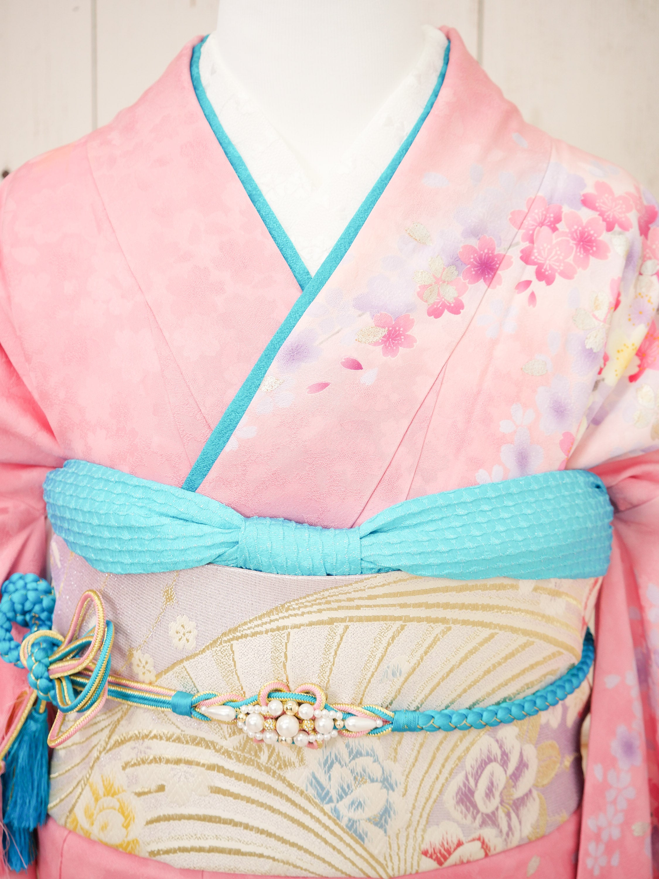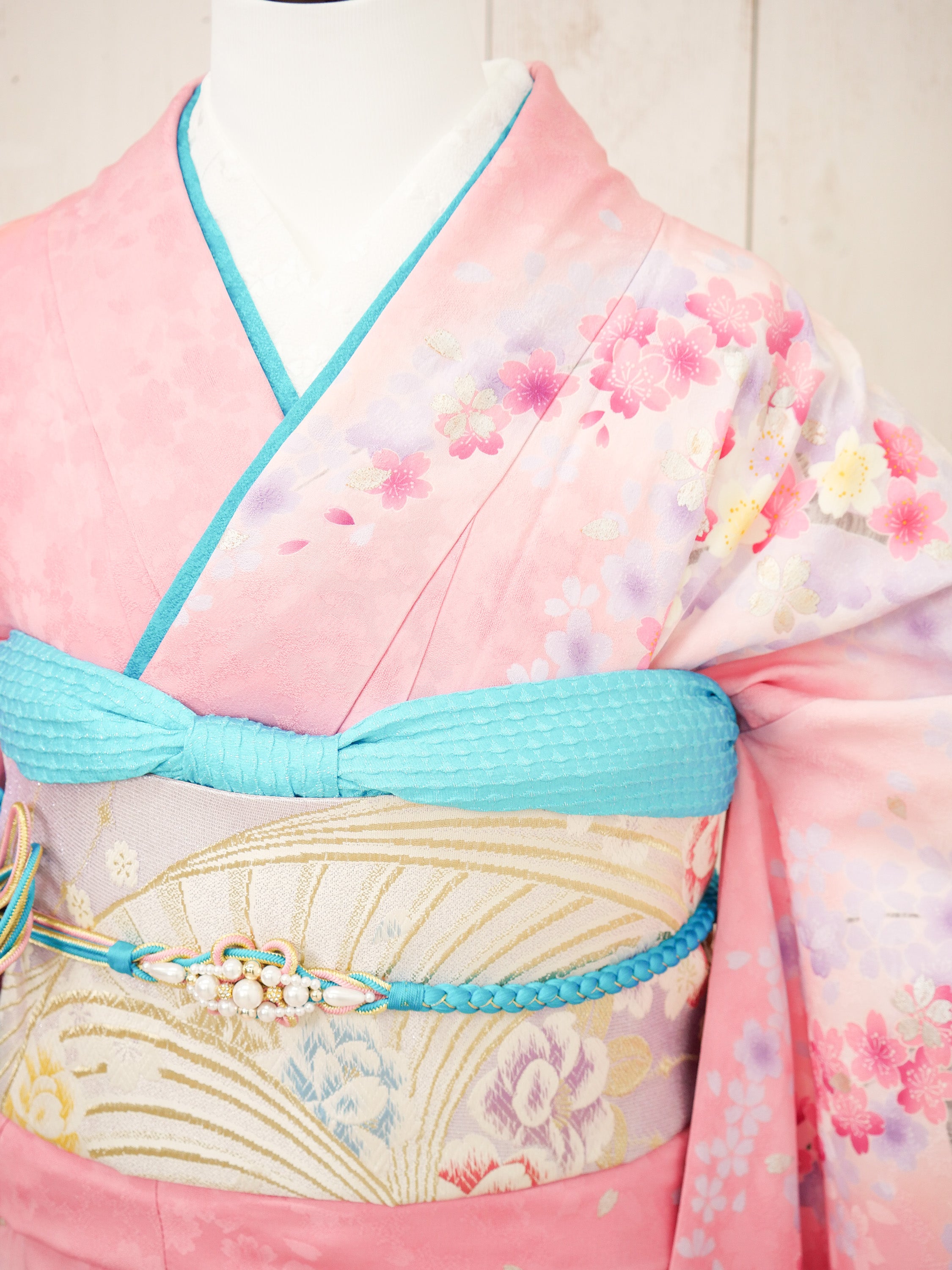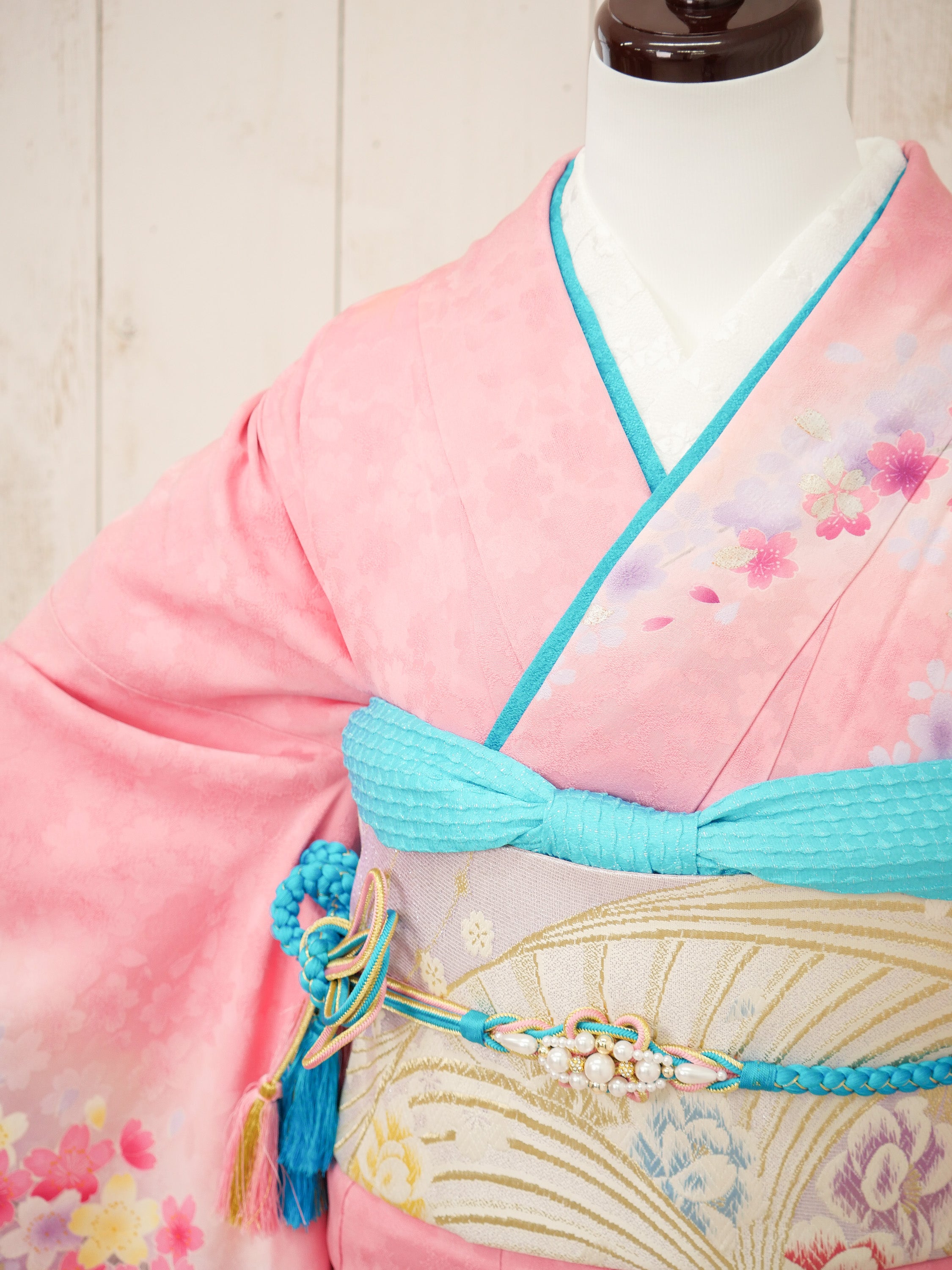 柔らかな桜色に流れるような花柄が描かれた、瑞々しく可憐な振袖。ブルーの帯締めと淡い色合いの帯がアクセントとなり、爽やかな雰囲気をプラス。春風のような軽やかさを纏える、華やかで愛らしいデザインです。