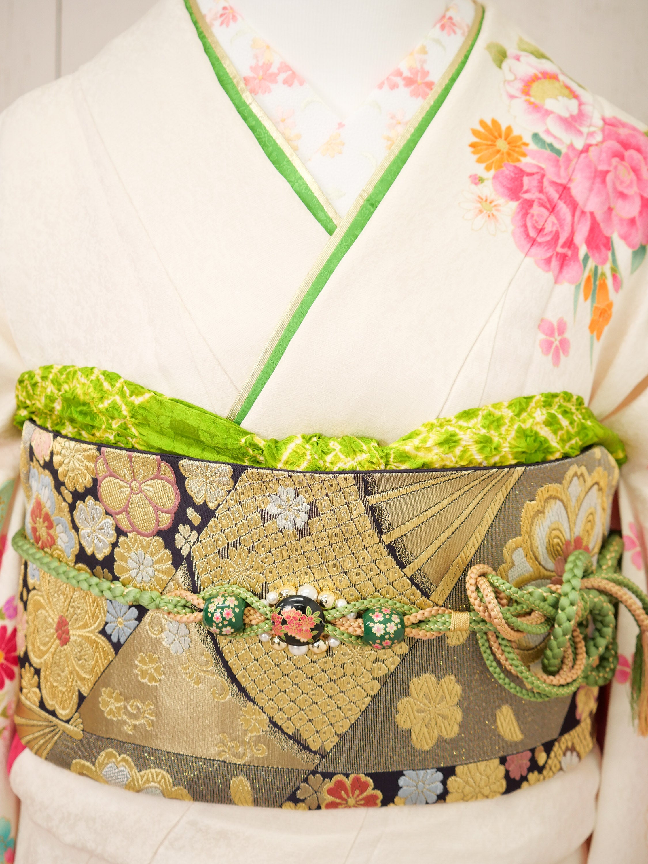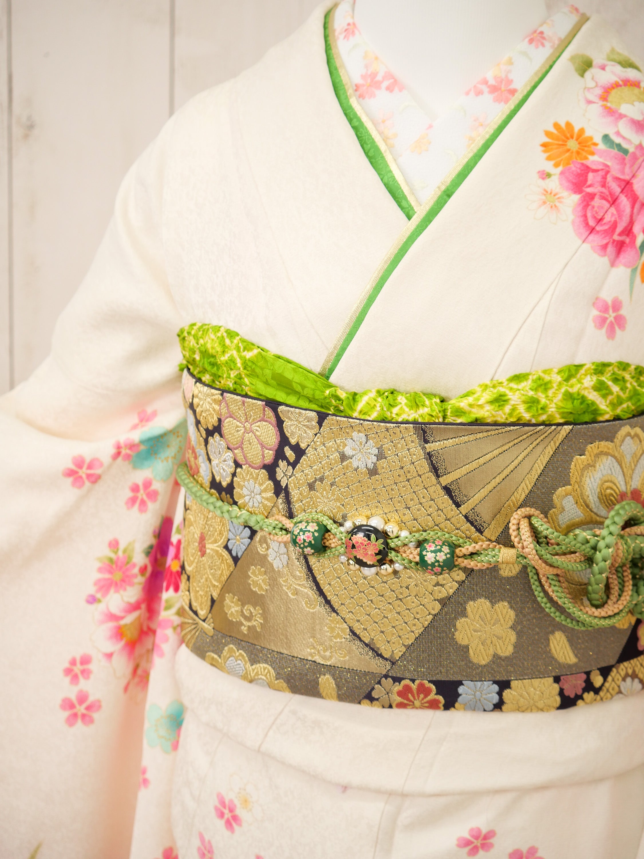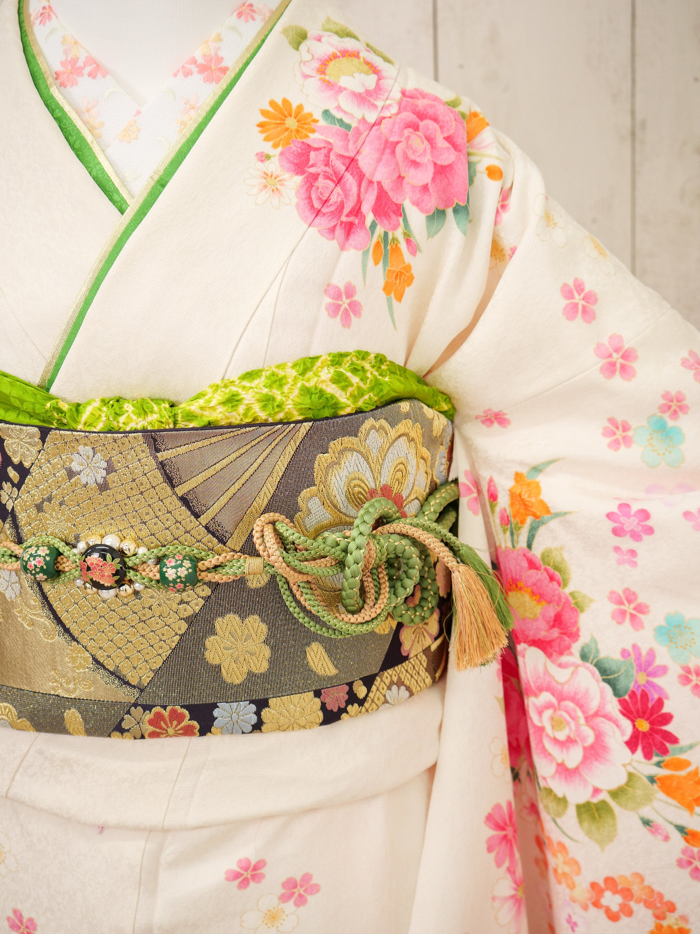 中振袖、袋帯、長襦袢(半襟付き、ポリエステル)、重ね衿(着物に縫い付けの商品あり)、帯揚げ、帯締め、ショール、腰紐5本、伊達締め2本、衿芯、前板、後板、帯枕(ガーゼ付き)、コーリンベルト1本、三重紐、草履、バッグ