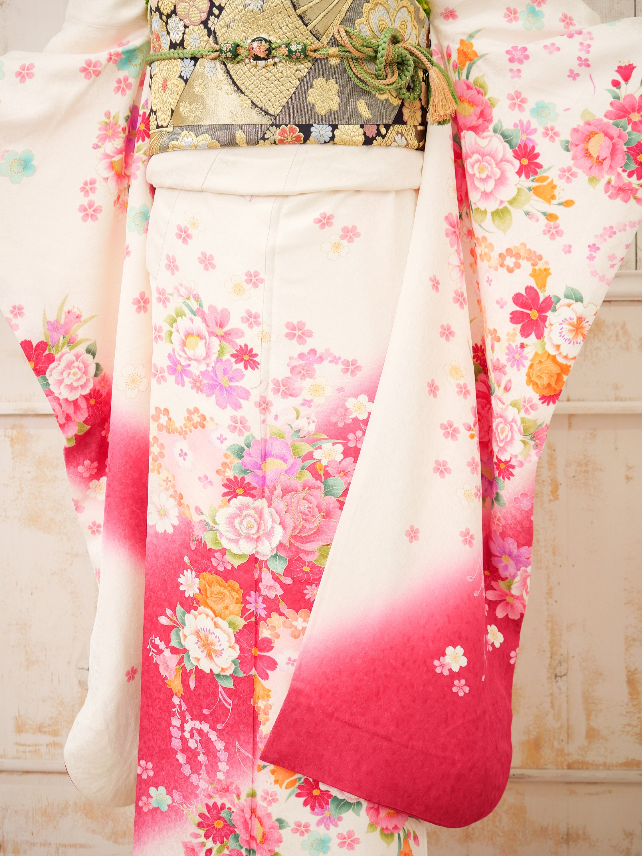 柔らかな白地に鮮やかな花々が咲き乱れる華やかな振袖。裾の濃紅へのグラデーションが華やかさを増し、豪華な帯の金彩が全体を引き締めます。清楚さと華麗さを兼ね備え、成人式や祝いの場にふさわしい装いです。