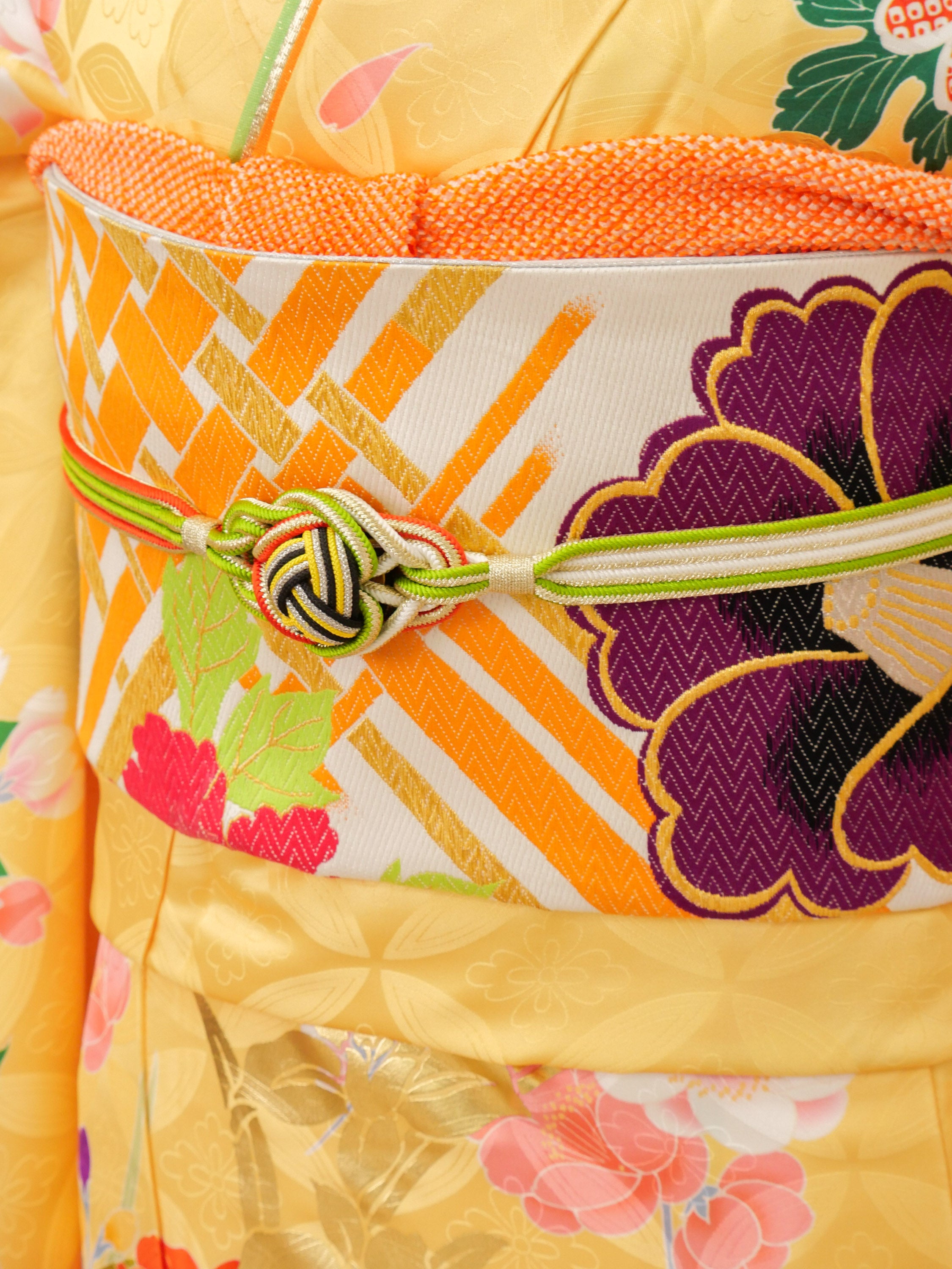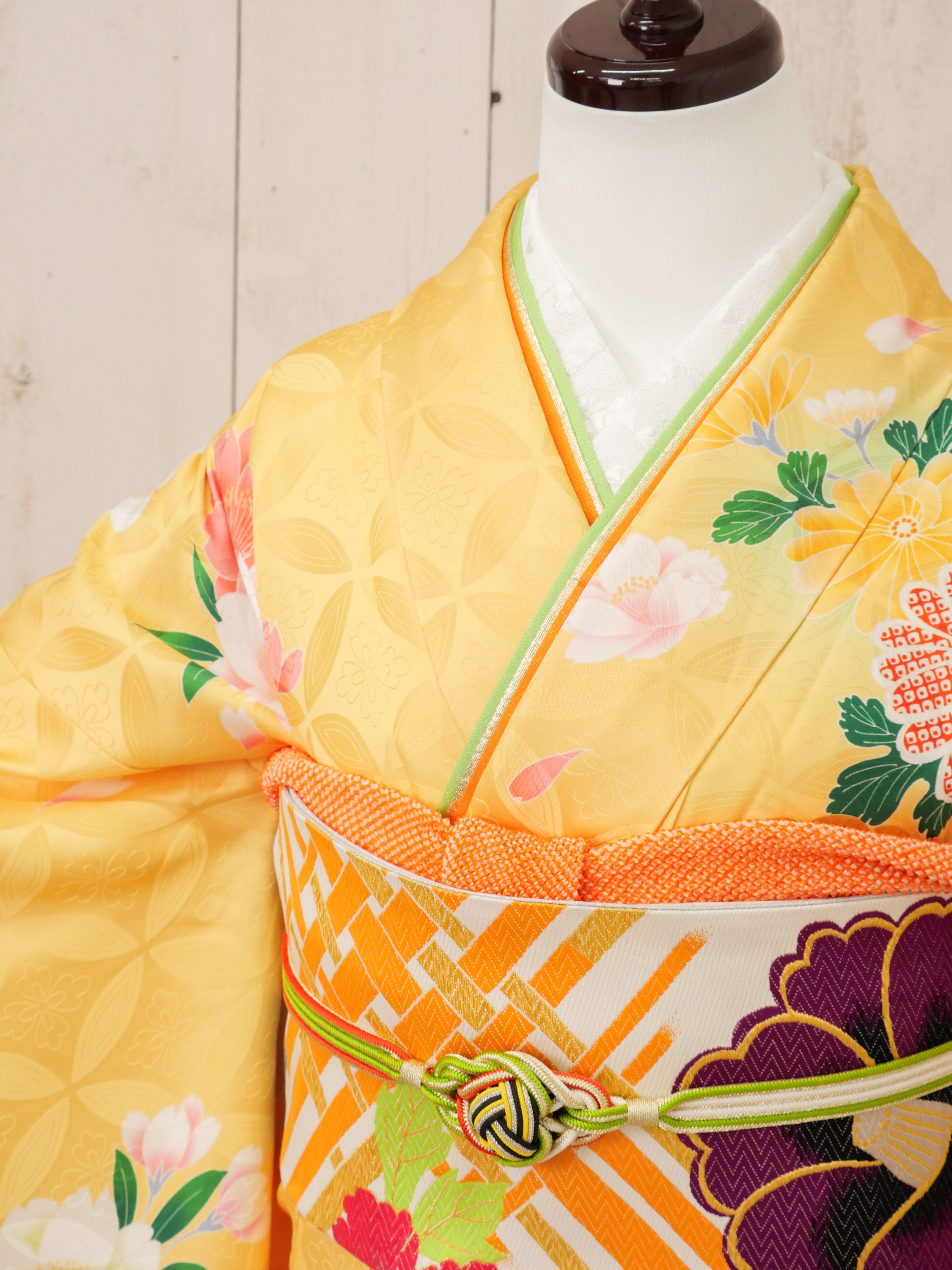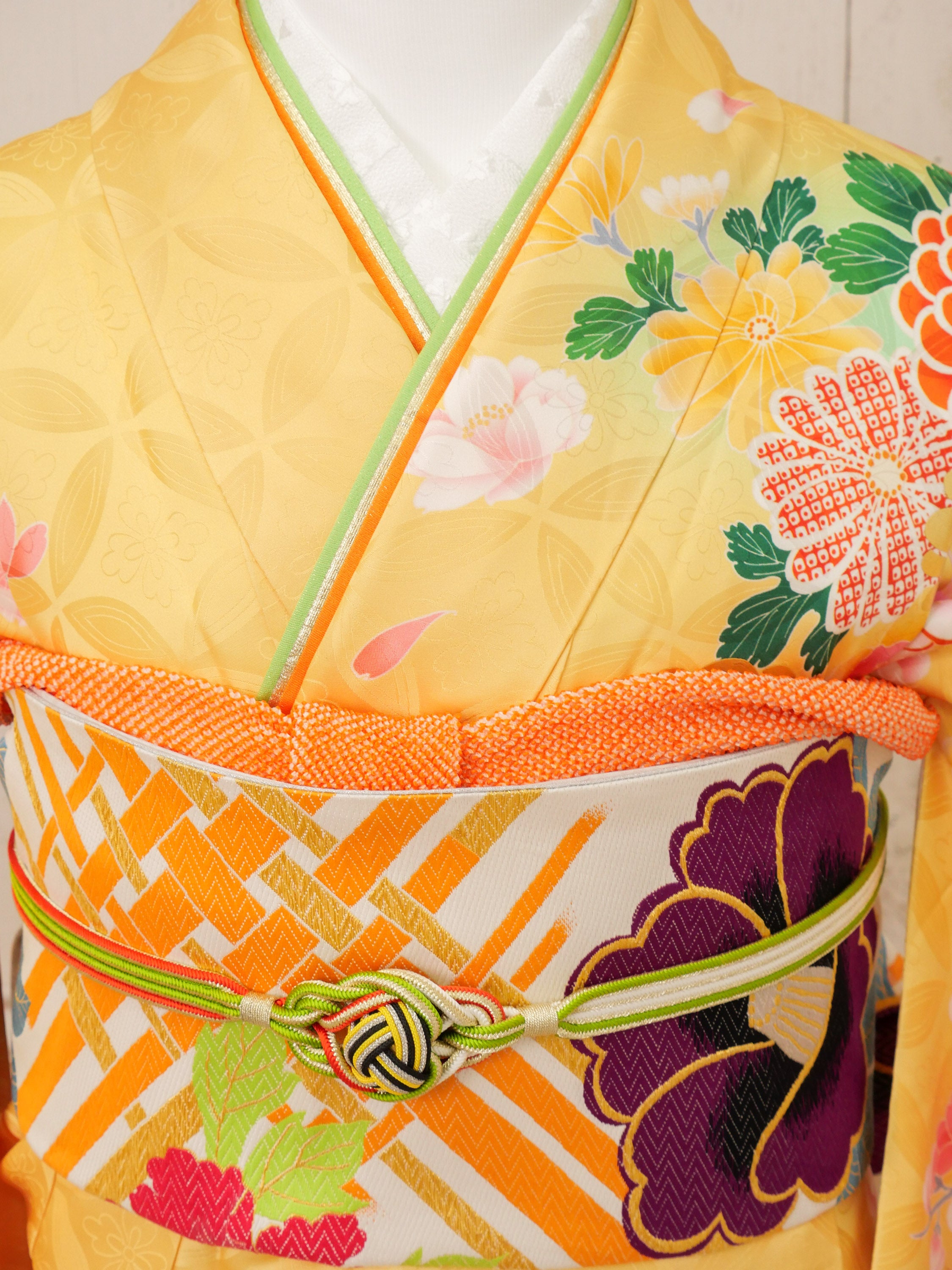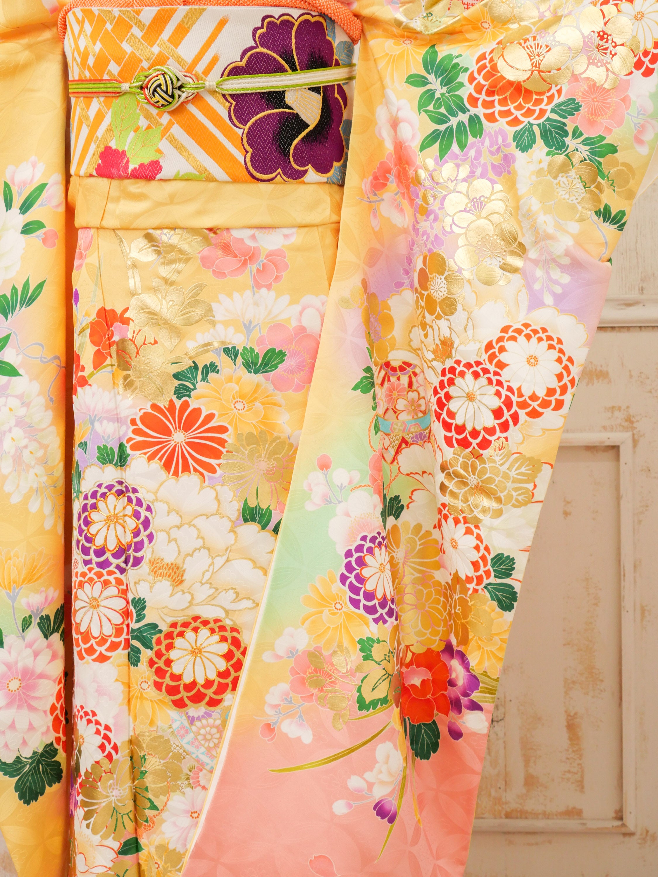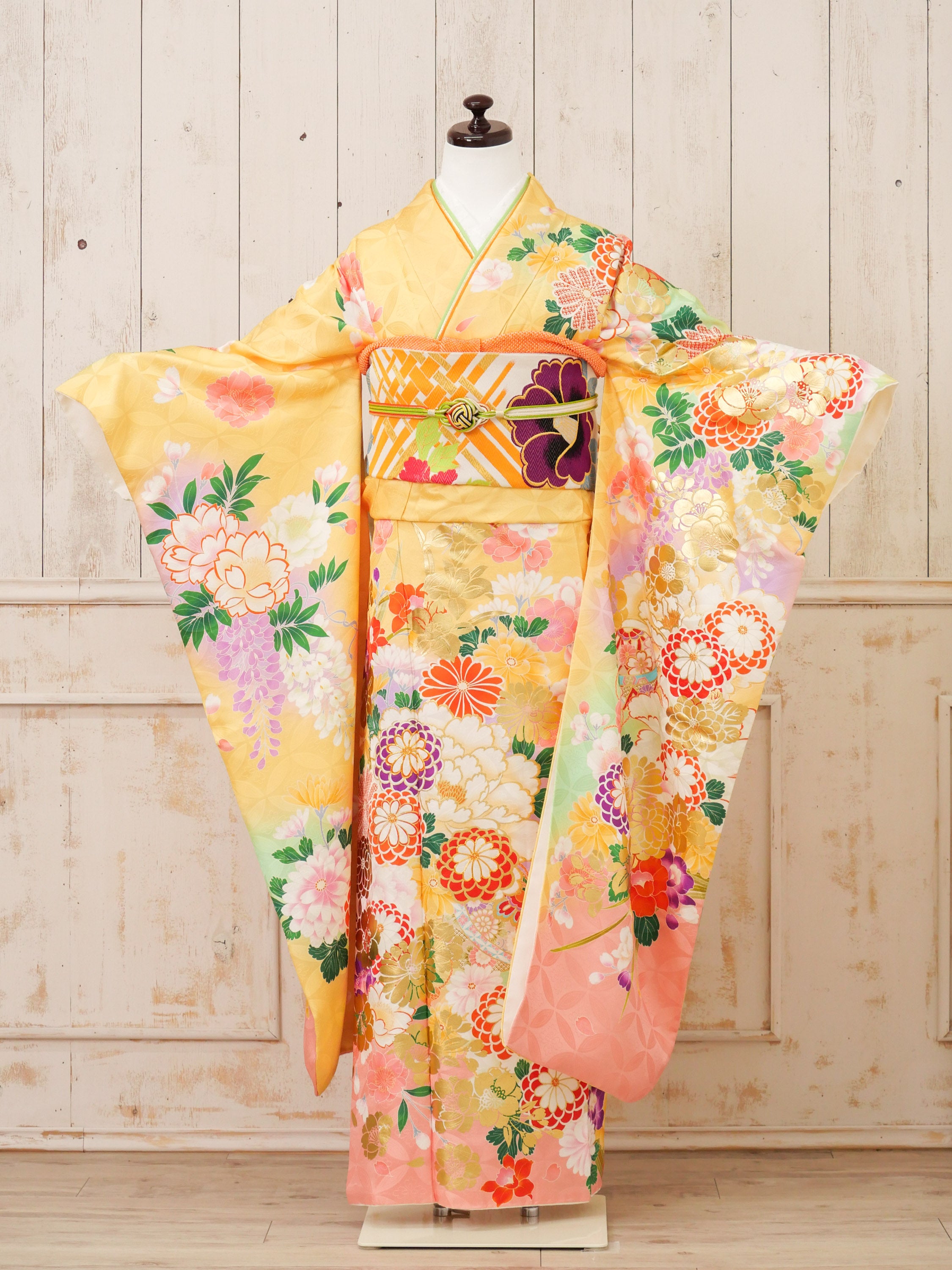 明るいイエローベースに色とりどりの花々が咲き誇る、晴れやかで華やかな振袖。ゴールドの帯と紫のアクセントが上品さを引き立て、可愛らしさと大人っぽさを両立。晴れの日をより特別に演出する一着です。