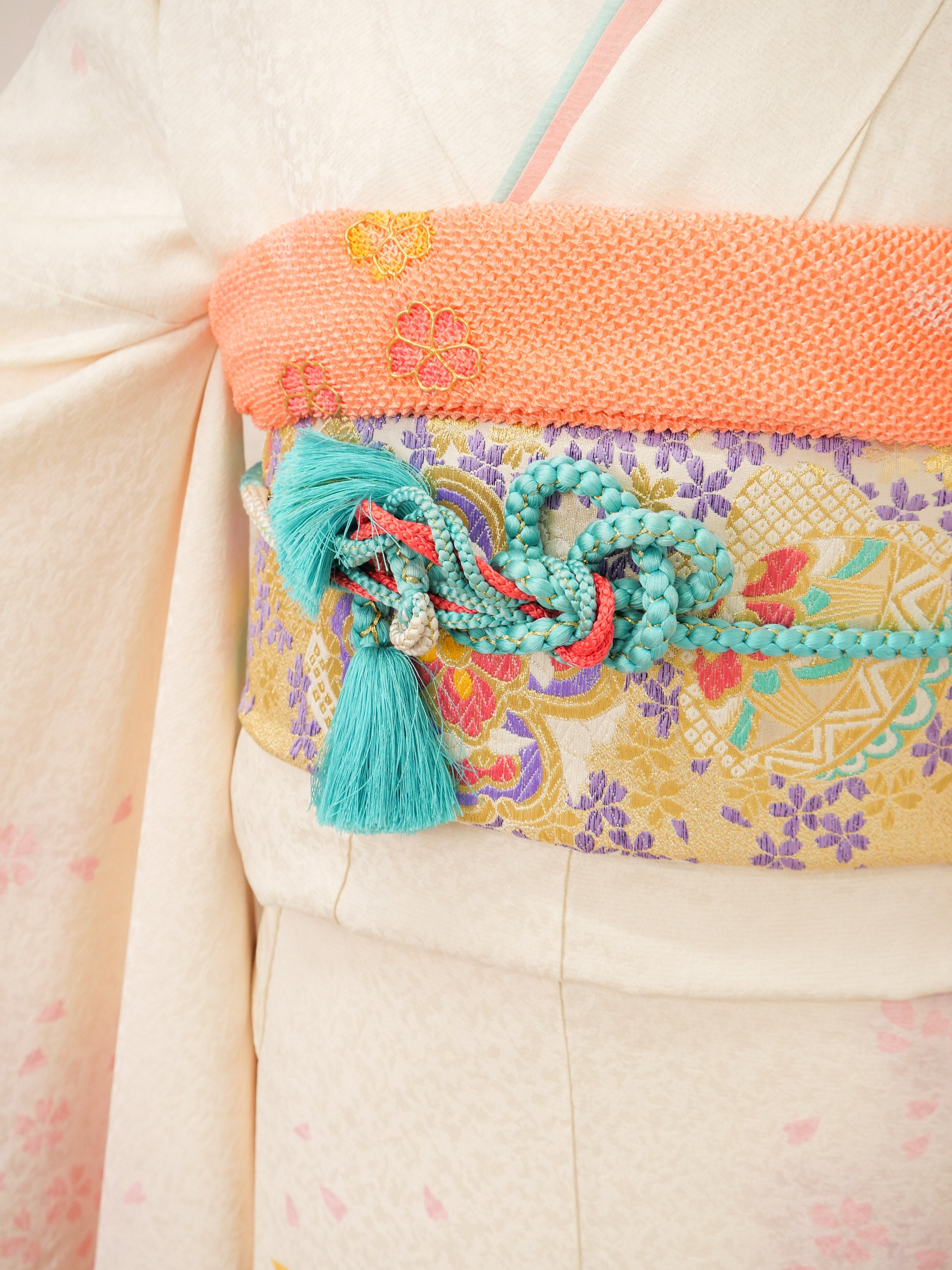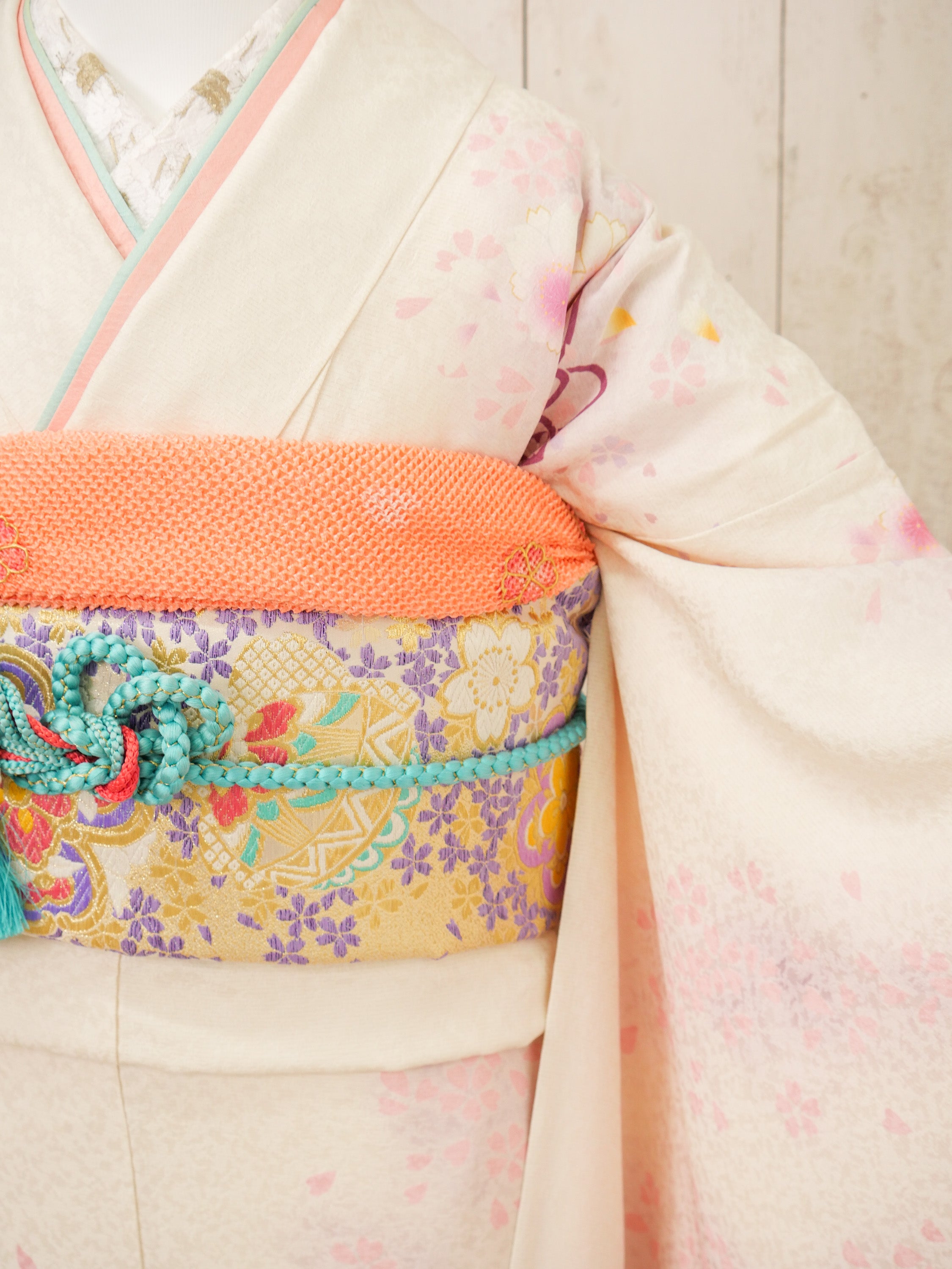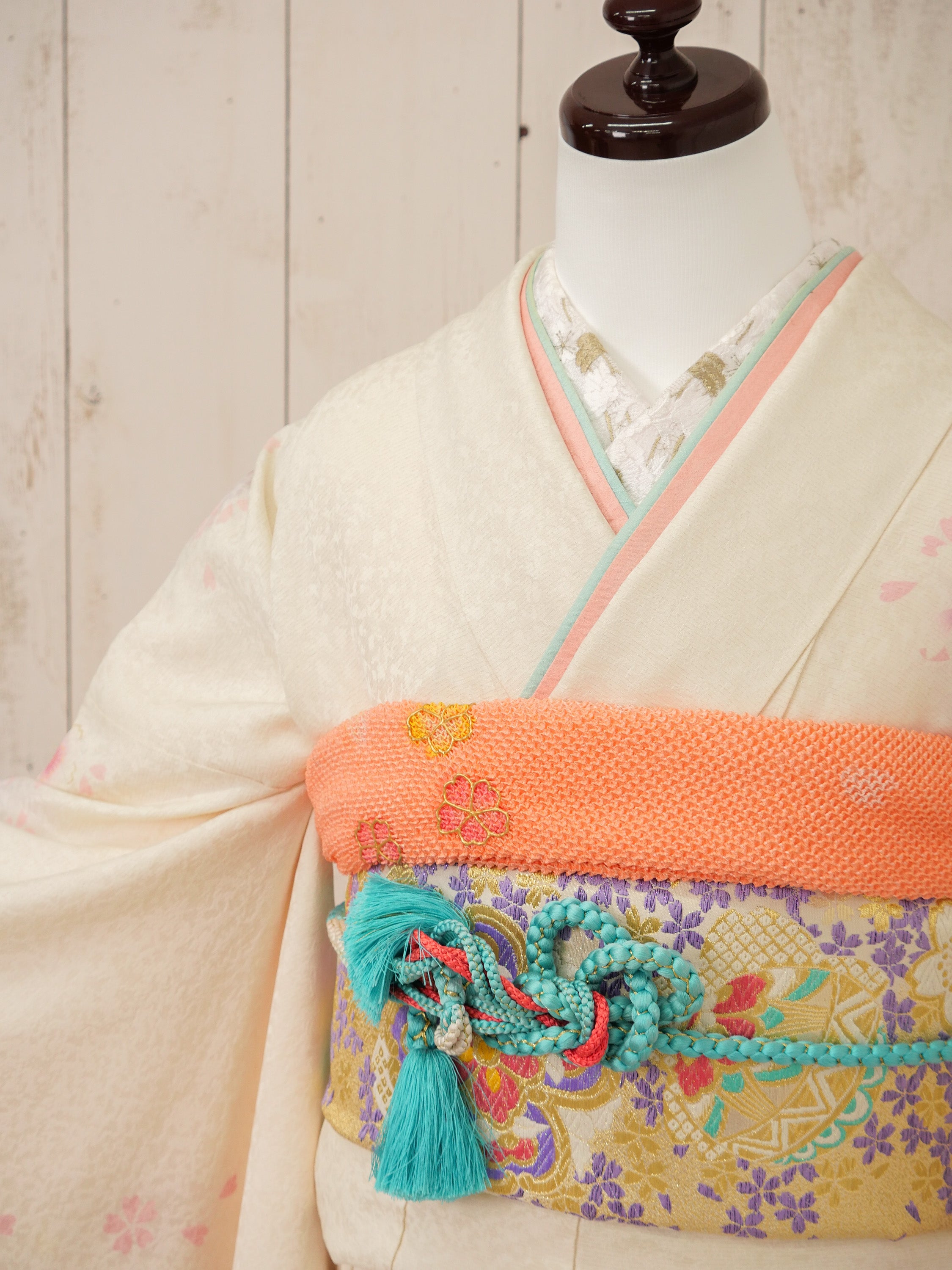 中振袖、袋帯、長襦袢(半襟付き、ポリエステル)、重ね衿(着物に縫い付けの商品あり)、帯揚げ、帯締め、ショール、腰紐5本、伊達締め2本、衿芯、前板、後板、帯枕(ガーゼ付き)、コーリンベルト1本、三重紐、草履、バッグ