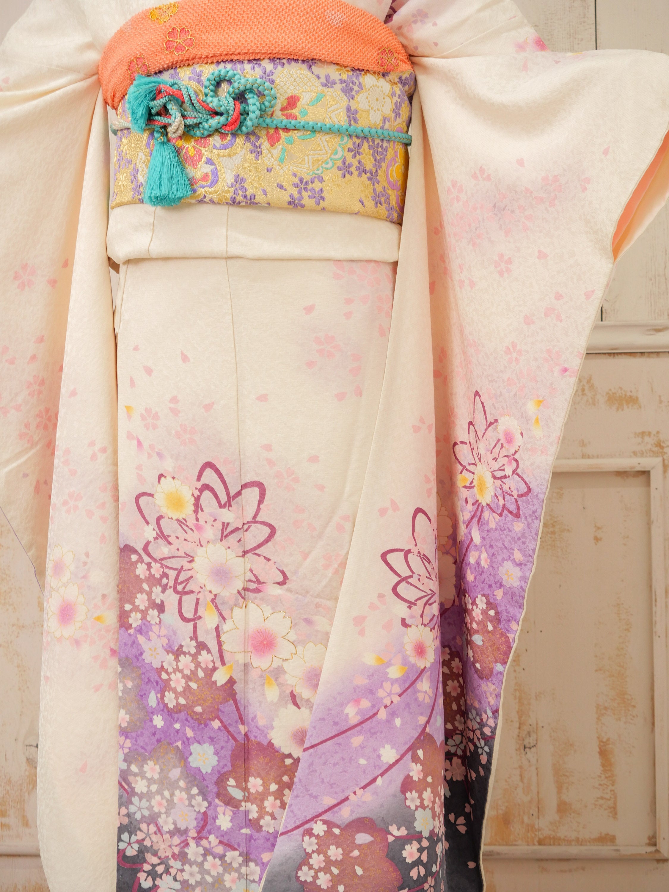 ピンク地に豪華な牡丹や菊が咲き誇る、華やかさ満点の一枚。金や紫のアクセントが上品さを加え、可愛いだけじゃない存在感を放つ振袖です。晴れの日をより華やかに彩ります。