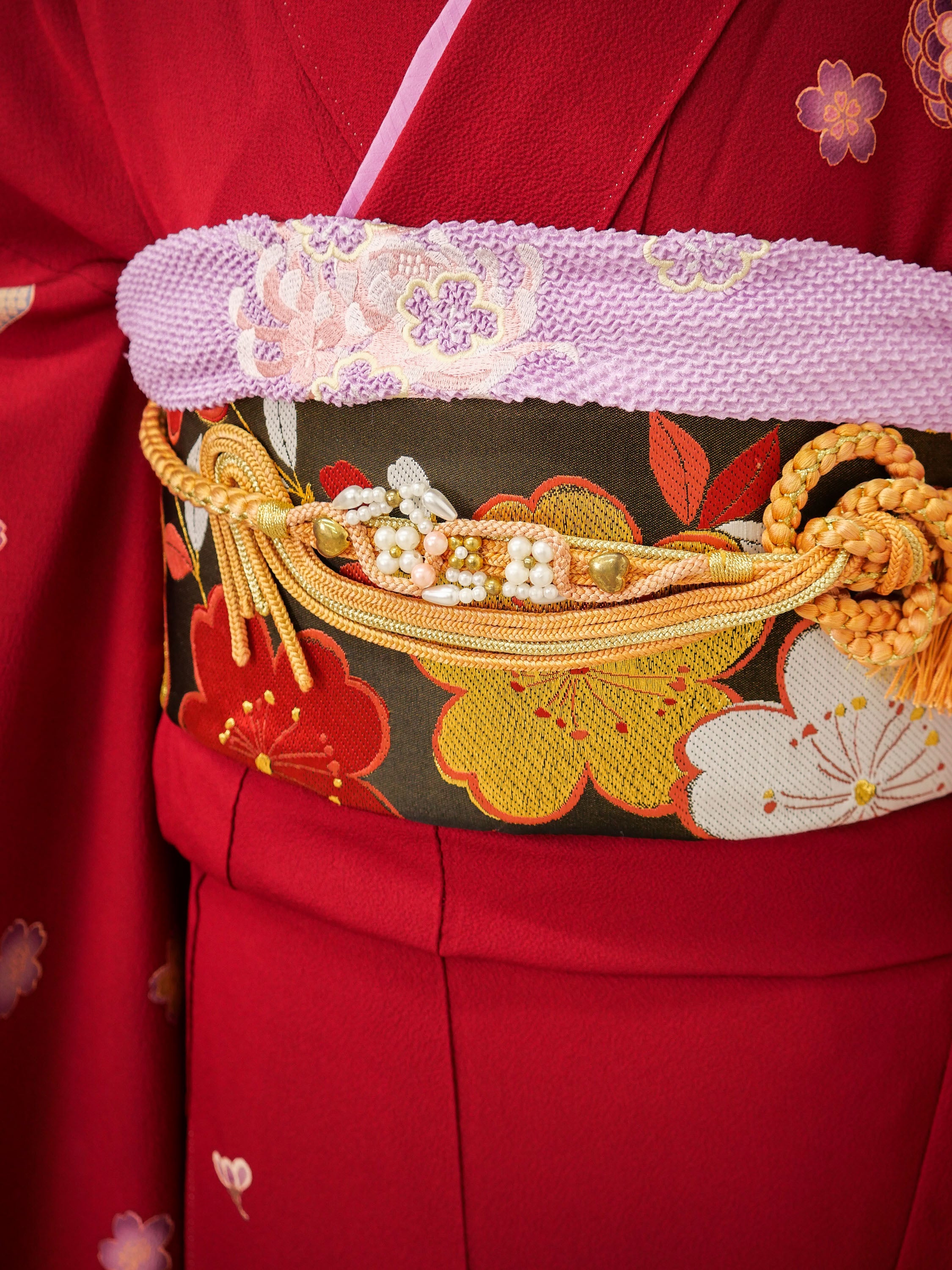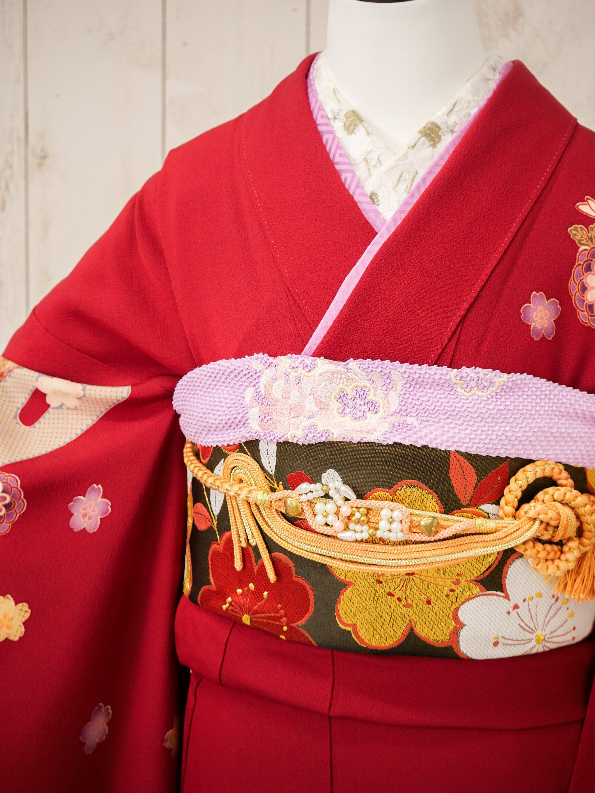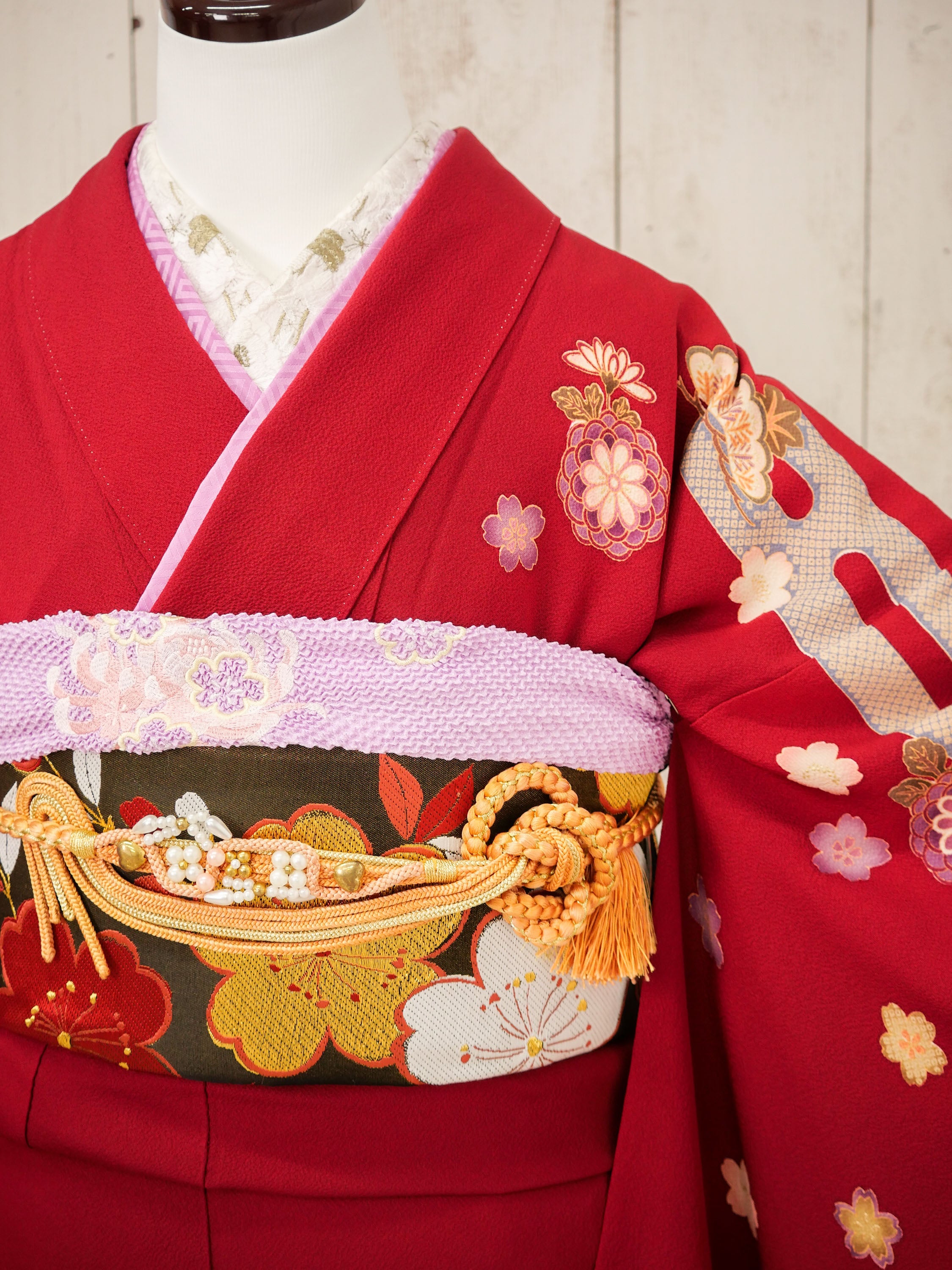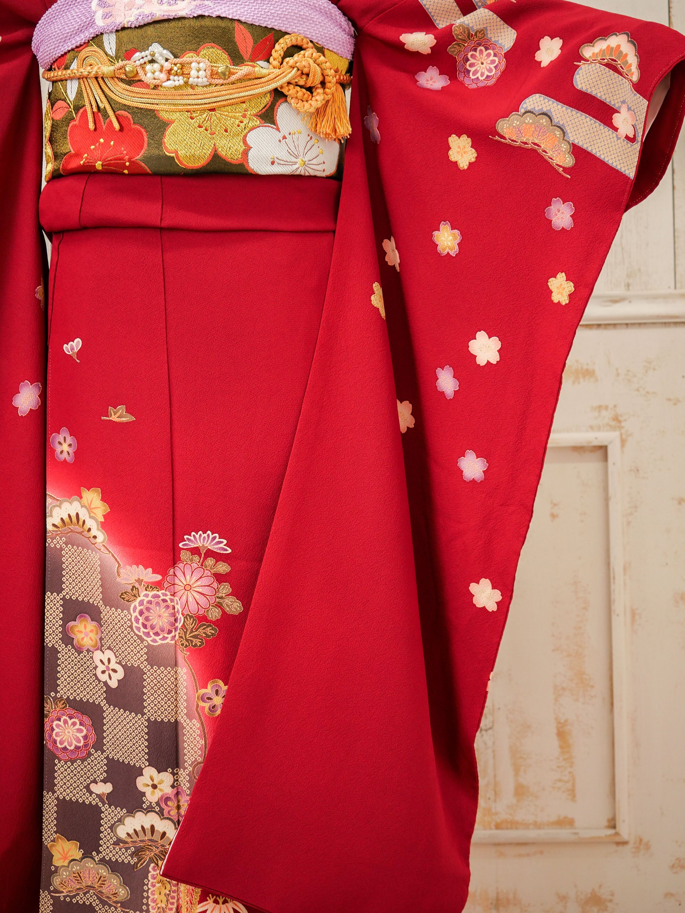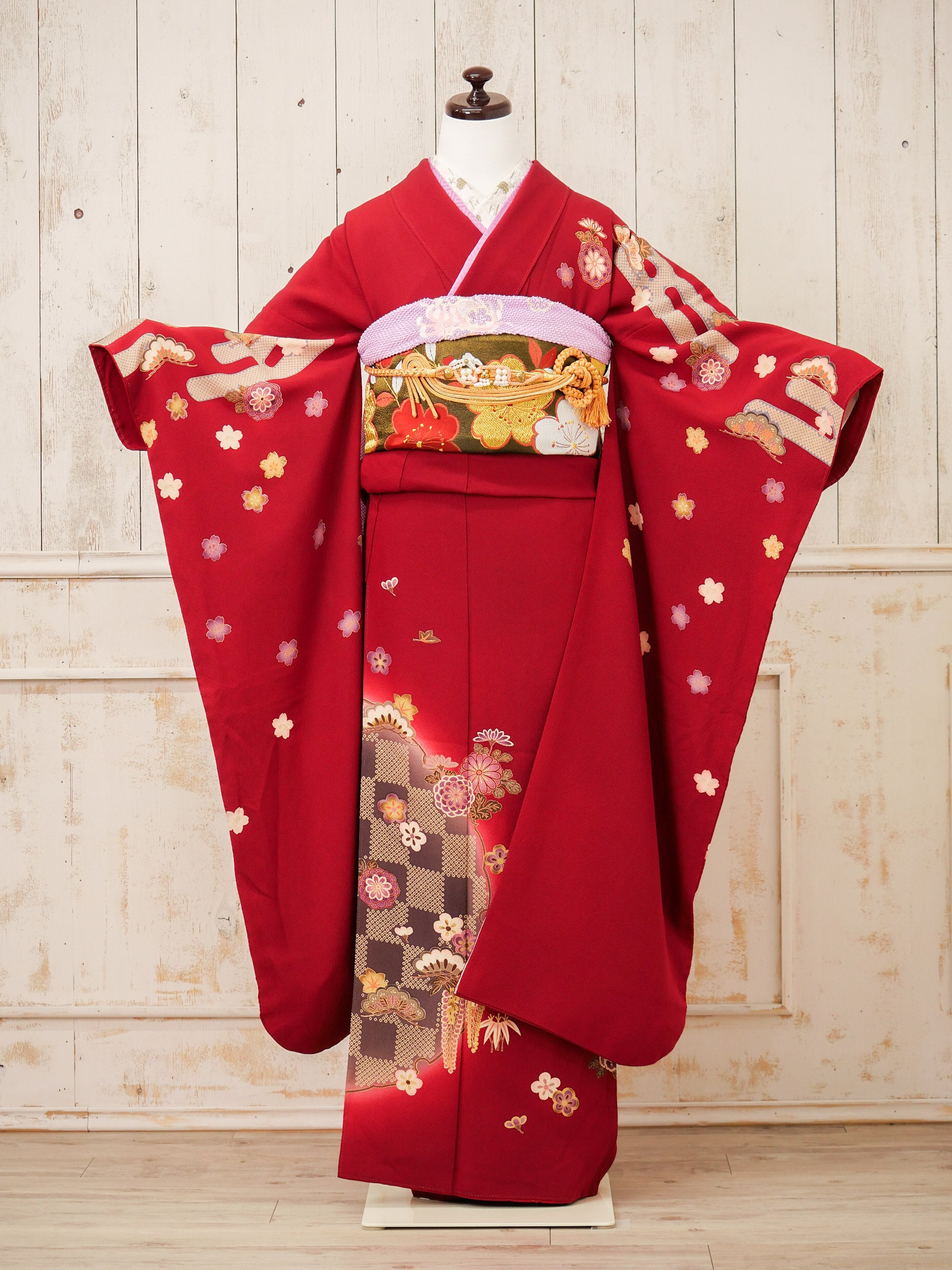 深紅の地に金糸を織り込んだ古典文様が映える格式高い振袖。裾にかけての市松文様や花柄が、伝統美を強く感じさせます。華やかでありながら落ち着きのある意匠は、成人式や慶びの席で気品ある存在感を放ちます。