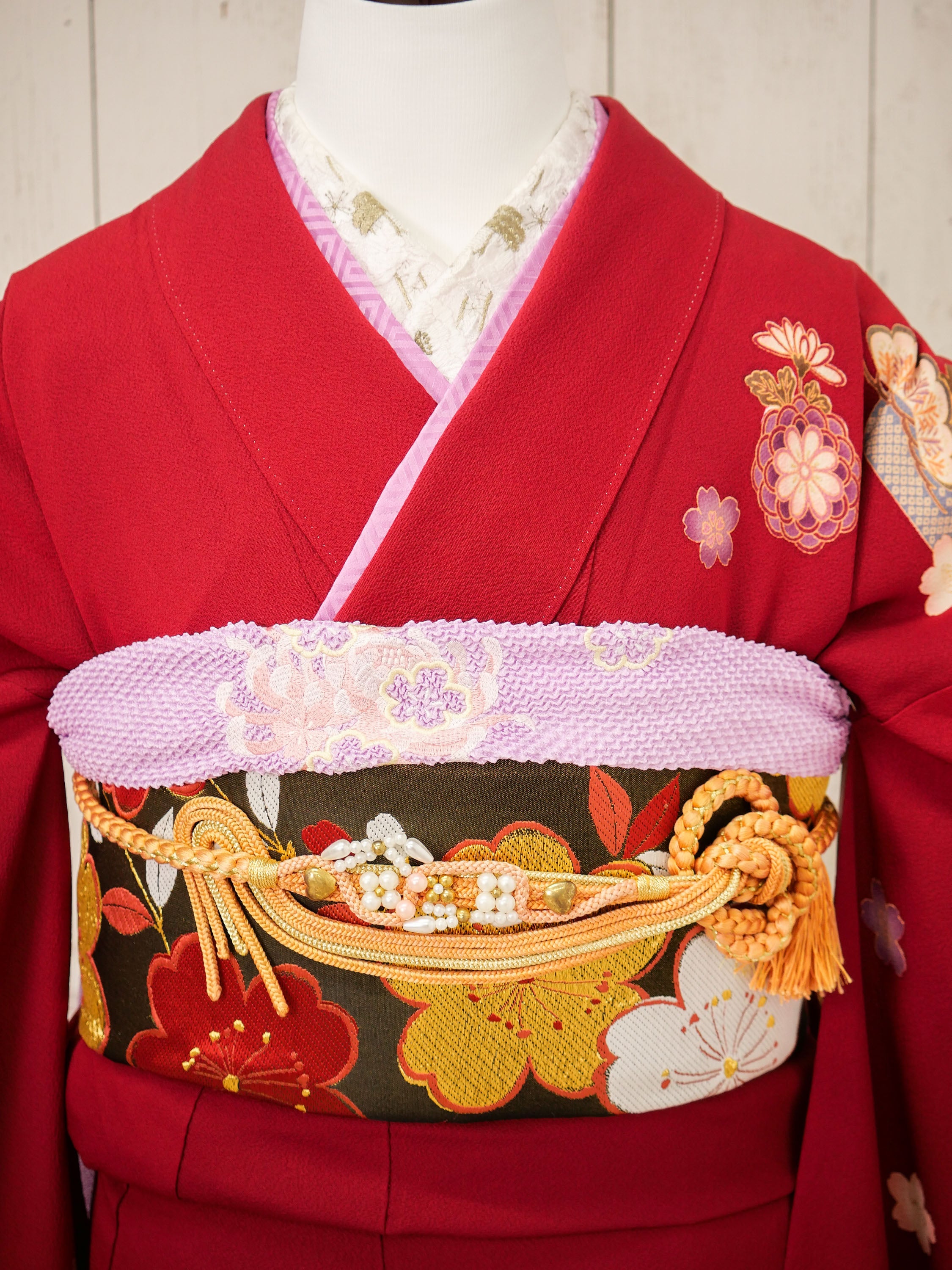 中振袖、袋帯、長襦袢(半襟付き、ポリエステル)、重ね衿(着物に縫い付けの商品あり)、帯揚げ、帯締め、ショール、腰紐5本、伊達締め2本、衿芯、前板、後板、帯枕(ガーゼ付き)、コーリンベルト1本、三重紐、草履、バッグ