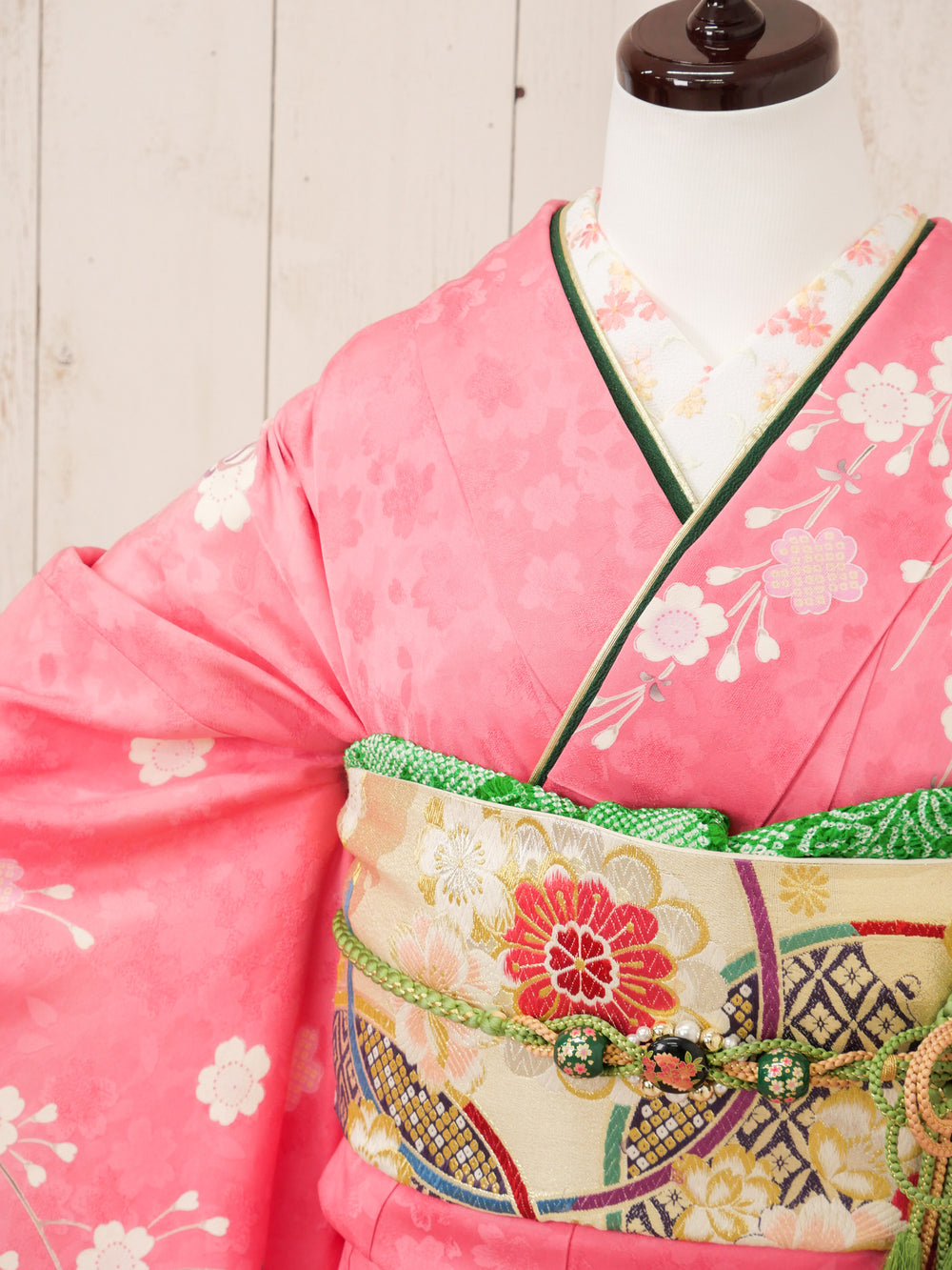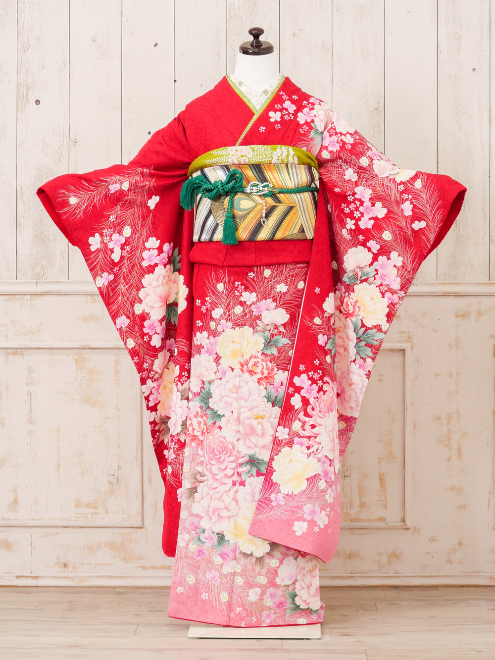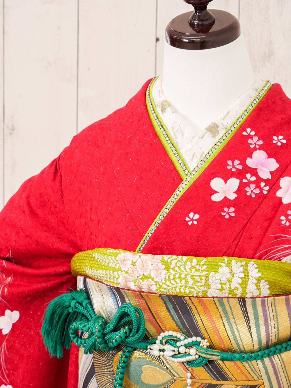 中振袖、袋帯、長襦袢(半襟付き、ポリエステル)、重ね衿(着物に縫い付けの商品あり)、帯揚げ、帯締め、ショール、腰紐5本、伊達締め2本、衿芯、前板、後板、帯枕(ガーゼ付き)、コーリンベルト1本、三重紐、草履、バッグ