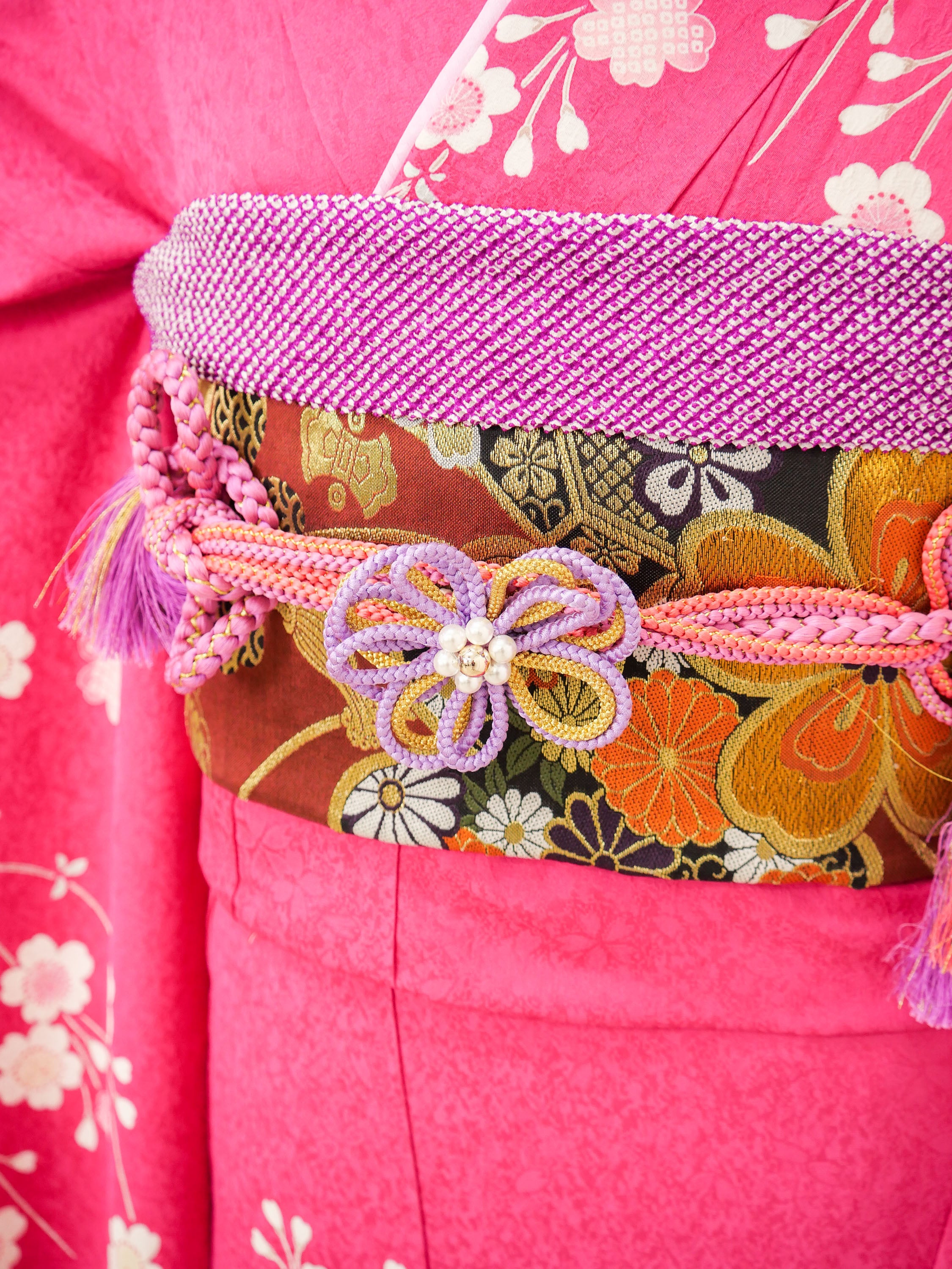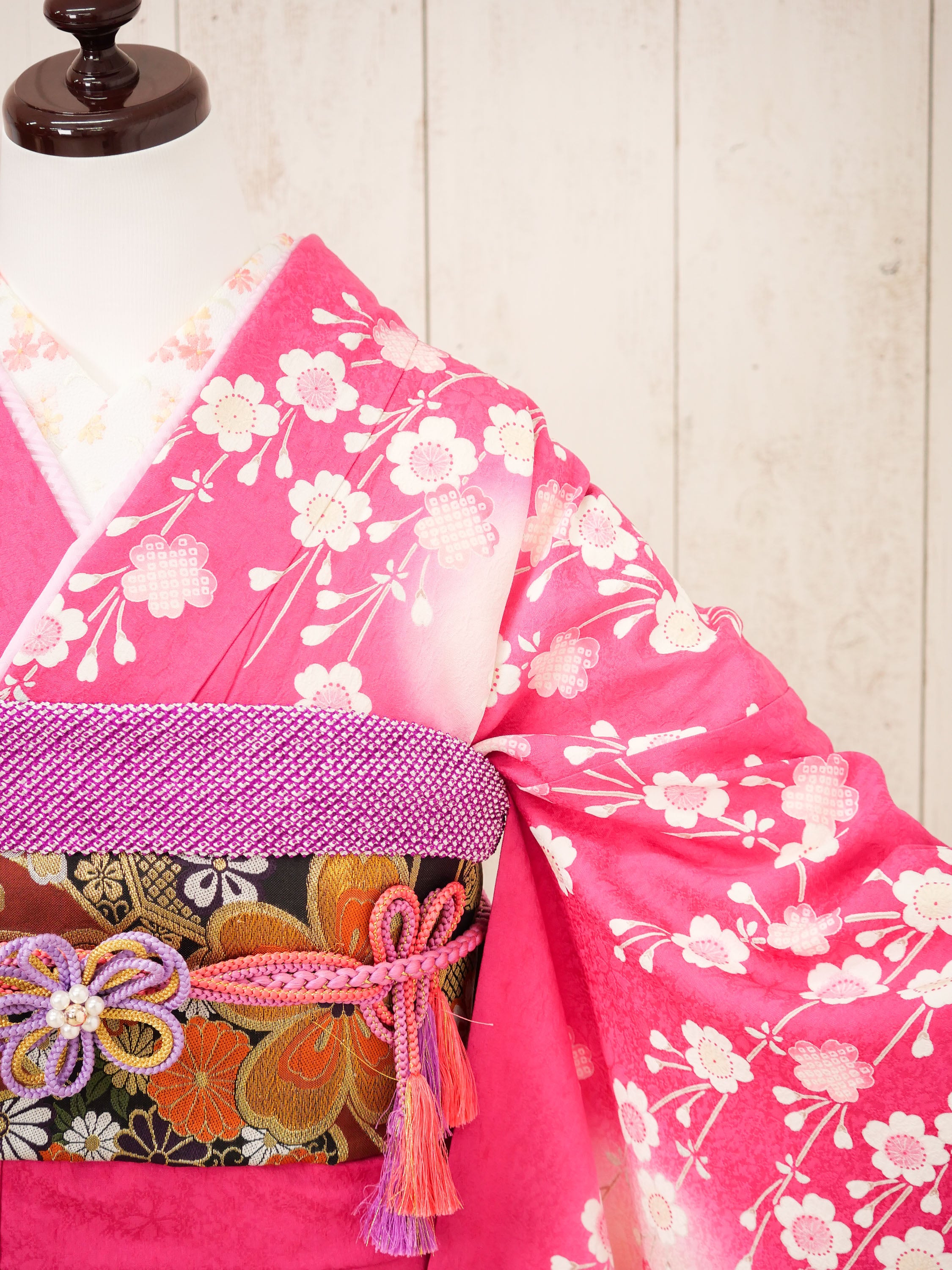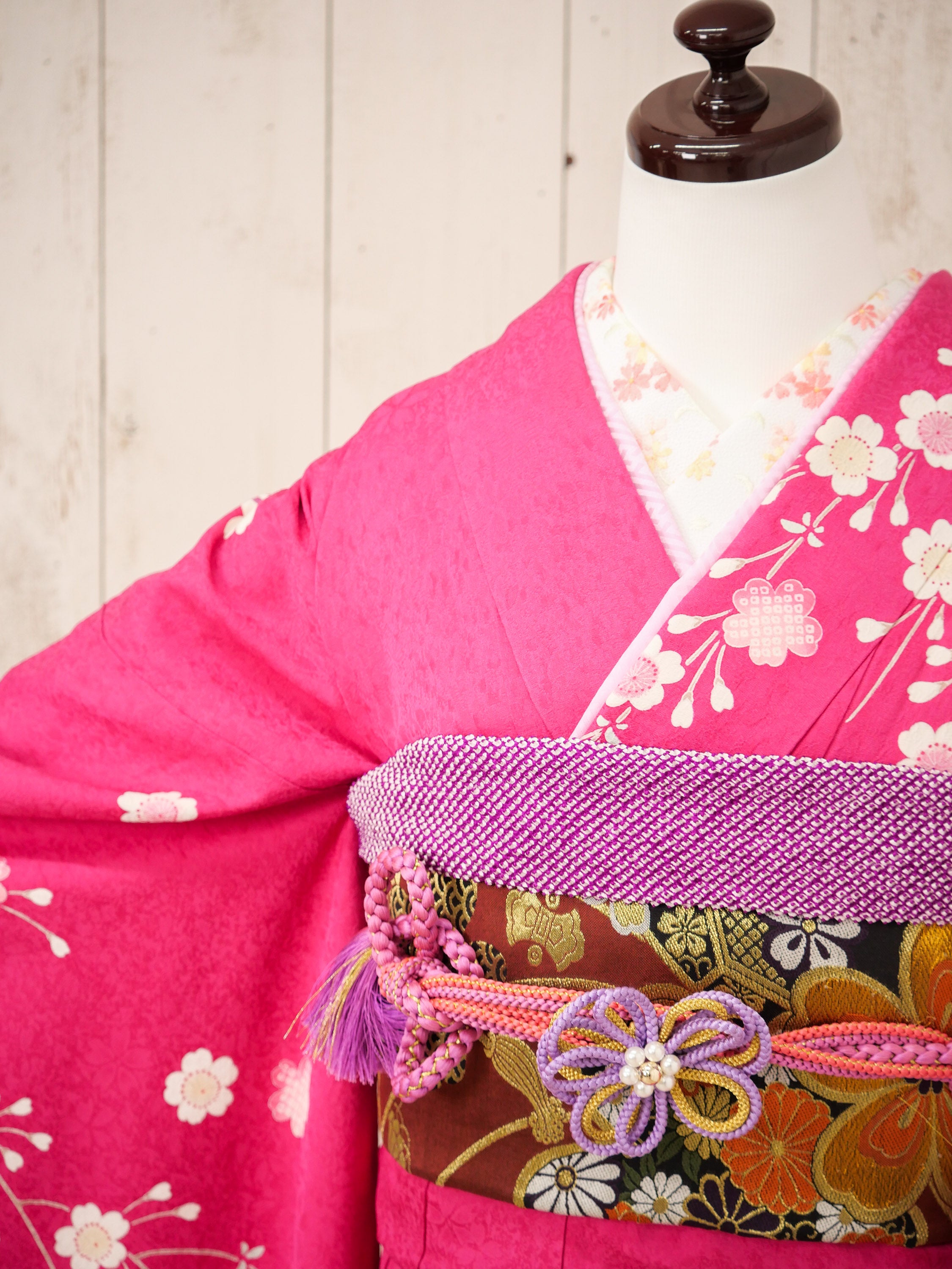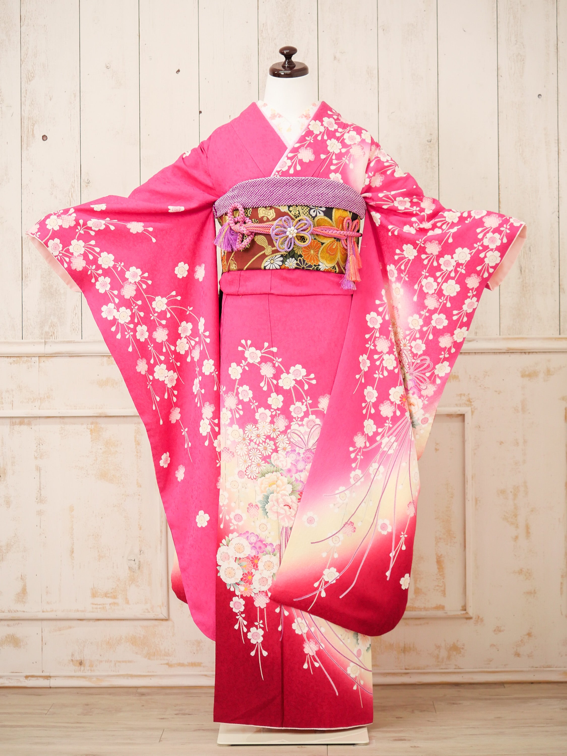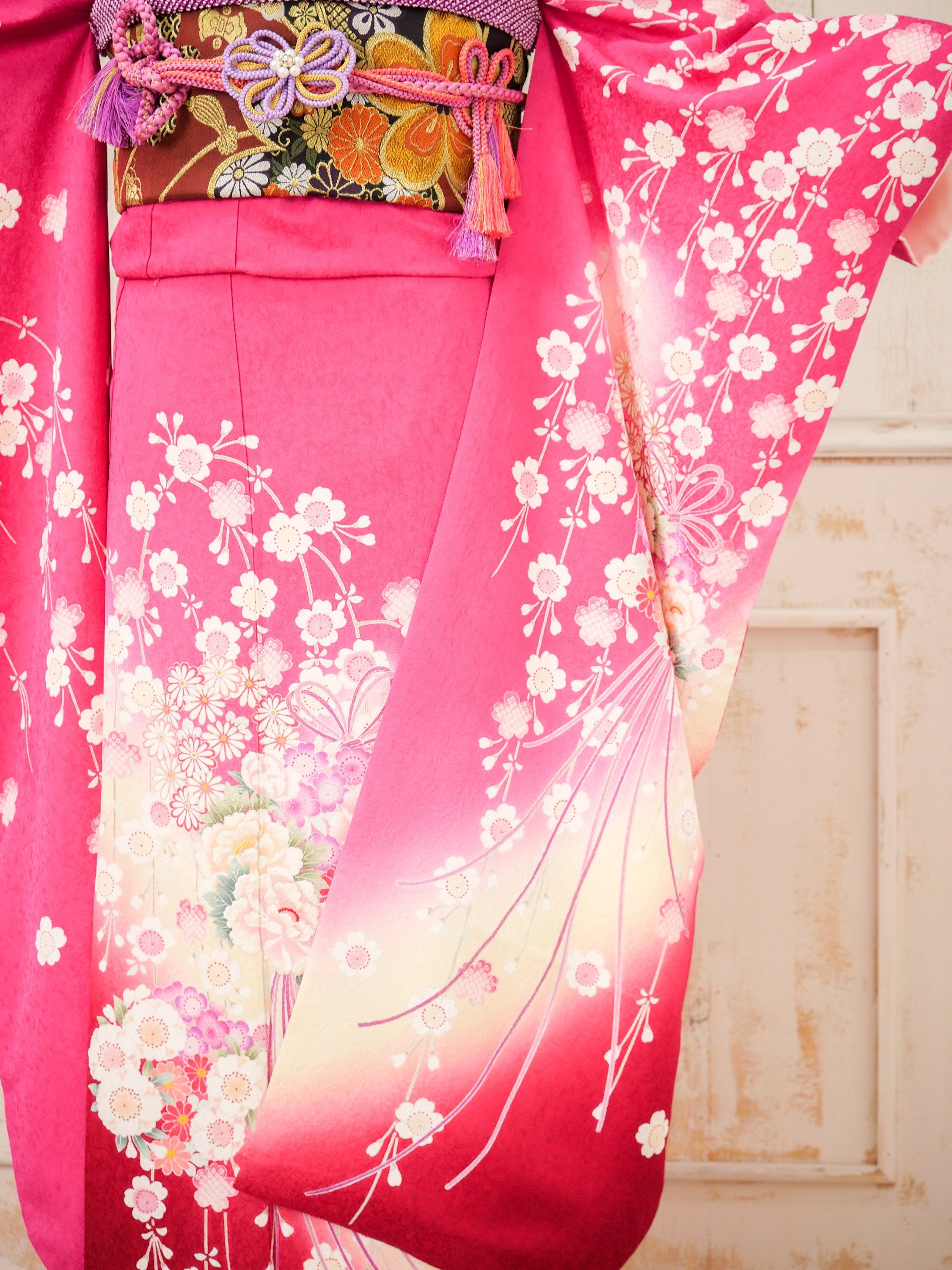 鮮やかなローズピンクに白い桜が舞う、華やかでロマンチックな一枚。流れるような柄の配置がスタイルを美しく魅せ、愛らしさと上品さを兼ね備えた印象に。