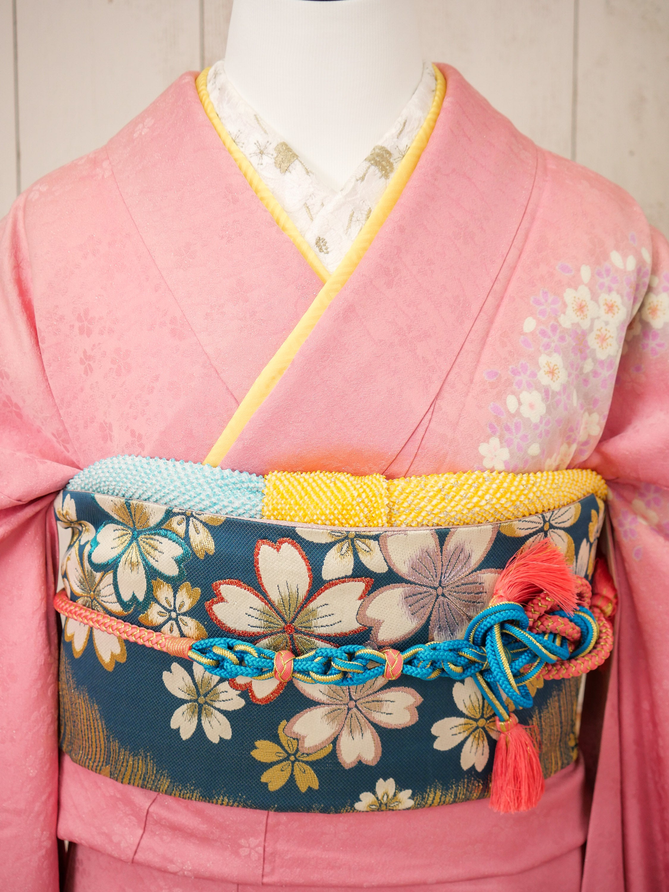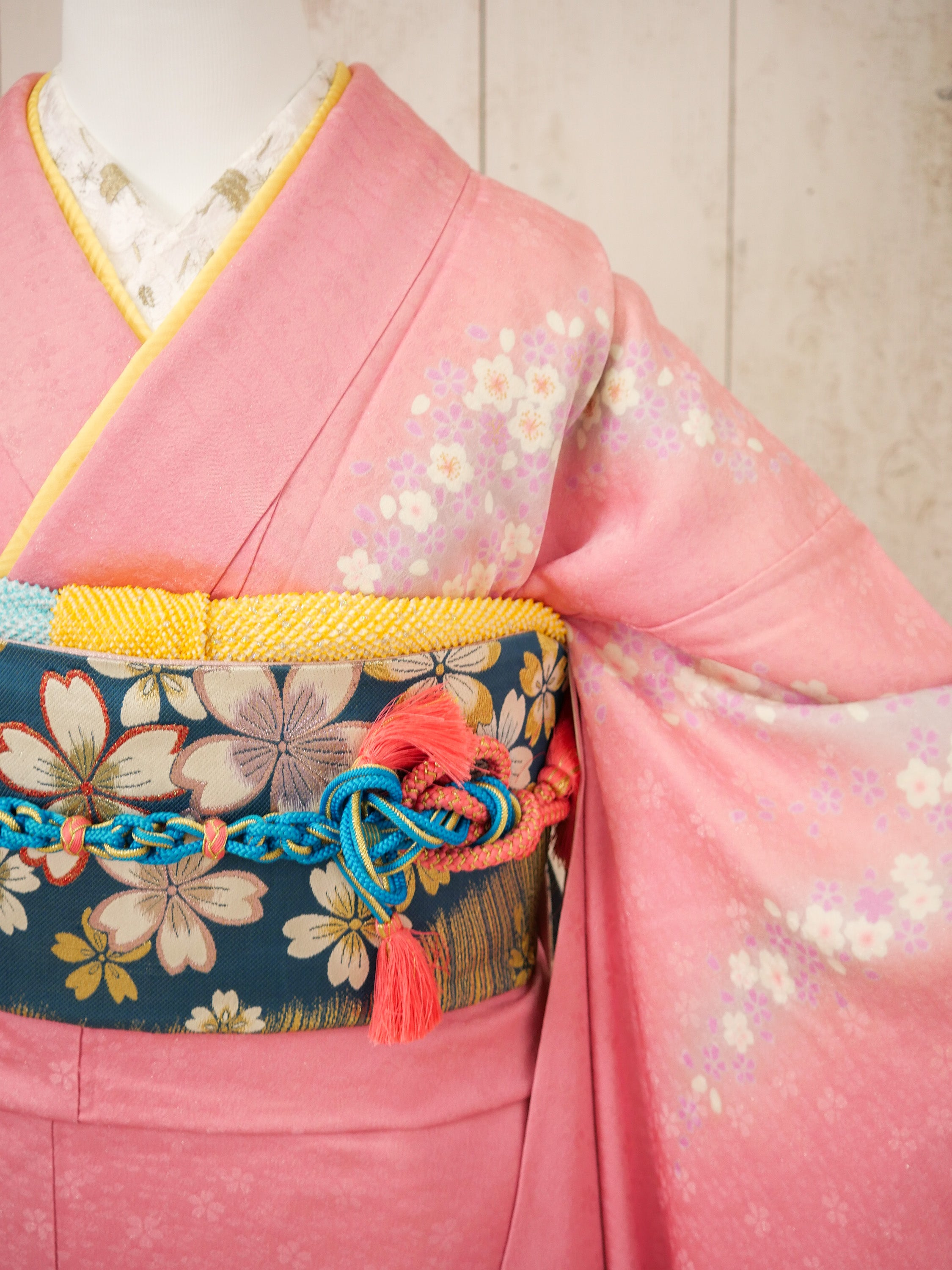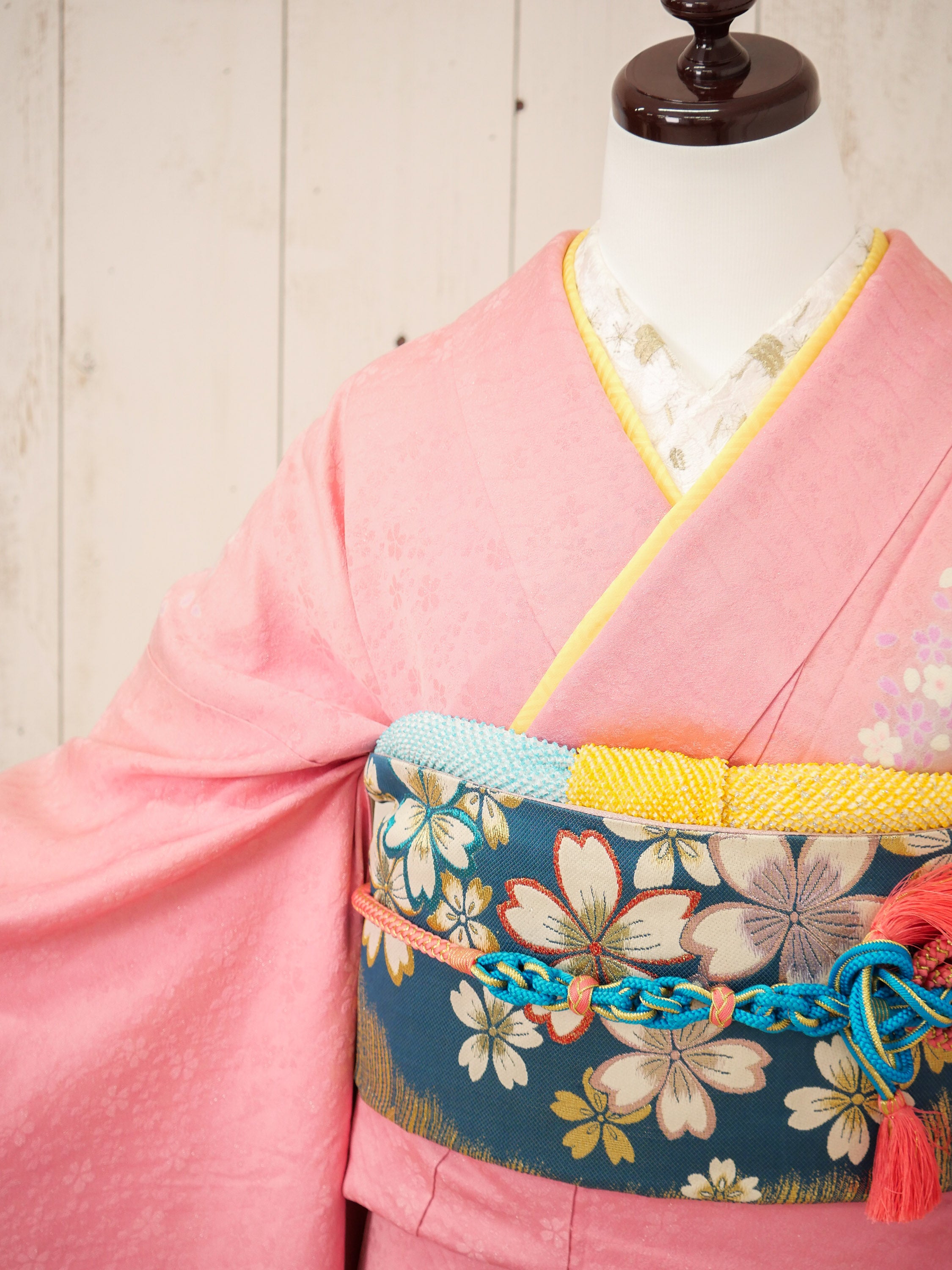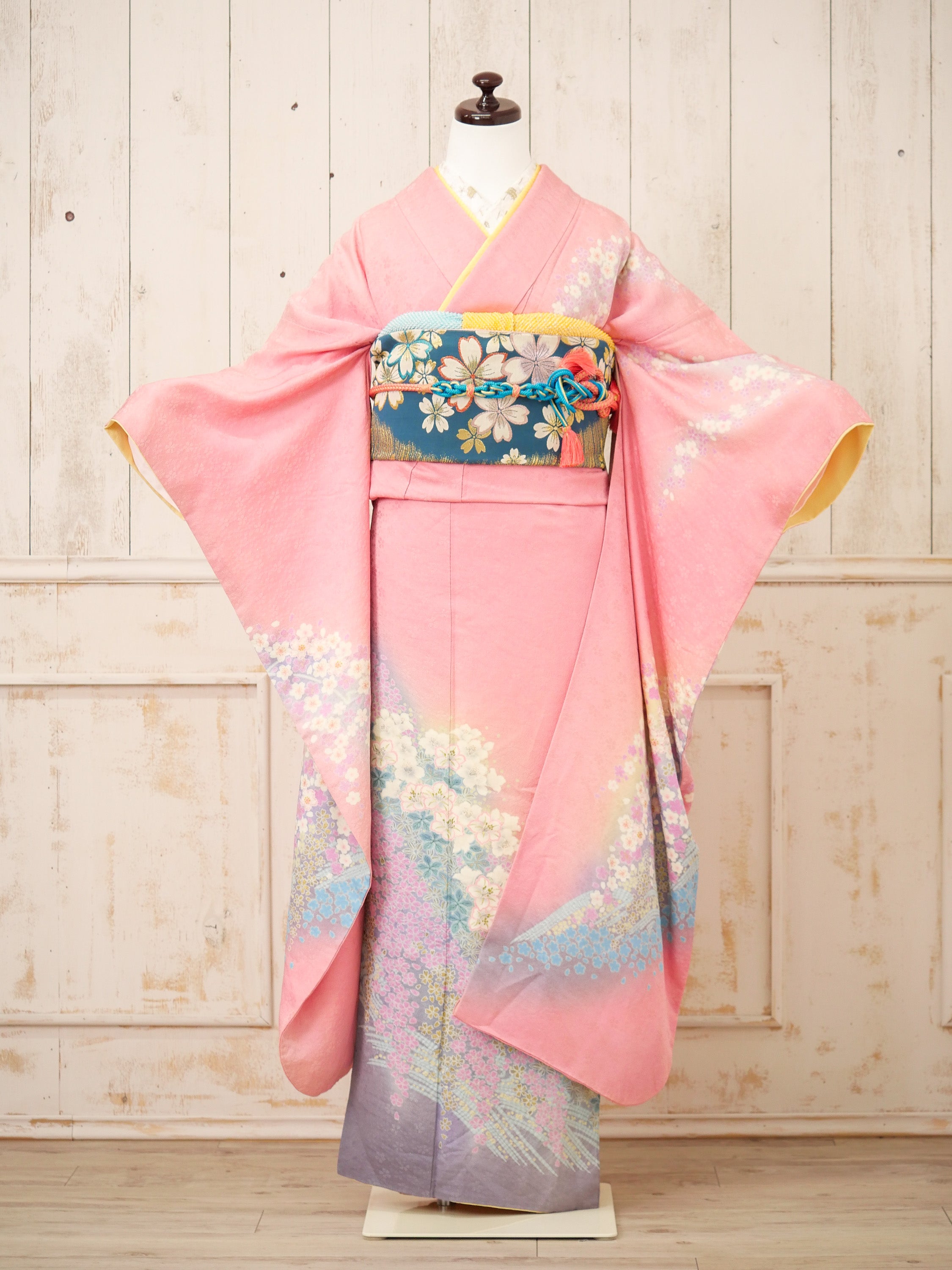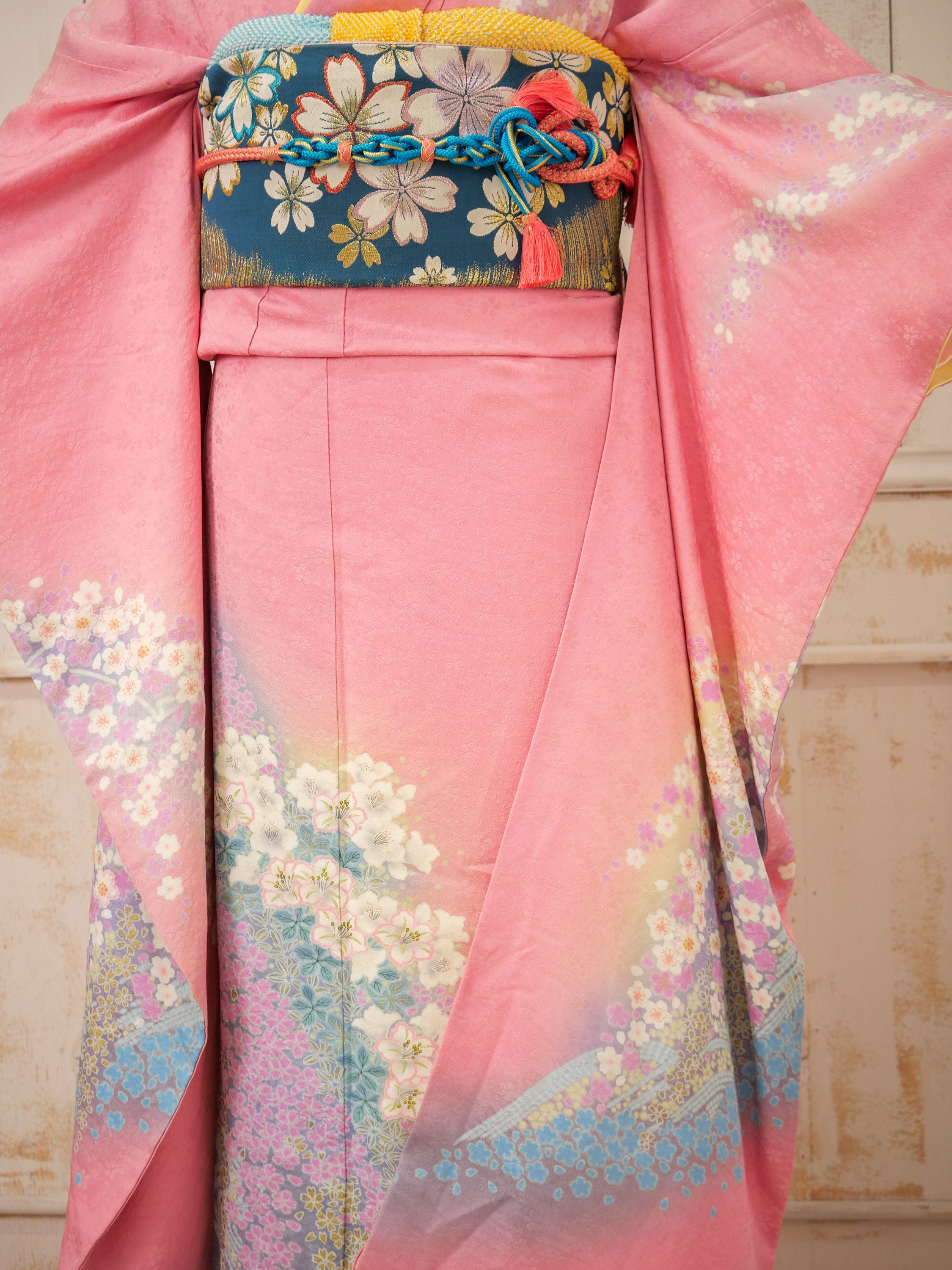 ふんわりとしたピンクの地に、水彩画のような桜や花々が描かれた優美なデザイン。柔らかく優しい印象を与える、ナチュラルフェミニンな一着です。