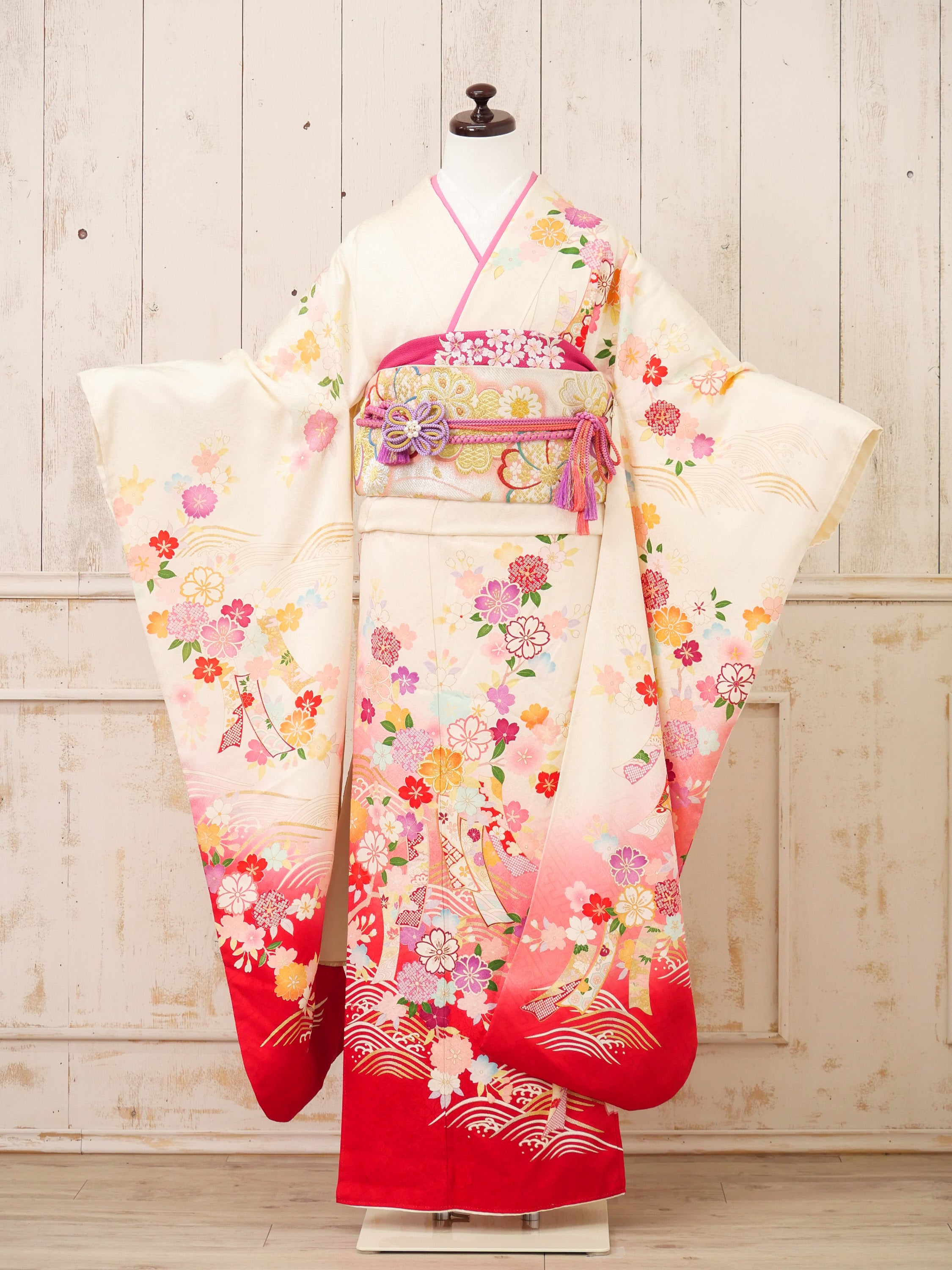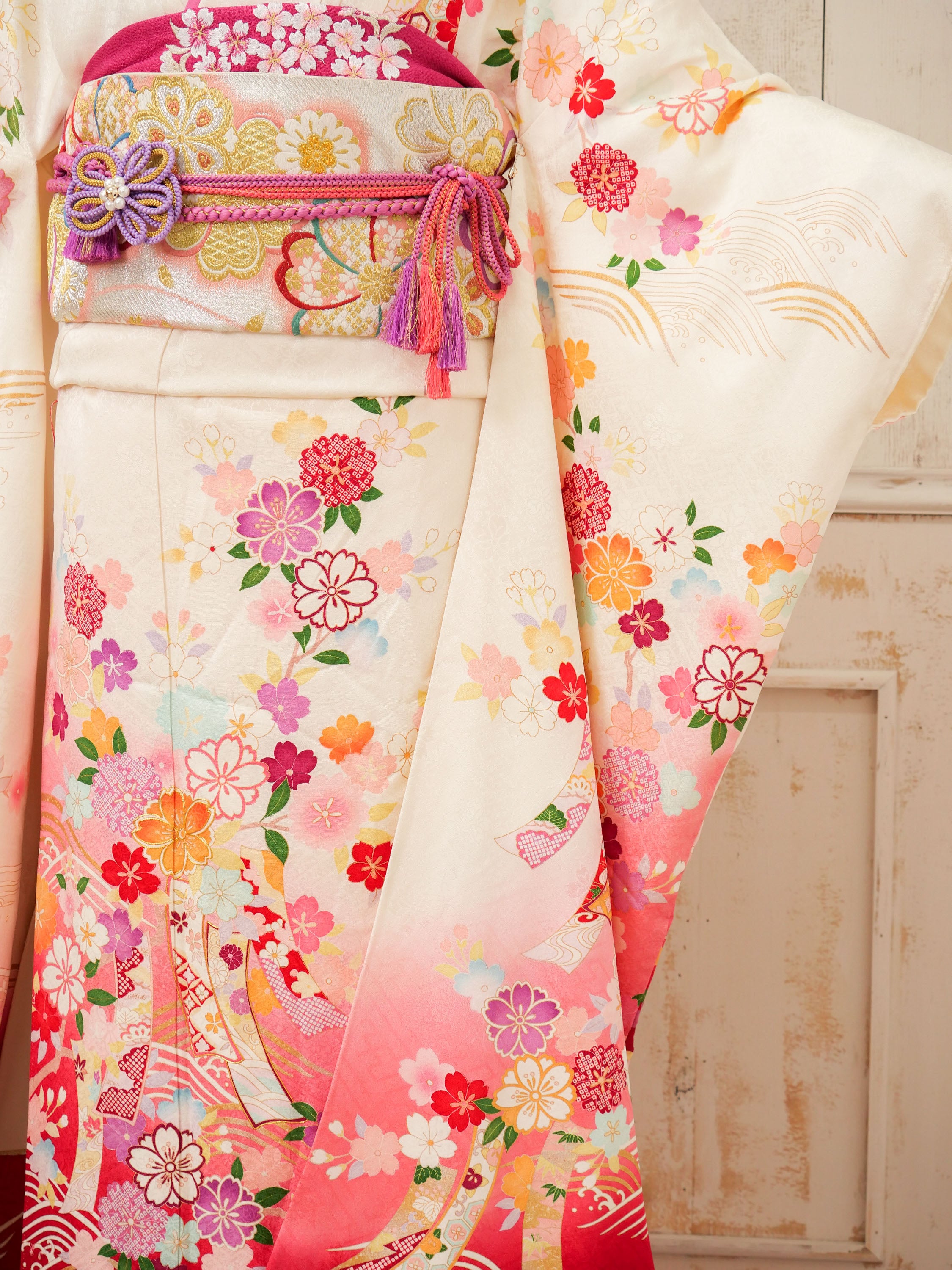 クリーム地に赤のグラデーションが華やかに広がり、和のモチーフが可憐に散りばめられた一枚。お祝いの場にふさわしい華やかさです。