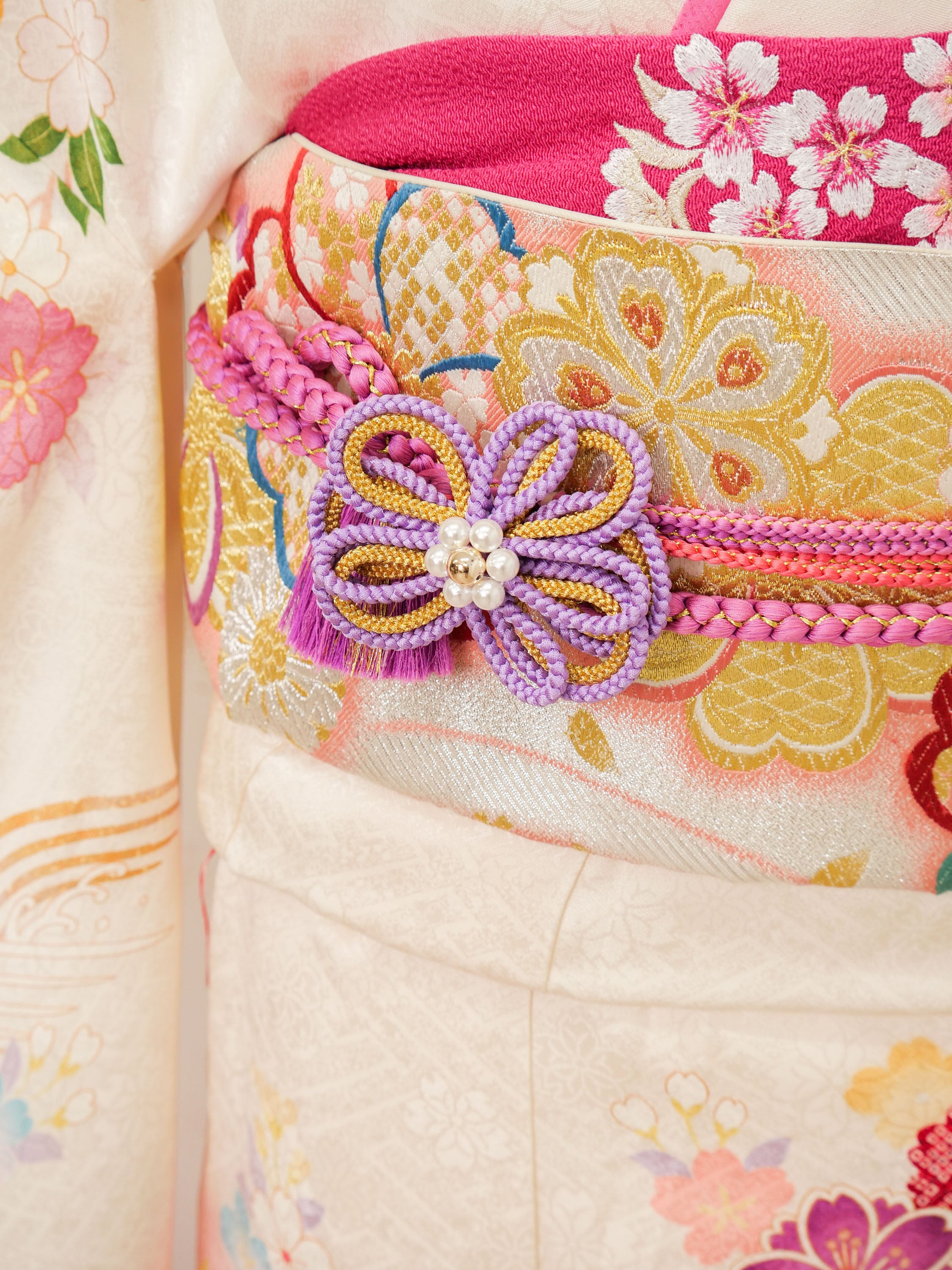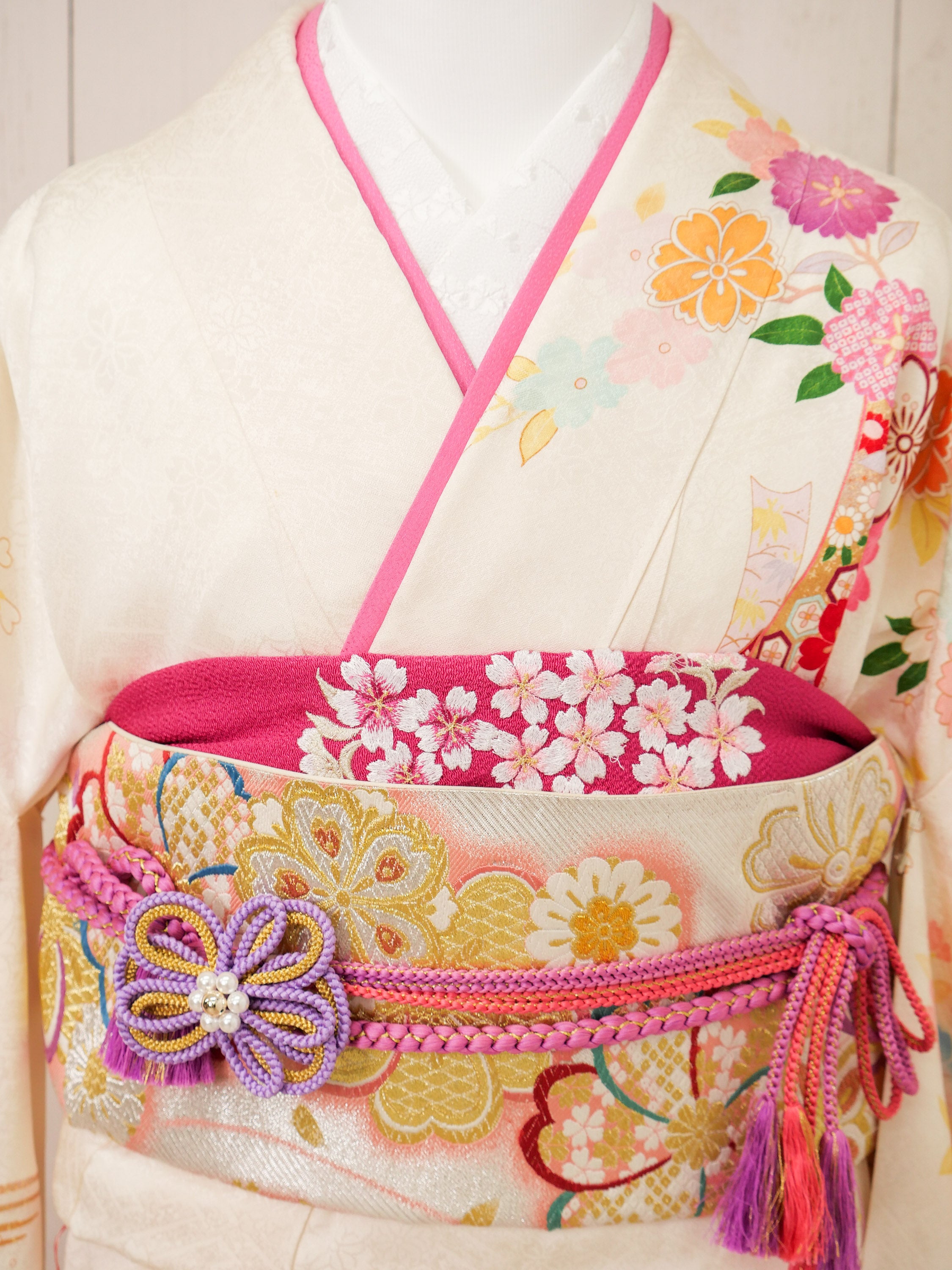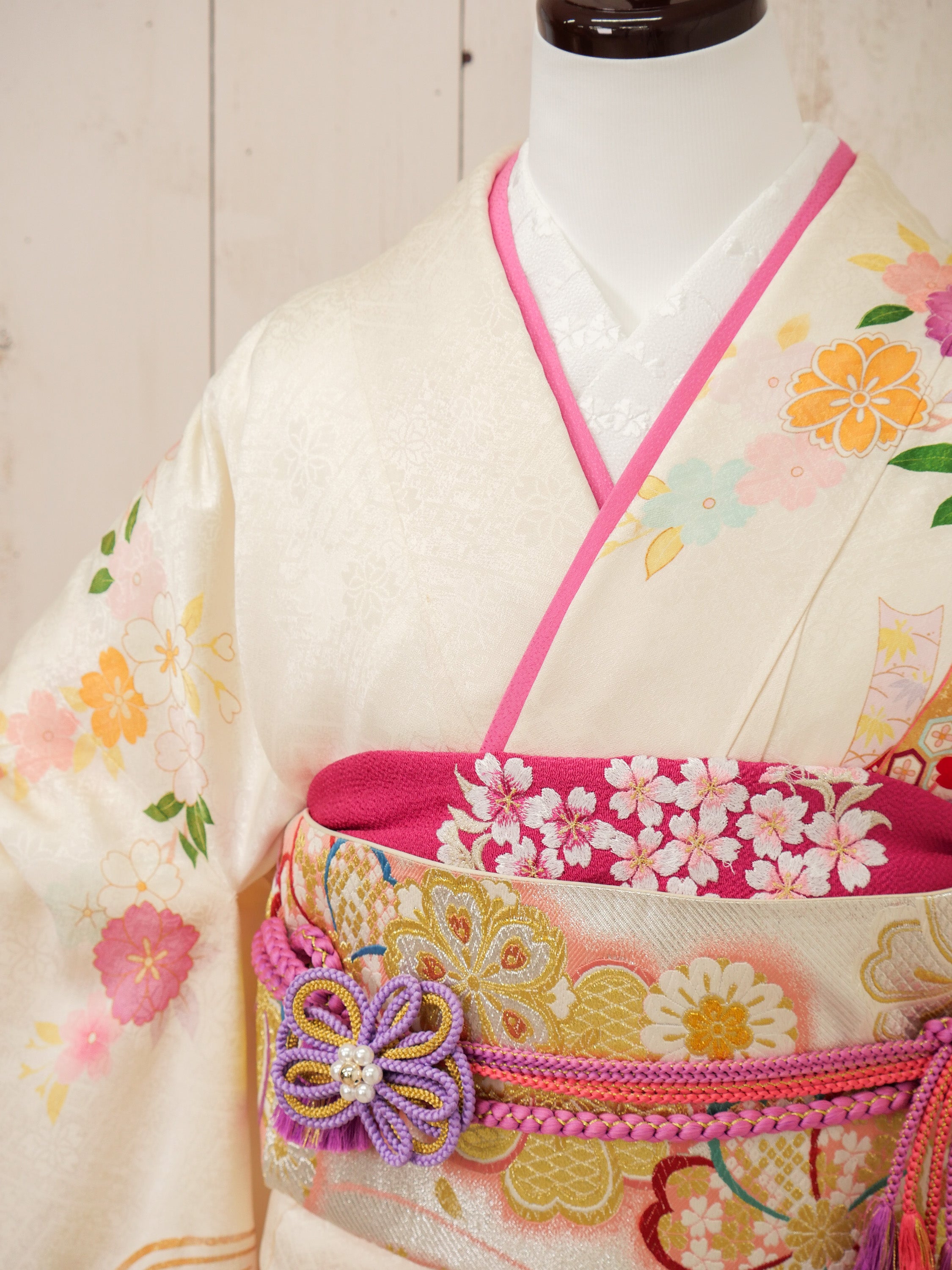 中振袖、袋帯、長襦袢(半襟付き、ポリエステル)、重ね衿(着物に縫い付けの商品あり)、帯揚げ、帯締め、ショール、腰紐5本、伊達締め2本、衿芯、前板、後板、帯枕(ガーゼ付き)、コーリンベルト1本、三重紐、草履、バッグ