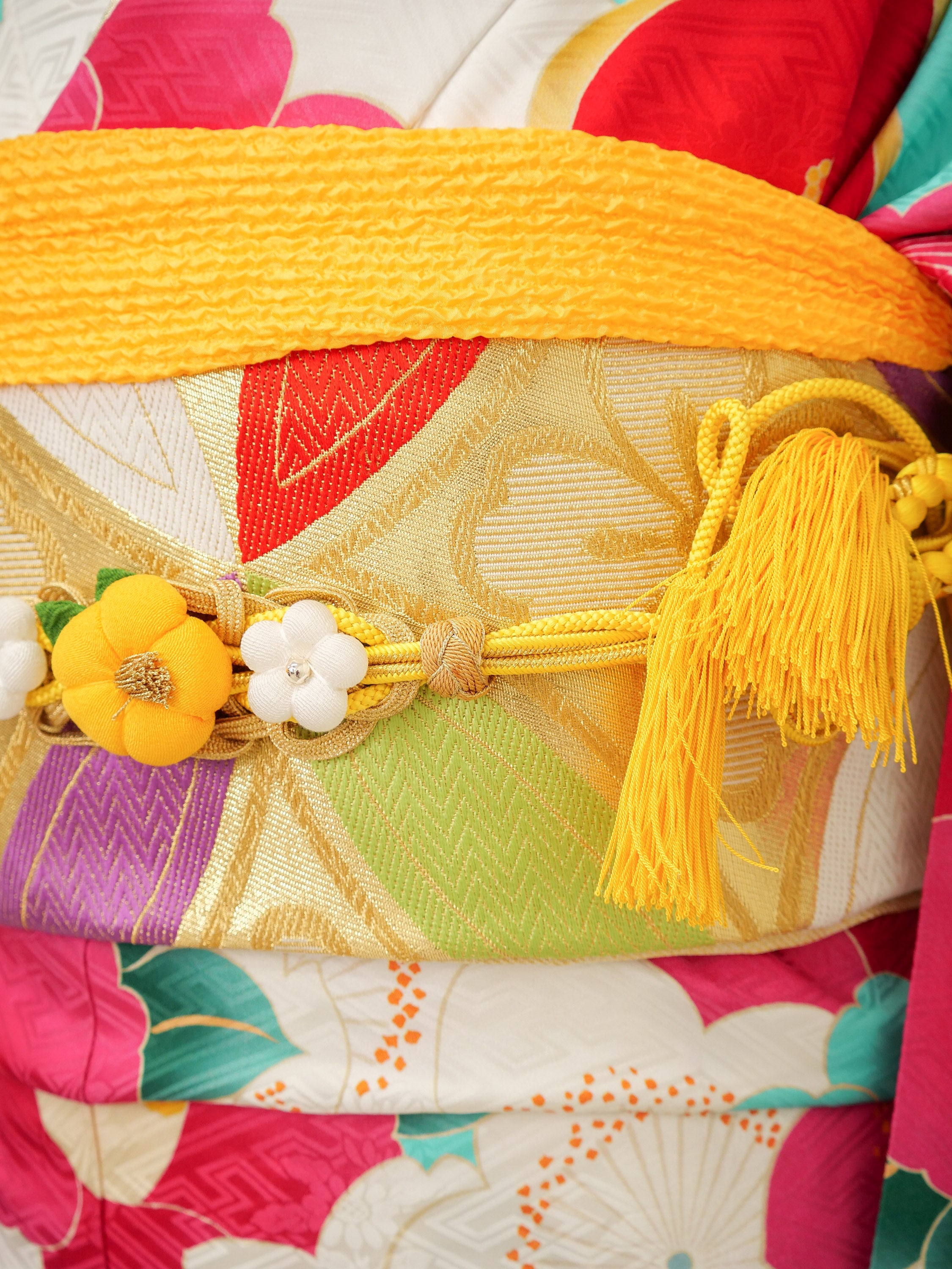 中振袖、袋帯、長襦袢(半襟付き、ポリエステル)、重ね衿(着物に縫い付けの商品あり)、帯揚げ、帯締め、ショール、腰紐5本、伊達締め2本、衿芯、前板、後板、帯枕(ガーゼ付き)、コーリンベルト1本、三重紐、草履、バッグ