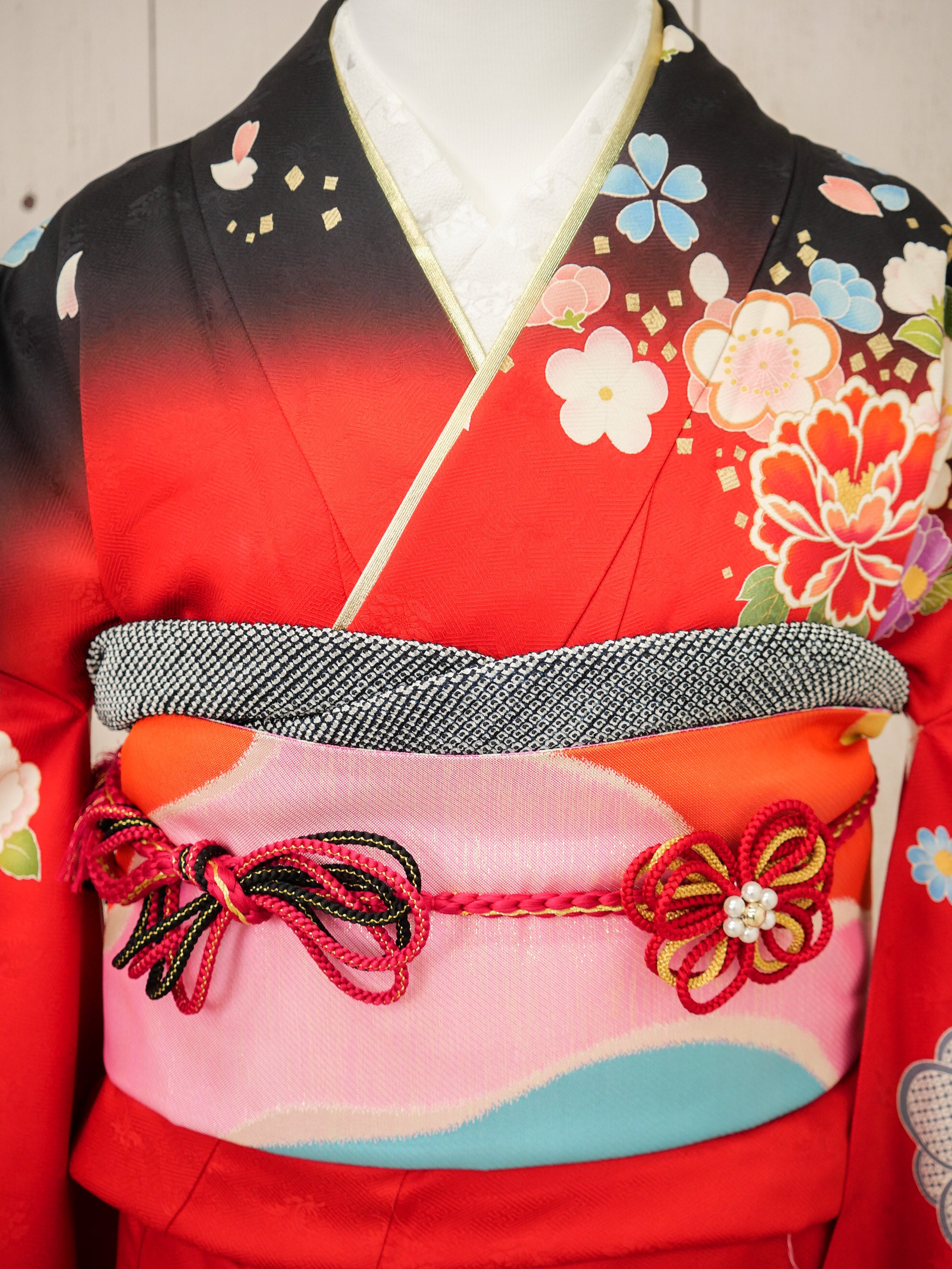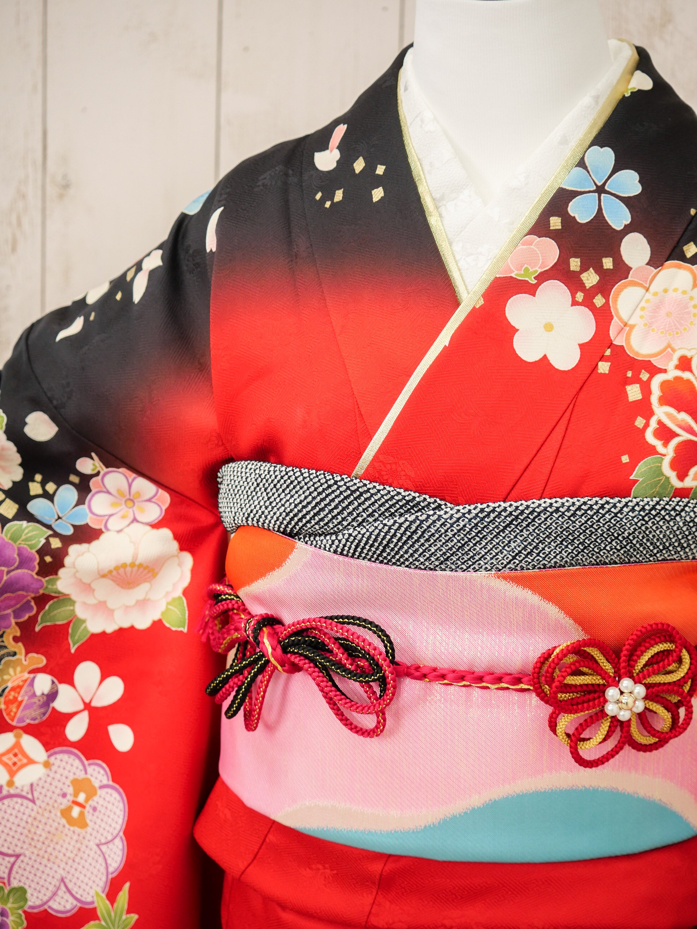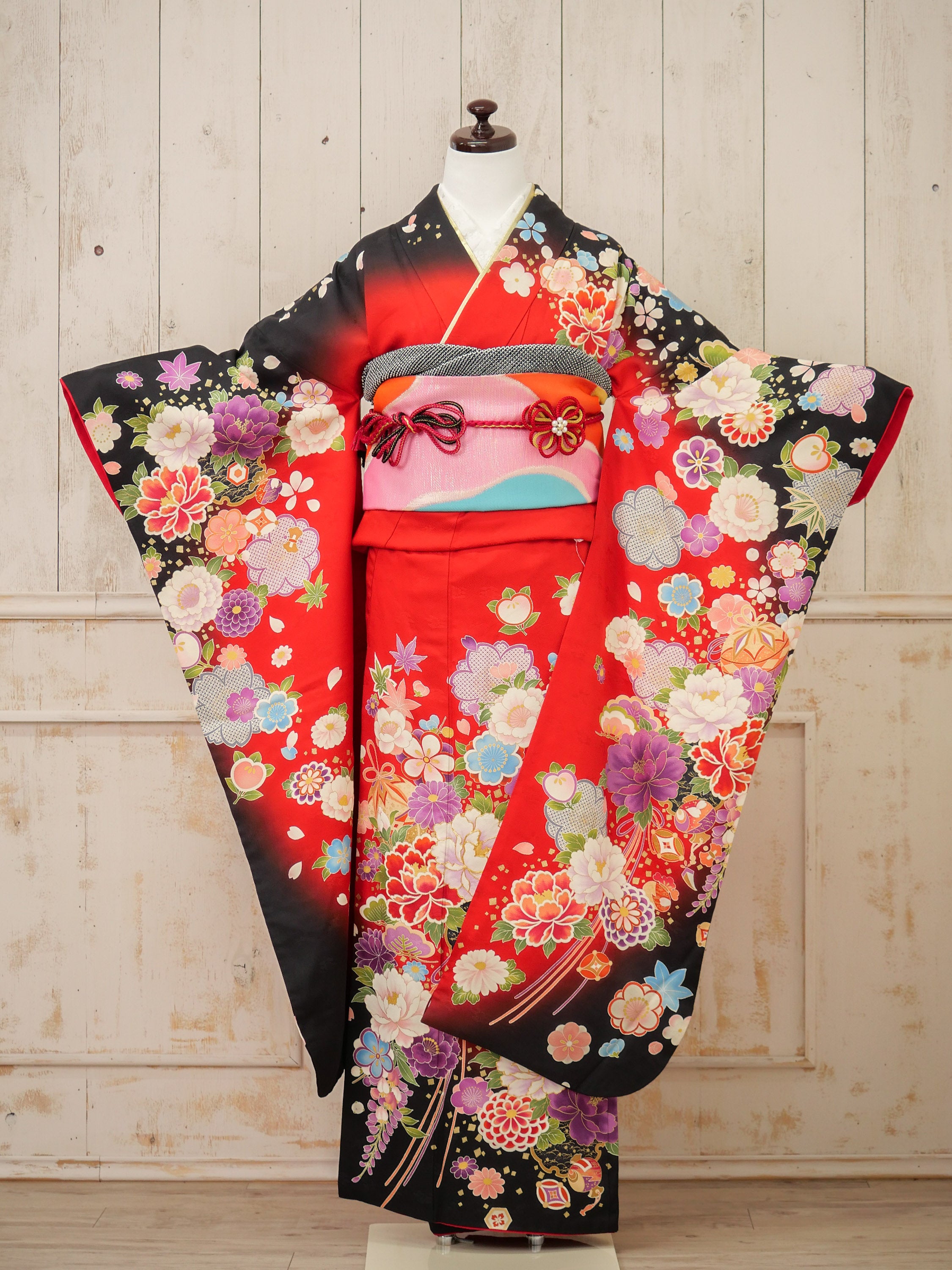 赤と黒のコントラストが鮮やかな振袖。咲き誇る牡丹や桜が艶やかに彩られ、華やかさと力強さを感じさせます。ピンクの帯揚げと赤の帯締めが可愛らしいアクセントに。個性を引き立てる華麗な一着です。