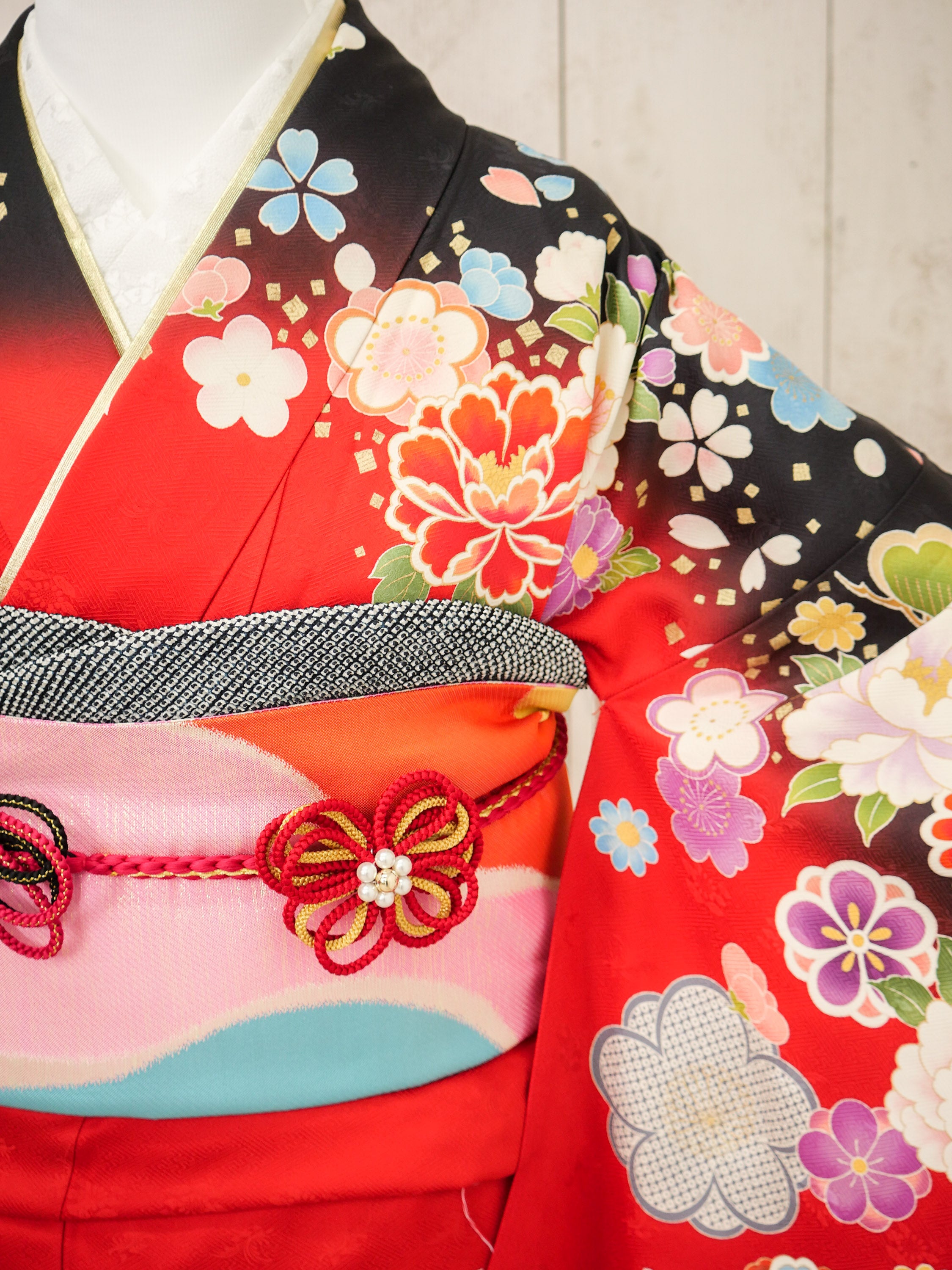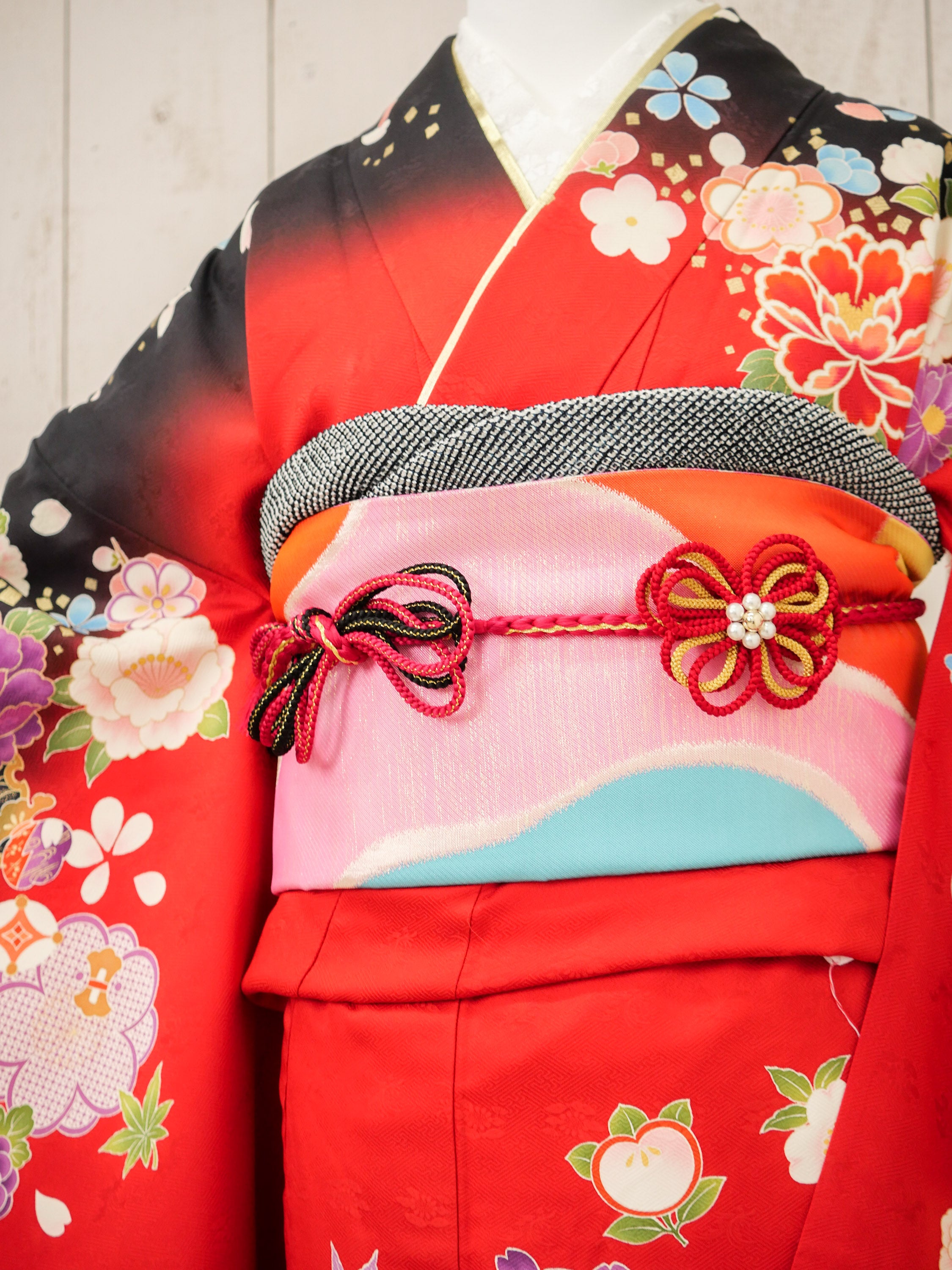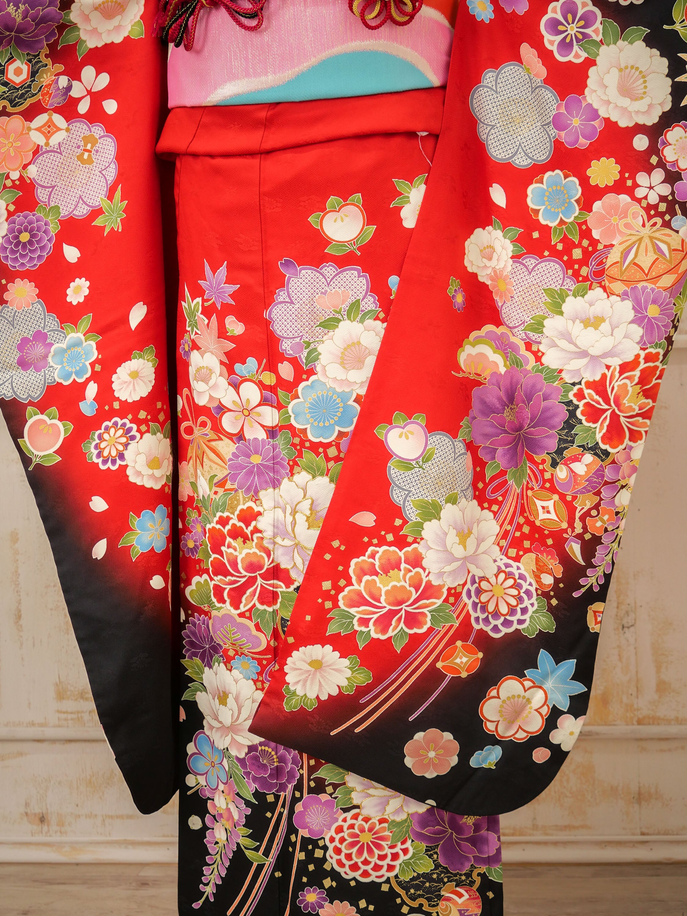 赤と黒のコントラストが鮮やかな振袖。咲き誇る牡丹や桜が艶やかに彩られ、華やかさと力強さを感じさせます。ピンクの帯揚げと赤の帯締めが可愛らしいアクセントに。個性を引き立てる華麗な一着です。