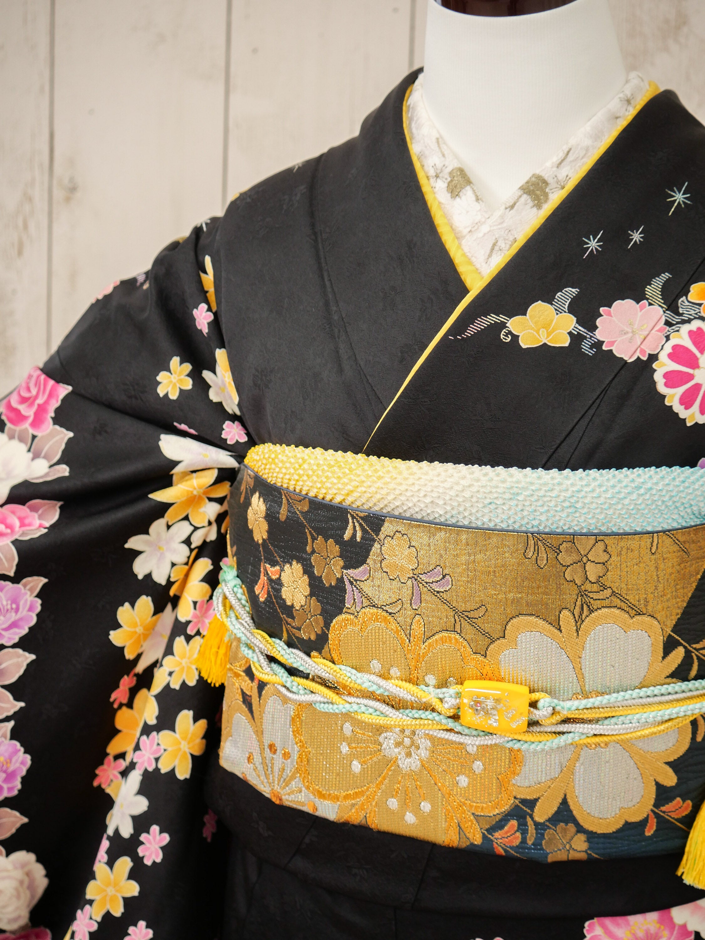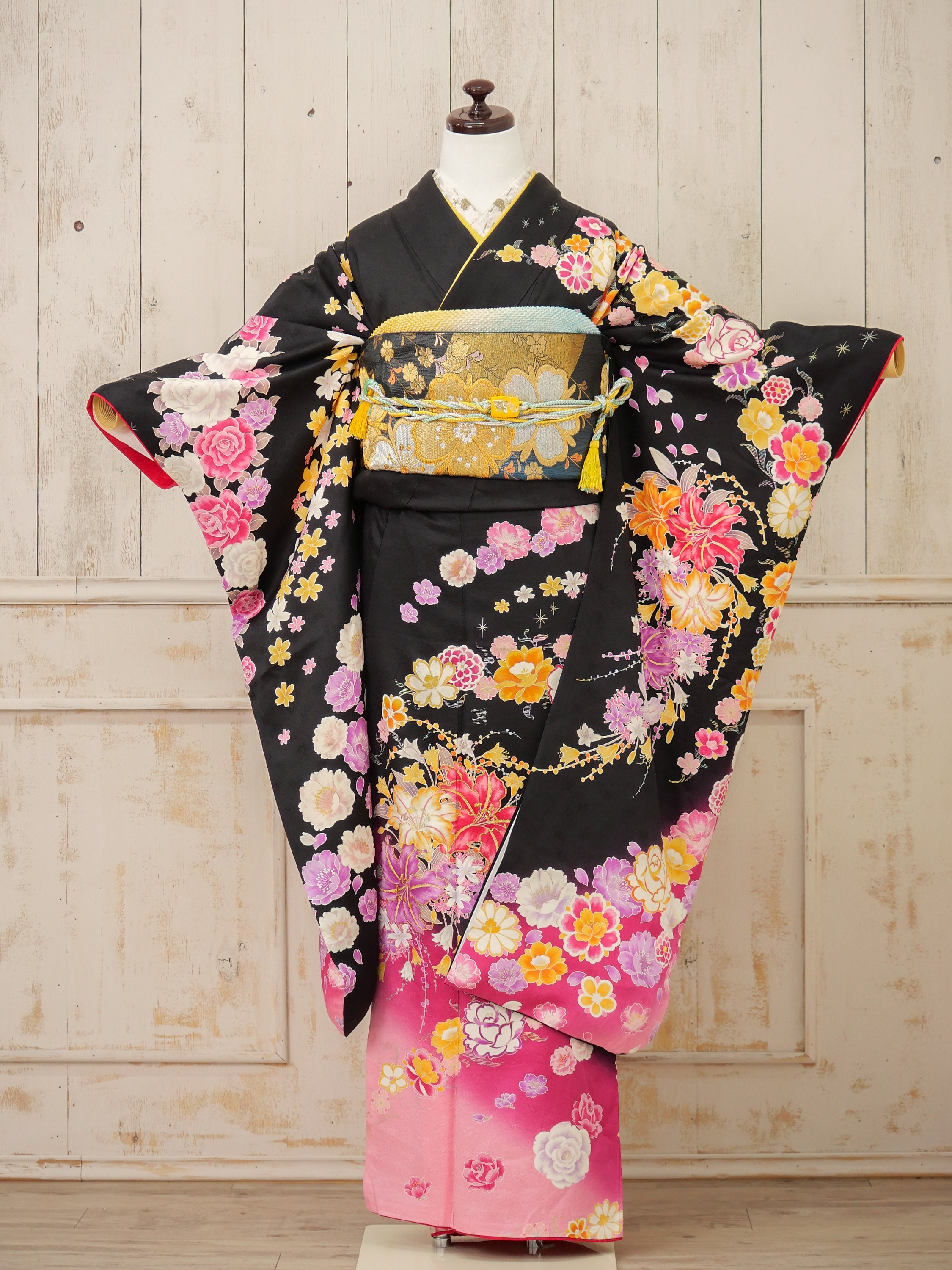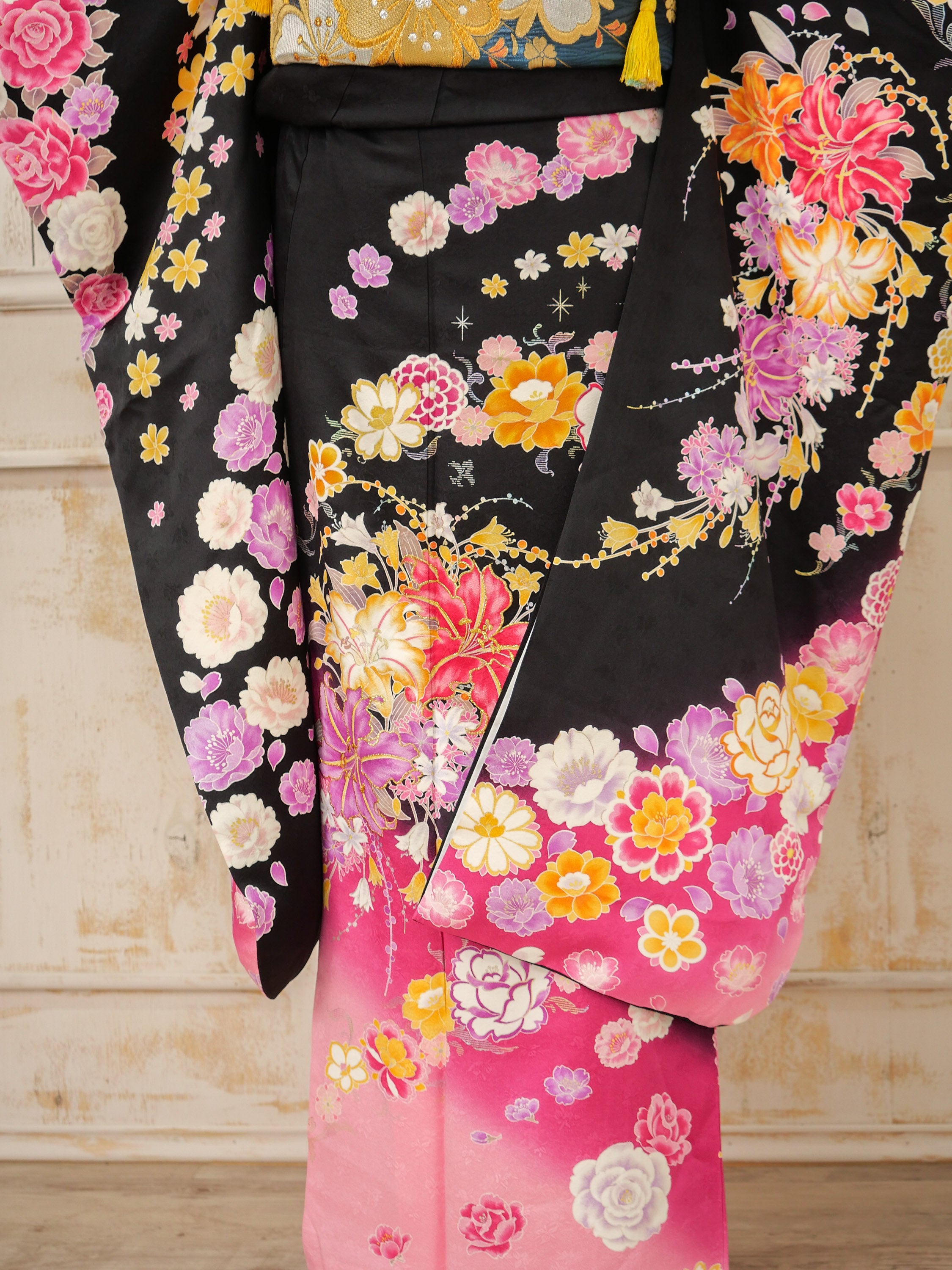 漆黒の地に咲き誇る大輪の花々が圧倒的な存在感を放つ振袖。金彩を織り込んだ帯が華やかさを添え、裾に向かうグラデーションのピンクが可憐さを演出します。気品と艶やかさを兼ね備え、成人式や特別な一日にふさわしい華やぎを纏える一着です。