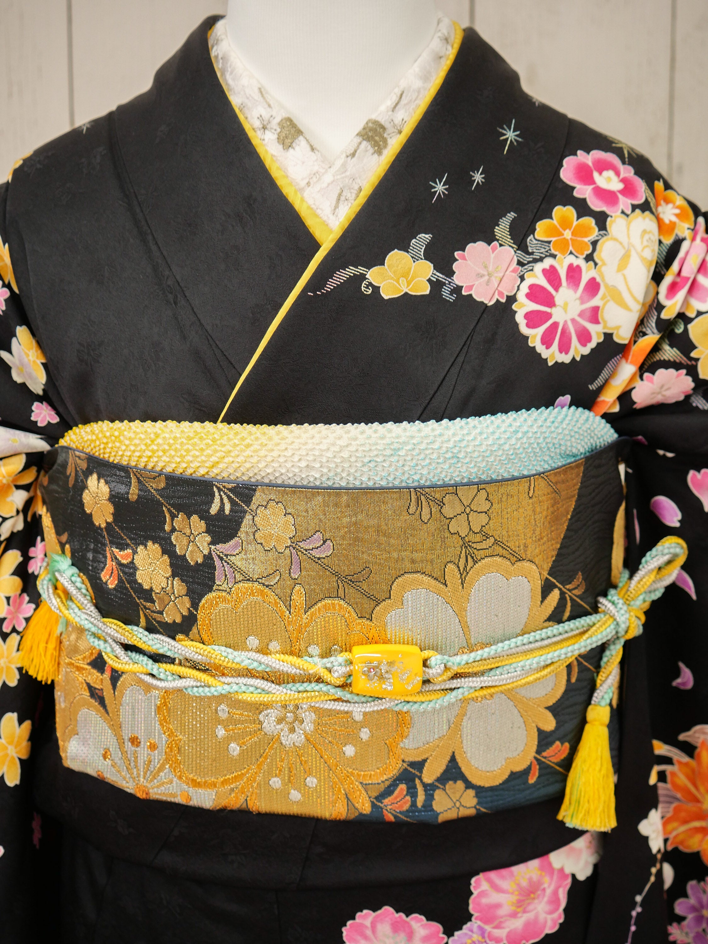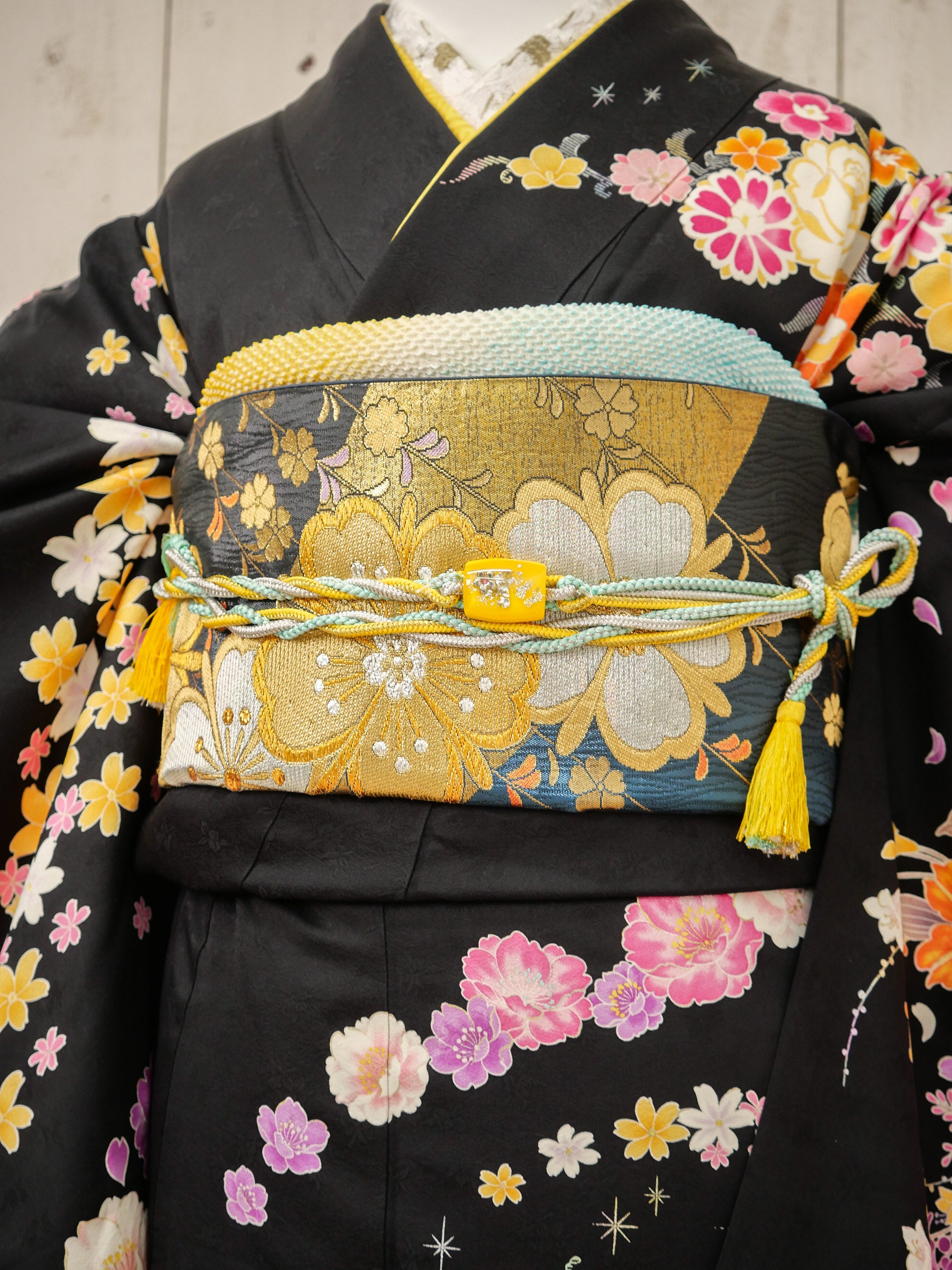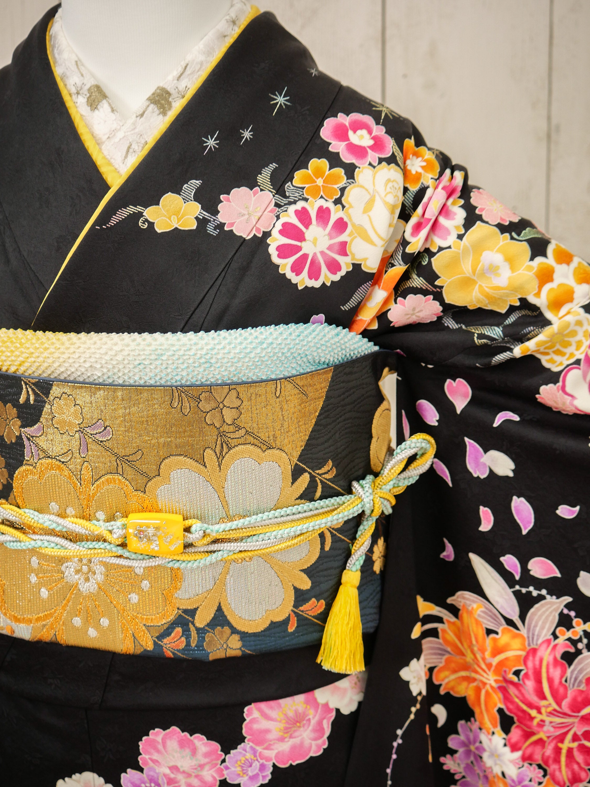 漆黒の地に咲き誇る大輪の花々が圧倒的な存在感を放つ振袖。金彩を織り込んだ帯が華やかさを添え、裾に向かうグラデーションのピンクが可憐さを演出します。気品と艶やかさを兼ね備え、成人式や特別な一日にふさわしい華やぎを纏える一着です。