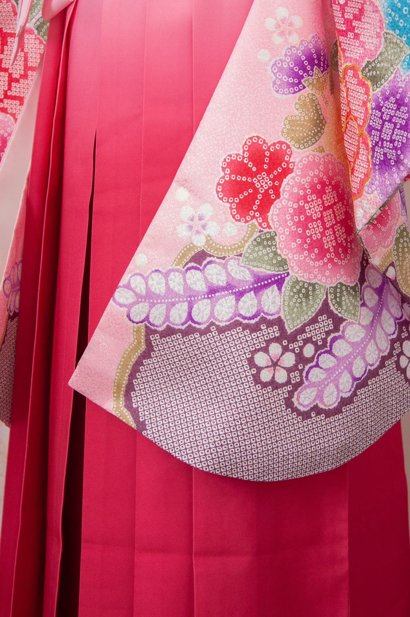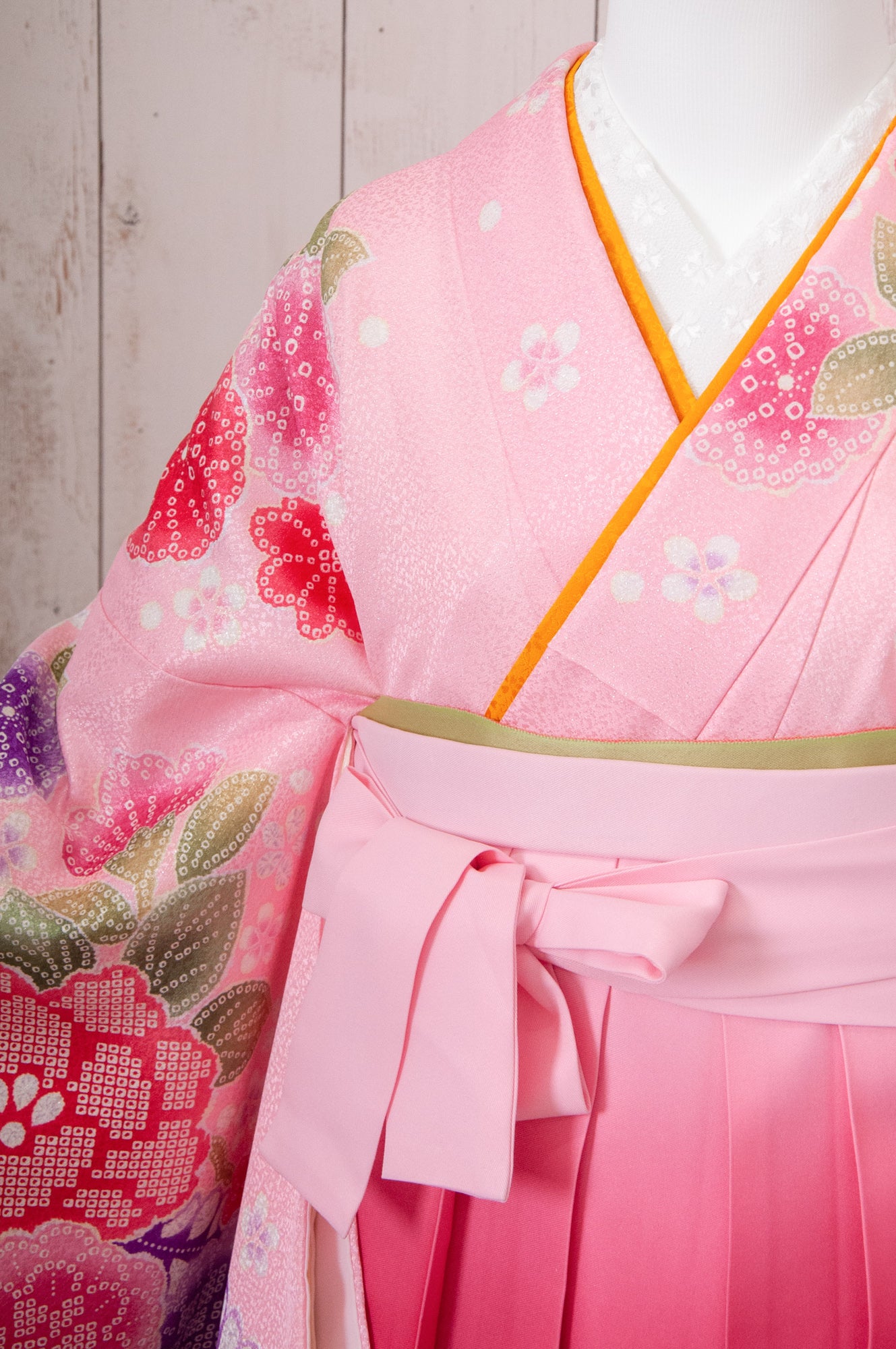 可憐なピンクの着物に、グラデーションの袴が美しく映える一着。桜のような華やかさで晴れの日を彩ります。